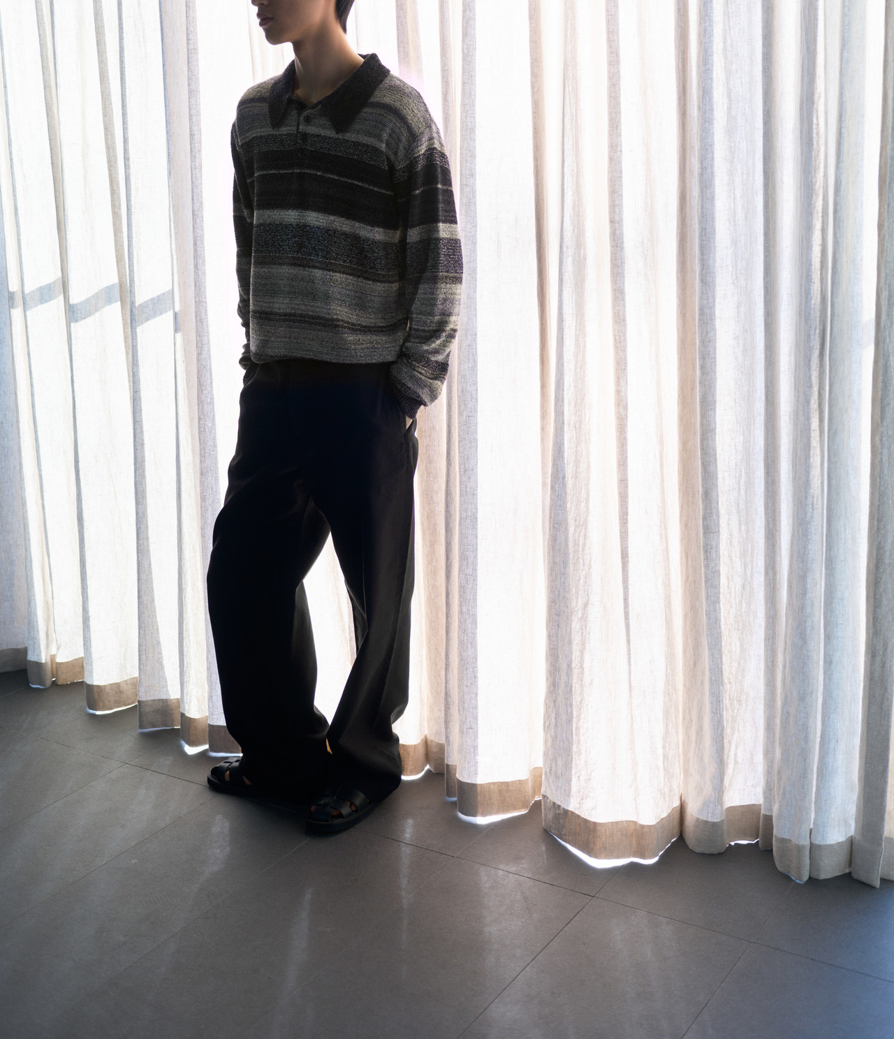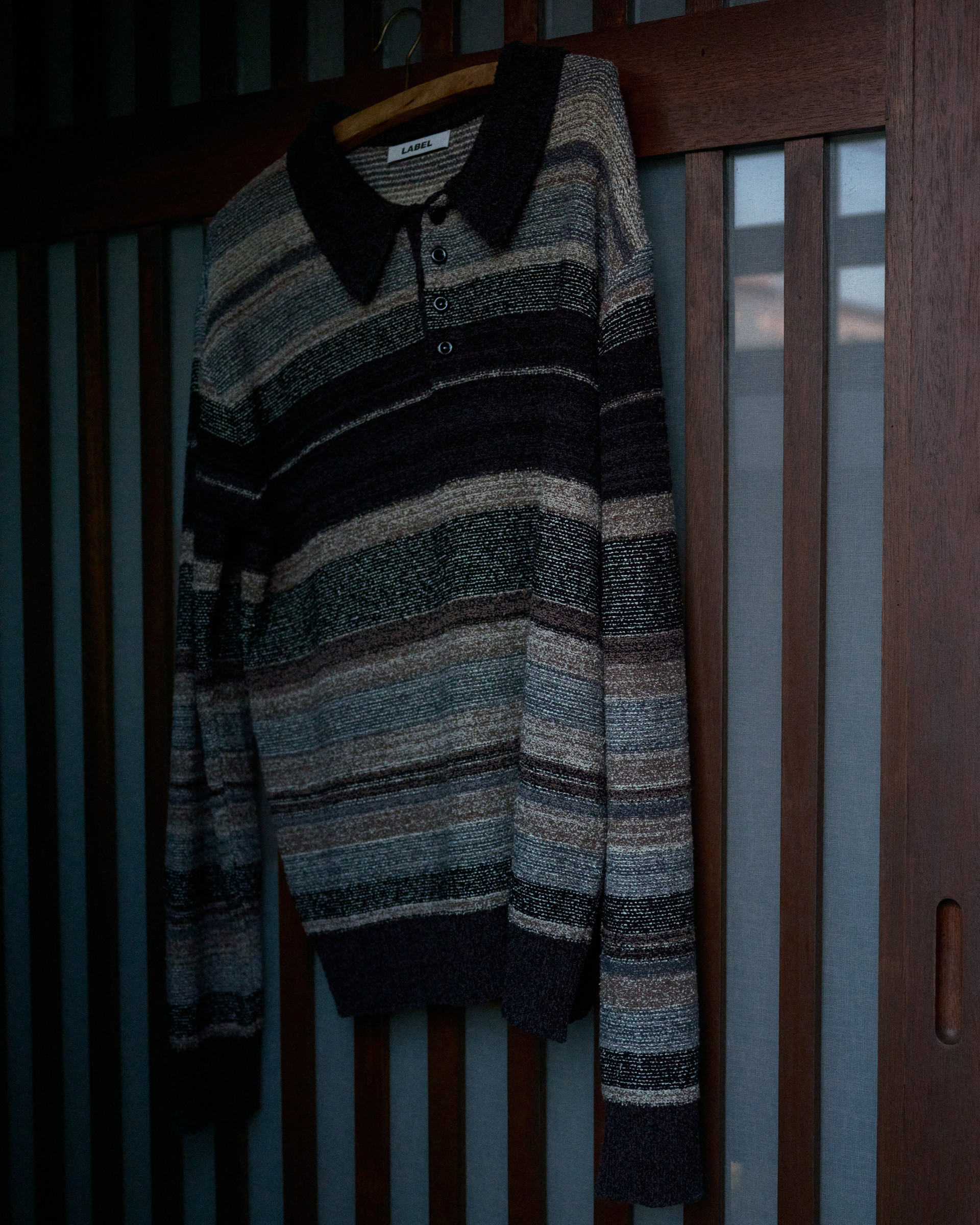 A stripe collar knit that reinterprets vintage aesthetics through a modern sensibility, distinguished by its dimensional texture. Crafted from a multi-color yarn meticulously twisted from eight different tones, it reveals depth and quiet complexity.