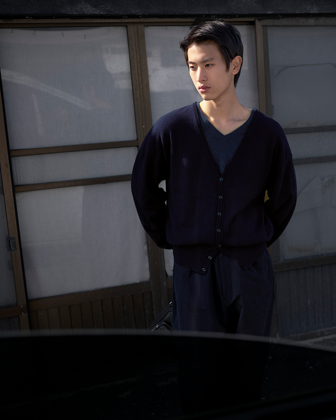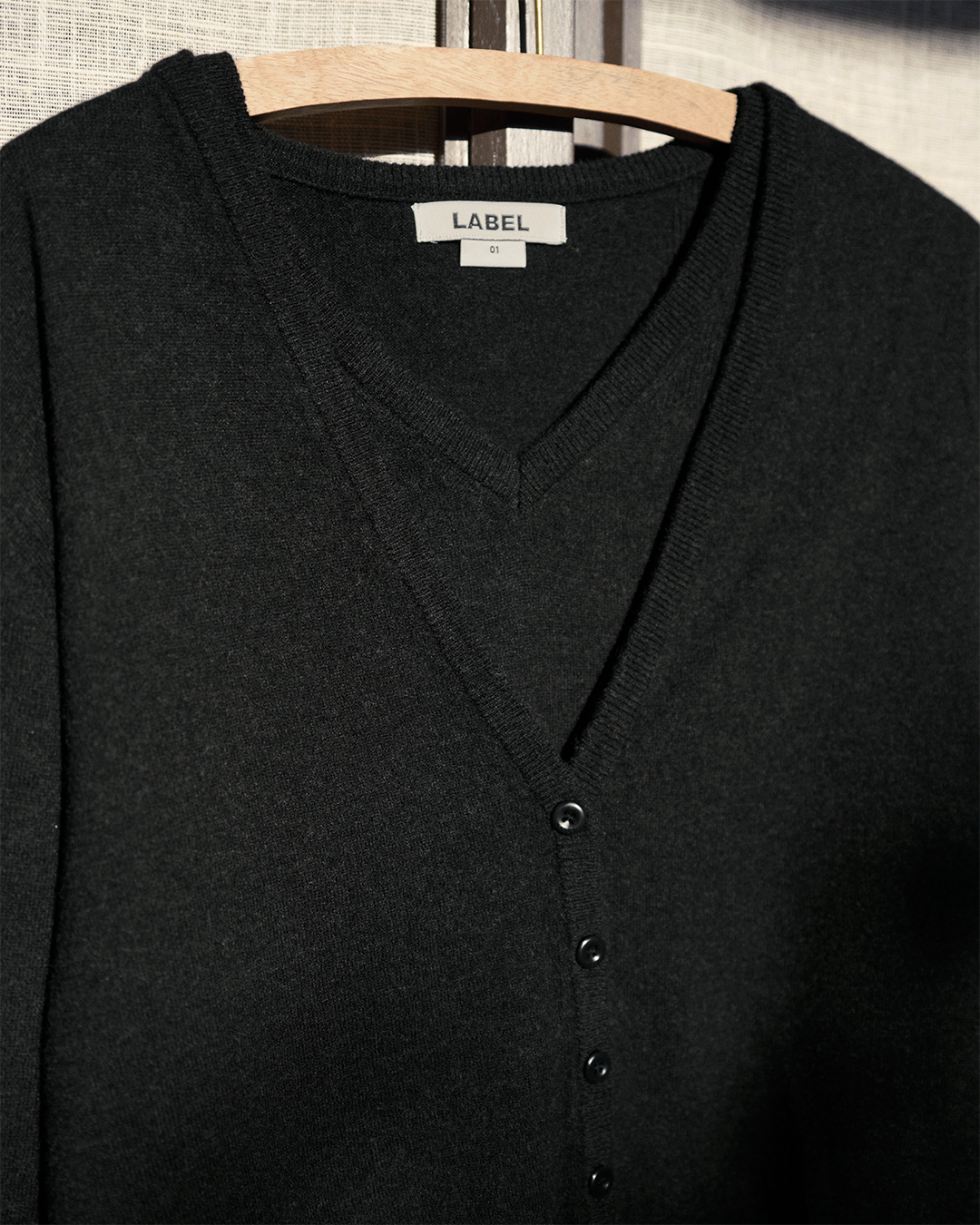 Repetition becomes rhythm: the neckline, the placket, and the measured lines of knit structure echo subtly throughout, creating depth rather than density. In this quiet accumulation, the form gains resonance — a calm, enduring presence shaped by balance, texture, and tone.