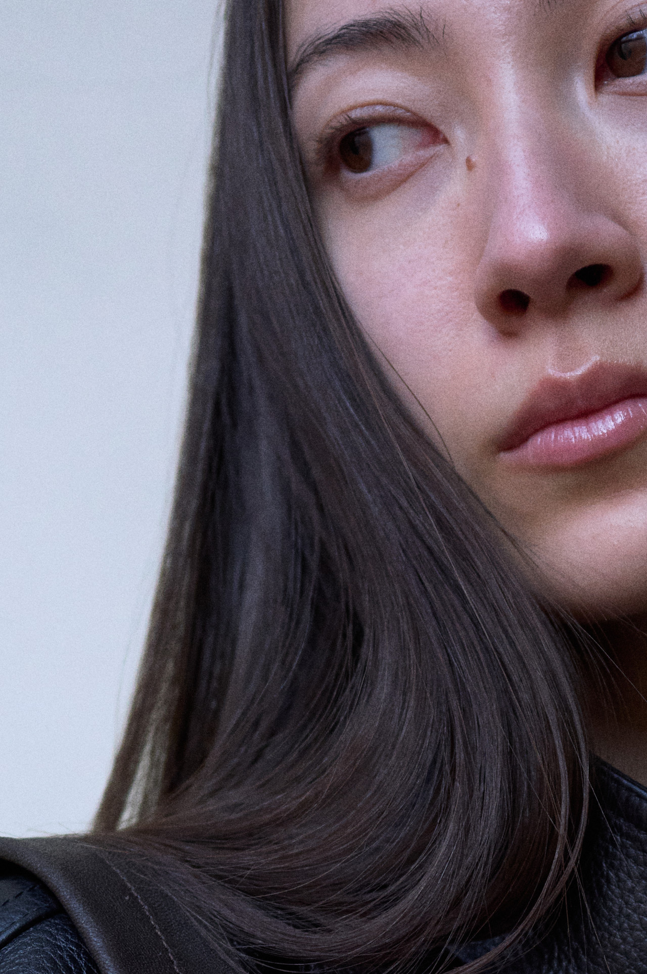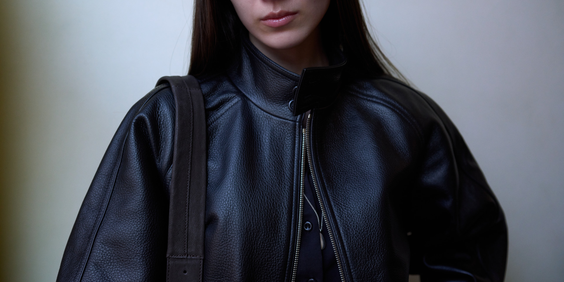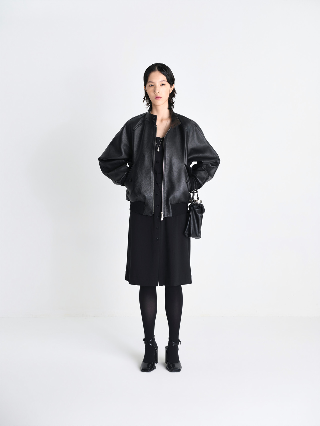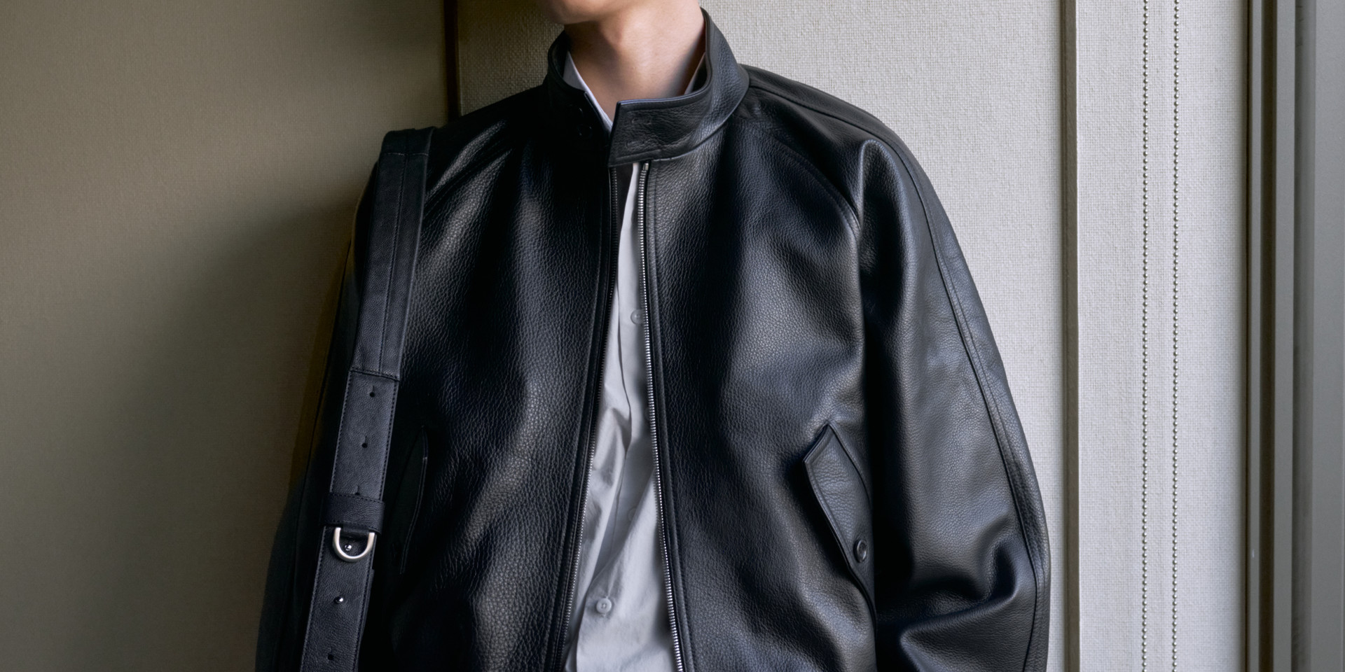 The rich texture of the leather is felt through the eye, while the fluid raglan pattern lines and curved silhouette create a sense of ease. Cut with generous volume, it moves with quiet softness, allowing the form to drape naturally around the body.