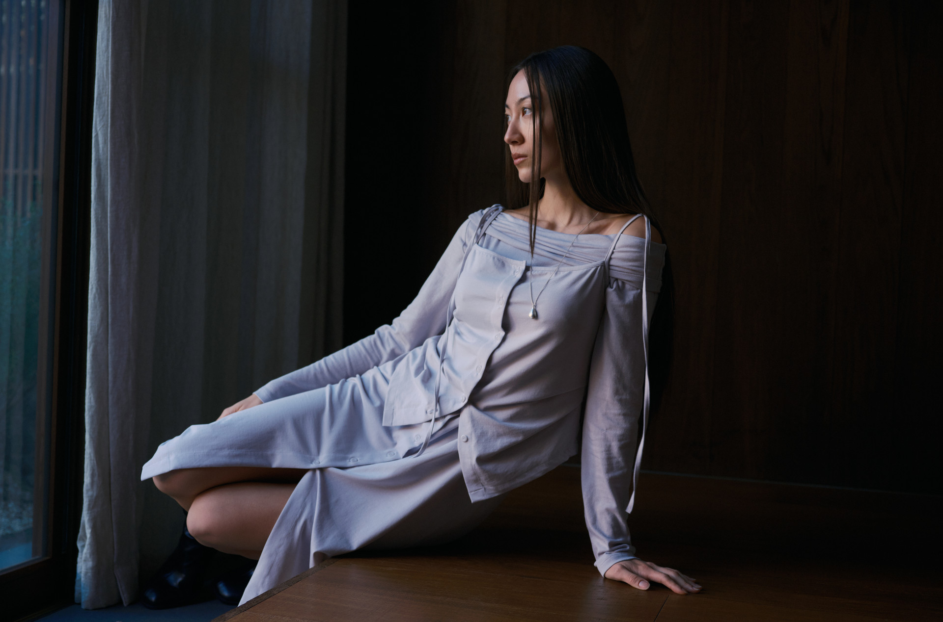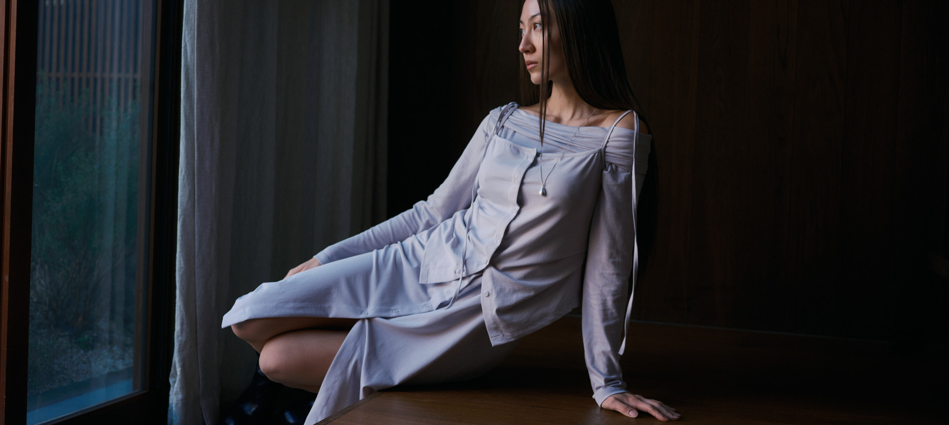 Defined by the comfort of soft jersey and a carefully constructed draped layering detail, the dress falls with gentle fluidity around the body. Light in weight and graceful in movement, it carries a soft, youthful sensibility while maintaining a quiet sense of refinement.