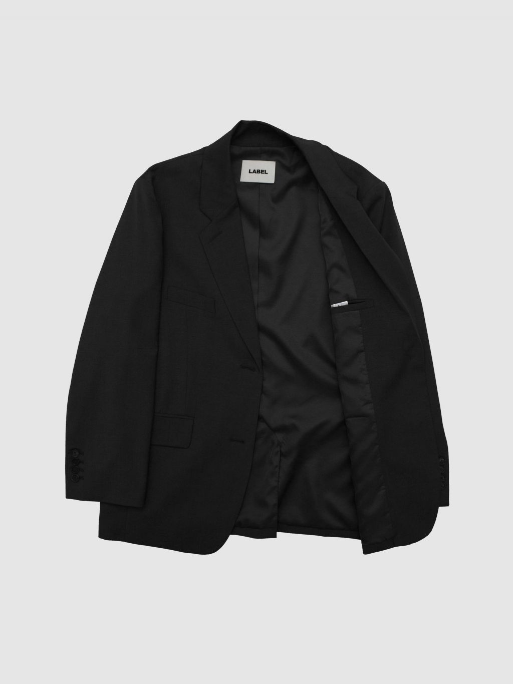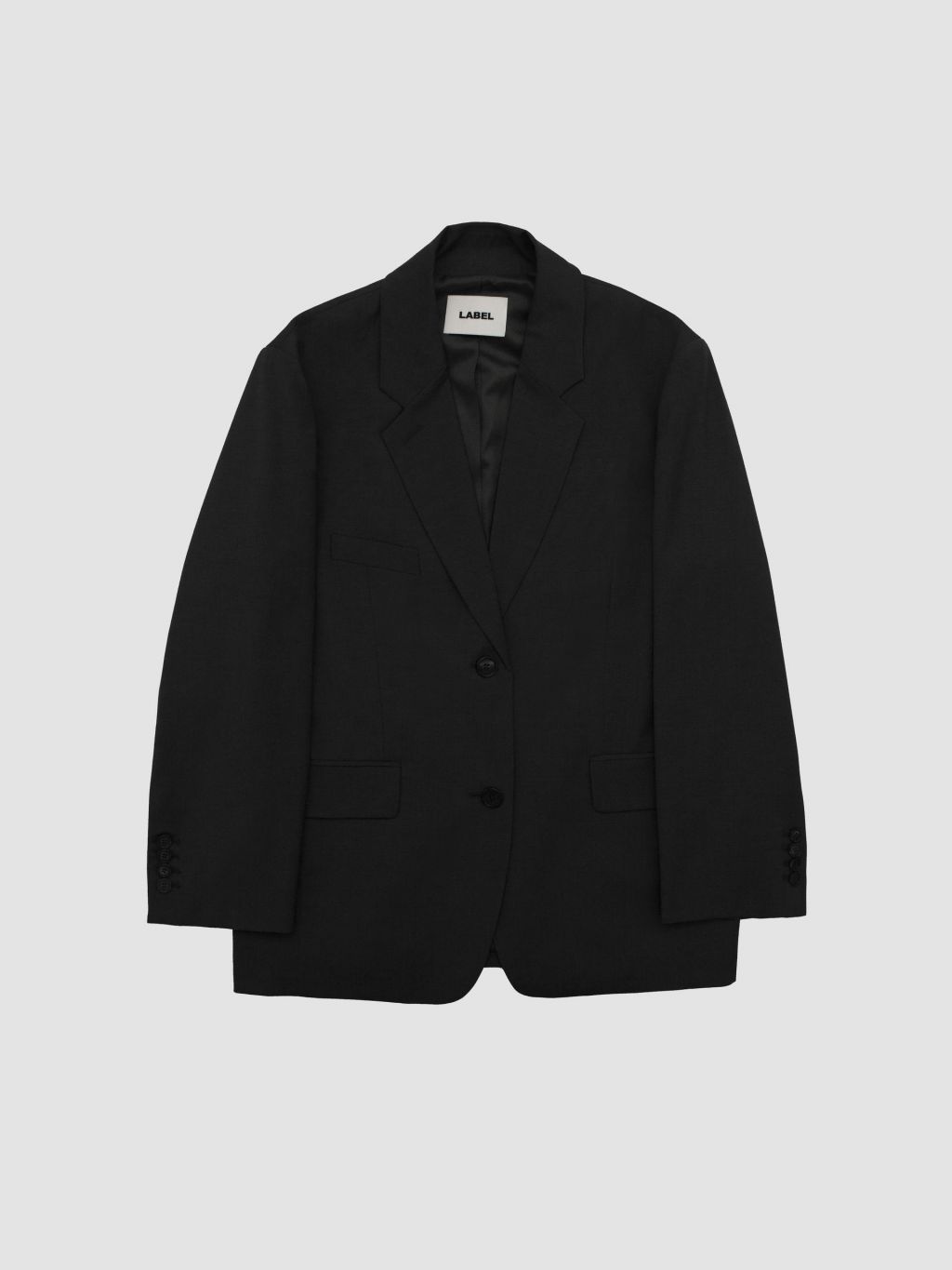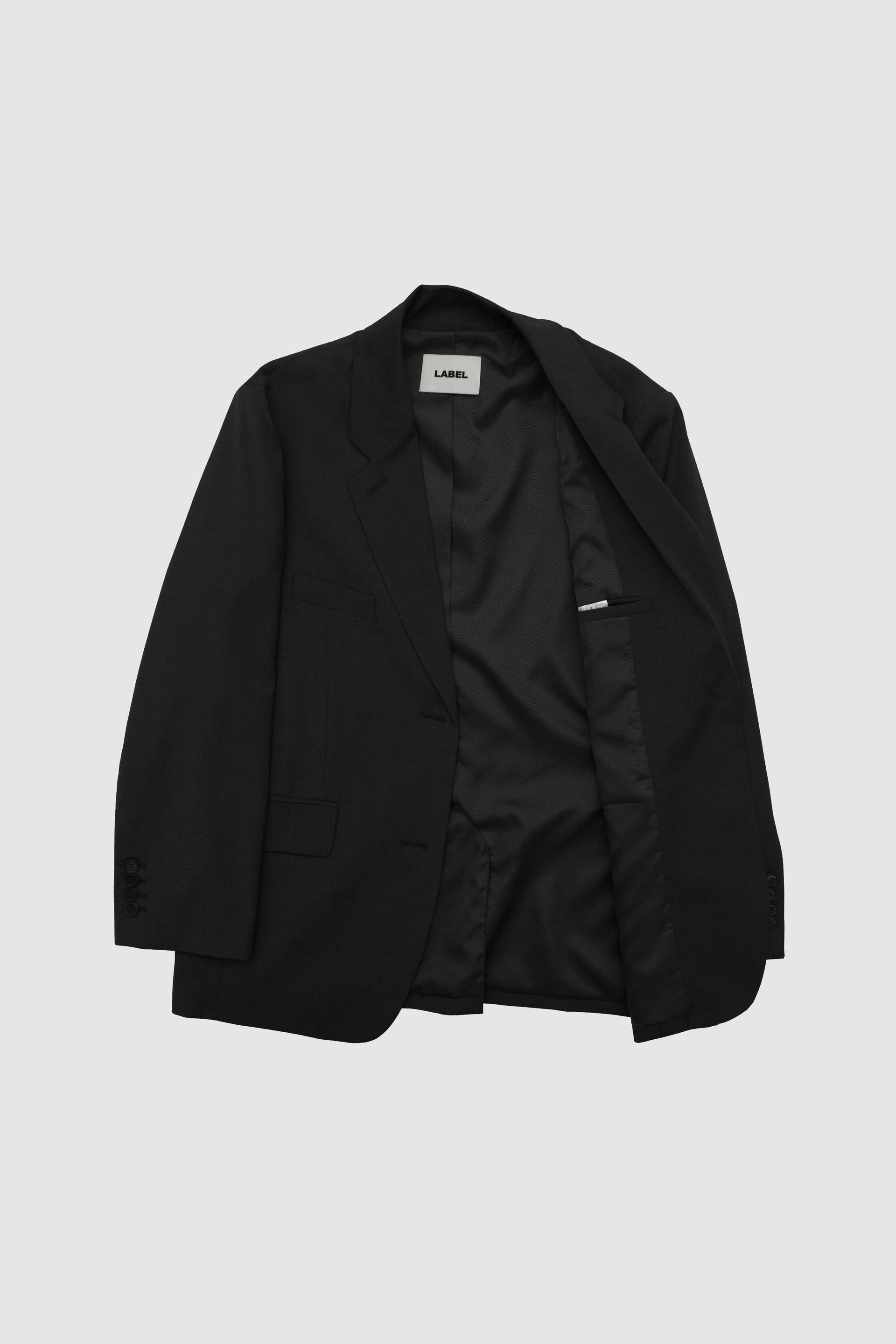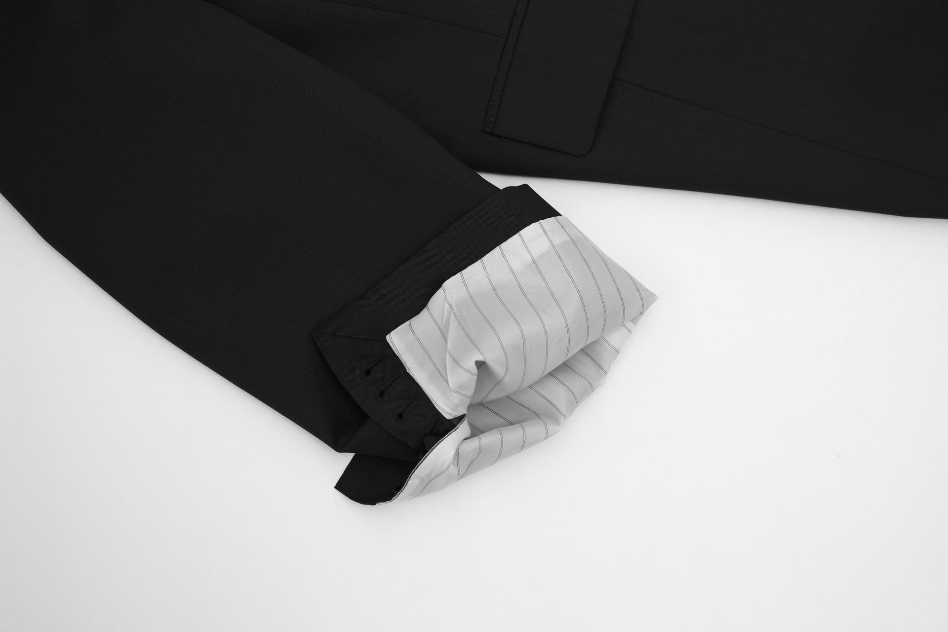 - 싱글 브레스티드 투버튼 자켓 - 오버사이즈 핏 - men's tailoring을 기반으로 제작한 고퀄리티의 제품 vister 고급 안감을 사용하였으며 몸판은 블랙, 소매 안감은 스트라이프 원단입니다. 단추는 소뿔단추(라벨 각인) 사용하였으며 소매 트임, 뒷트임, 양쪽 속주머니, 가슴포켓 있습니다. |