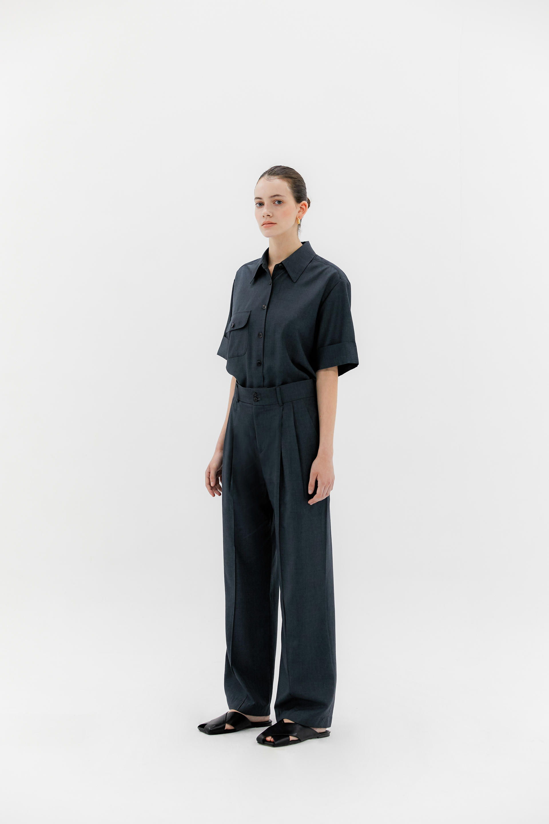 오버사이즈 핏 셔츠 two button pintuck pants 와 셋업 롤업 소매 명품 브랜드 셔츠 전문 공장에서 제작되었습니다. 촘촘한 땀수와 정교하게 만들어진 고퀄리티 셔츠입니다. 셔츠에 들어간 단추는 모두 천연 소뿔 단추 입니다. 소매 롤업 부분은 고정되어있는 디테일입니다. |