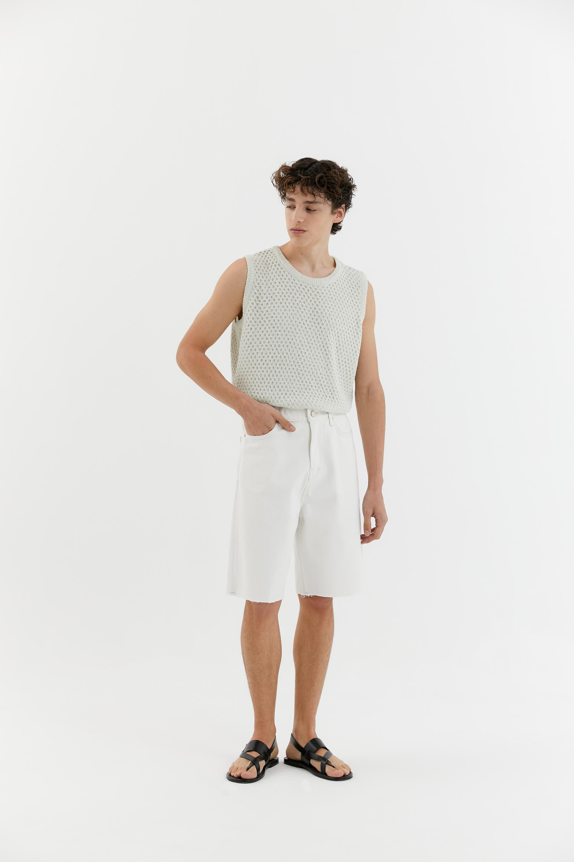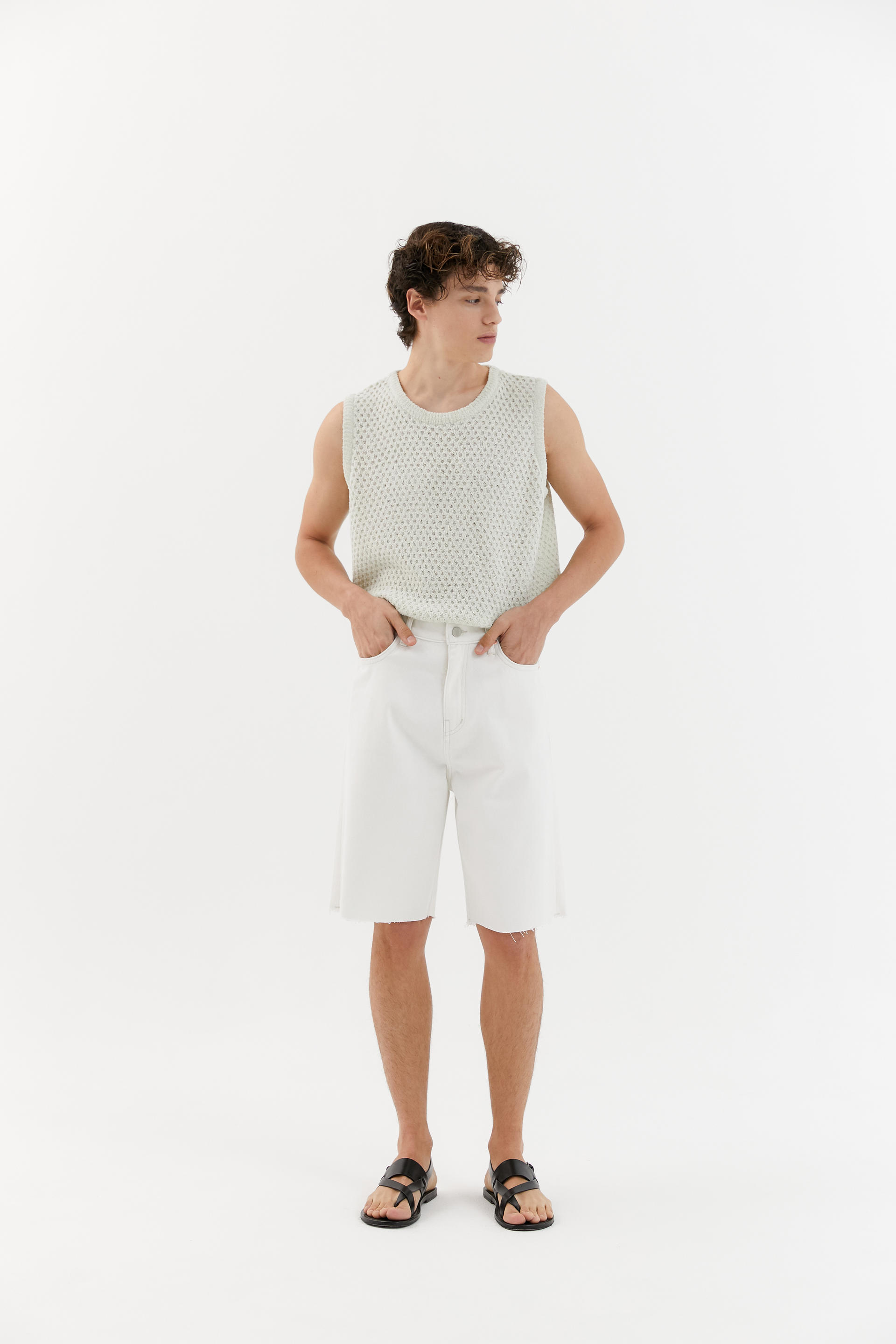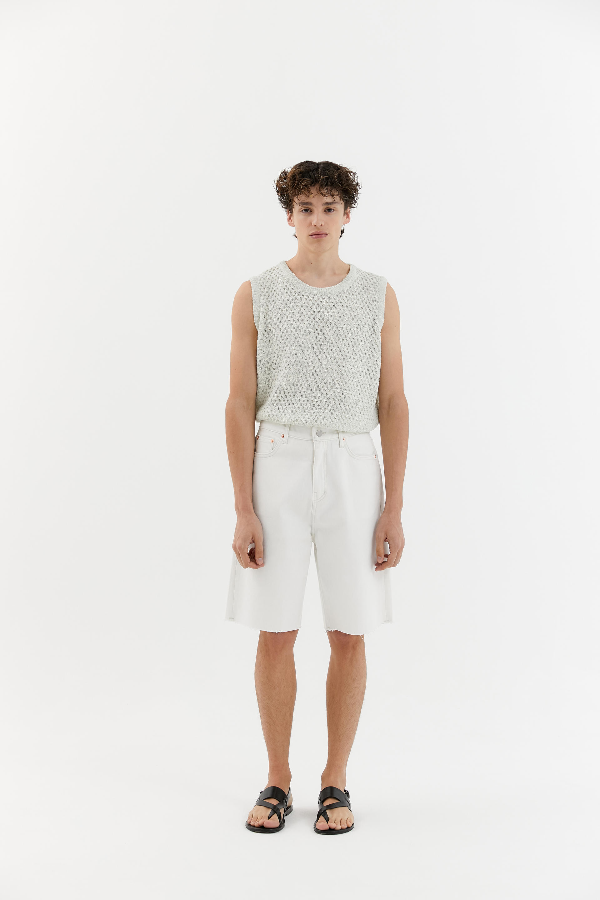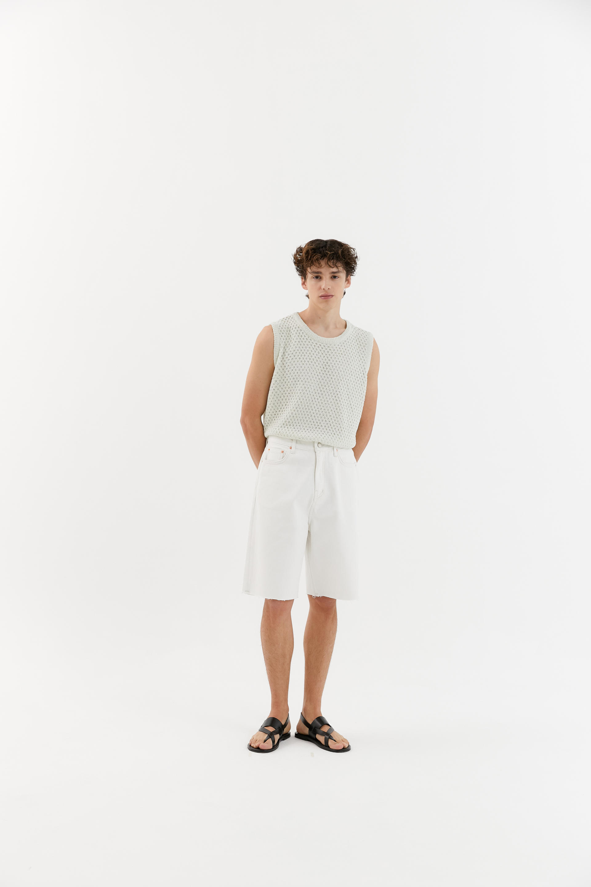- 와이드 핏의 버뮤다 데님 반바지 - YKK 社의 지퍼, 리벳 - LABEL 로고가 각인된 고정식 켄톤 - 30수 트윌 코튼 주머니감 - 코아사 봉사 |