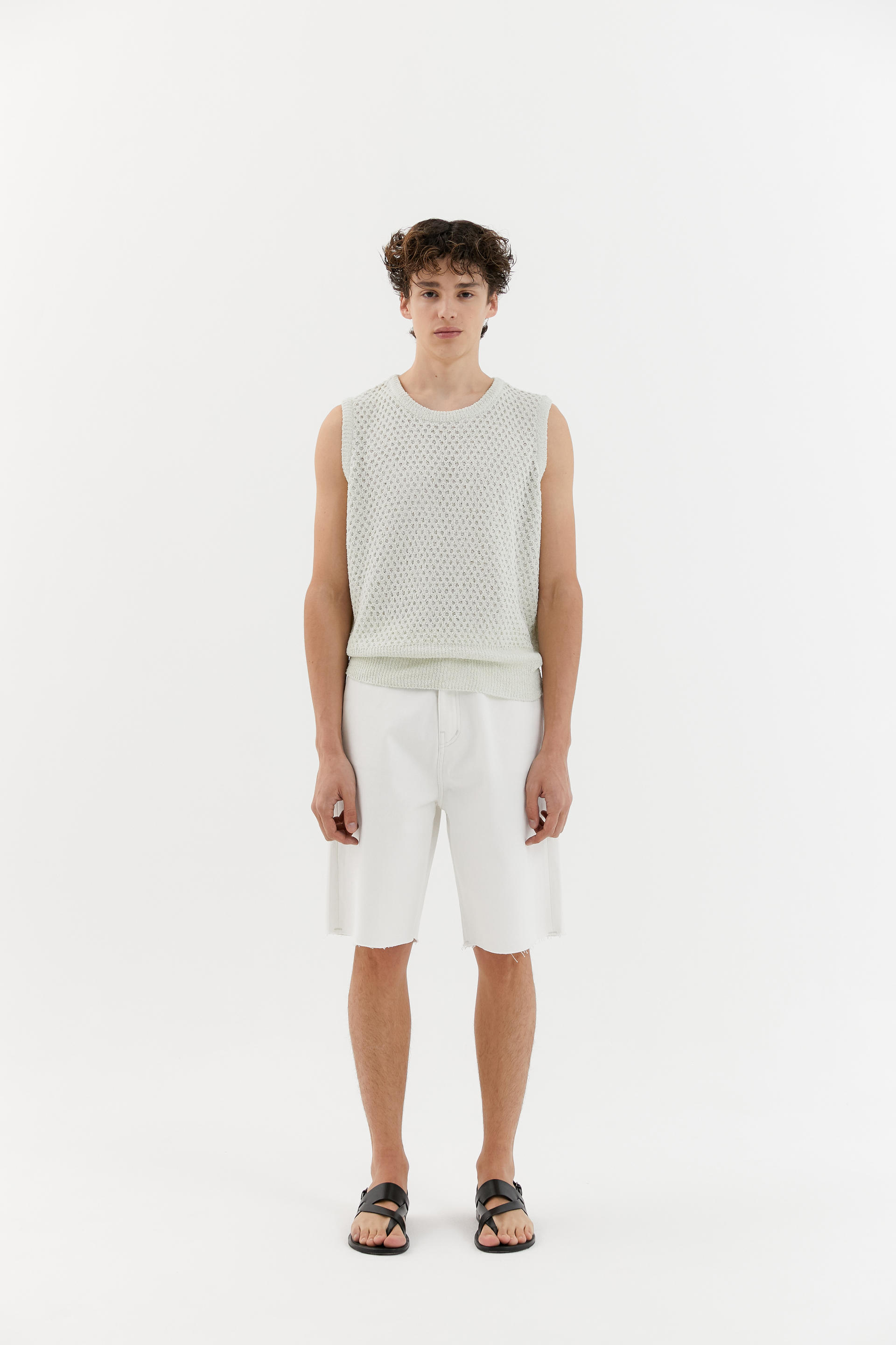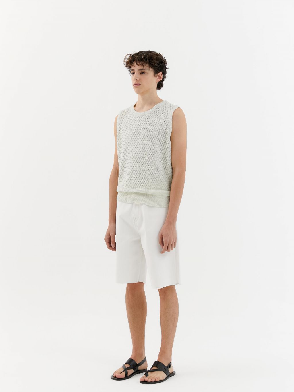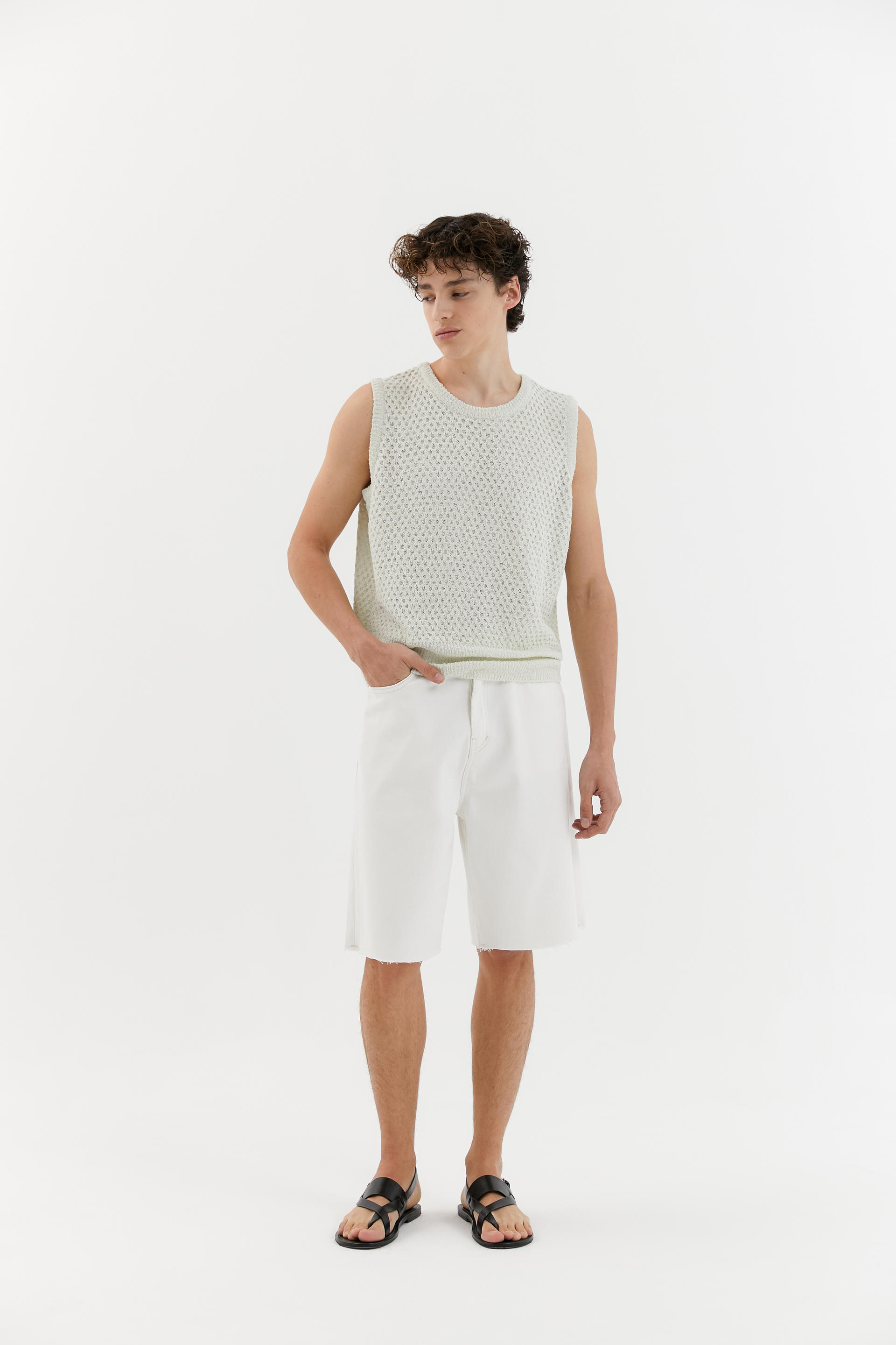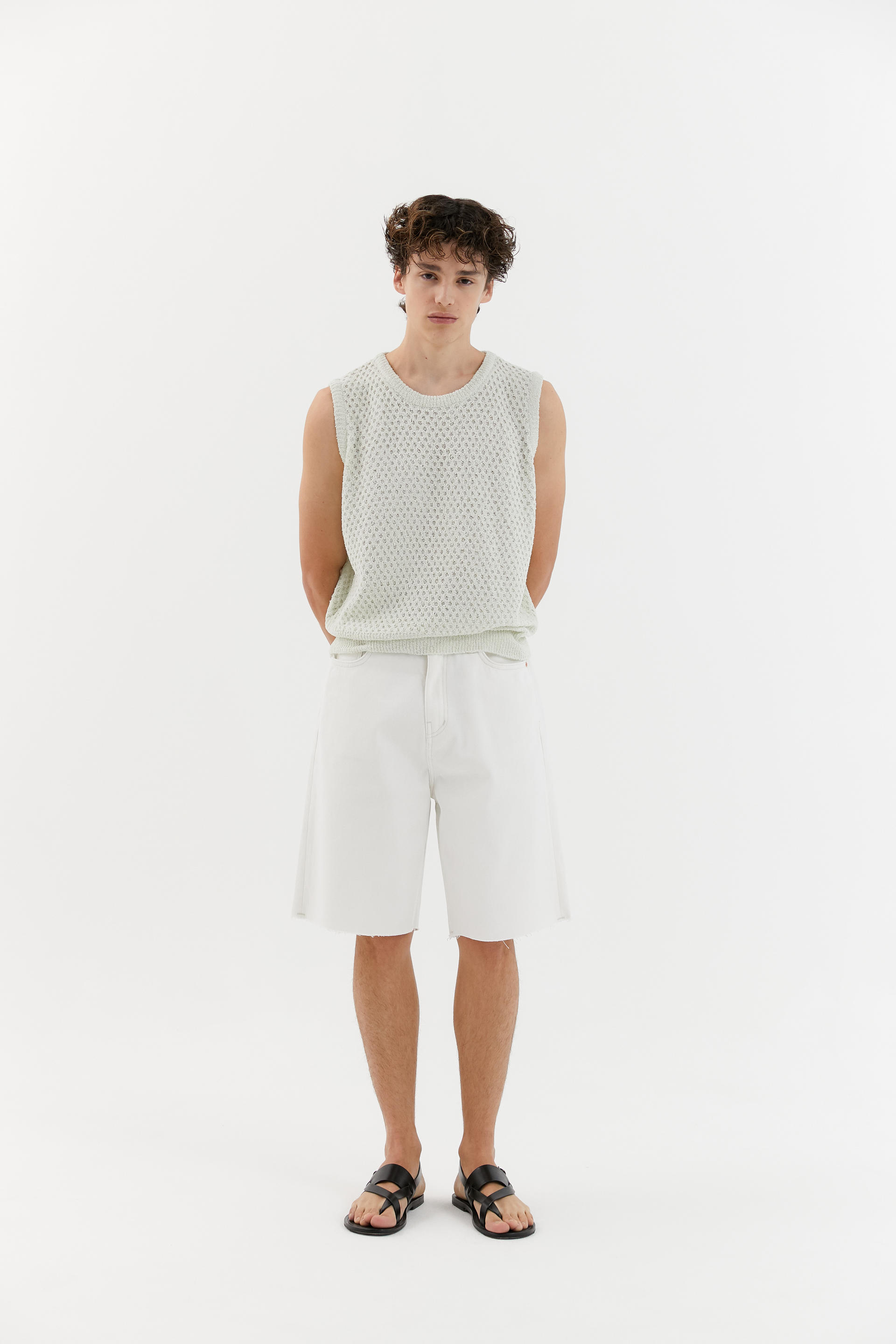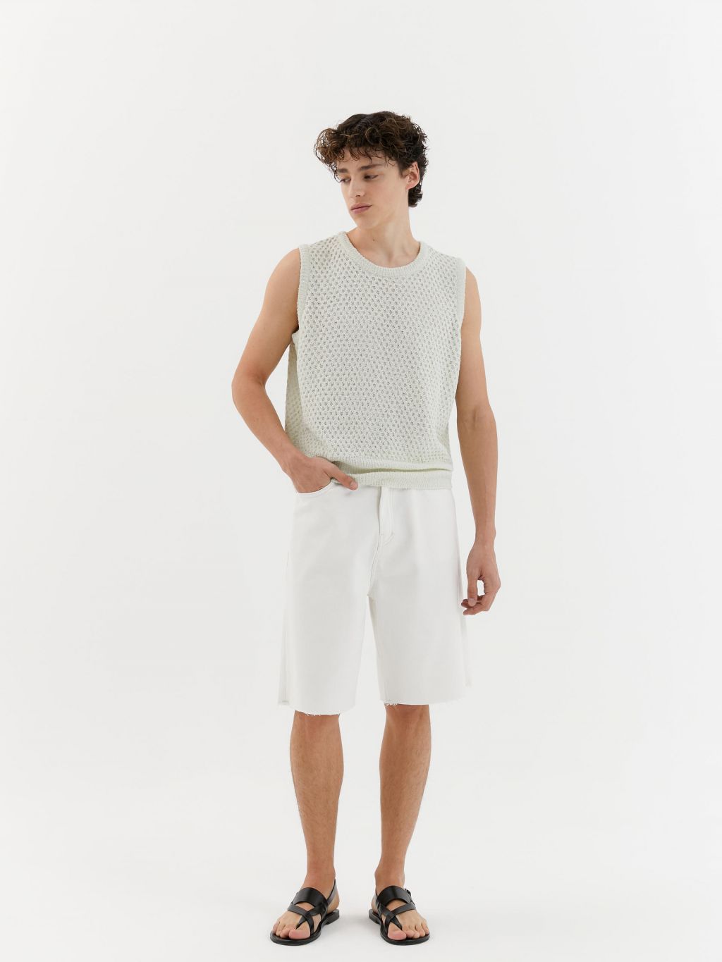 - 와이드 핏의 버뮤다 데님 반바지 - YKK 社의 지퍼, 리벳 - LABEL 로고가 각인된 고정식 켄톤 - 30수 트윌 코튼 주머니감 - 코아사 봉사 |