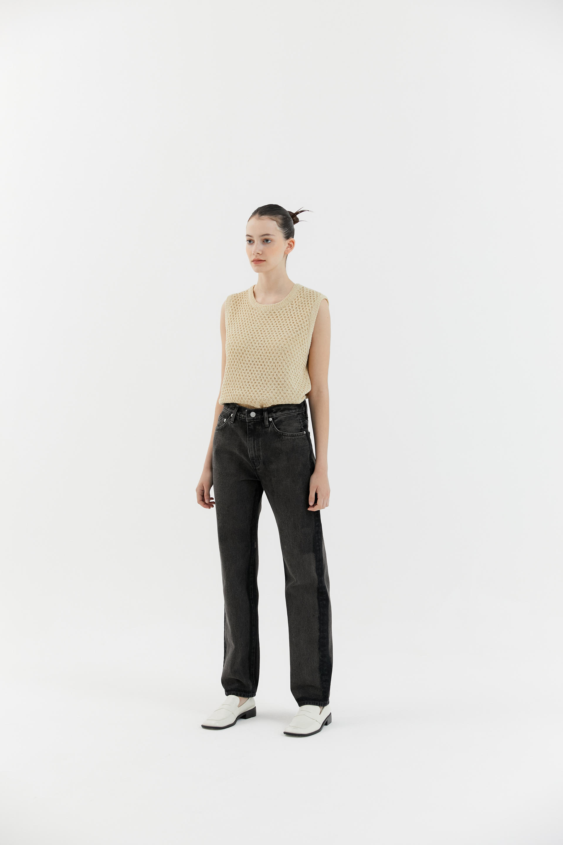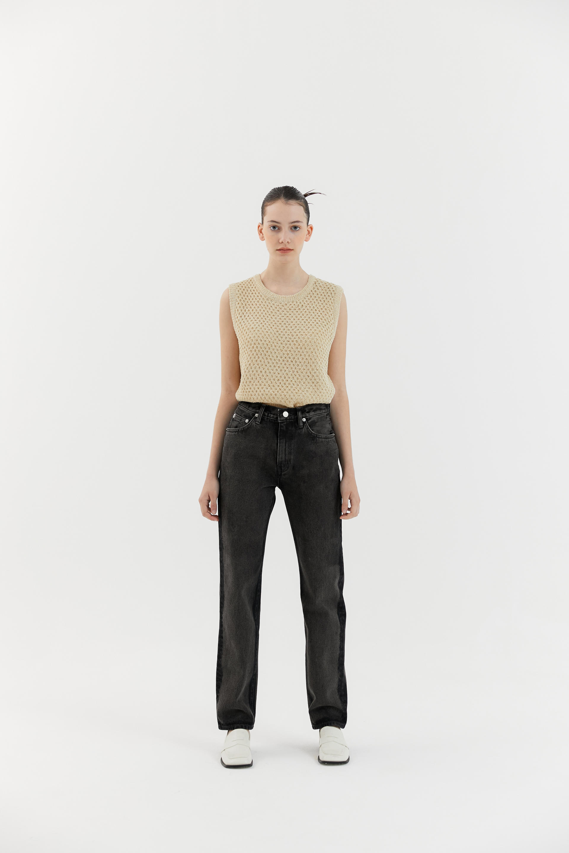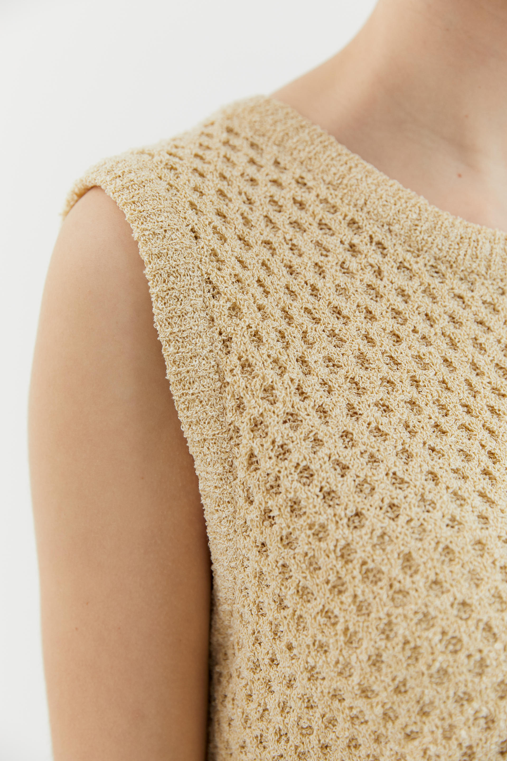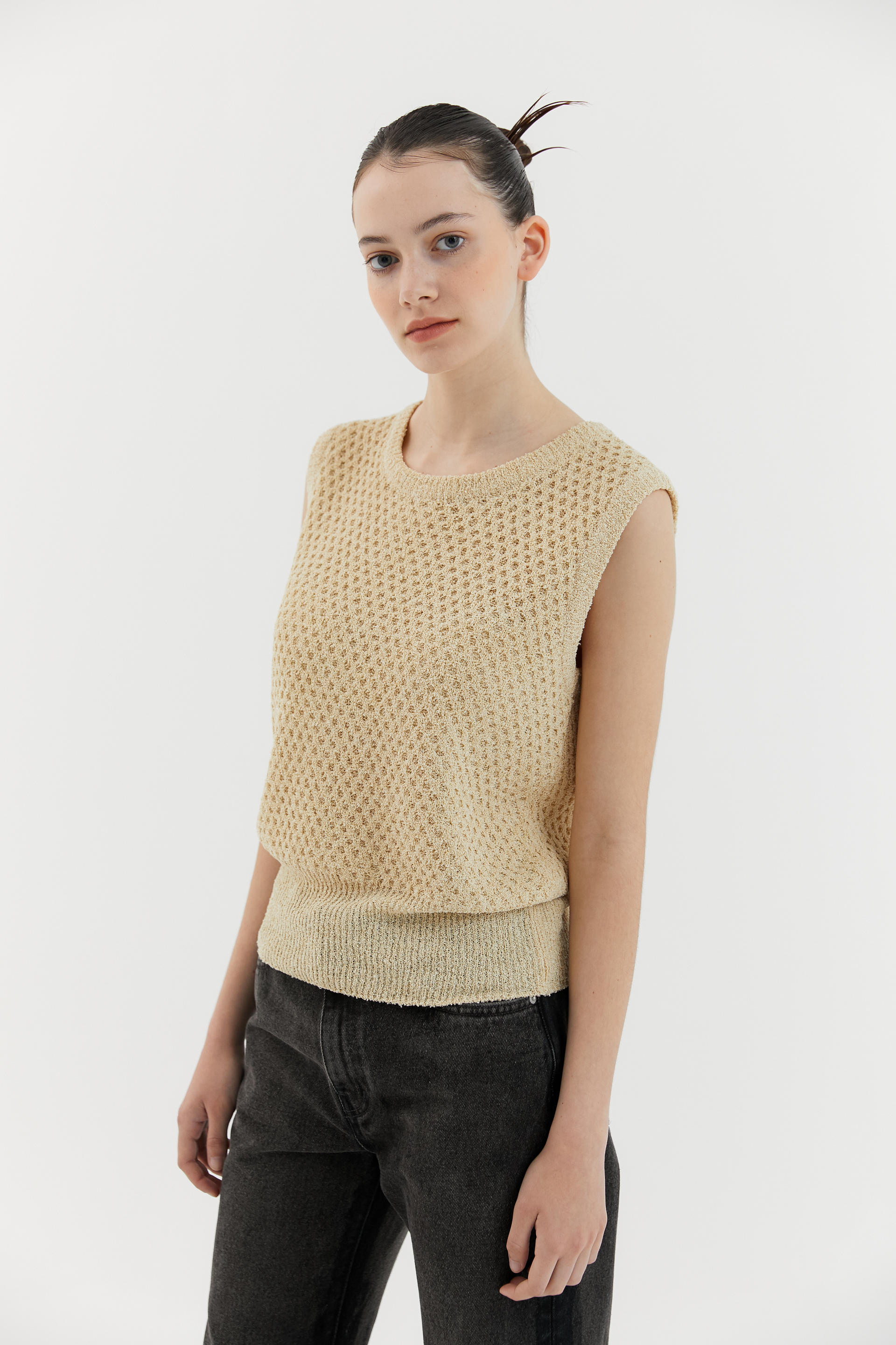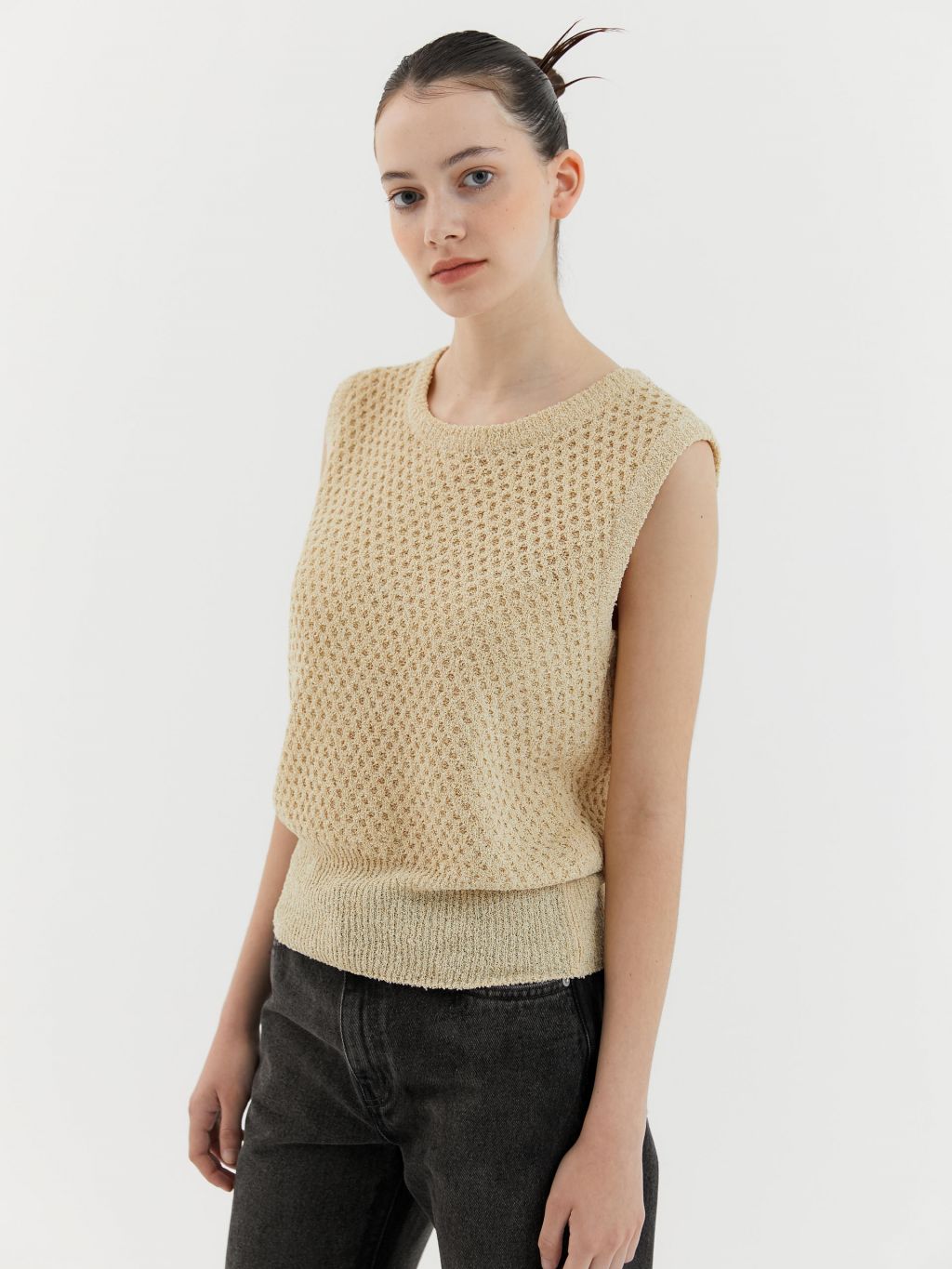 - 슬리브리스 니트웨어 - 입체적인 와플조직 얇은 두께의 원사를 두겹으로 편직하여 입체적인 와플 조직이 돋보이는 니트웨어입니다. 피부에 닫는 표면감이 시원하여 여름에 착용하기 좋은 니트입니다. |