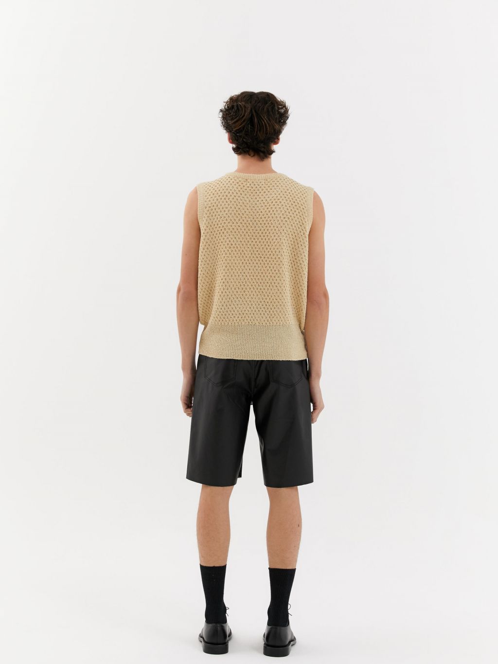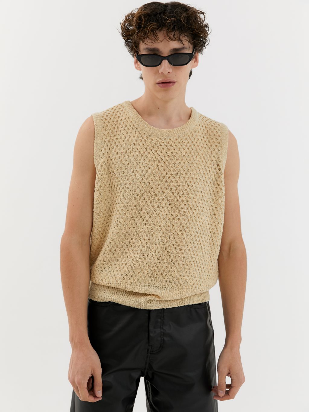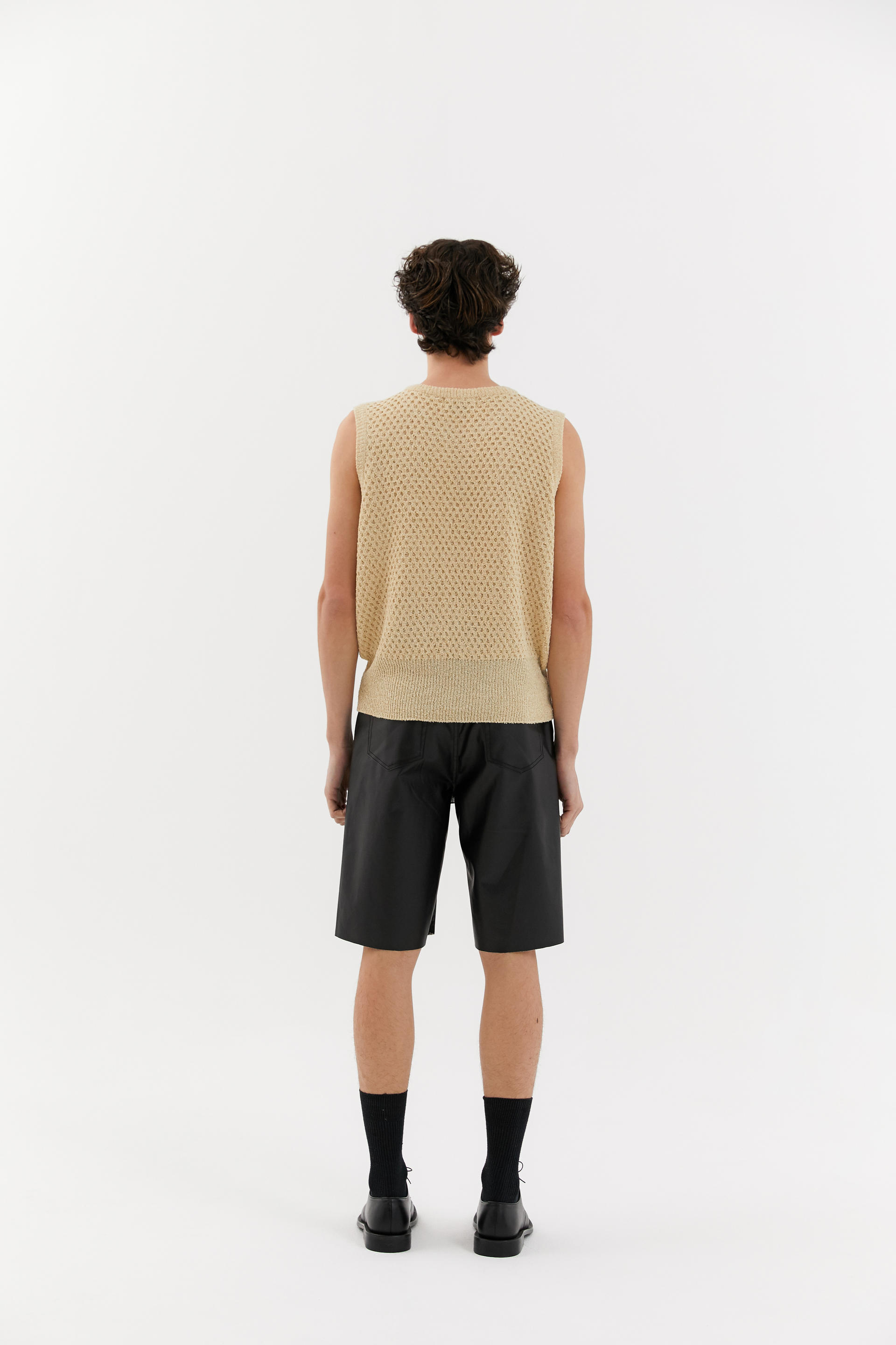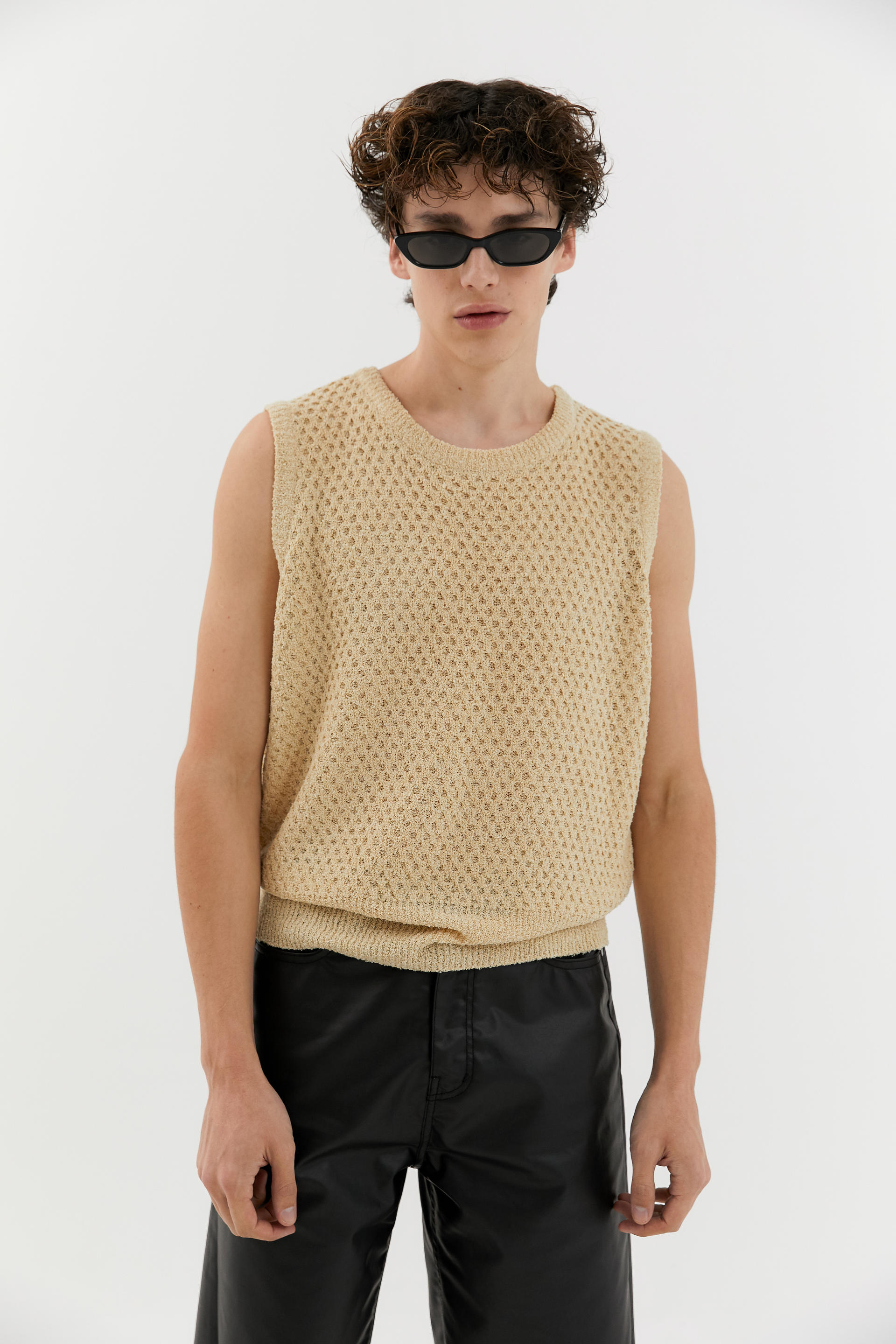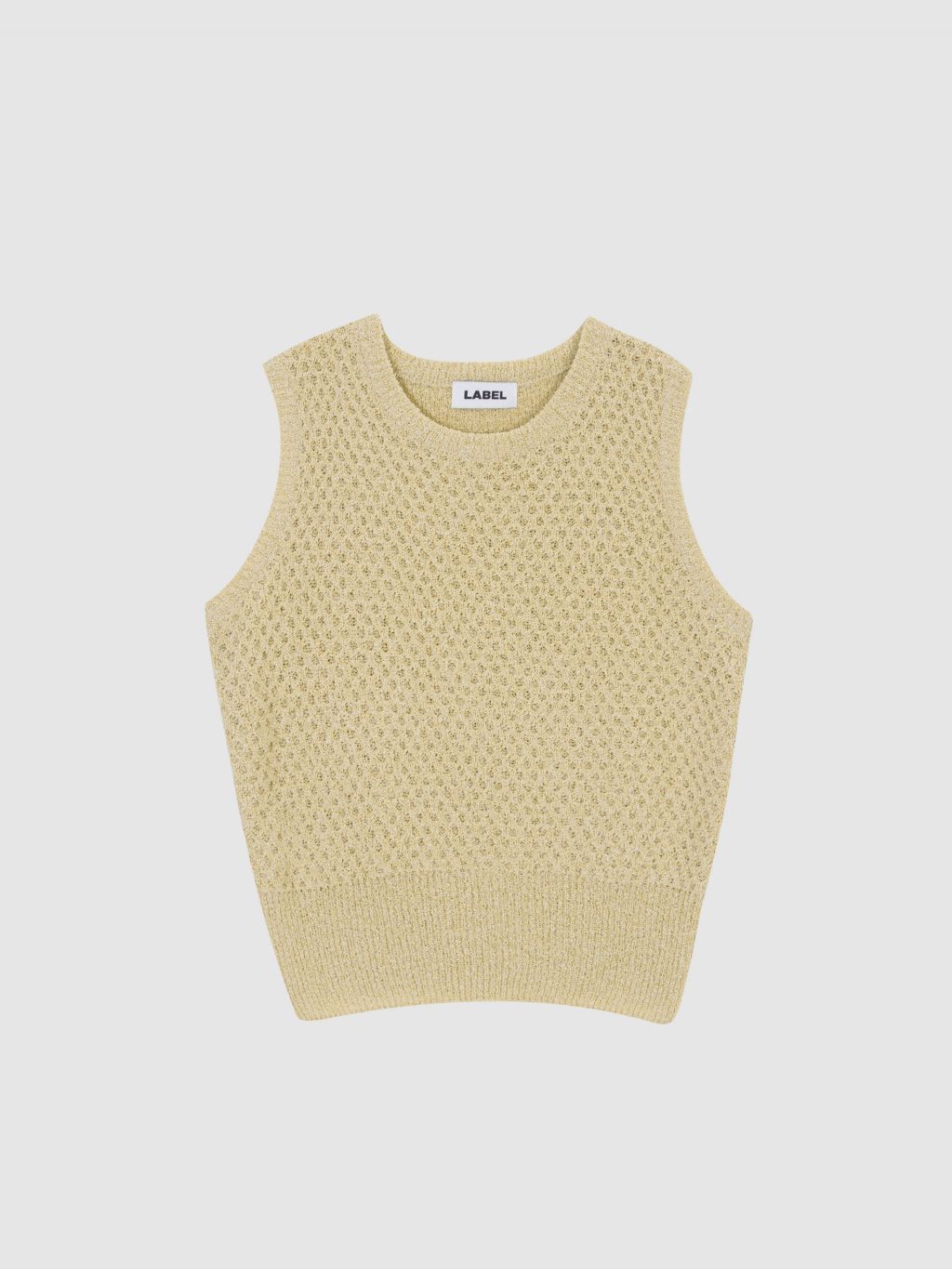 - 슬리브리스 니트웨어 - 입체적인 와플조직 얇은 두께의 원사를 두겹으로 편직하여 입체적인 와플 조직이 돋보이는 니트웨어입니다. 피부에 닫는 표면감이 시원하여 여름에 착용하기 좋은 니트입니다. |