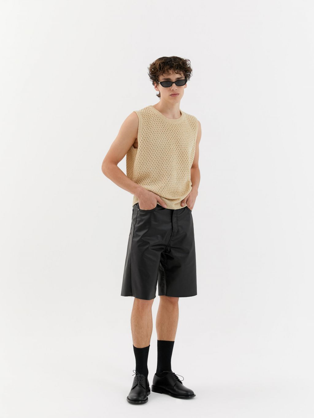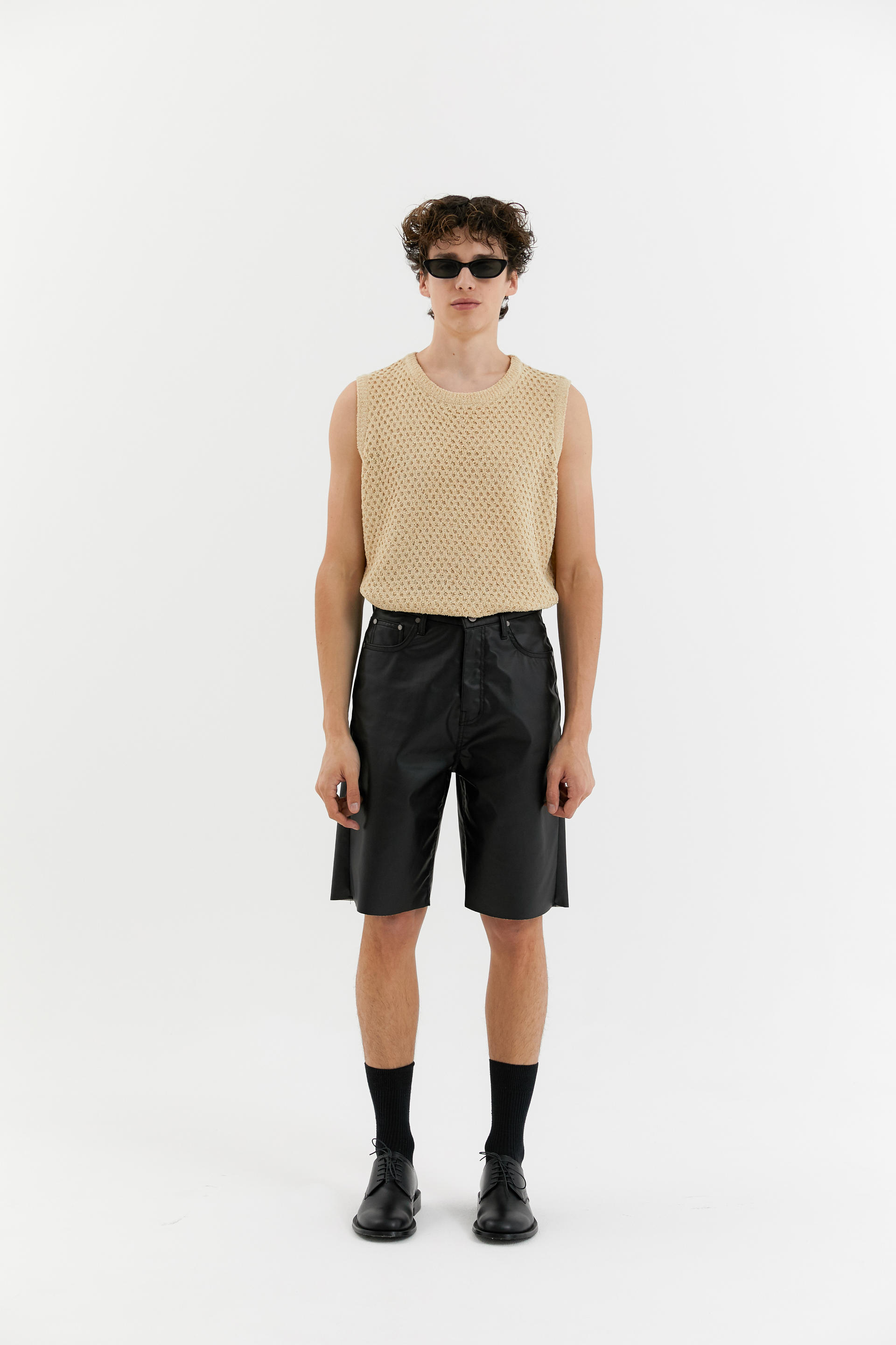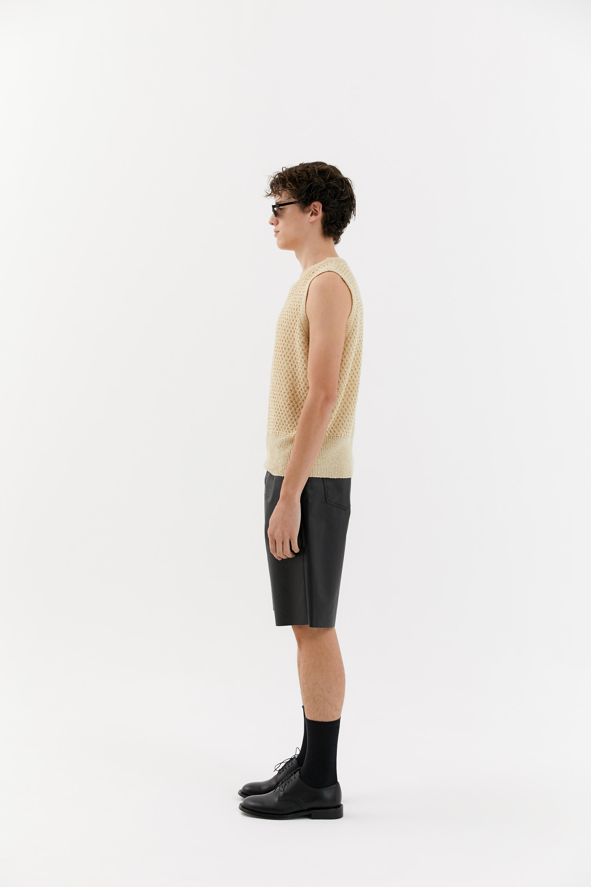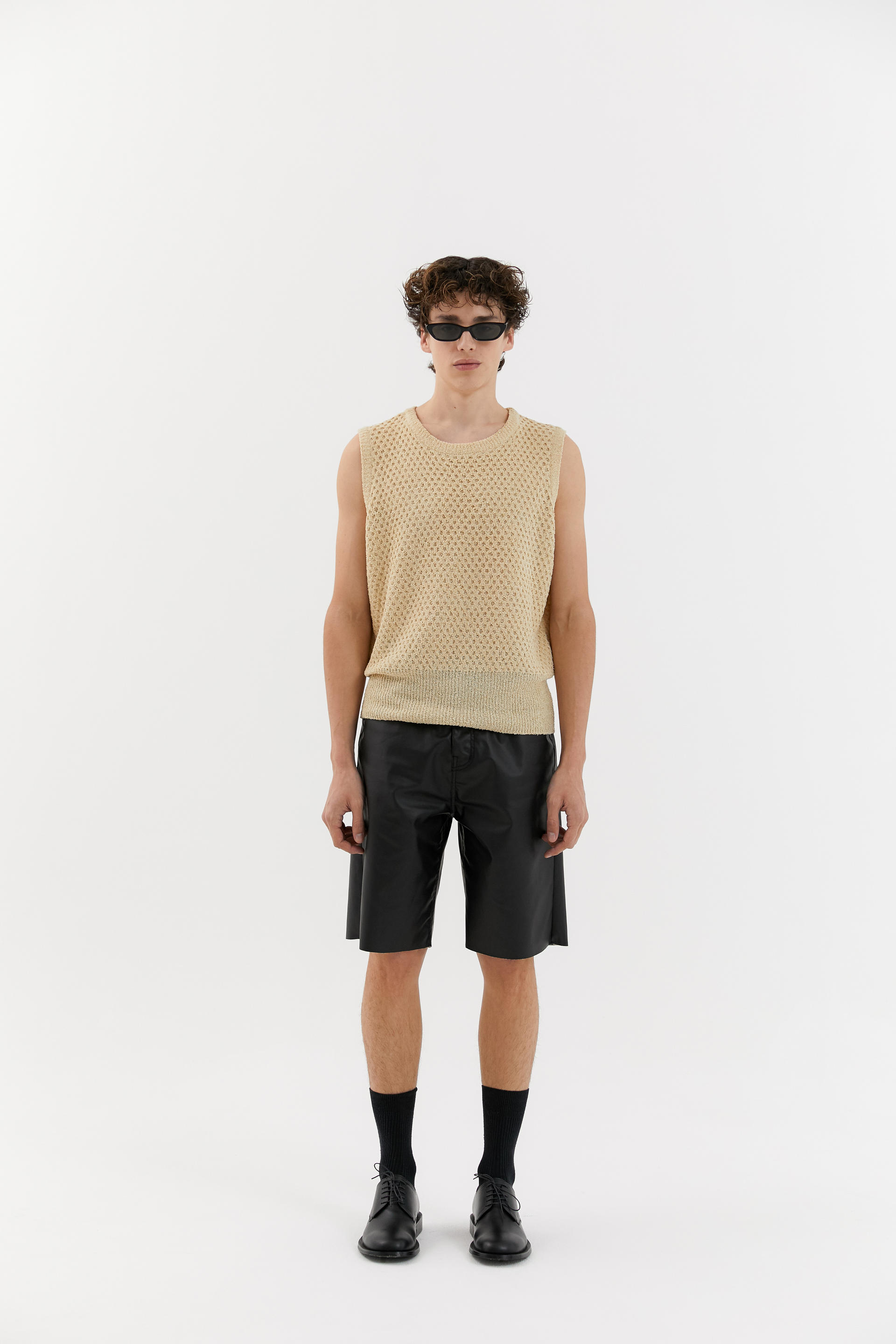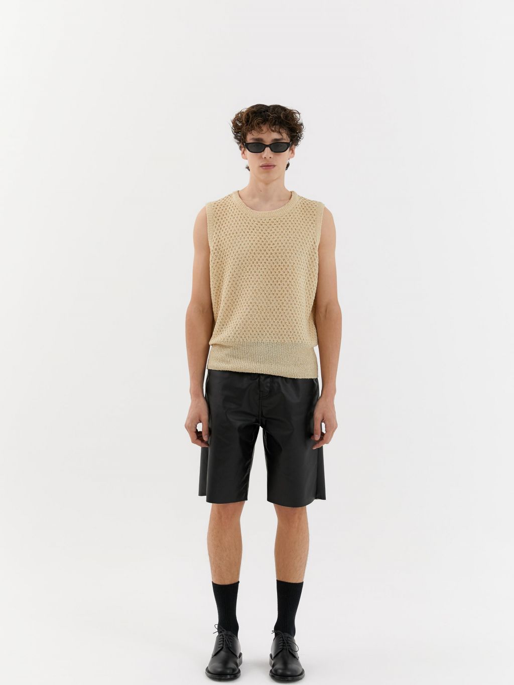 - 슬리브리스 니트웨어 - 입체적인 와플조직 얇은 두께의 원사를 두겹으로 편직하여 입체적인 와플 조직이 돋보이는 니트웨어입니다. 피부에 닫는 표면감이 시원하여 여름에 착용하기 좋은 니트입니다. |