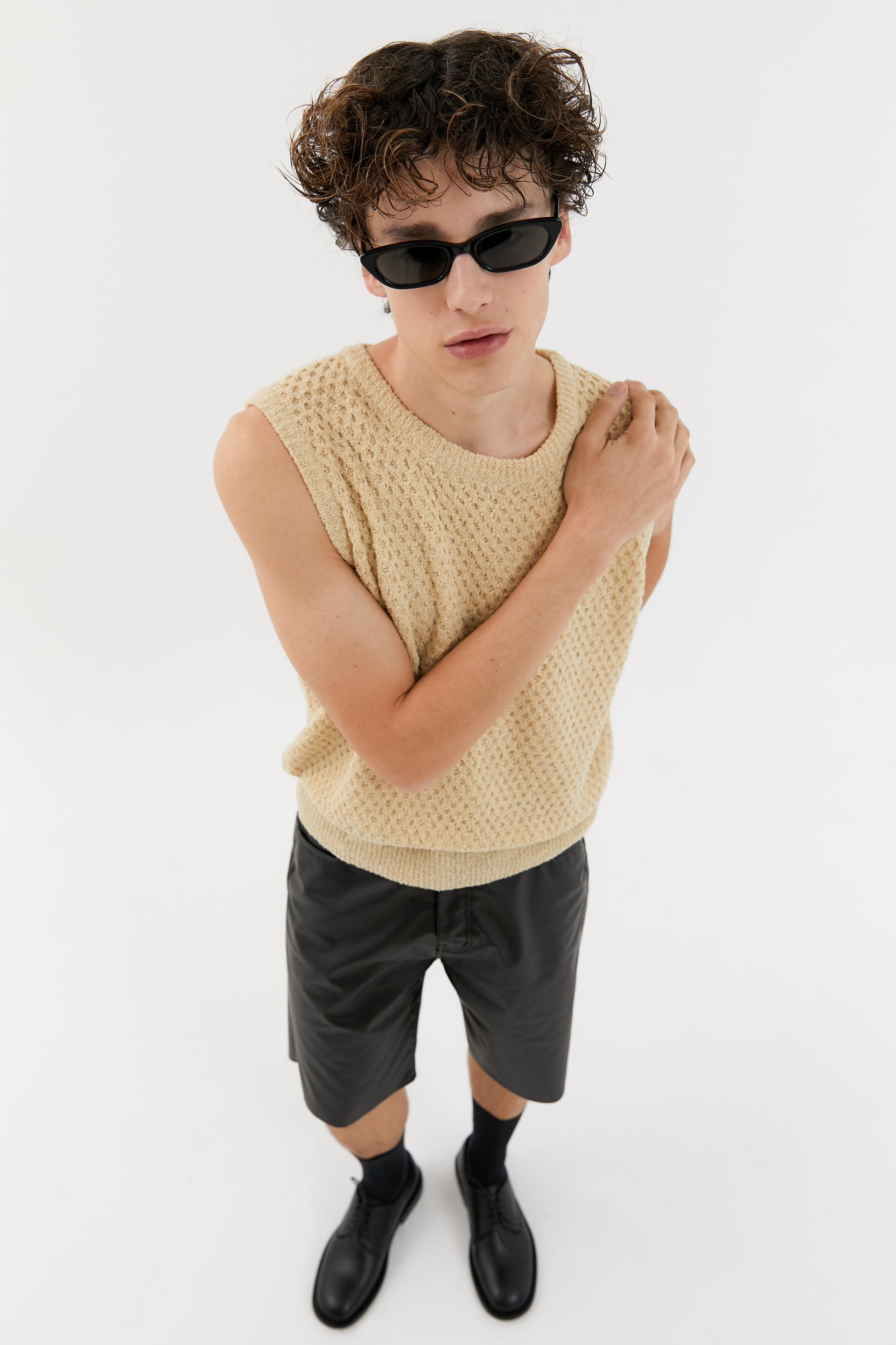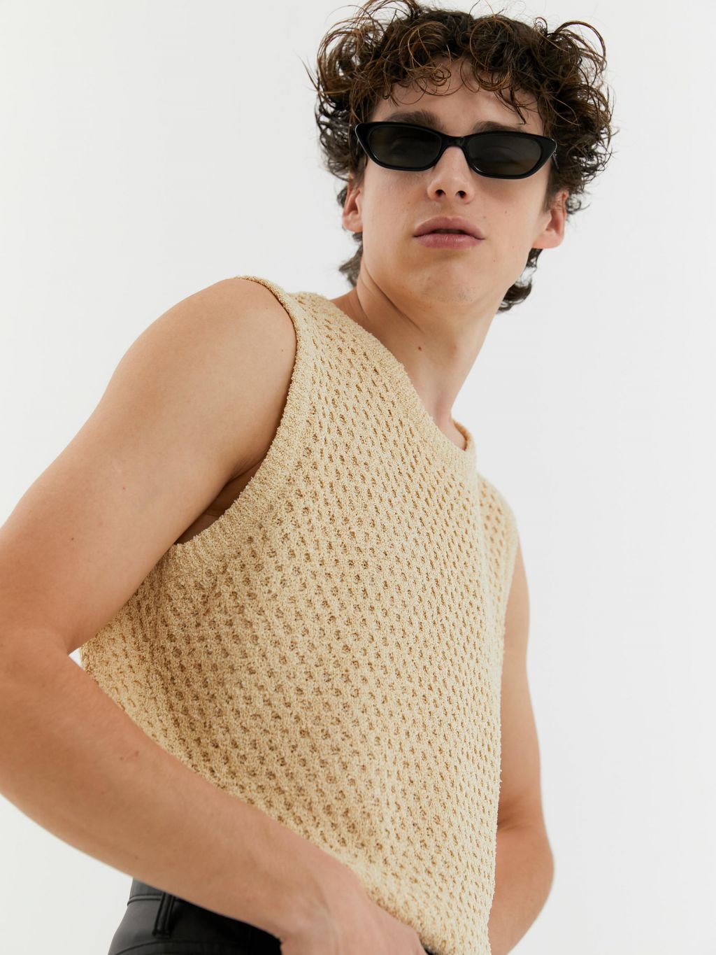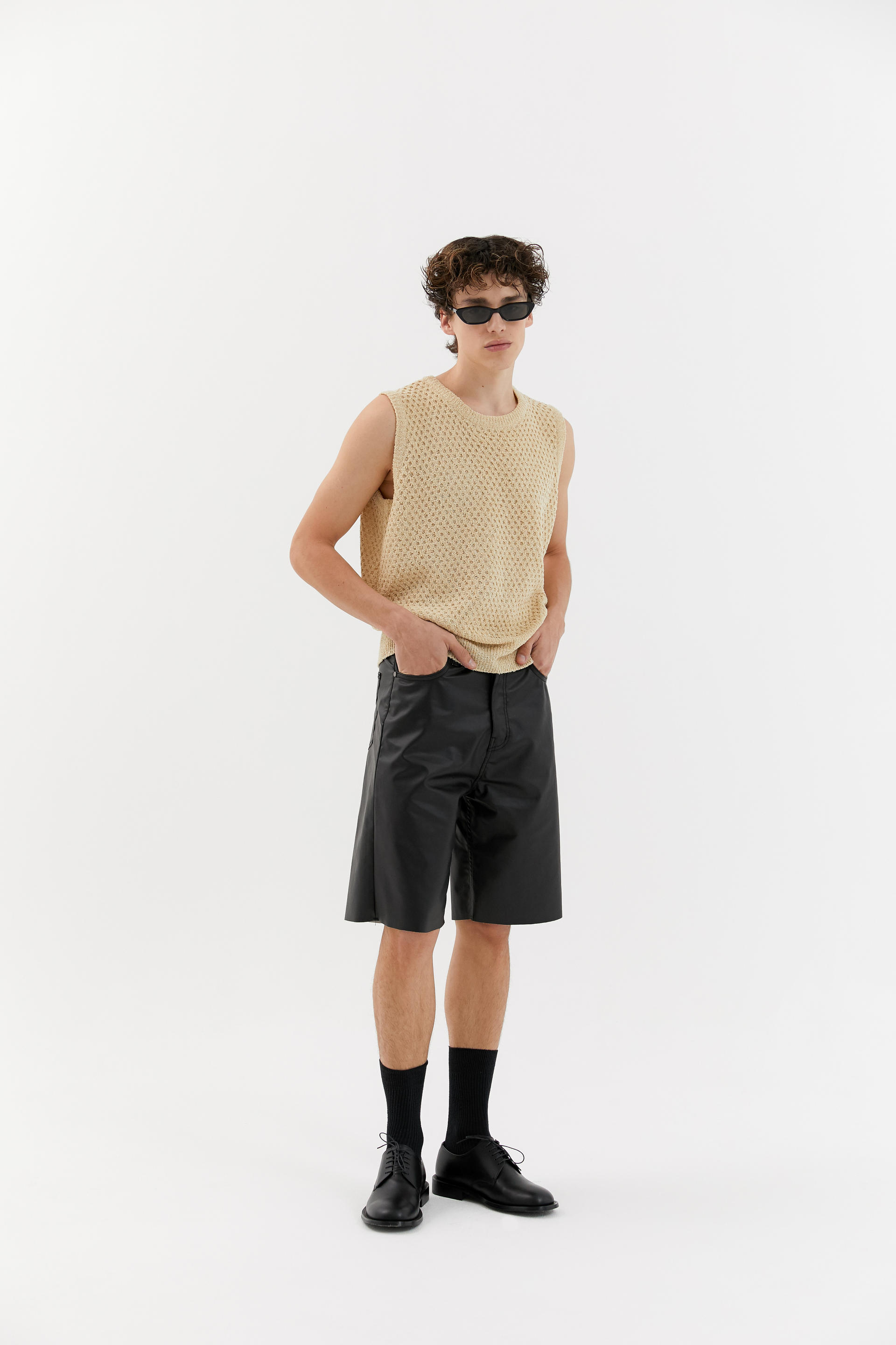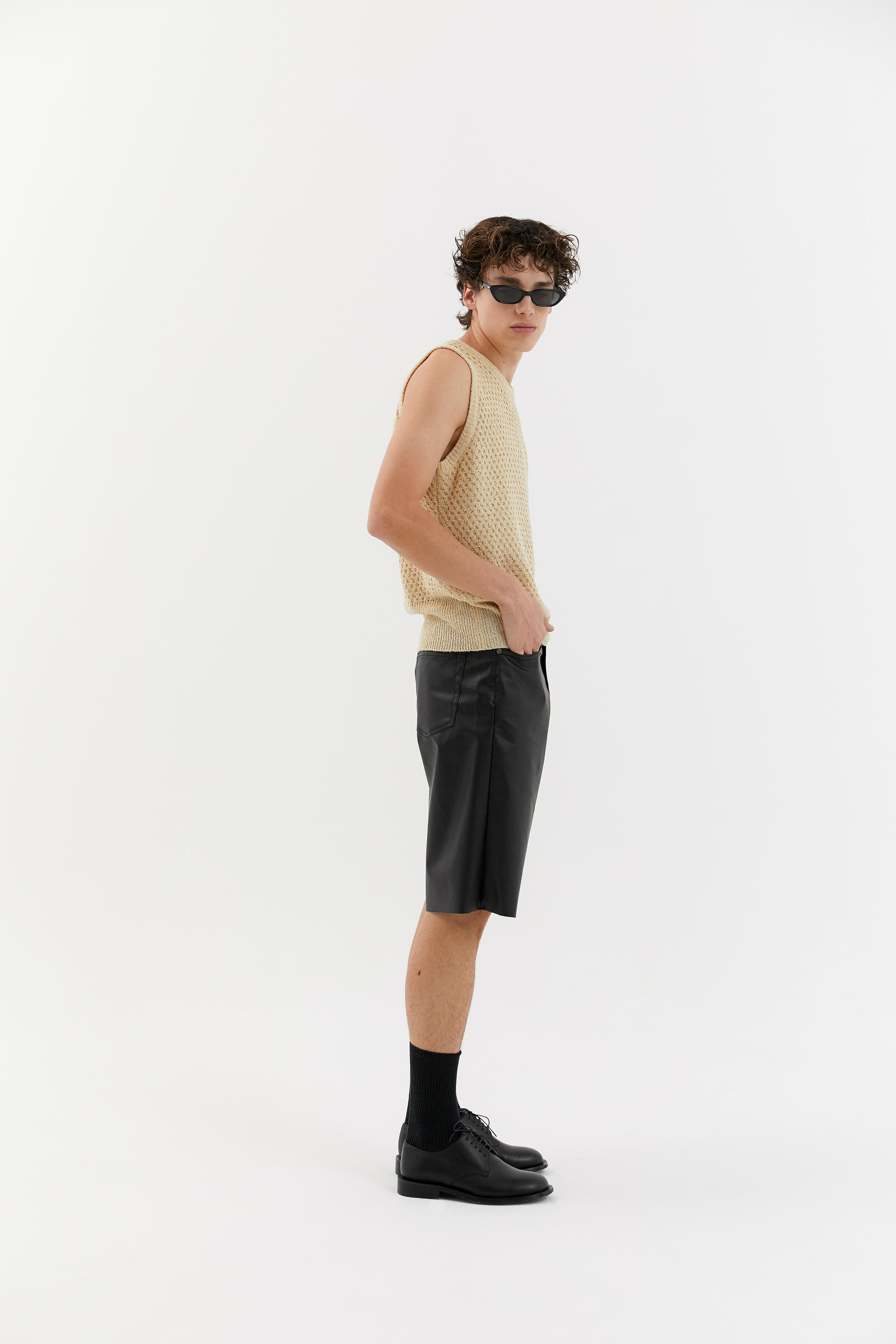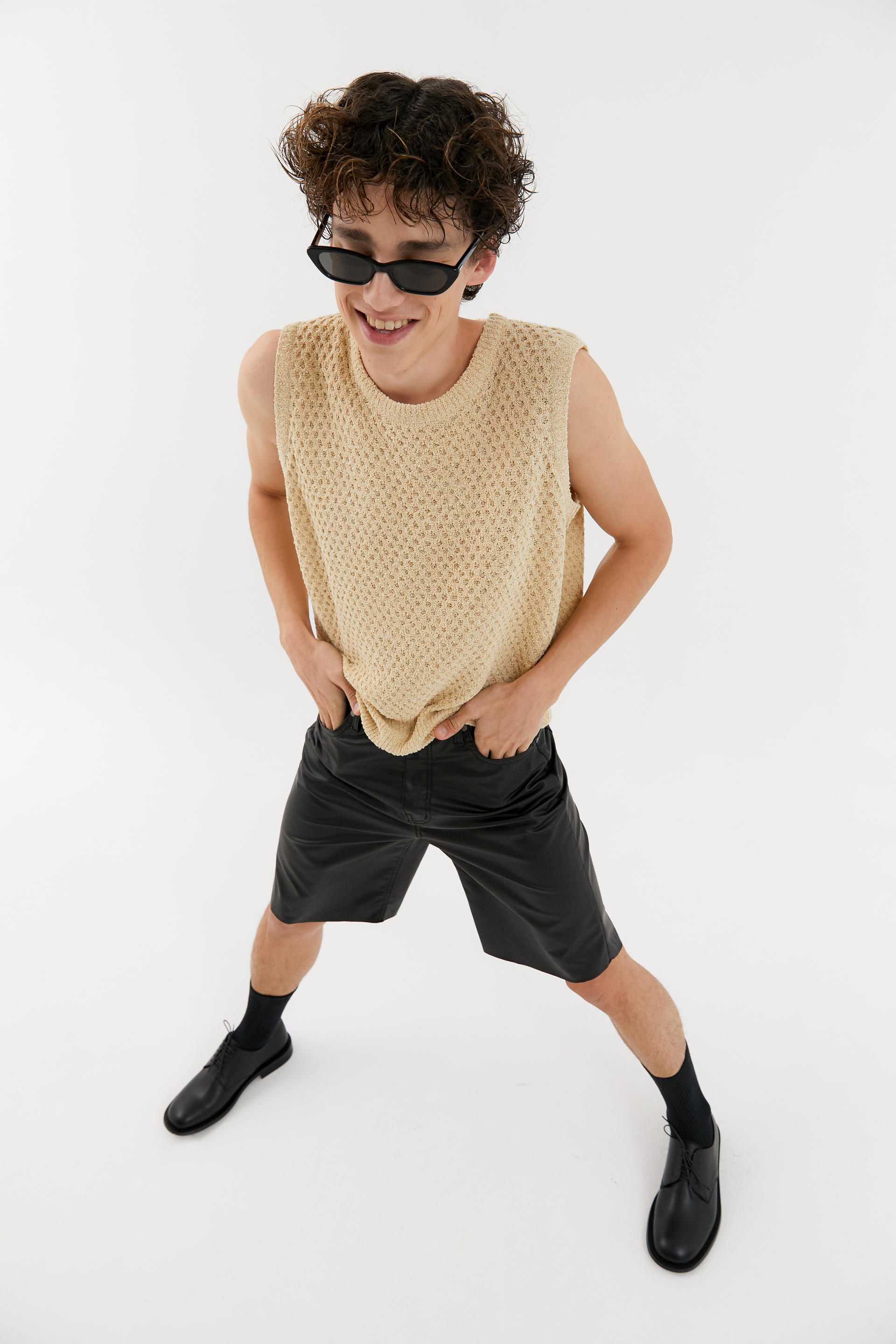 - 슬리브리스 니트웨어 - 입체적인 와플조직 얇은 두께의 원사를 두겹으로 편직하여 입체적인 와플 조직이 돋보이는 니트웨어입니다. 피부에 닫는 표면감이 시원하여 여름에 착용하기 좋은 니트입니다. |