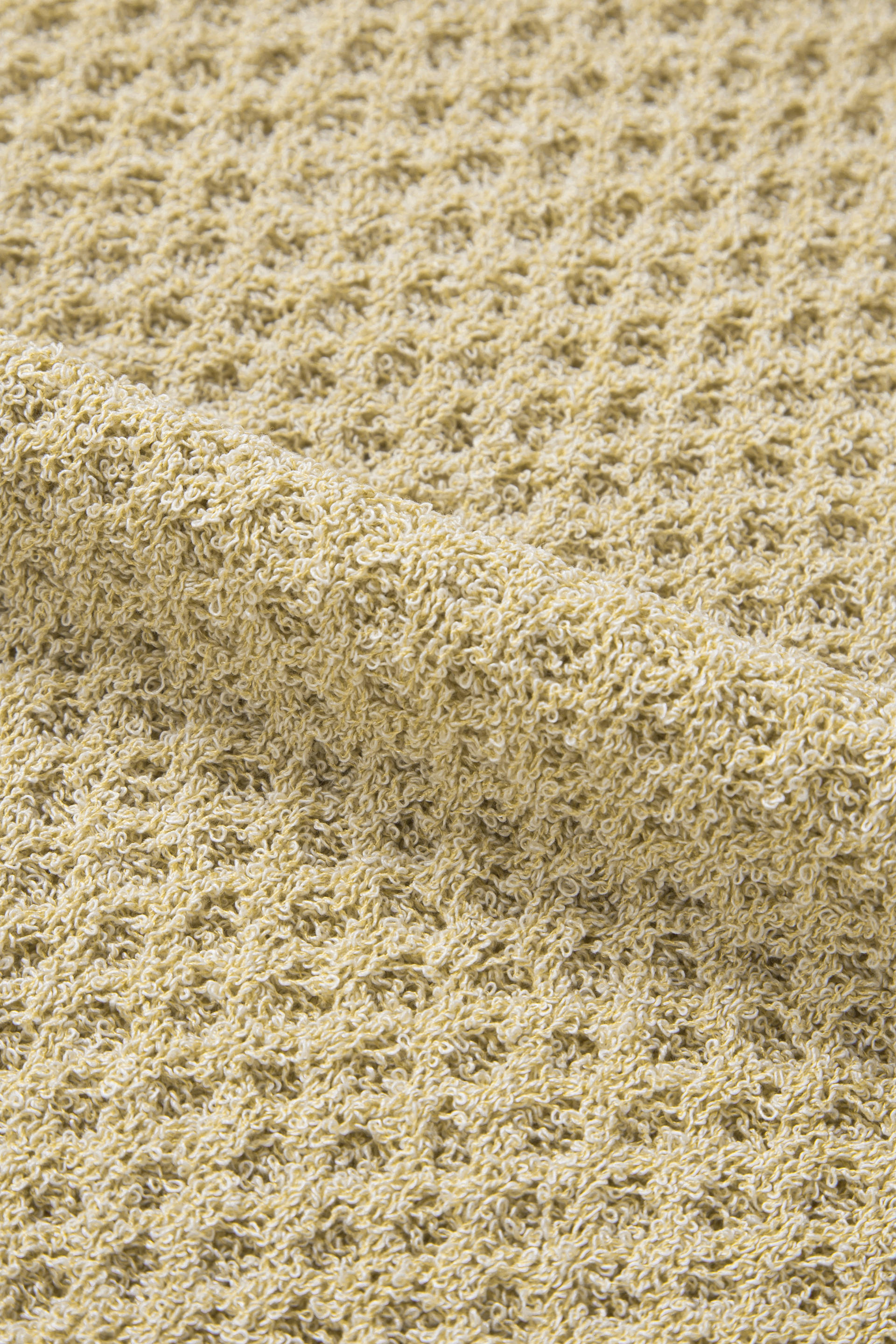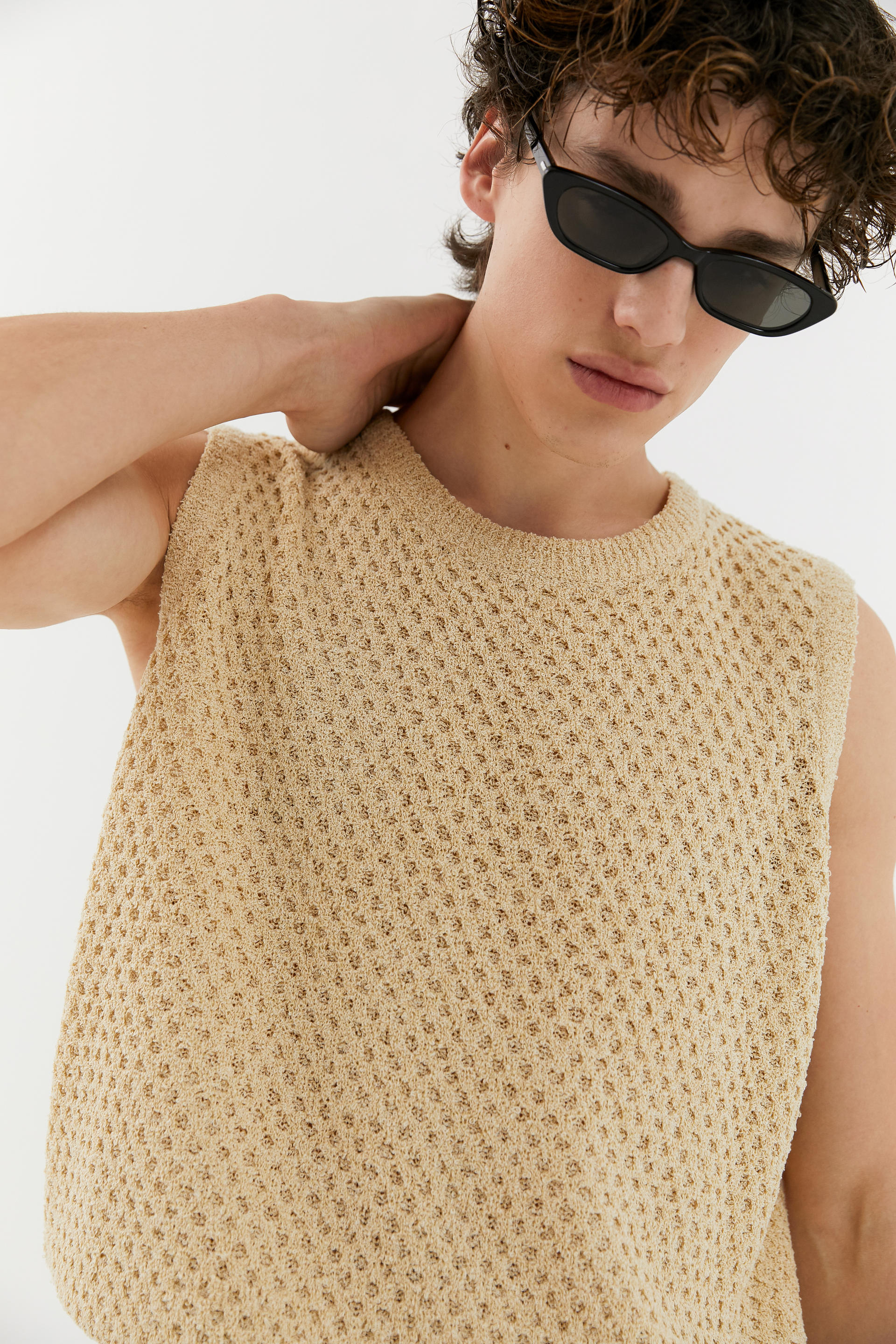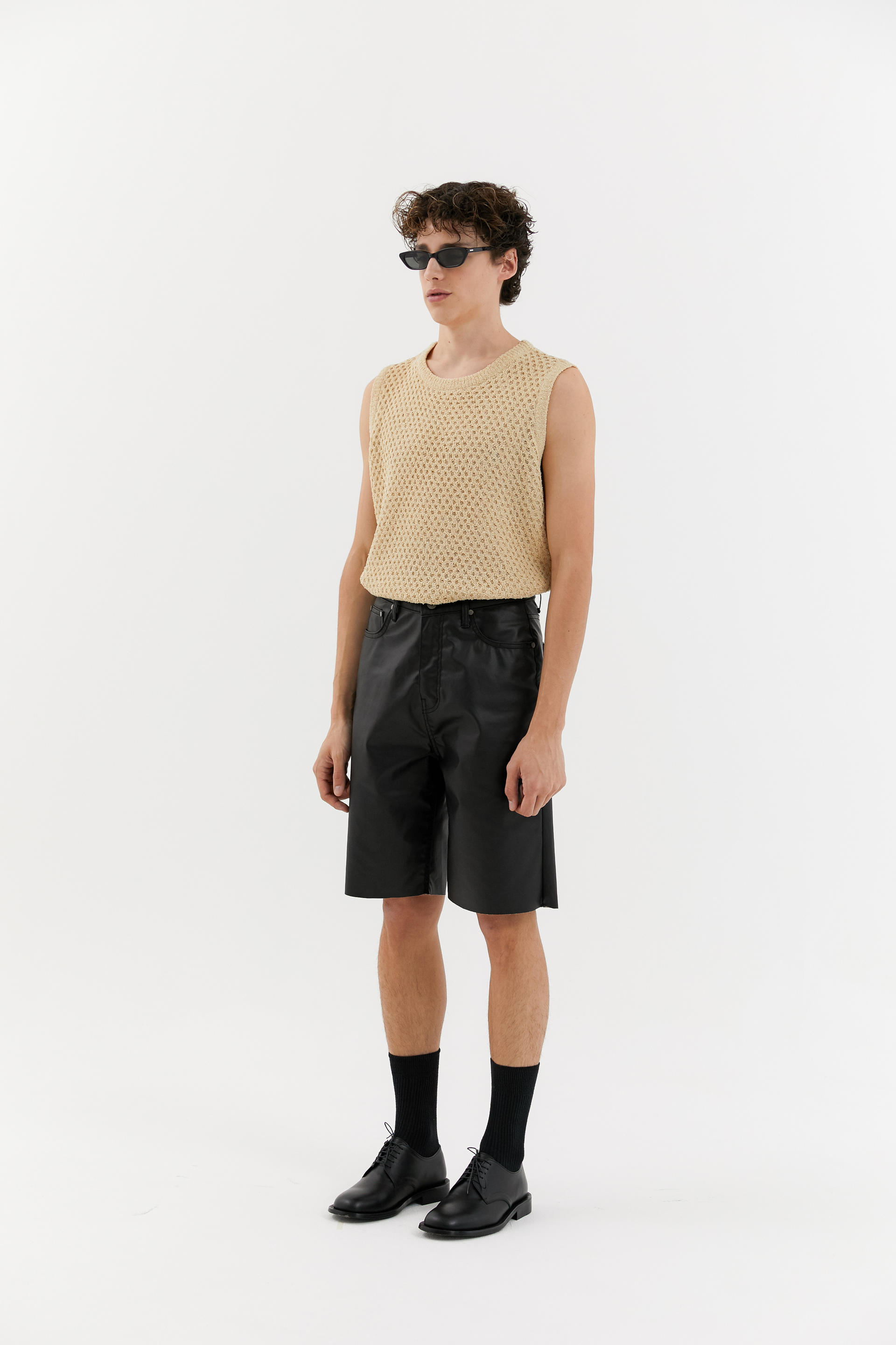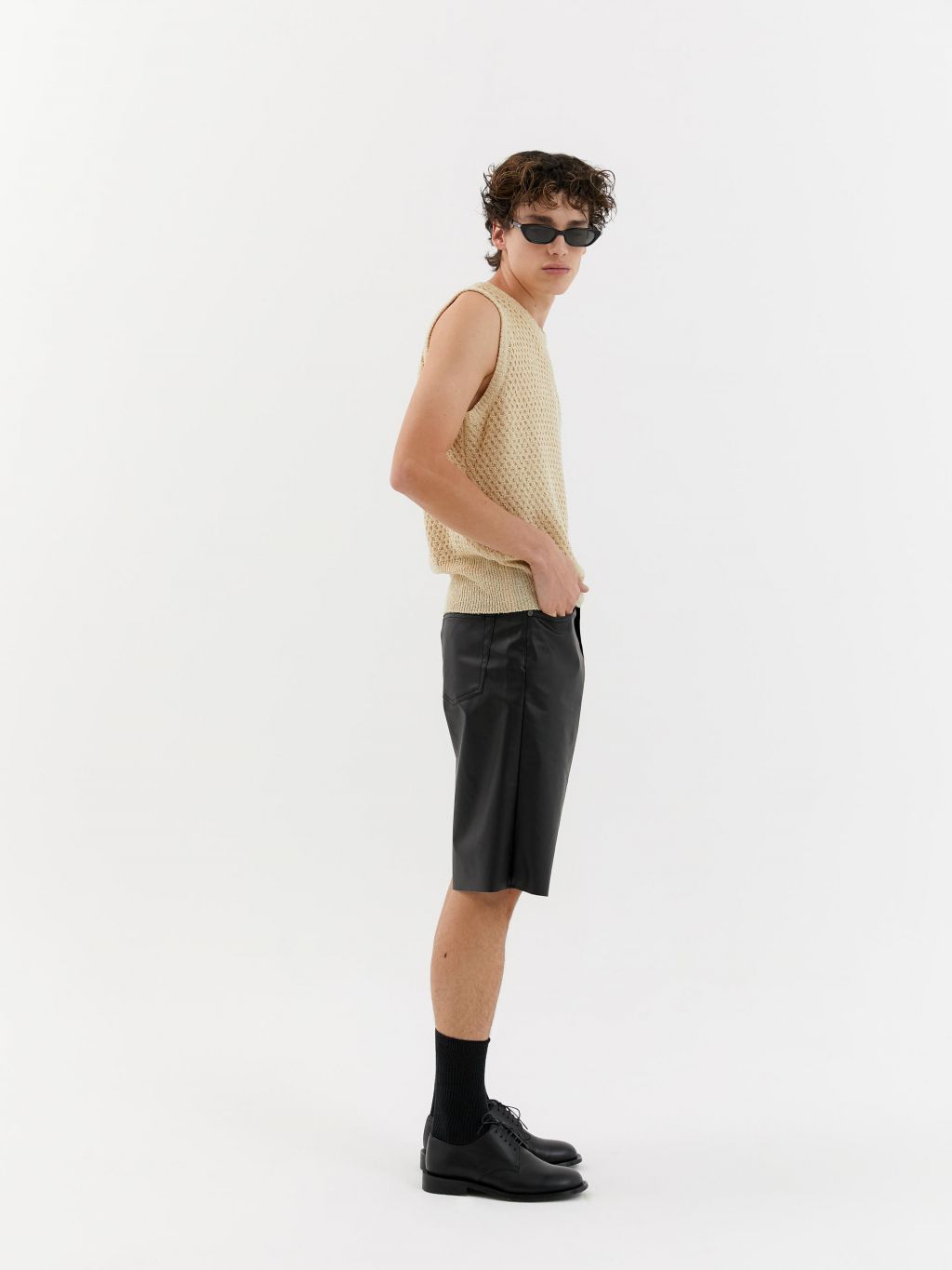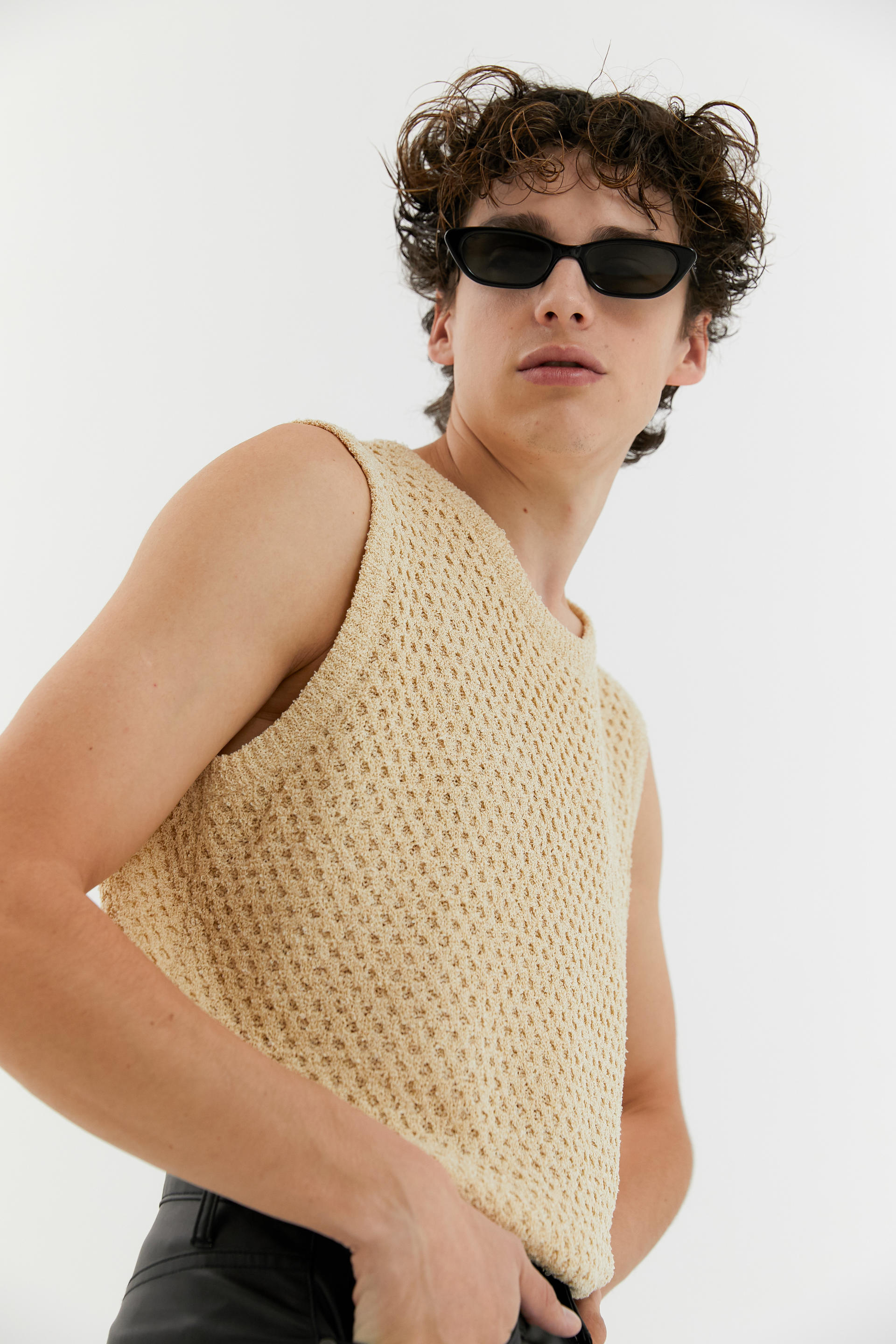 - 슬리브리스 니트웨어 - 입체적인 와플조직 얇은 두께의 원사를 두겹으로 편직하여 입체적인 와플 조직이 돋보이는 니트웨어입니다. 피부에 닫는 표면감이 시원하여 여름에 착용하기 좋은 니트입니다. |