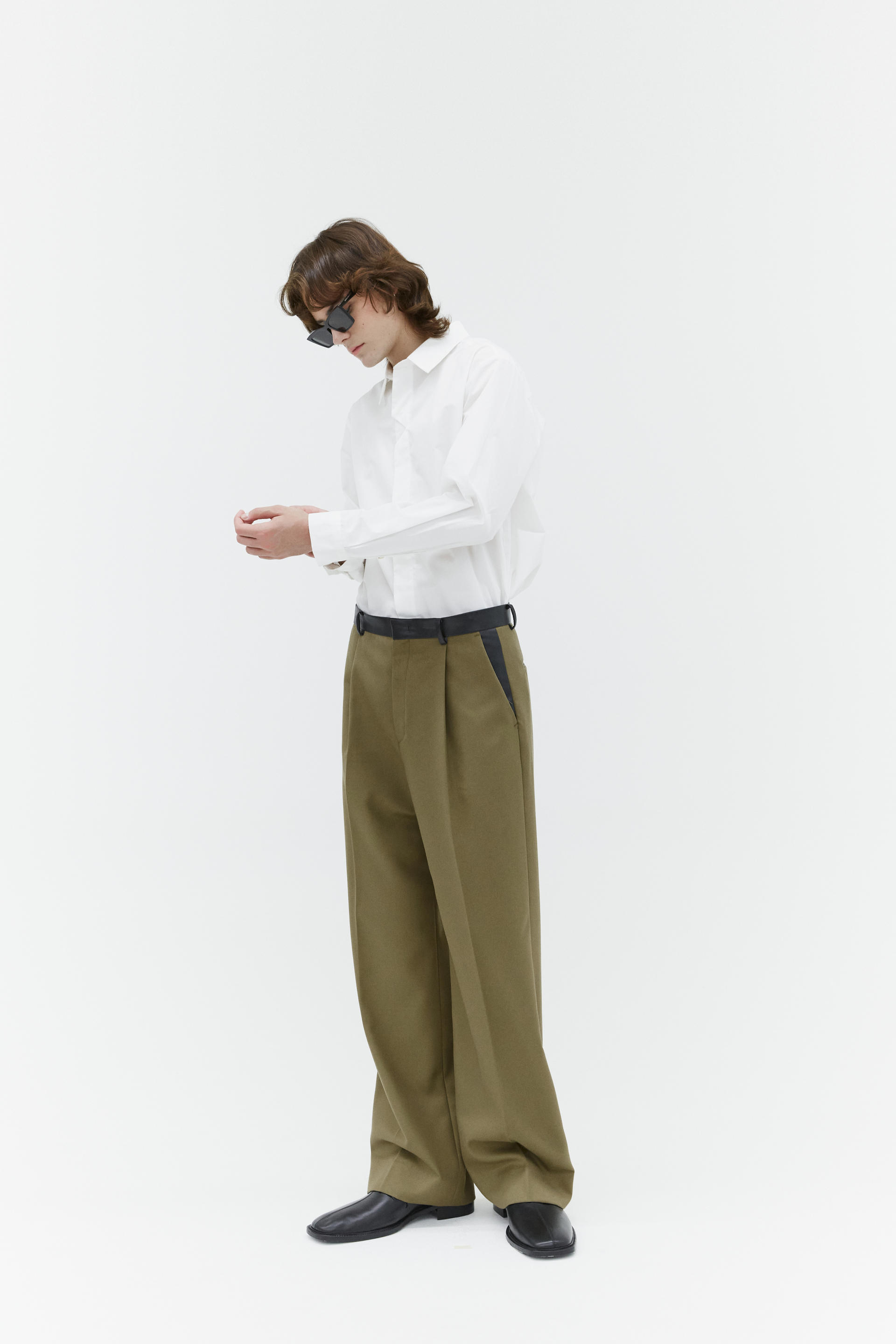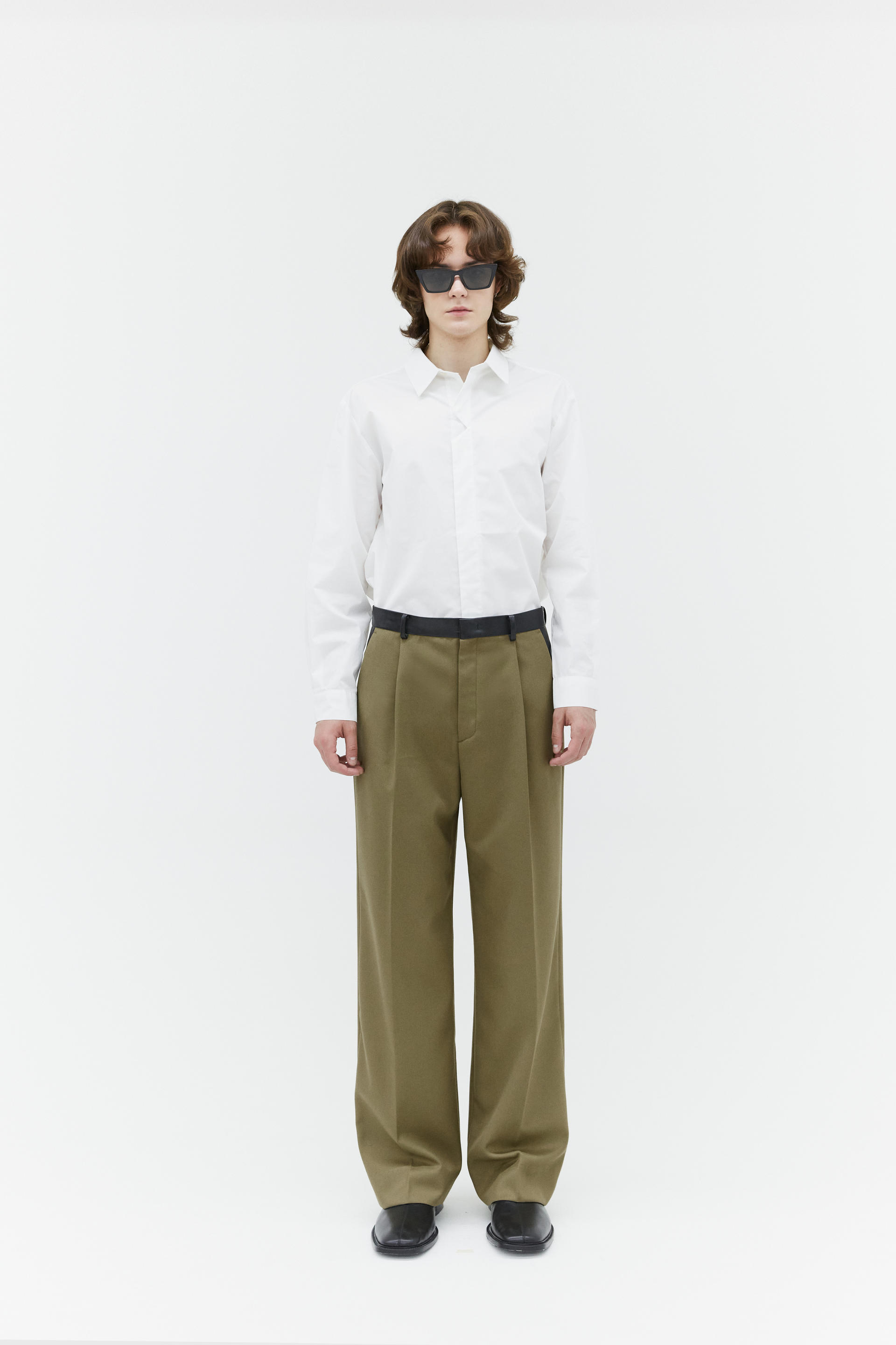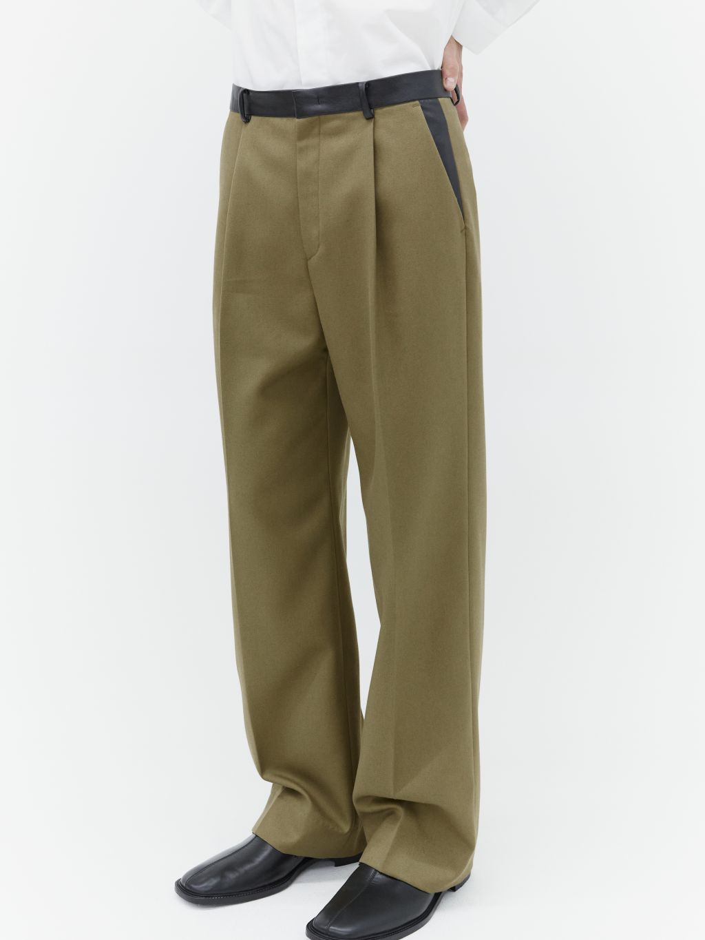 - 와이드 핏의 턱 슬랙스팬츠 - 벨트, 주머니에 가죽 디테일 - YKK 지퍼사용 - 이중 속단추 - 고급 소뿔단추 사용 |
