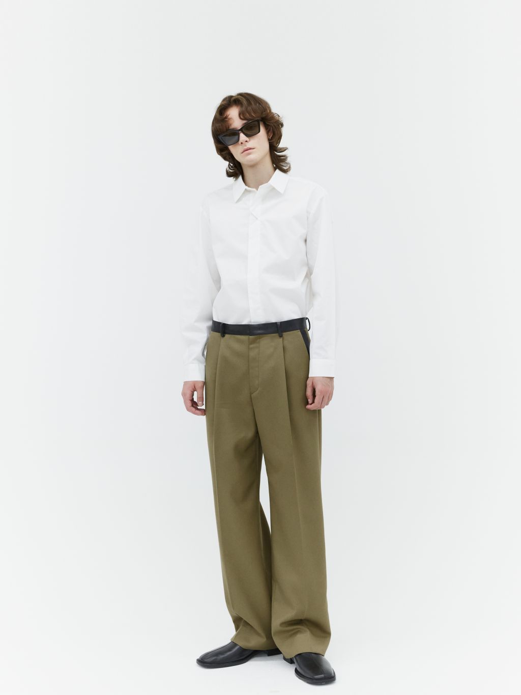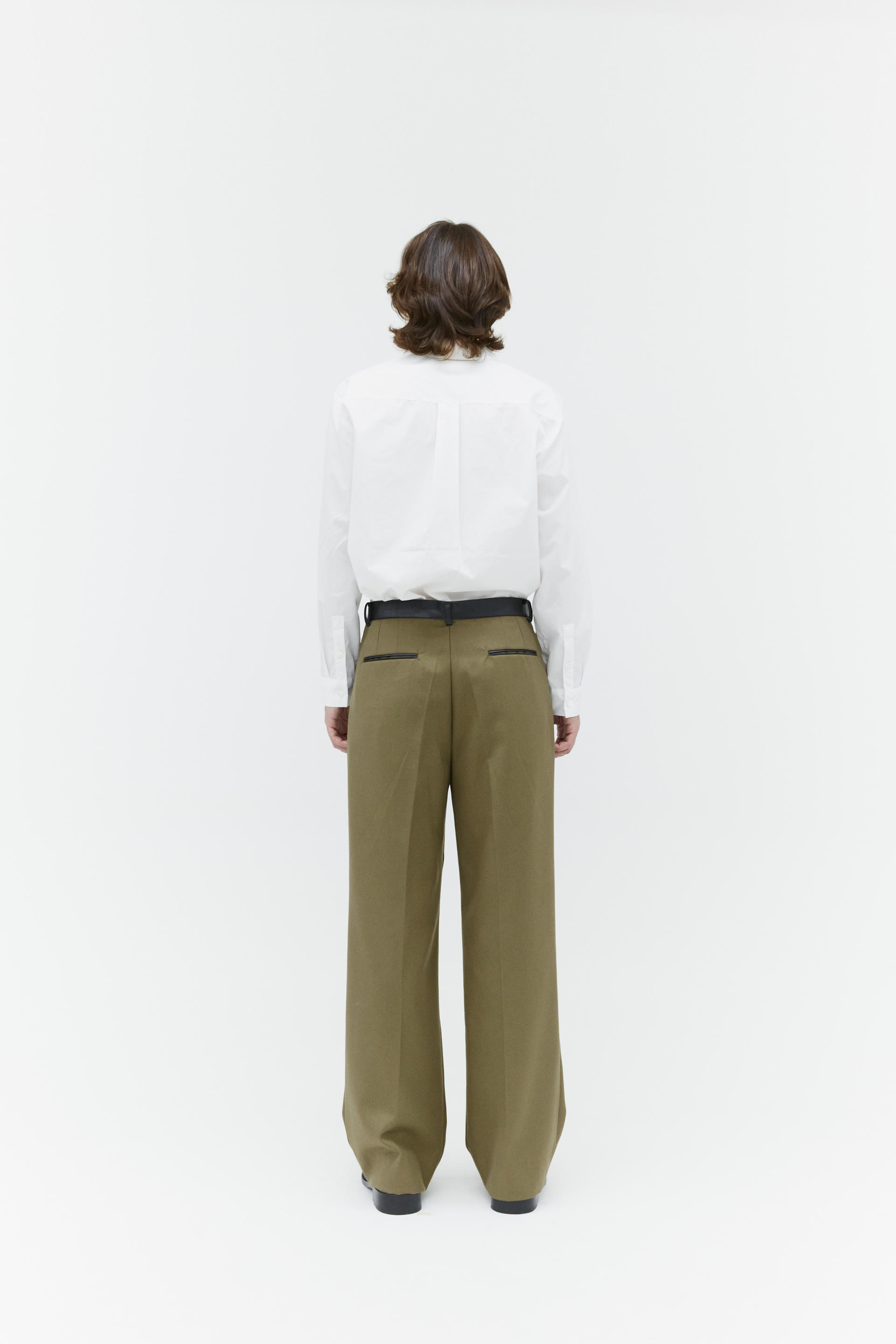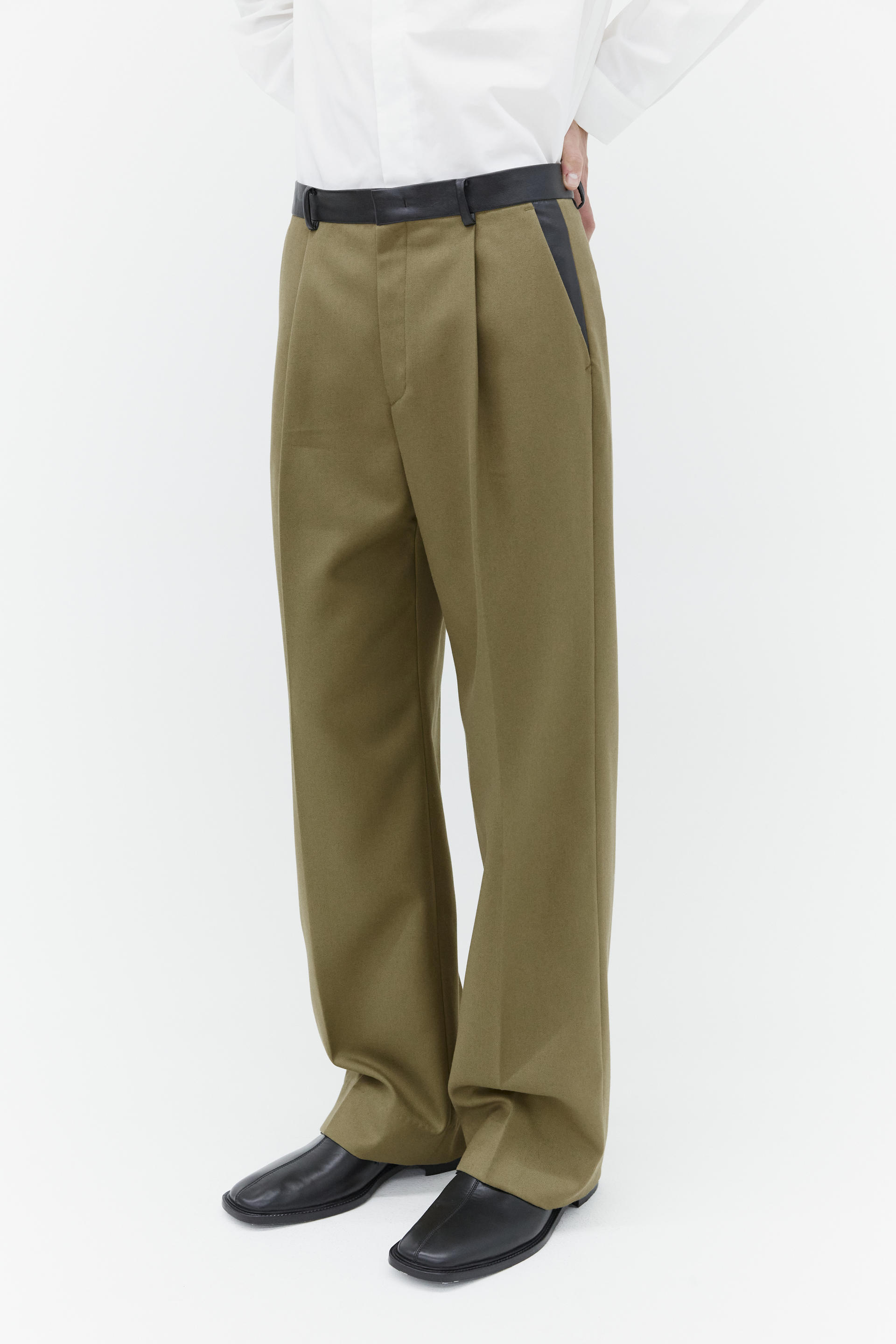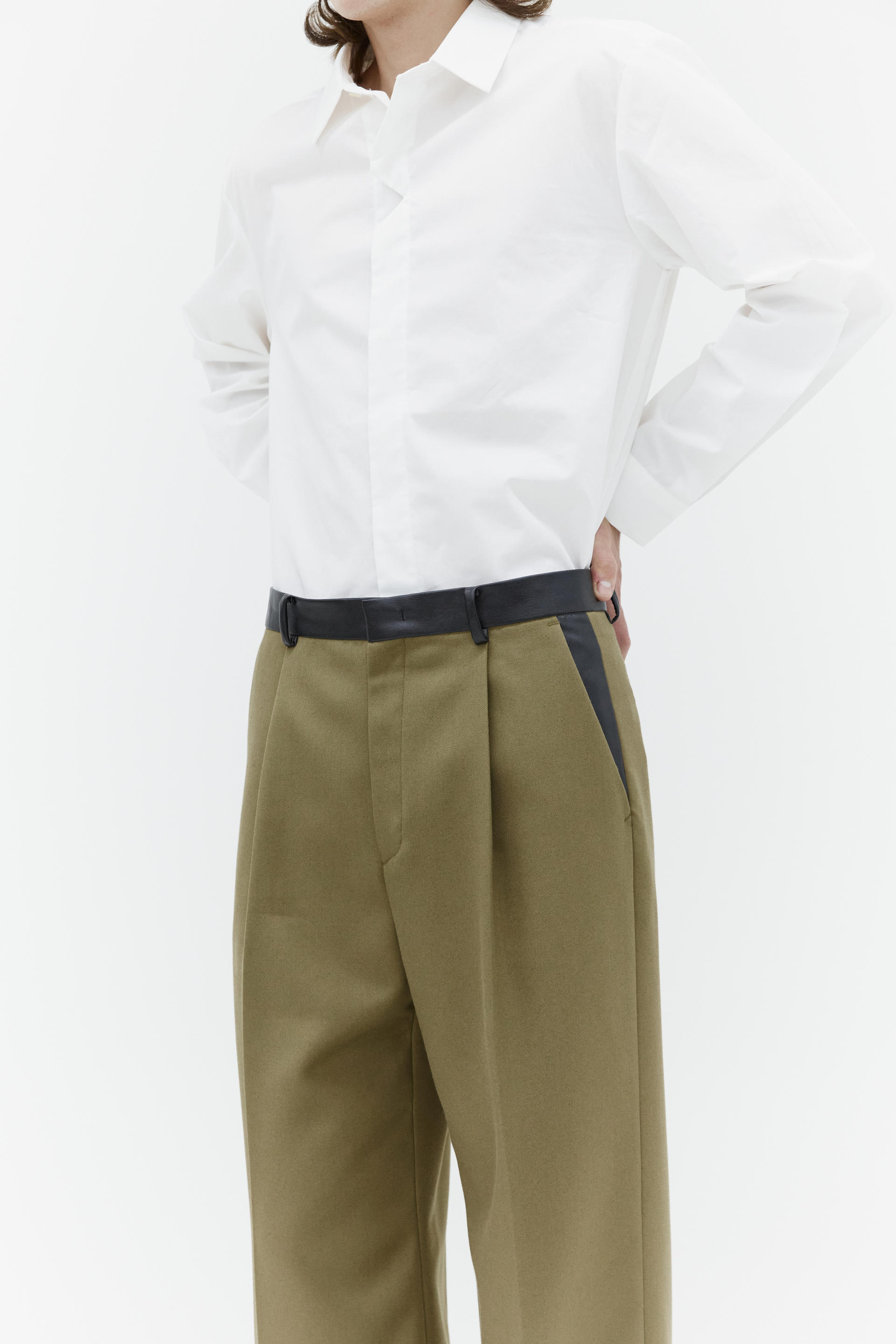 - 와이드 핏의 턱 슬랙스팬츠 - 벨트, 주머니에 가죽 디테일 - YKK 지퍼사용 - 이중 속단추 - 고급 소뿔단추 사용 |