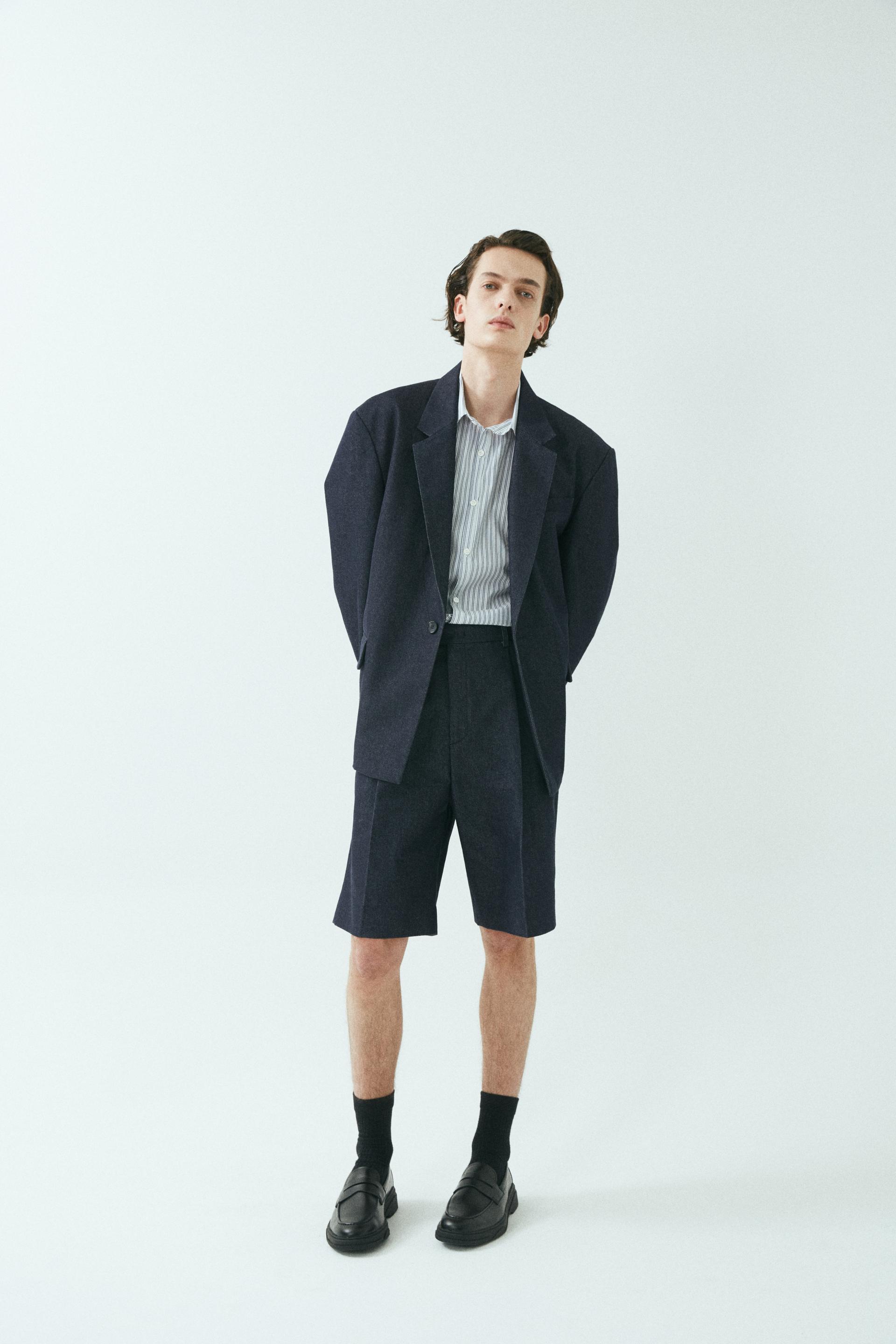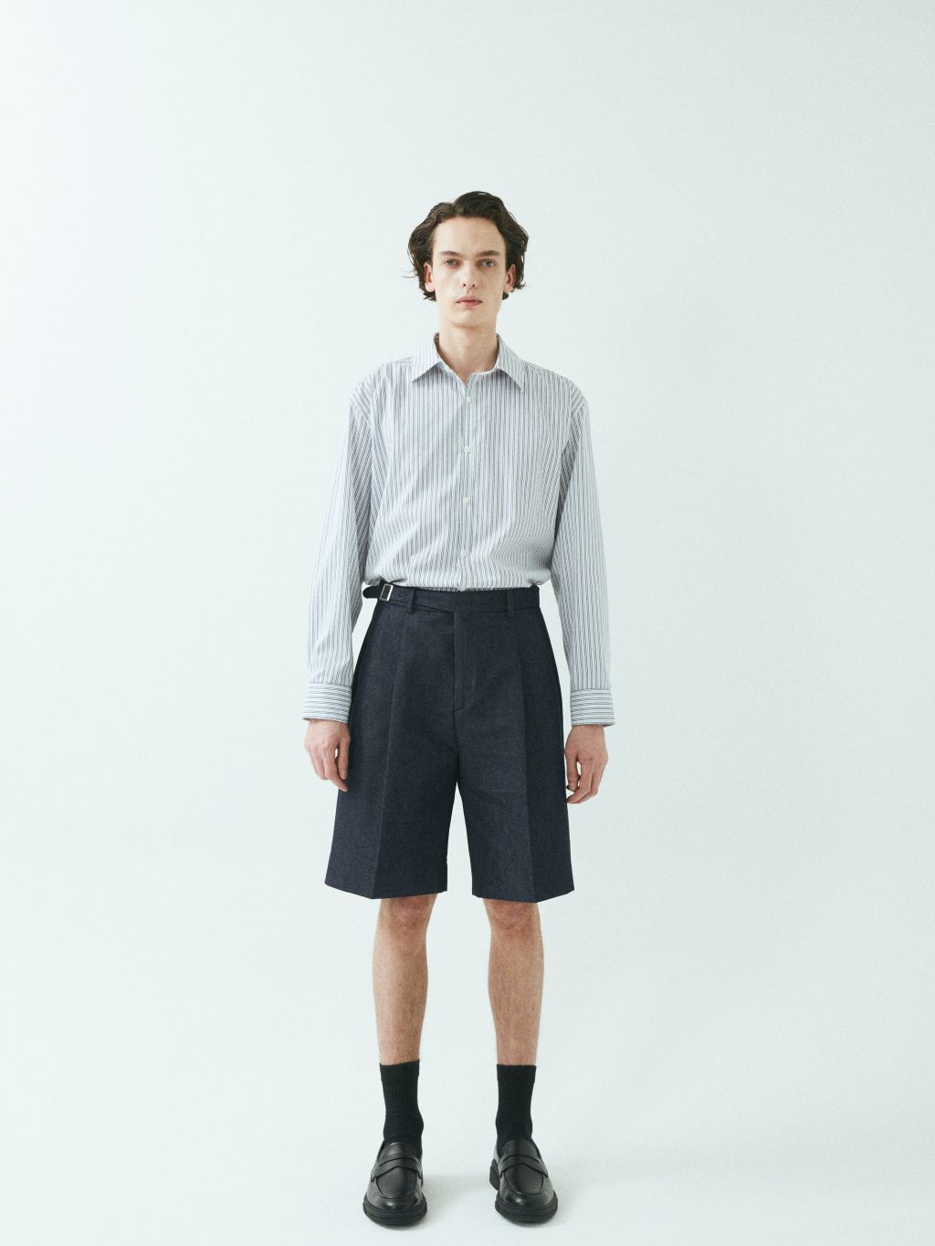 - 와이드 핏 버뮤다 쇼츠 - 웨이스트 밴드에 실버 버클 스트랩 - 싱글 턱 디테일 - 사이드 포켓/뒷면 더블 포켓 - 지퍼 플라이 웨이스트 밴드에 버클 디테일이 특징인 버뮤다 쇼츠입니다. 와이드 핏으로 착용되며 섬세한 프론트 싱글 턱 디테일로 제작되었습니다. *cotton loose-fit jacket 제품과 셋업으로 착용 가능합니다. |