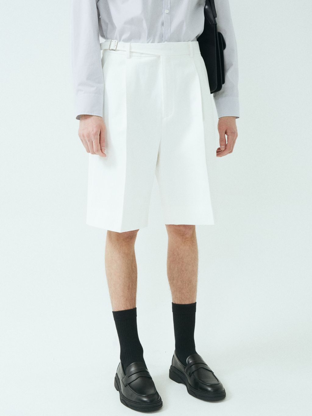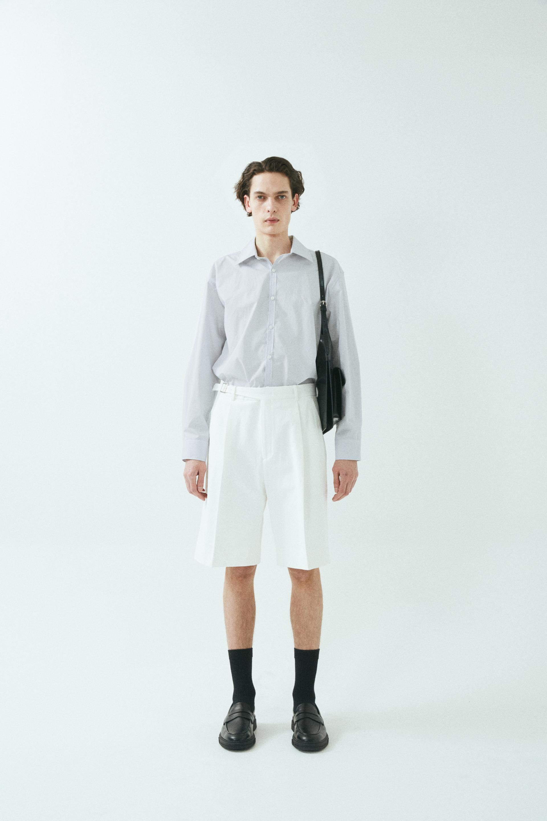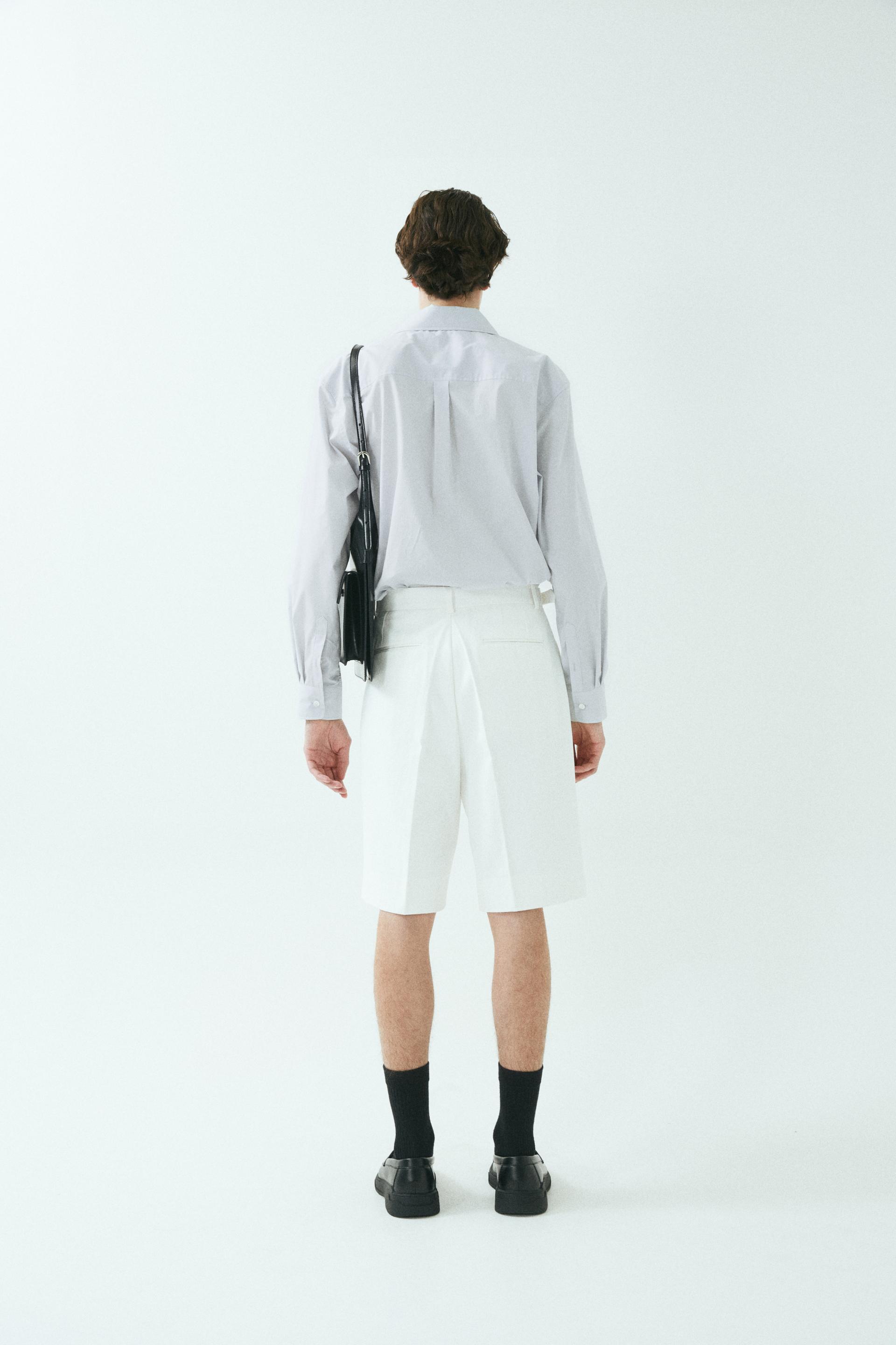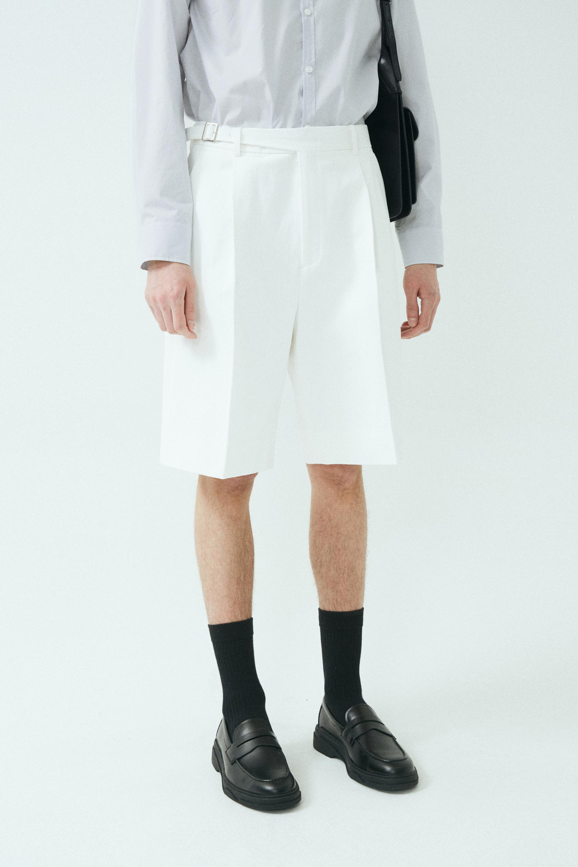 - 와이드 핏 버뮤다 쇼츠 - 웨이스트 밴드에 실버 버클 스트랩 - 싱글 턱 디테일 - 사이드 포켓/뒷면 더블 포켓 - 지퍼 플라이 웨이스트 밴드에 버클 디테일이 특징인 버뮤다 쇼츠입니다. 와이드 핏으로 착용되며 섬세한 프론트 싱글 턱 디테일로 제작되었습니다. *cotton loose-fit jacket 제품과 셋업으로 착용 가능합니다. |