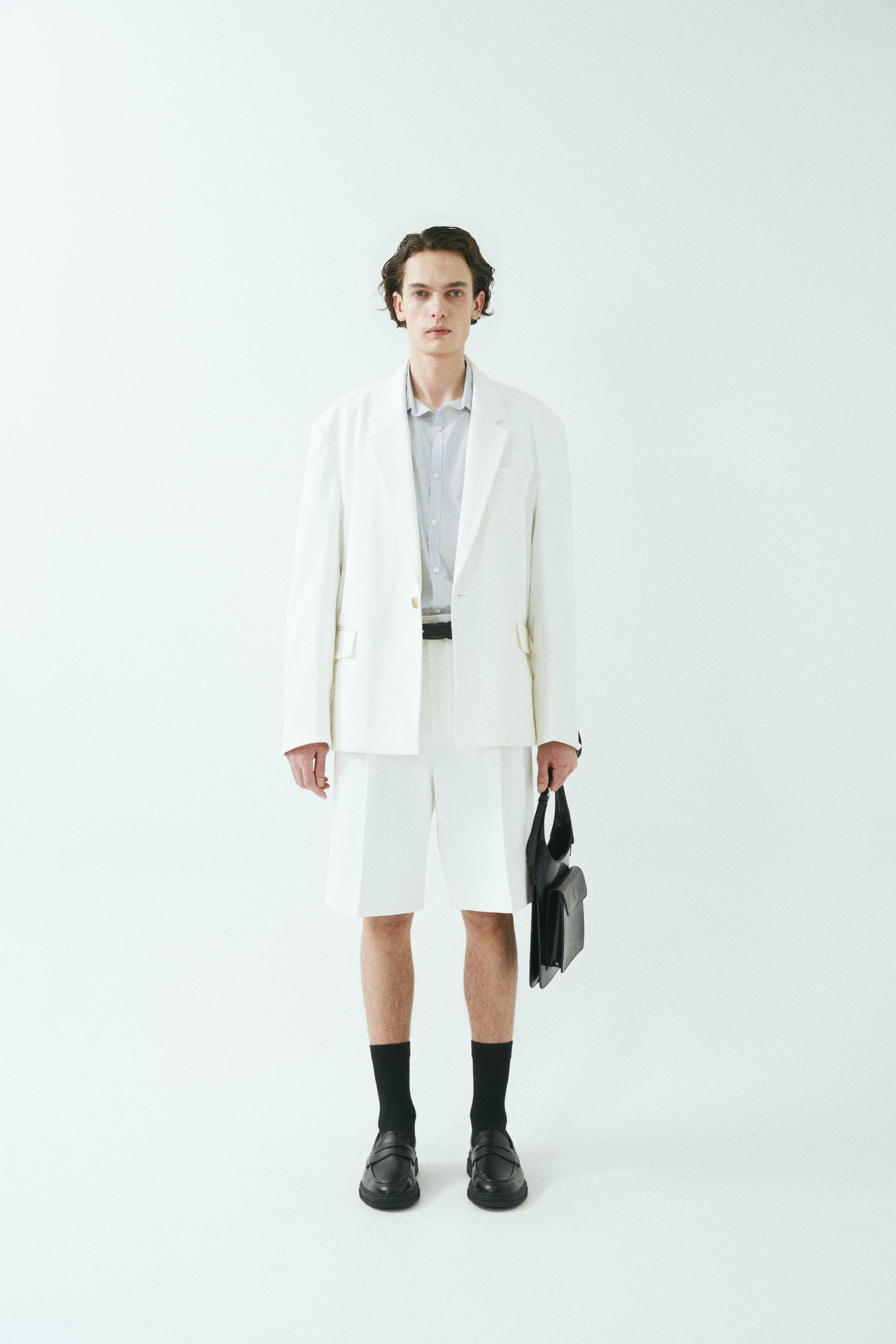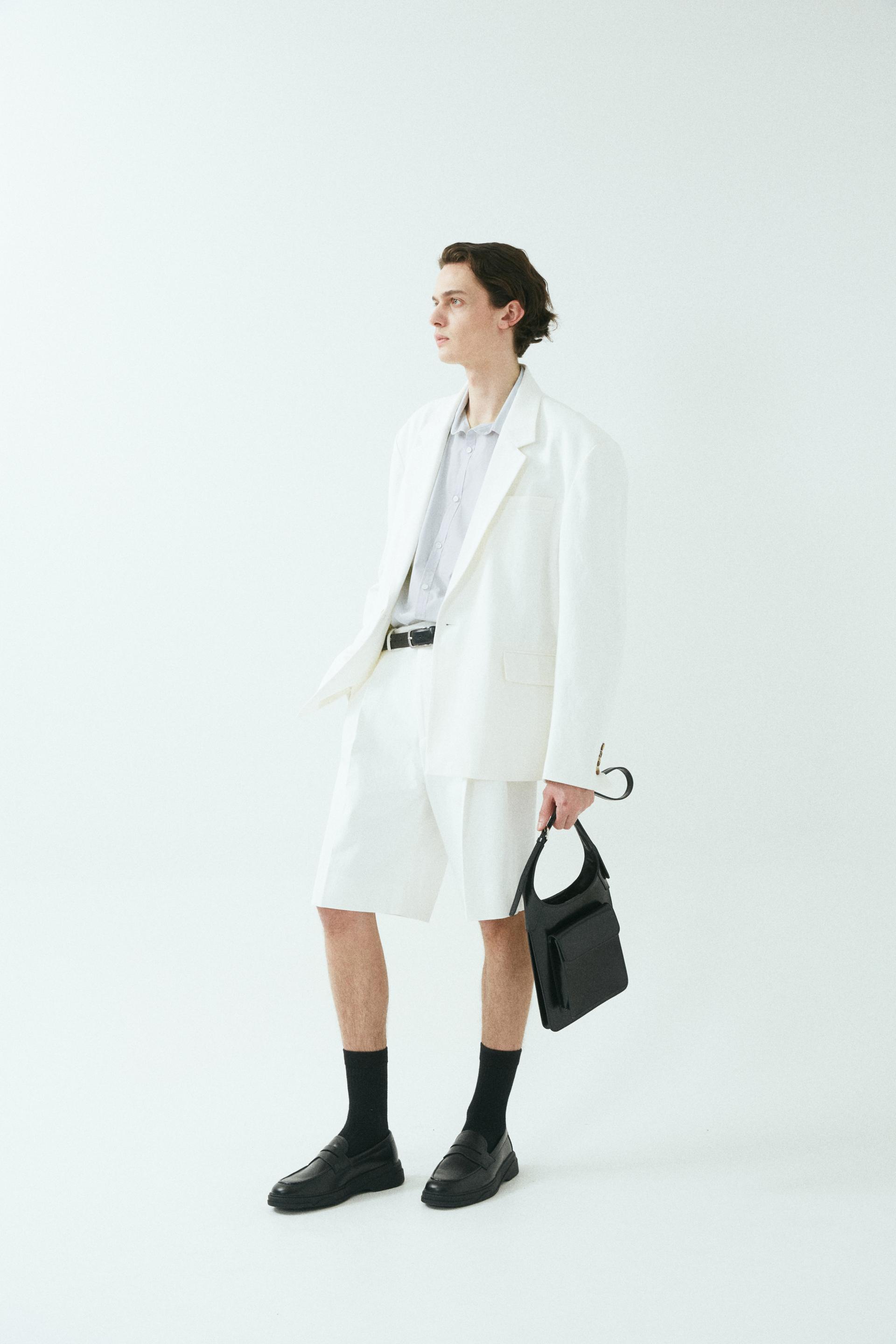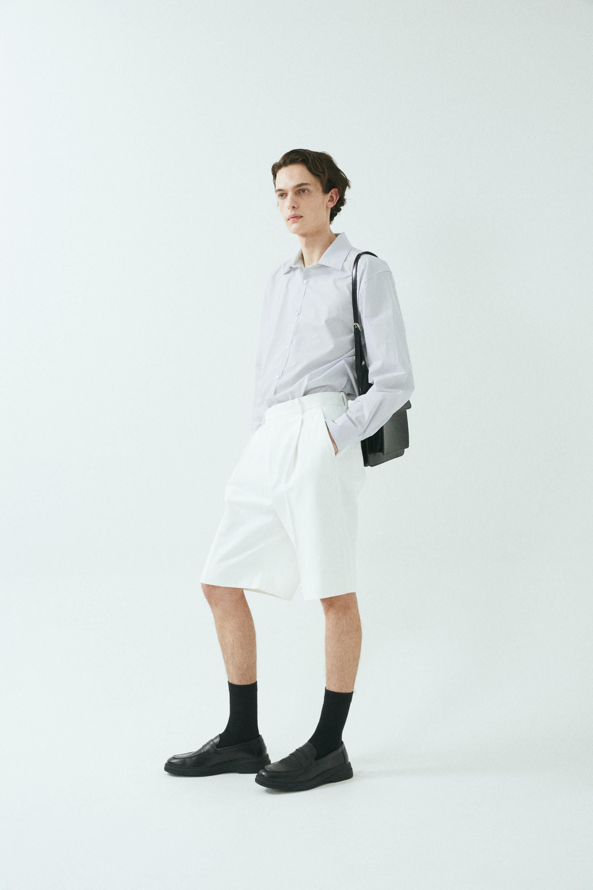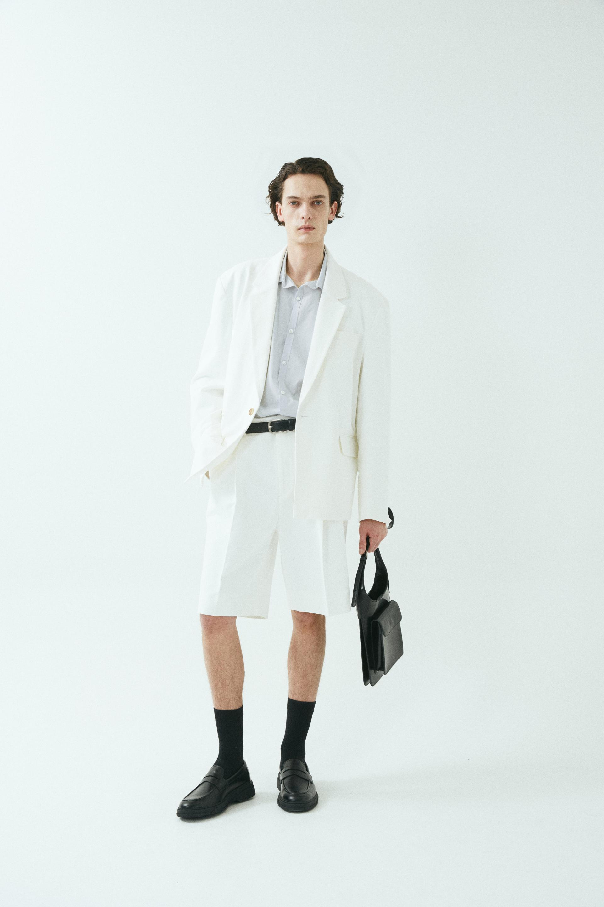 - 와이드 핏 버뮤다 쇼츠 - 웨이스트 밴드에 실버 버클 스트랩 - 싱글 턱 디테일 - 사이드 포켓/뒷면 더블 포켓 - 지퍼 플라이 웨이스트 밴드에 버클 디테일이 특징인 버뮤다 쇼츠입니다. 와이드 핏으로 착용되며 섬세한 프론트 싱글 턱 디테일로 제작되었습니다. *cotton loose-fit jacket 제품과 셋업으로 착용 가능합니다. |