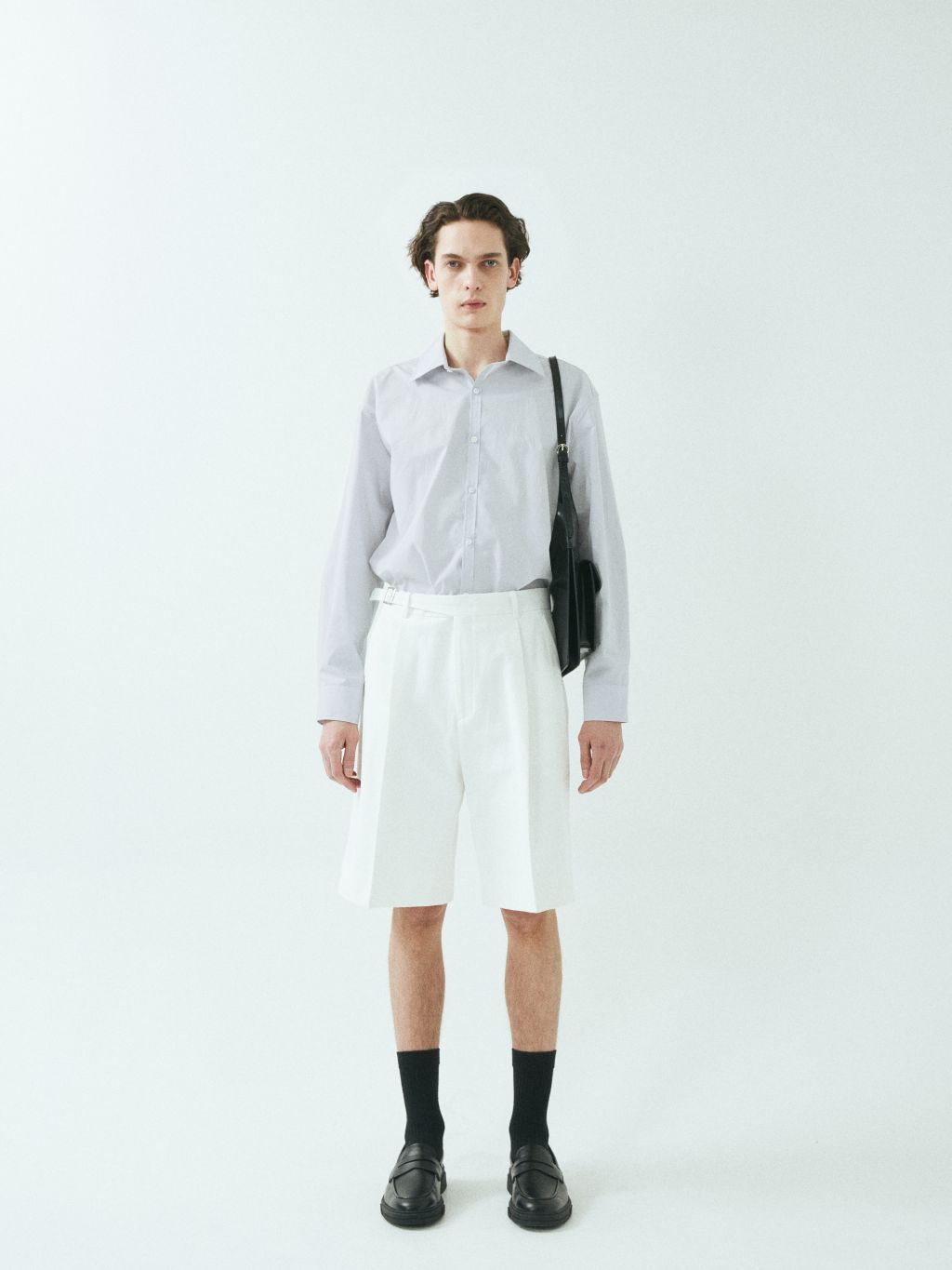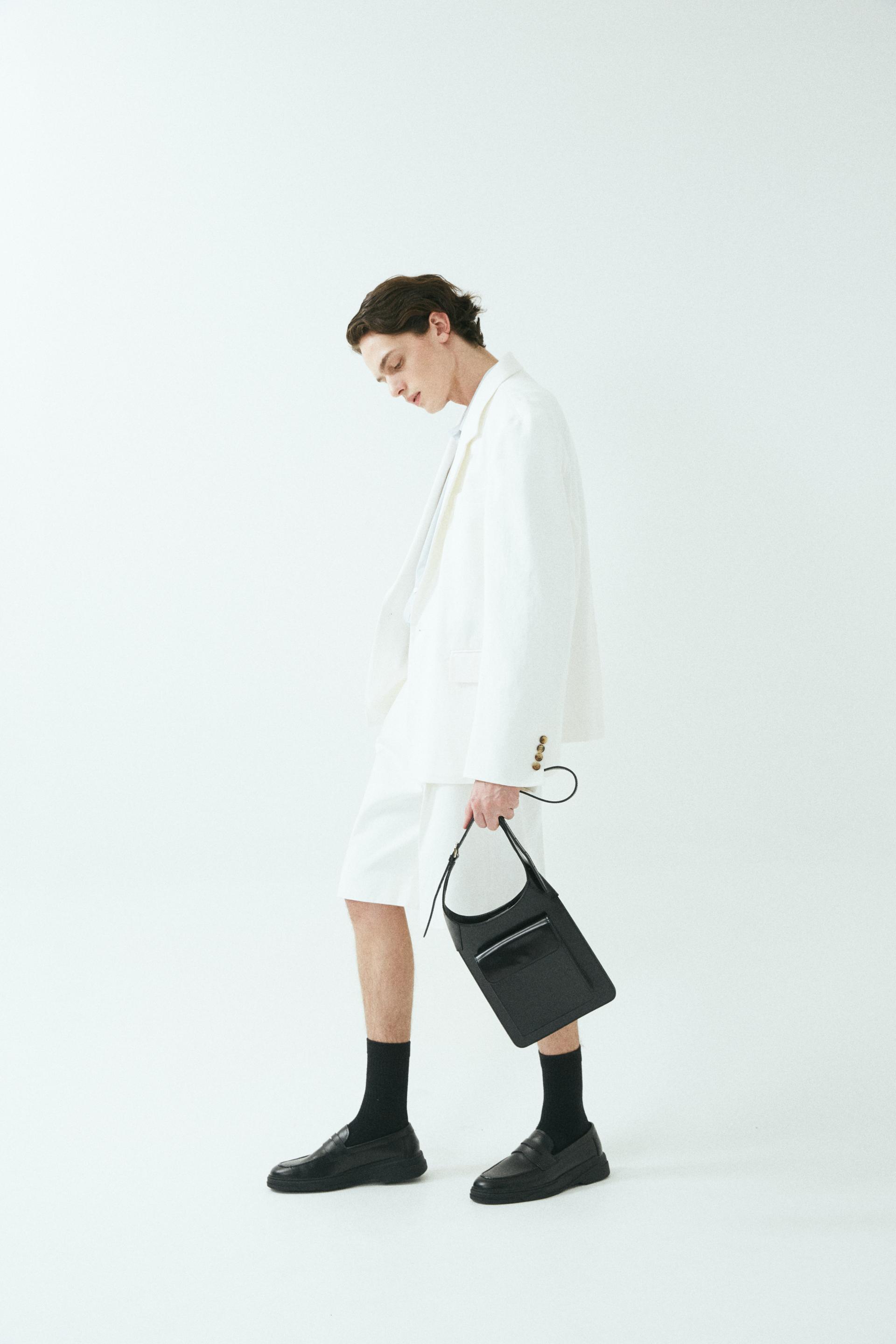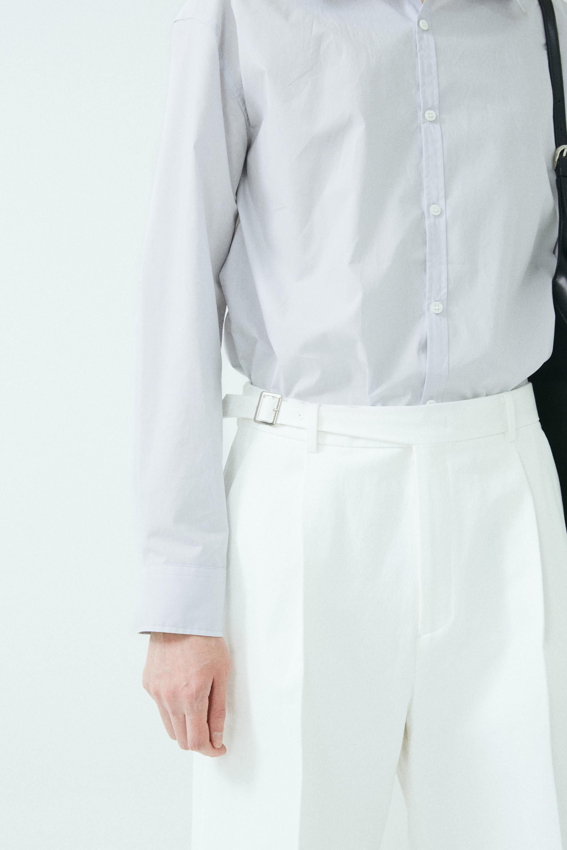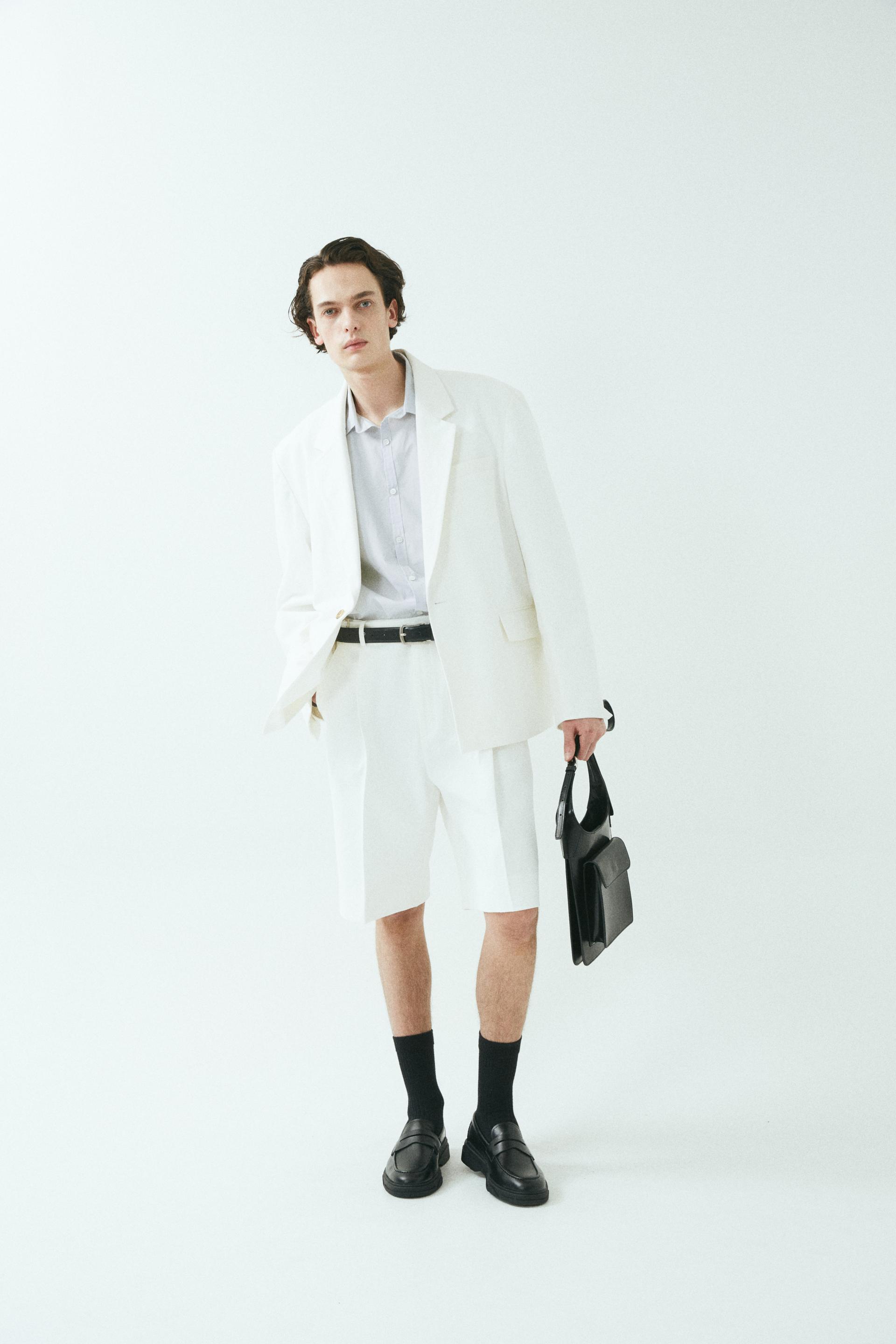 - 와이드 핏 버뮤다 쇼츠 - 웨이스트 밴드에 실버 버클 스트랩 - 싱글 턱 디테일 - 사이드 포켓/뒷면 더블 포켓 - 지퍼 플라이 웨이스트 밴드에 버클 디테일이 특징인 버뮤다 쇼츠입니다. 와이드 핏으로 착용되며 섬세한 프론트 싱글 턱 디테일로 제작되었습니다. *cotton loose-fit jacket 제품과 셋업으로 착용 가능합니다. |