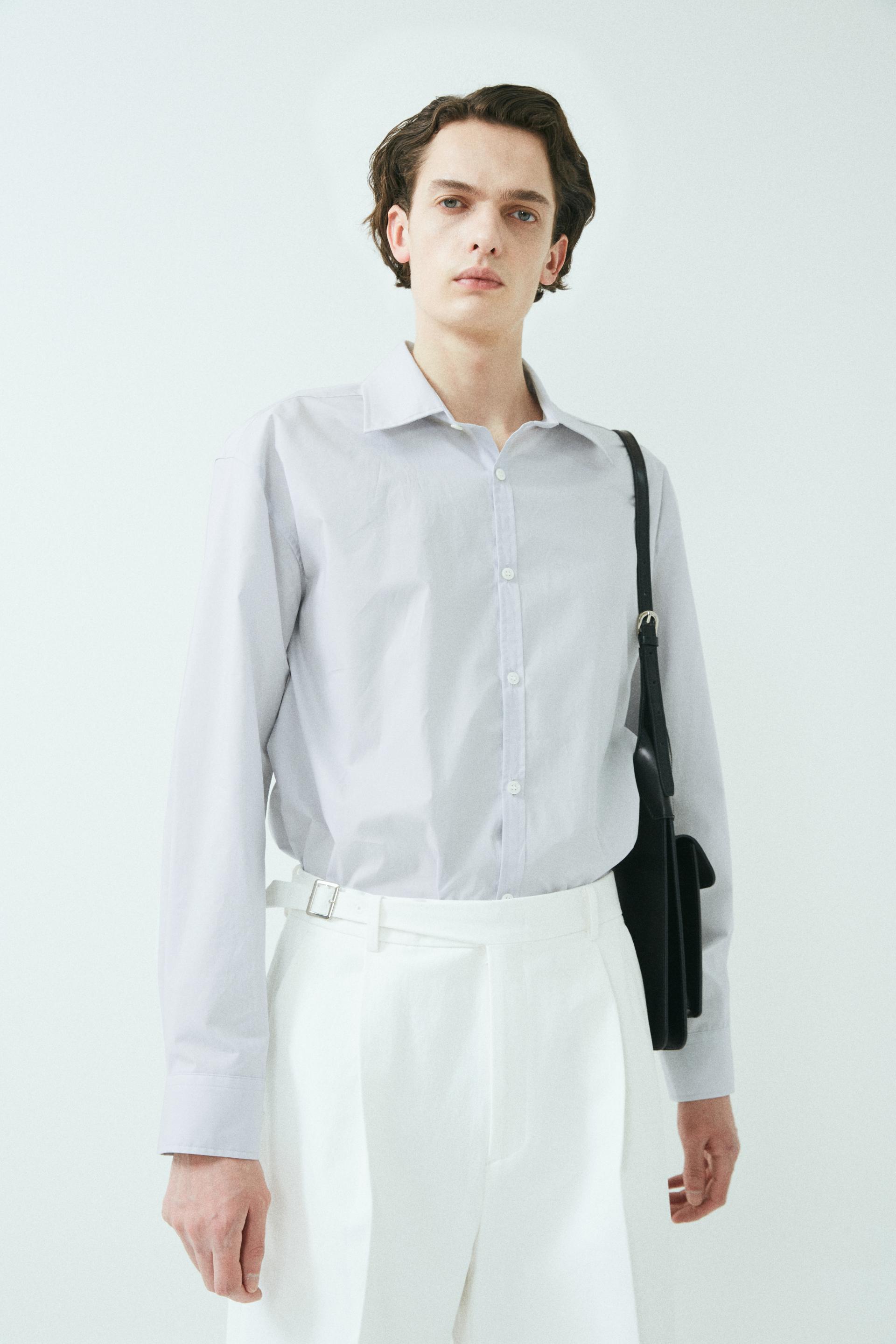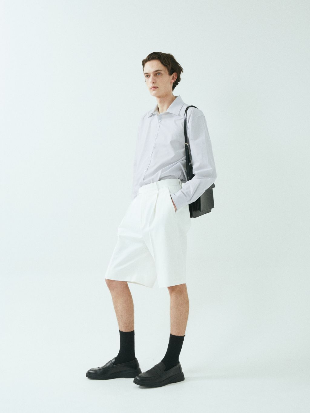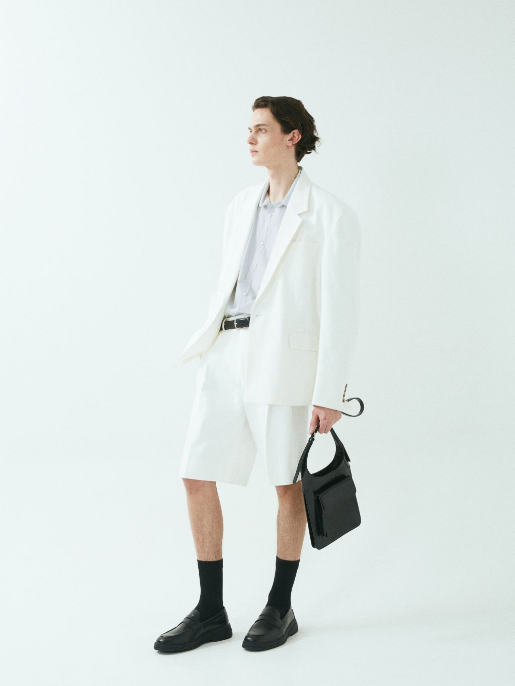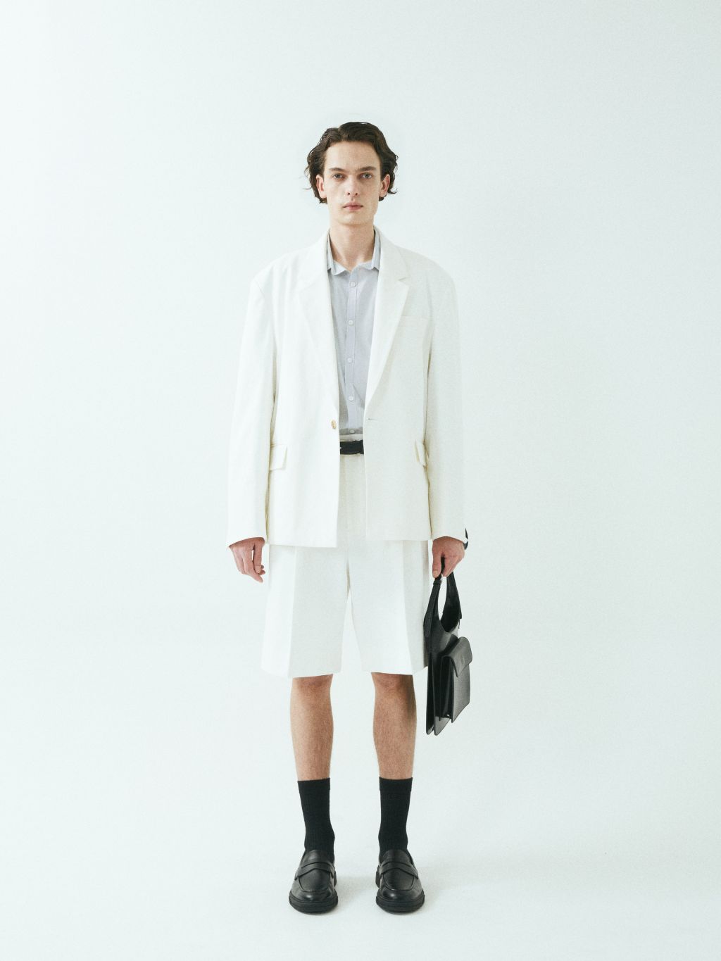 - 와이드 핏 버뮤다 쇼츠 - 웨이스트 밴드에 실버 버클 스트랩 - 싱글 턱 디테일 - 사이드 포켓/뒷면 더블 포켓 - 지퍼 플라이 웨이스트 밴드에 버클 디테일이 특징인 버뮤다 쇼츠입니다. 와이드 핏으로 착용되며 섬세한 프론트 싱글 턱 디테일로 제작되었습니다. *cotton loose-fit jacket 제품과 셋업으로 착용 가능합니다. |