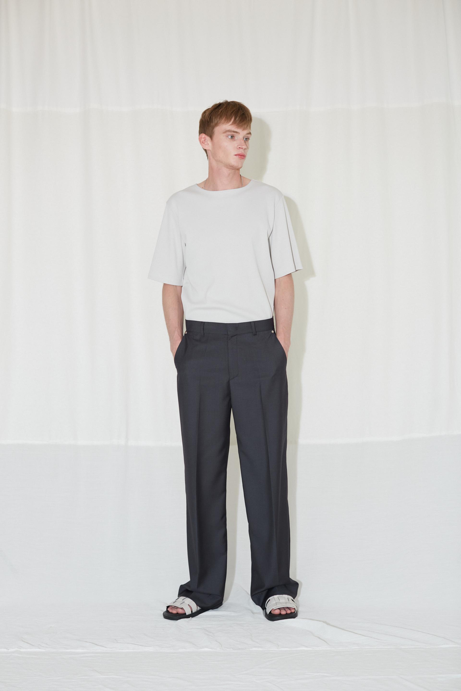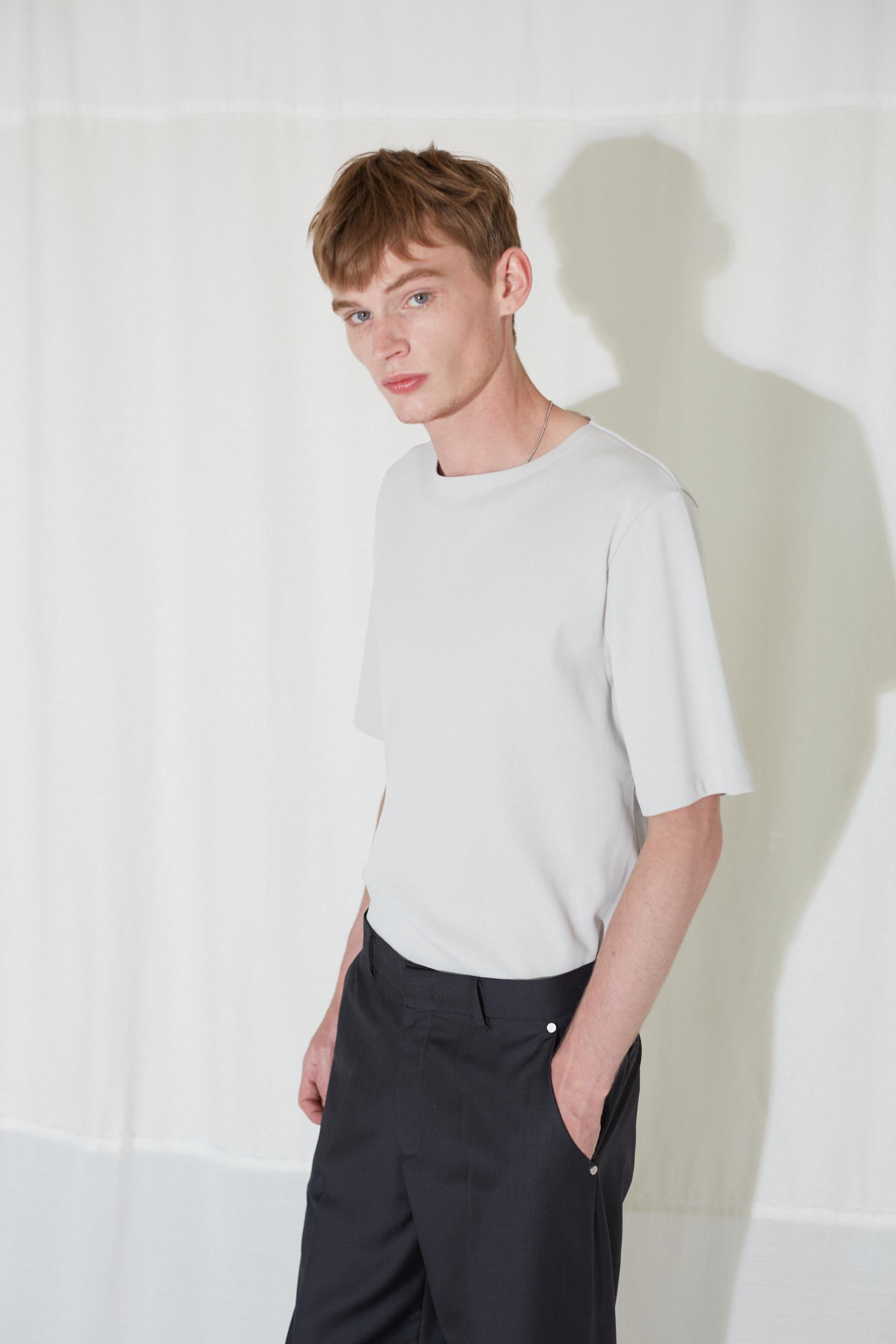 - 스탠다드 핏 - 보트넥 - 5부 소매 립 조직으로 제작된 보트넥 티셔츠입니다. 탄성이 있는 시원한 터치감의 소재를 사용하여 쾌적한 착용감이 특징입니다. 과하지 않은 보트넥과 5부 소매, 스탠다드한 핏으로 착용되어 클래식한 실루엣을 연출하였습니다. 단독 착용으로도 감각적인 룩을 완성할 수 있는 아이템입니다. |