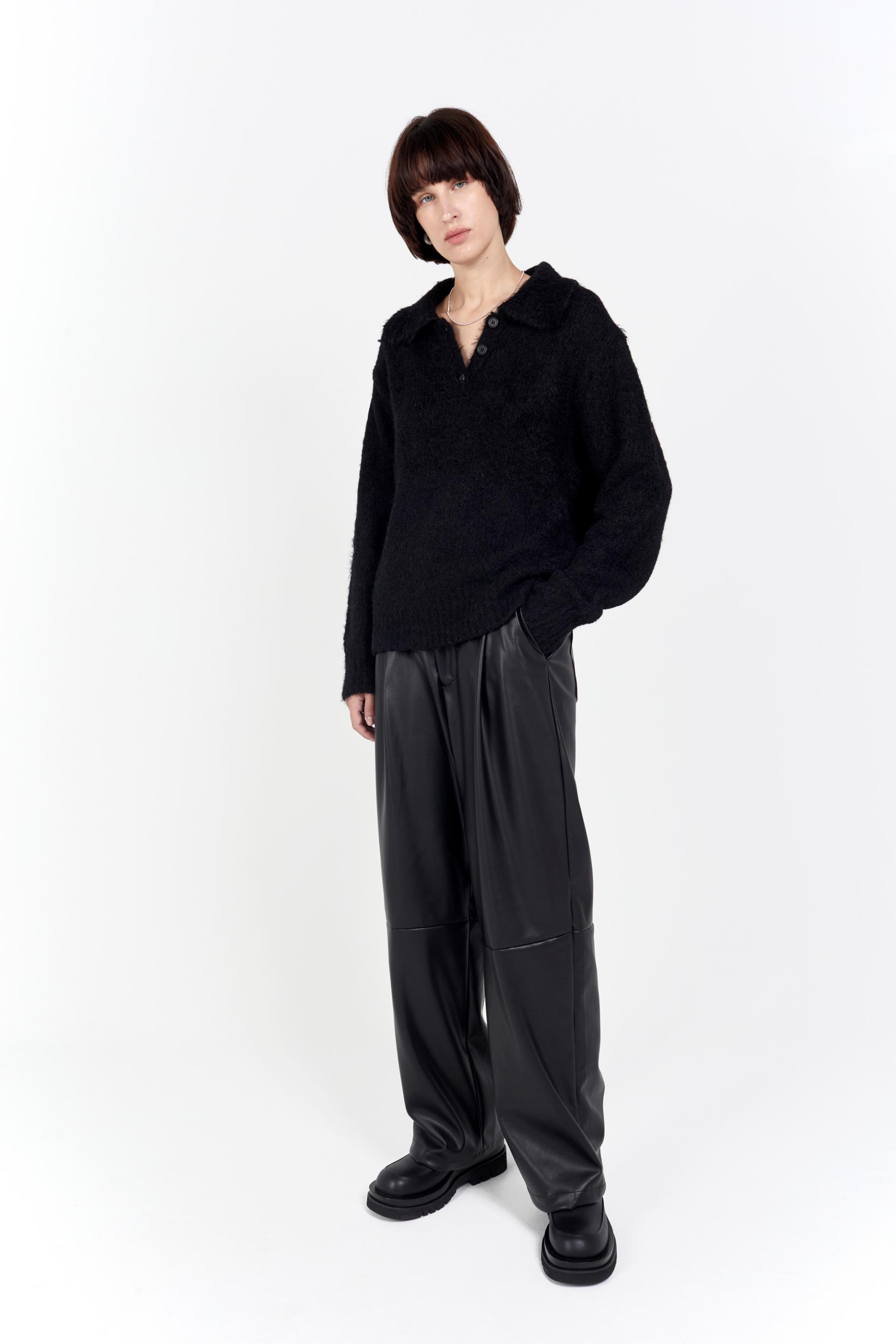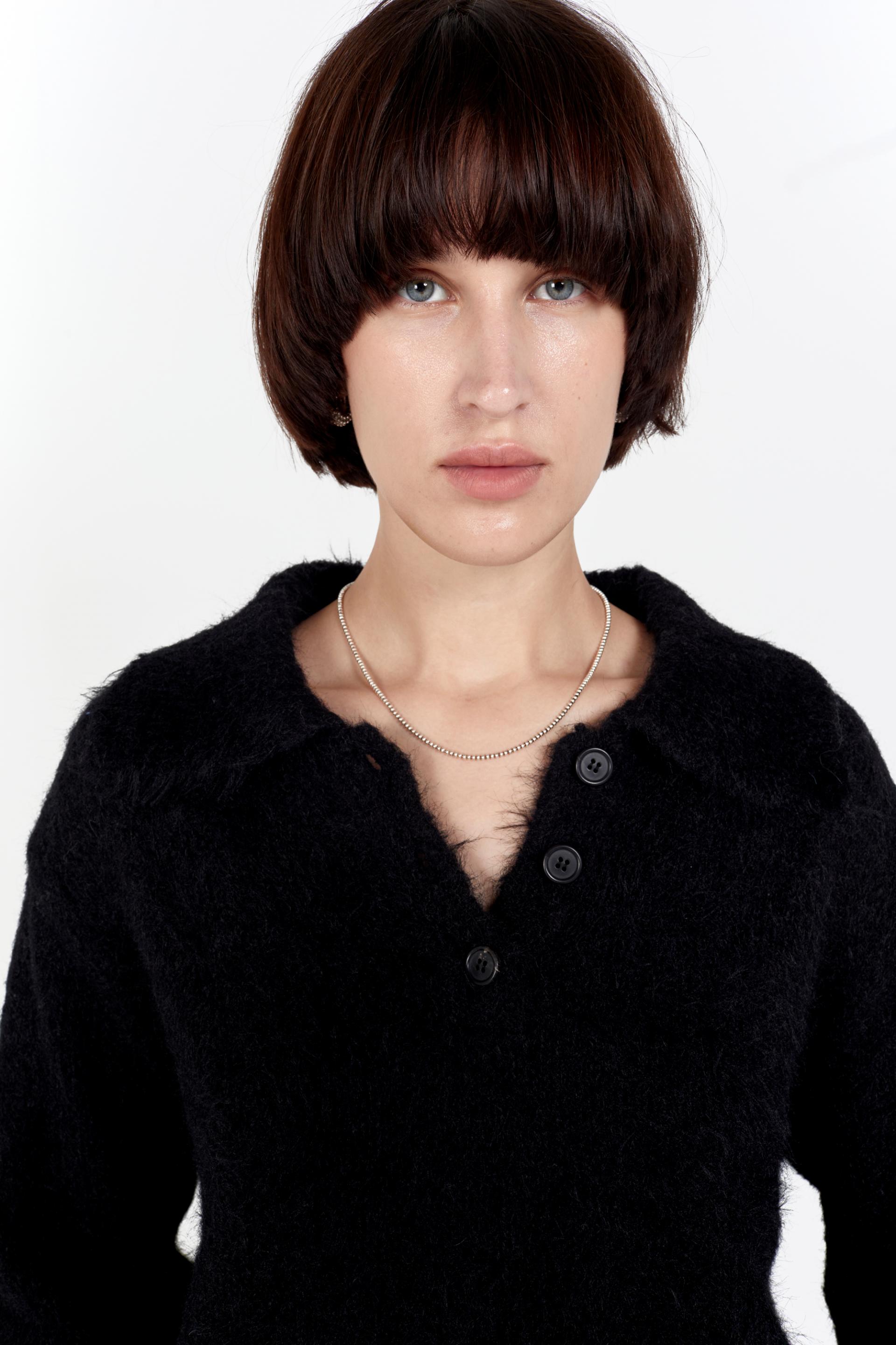 - 루즈핏 폴로 니트 스웨터 - 스프레드 칼라 - 버튼 클로징 - 너트 단추 사용 - 칼라,소맷단,밑단 립 조직 헤어리한 텍스쳐가 멋스러운 피케 폴로 스웨터입니다. 전체적으로 멋스럽게 떨어지는 루즈핏으로 버튼 다운하여 팬시한 아웃핏으로 착용하기 좋은 아이템입니다. 원사 본연의 매력을 느낄 수 있도록 피케 셔츠의 미니멀한 디자인으로 완성되었습니다. |