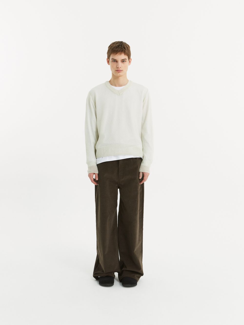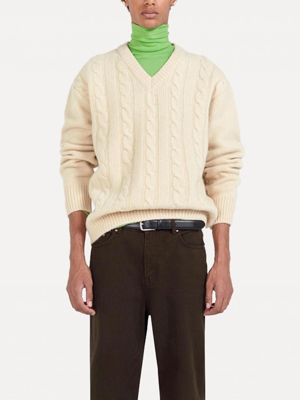 - 브이넥 케이블 니트 - 크롭 기장 - 프론트/백 케이블 조직 디테일 태즈메니아 울로 편직된 브이넥 케이블 니트입니다. 빈티지 크리켓 유니폼에서 착안하여, 청키한 케이블 조직을 강조한 디자인입니다. 고품질의 양모를 사용한 클래식한 니트로 오래두고 입을 수 있는 에센셜한 아이템입니다. 세미 크롭의 여유로운 핏이며, 소맷단, 밑단은 촘촘한 립 조직으로 편직되어 깔끔한 실루엣으로 착용됩니다. |