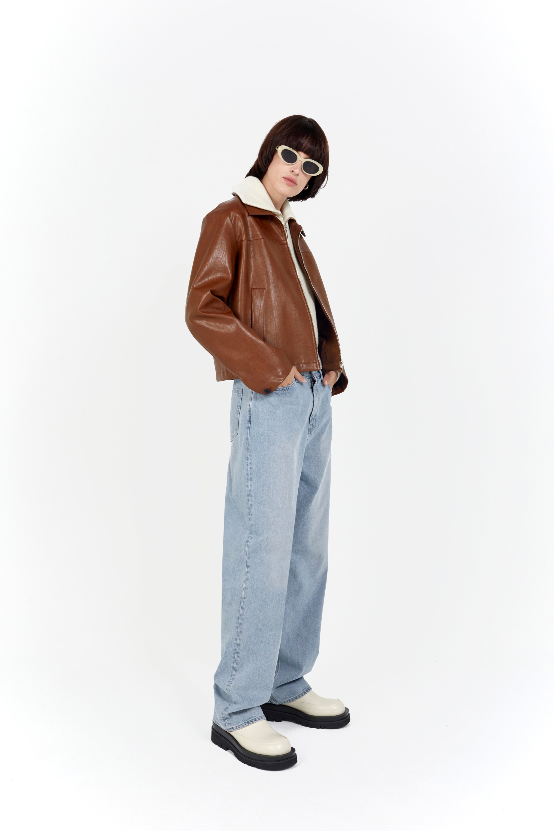 - 루즈핏 크롭 자켓 - 지퍼 클로징 - 스프레드 칼라 - 웨이스트 웰트 포켓 친환경 비건 레더로 제작된 크롭 자켓입니다. 러프한 소재로 미니멀하게 커팅된 햄라인과 깔끔한 외관으로 제작되었습니다. 허리선 사이드 포켓이 있으며, 프론트 요크 디테일로 포인트를 주었습니다. 경쾌한 크롭 기장으로 팬츠 혹은 원피스와도 착용하기 좋아 FW 시즌 활용도 높은 아이템입니다. |
