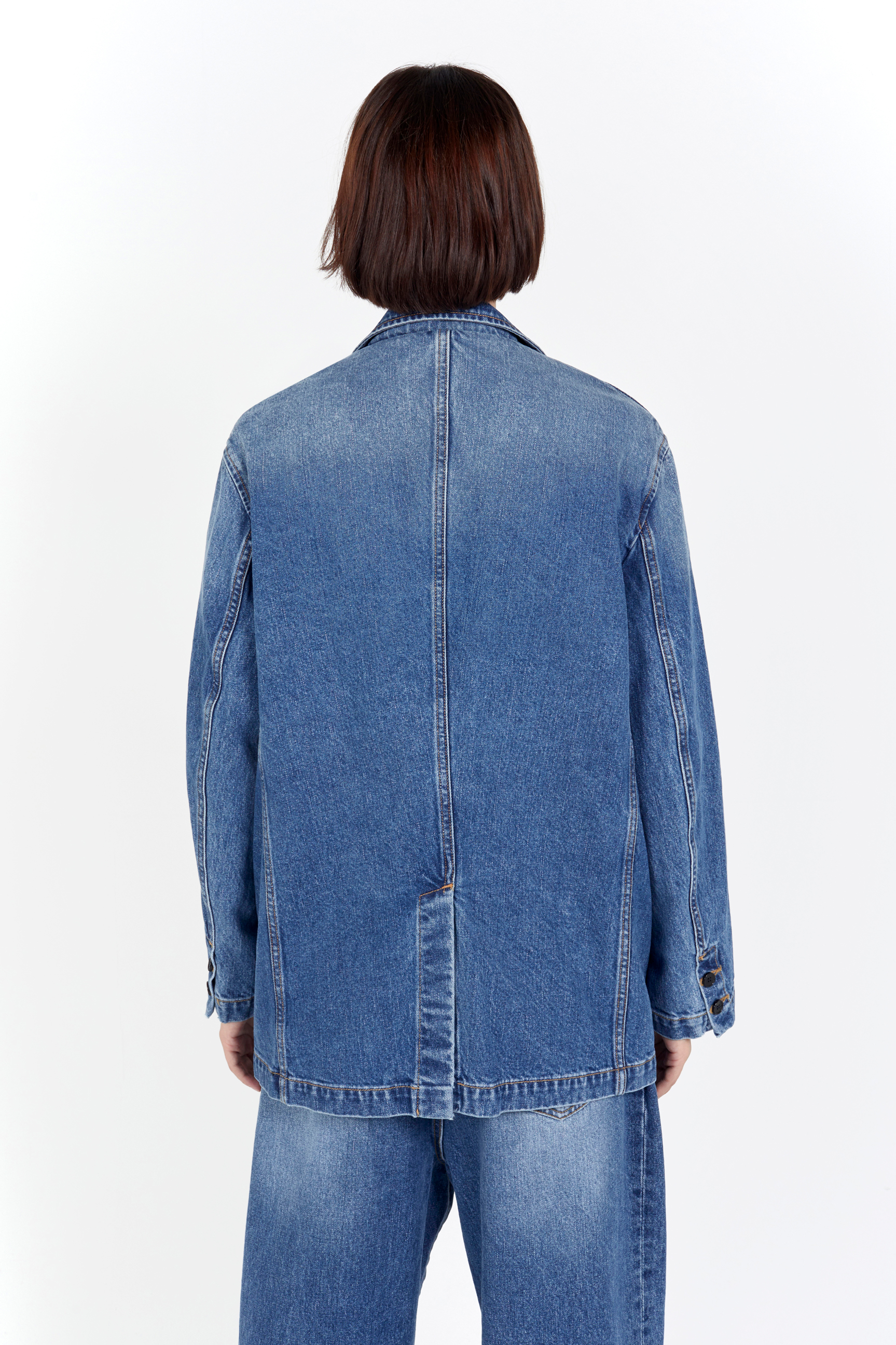 - 싱글 브래스티드 자켓 - 루즈핏 - 버튼 클로징 - 프론트 웰트 포켓 - 웨이스트 플랩 포켓 - 안감이 없는 제품 7수 데님으로 제작된 루즈핏 싱글 브래스티드 자켓입니다. 힘이 있는 데님으로 홑겹으로 제작되어 간절기 아우터로 활용하기 좋은 아이템입니다. 마일드한 블루톤의 워싱이 특징으로 여유있는 핏으로 착용됩니다. |