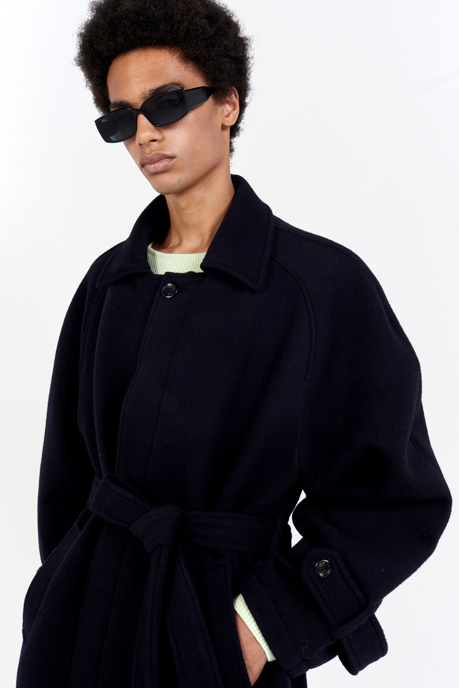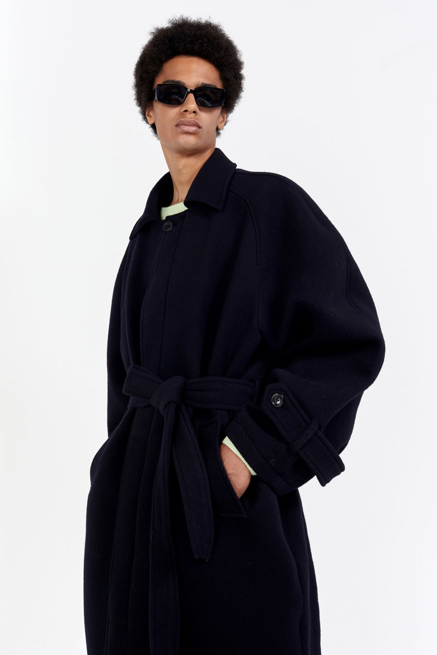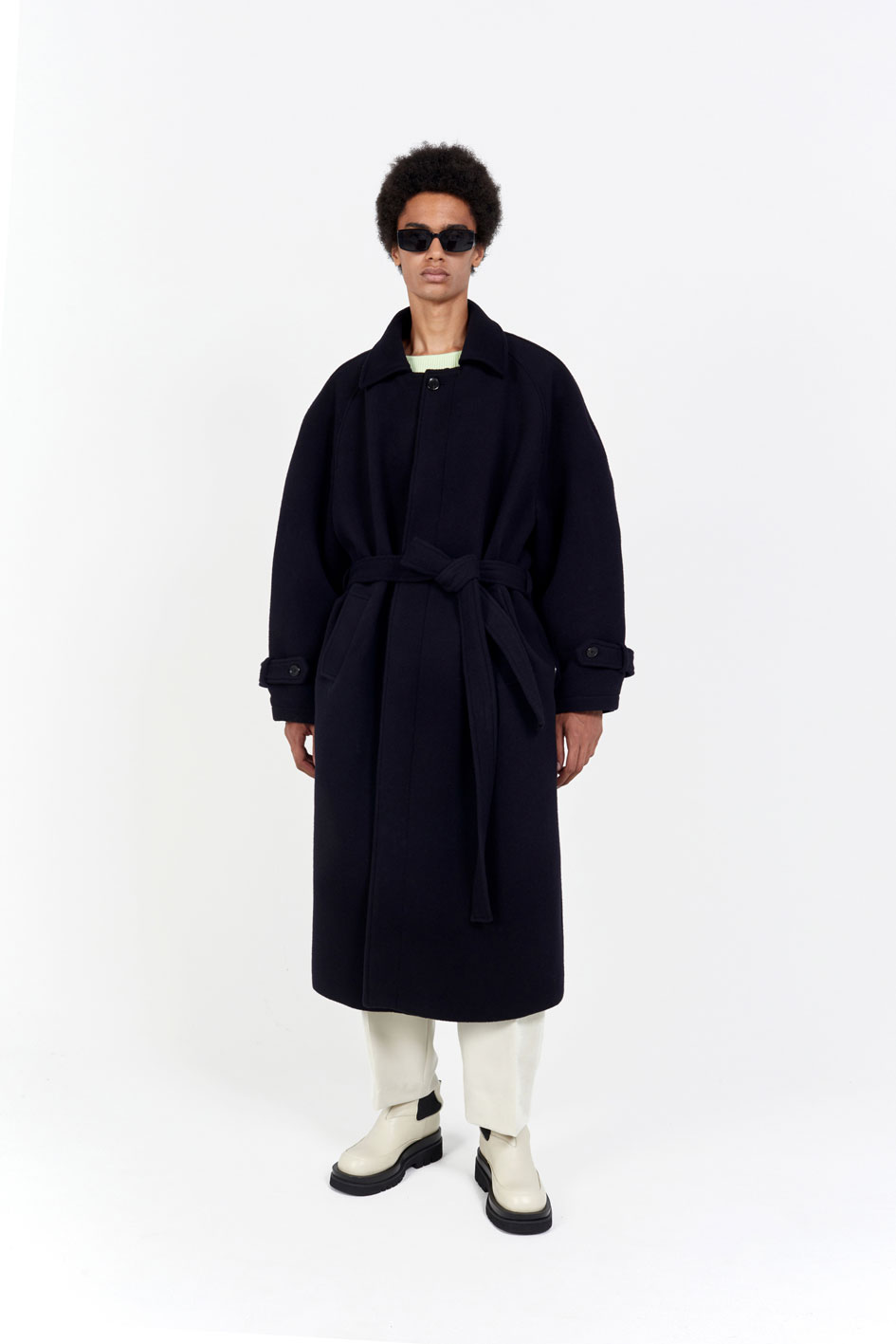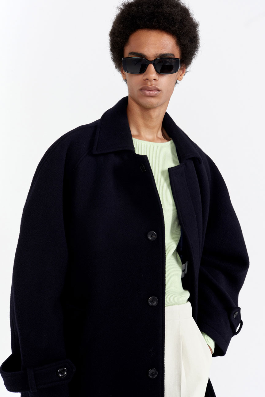 오버핏 발마칸 코트 스프레드 칼라 히든 버튼 클로징 래글런 슬리브 천연 소뿔 단추 사용 탈부착이 가능한 벨트 뒷 트임 디테일 부드러운 촉감의 컴팩트한 울 소재를 사용한 오버사이즈 핏 발마칸 코트입니다. 전체적으로 여유로운 실루엣이며, 래글런 슬리브로 제작되어 두께감 있는 이너와 착용하기도 좋은 사이즈로 제작되었습니다. 부드럽고 컴팩트한 울 소재로 보온성이 우수하여 겨울철 데일리로 착용하기 좋은 아우터입니다. 첫번째 단추를 제외하고 히든 버튼 클로징되며, 속주머니와 코트 뒷면 트임 디테일로 활동성과 실용성을 높였습니다. |