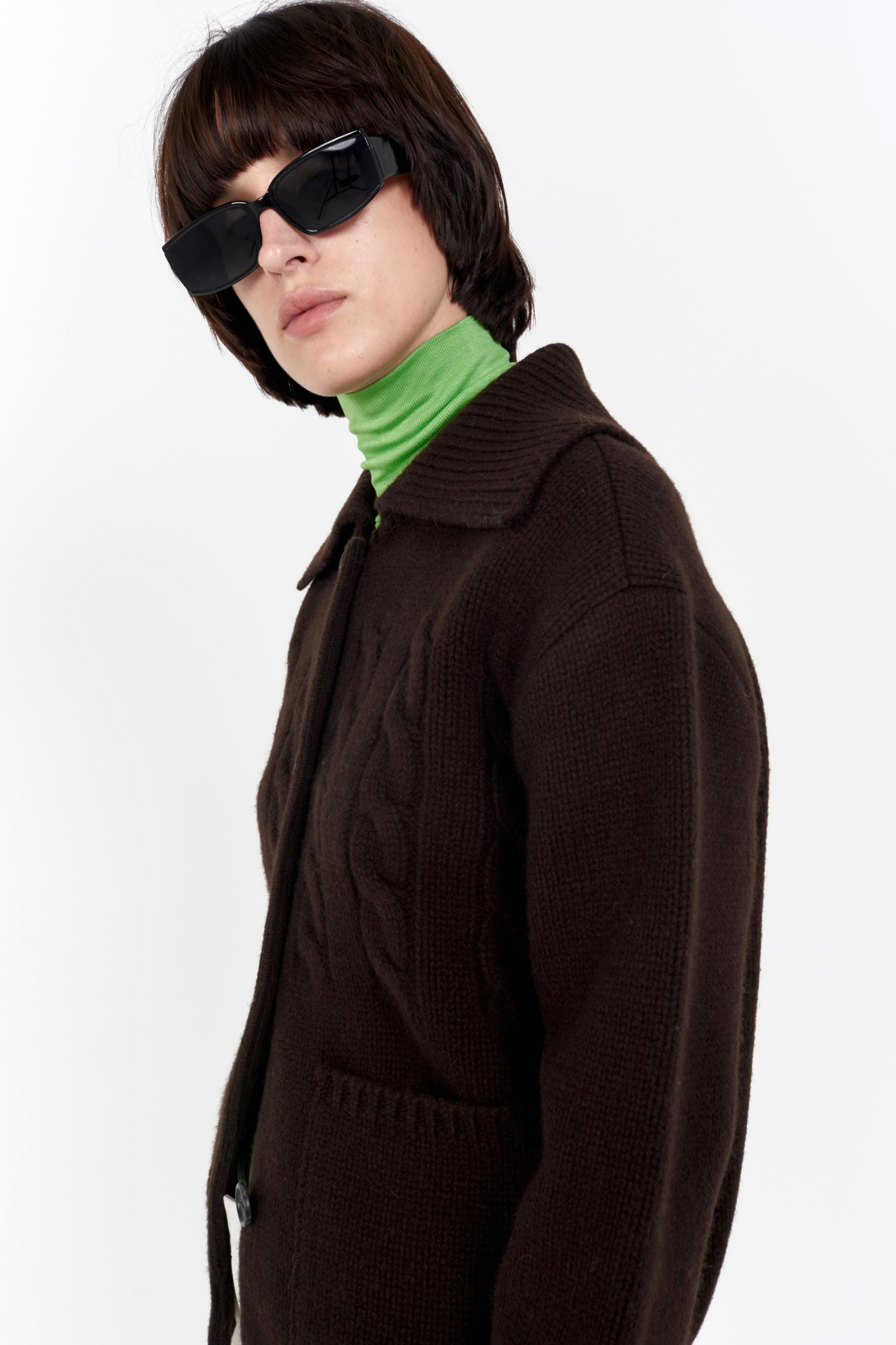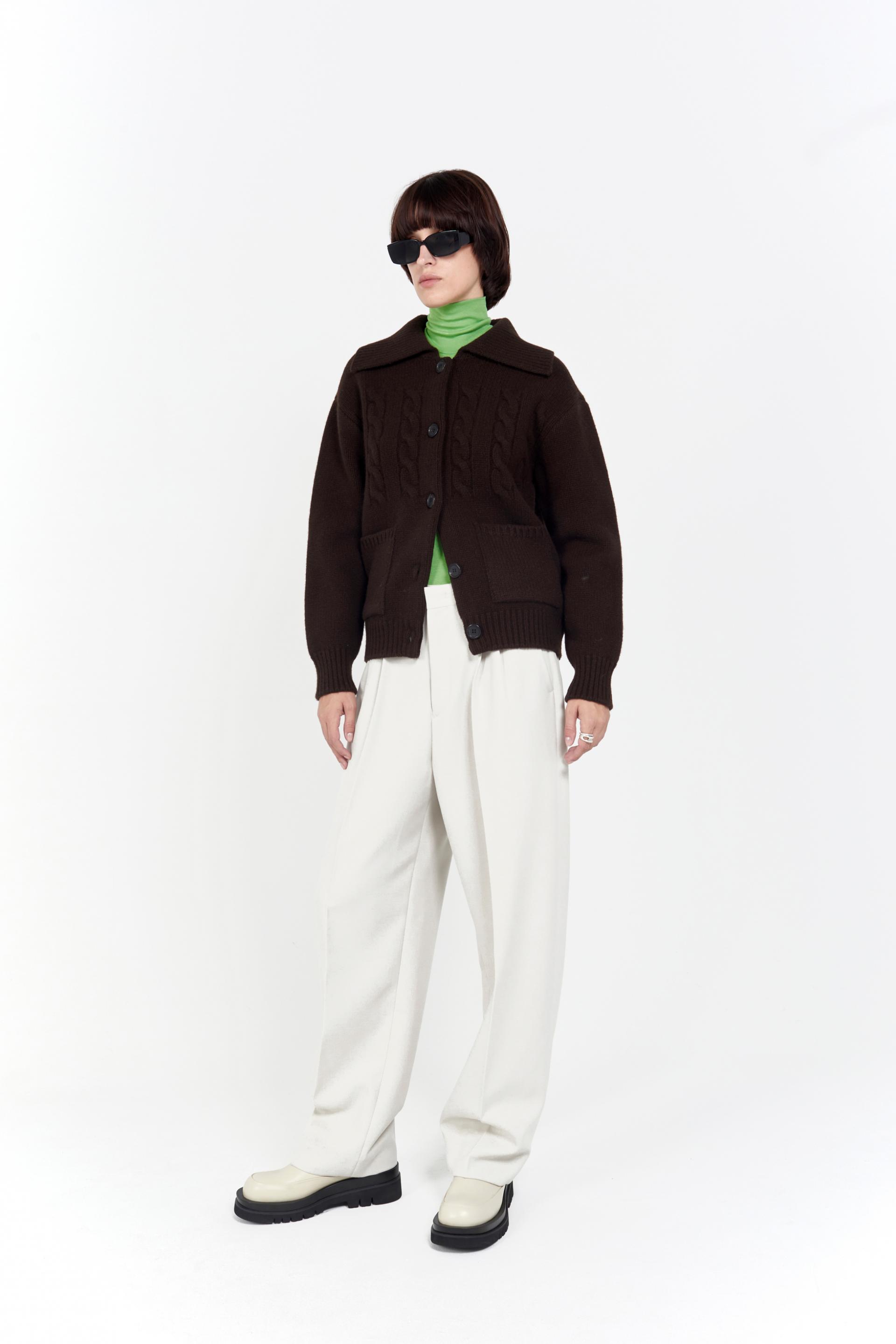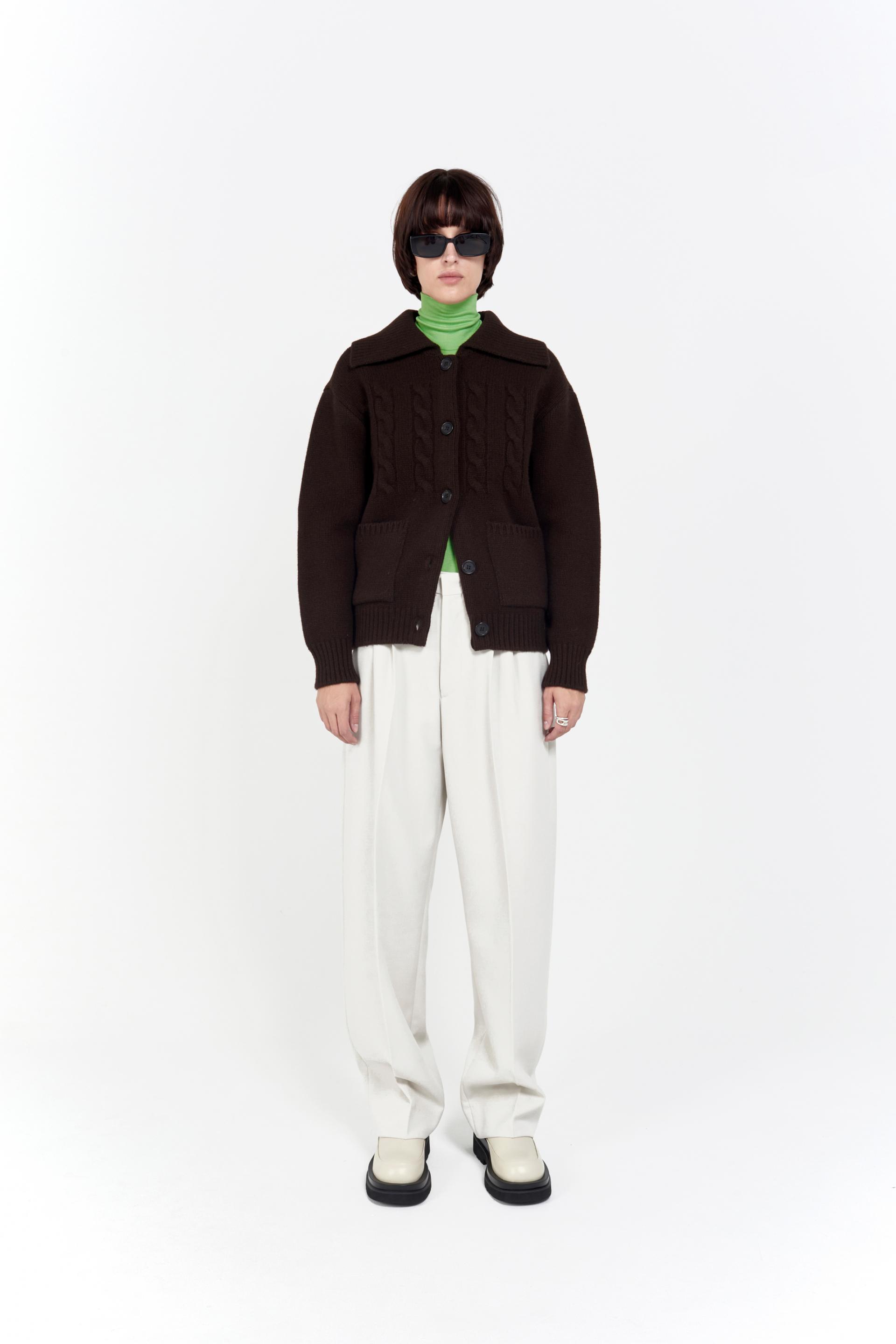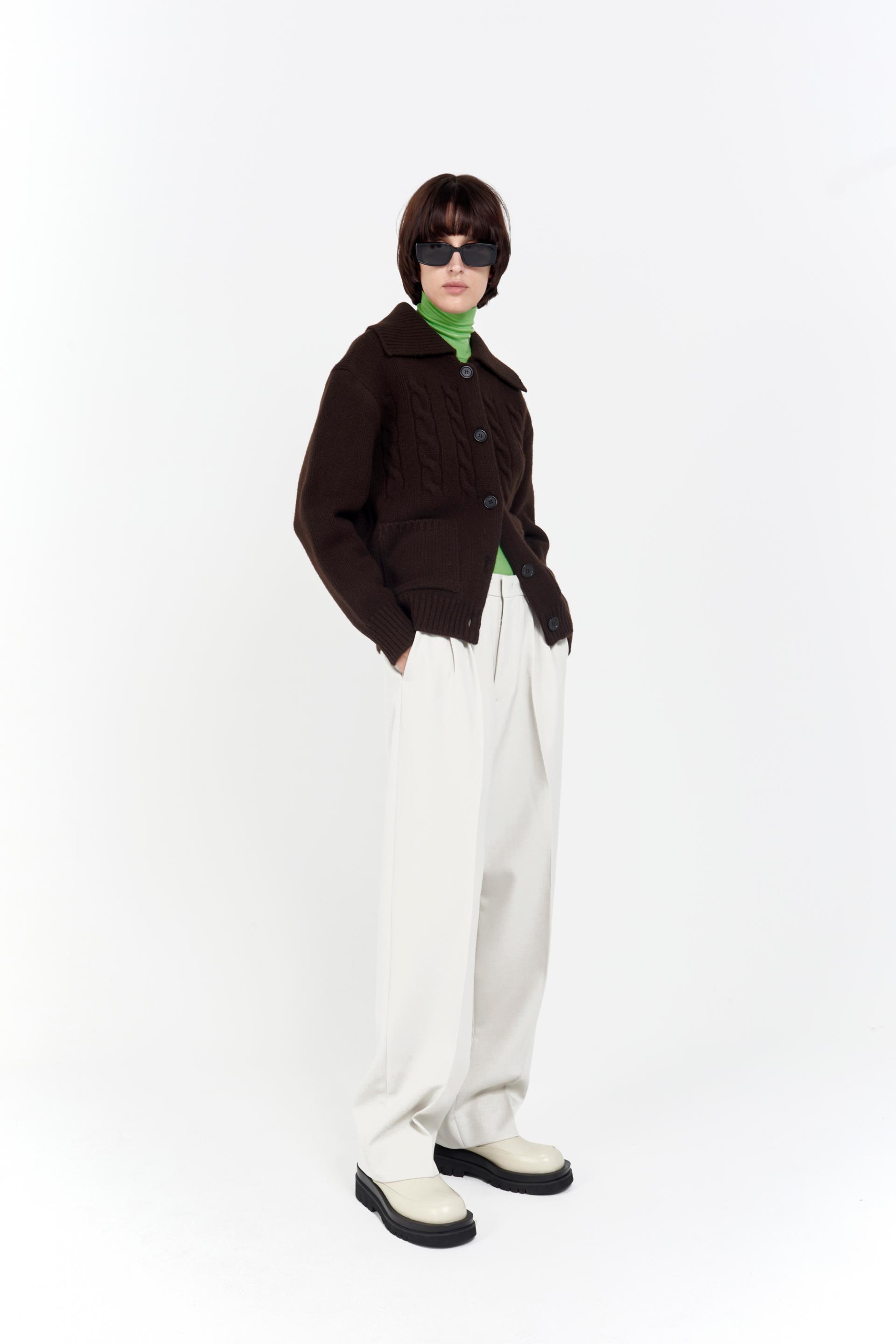 루즈핏 케이블 니트 가디건 와이드 립 칼라 프론트 아웃 포켓 고급 소뿔 단추 사용 파인 메리노 울 원사로 편직된 케이블 니트 가디건입니다. 전체적으로 굵은 조직감이 클래식한 무드를 자아내며, 전면 케이블 조직 디테일이 포인트입니다. 여유로운 핏으로 착용되어 편안한 착용감을 느끼실 수 있으며, 사용가능한 아웃 포켓으로 실용성을 더했습니다. |