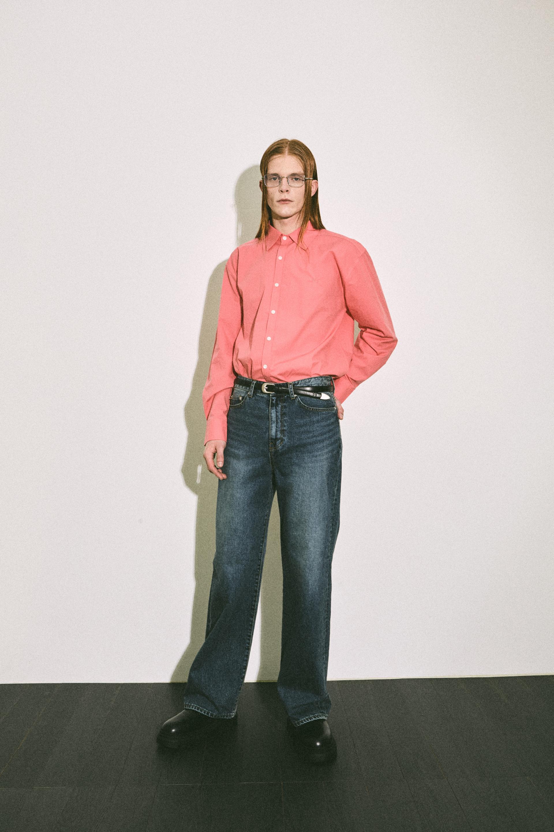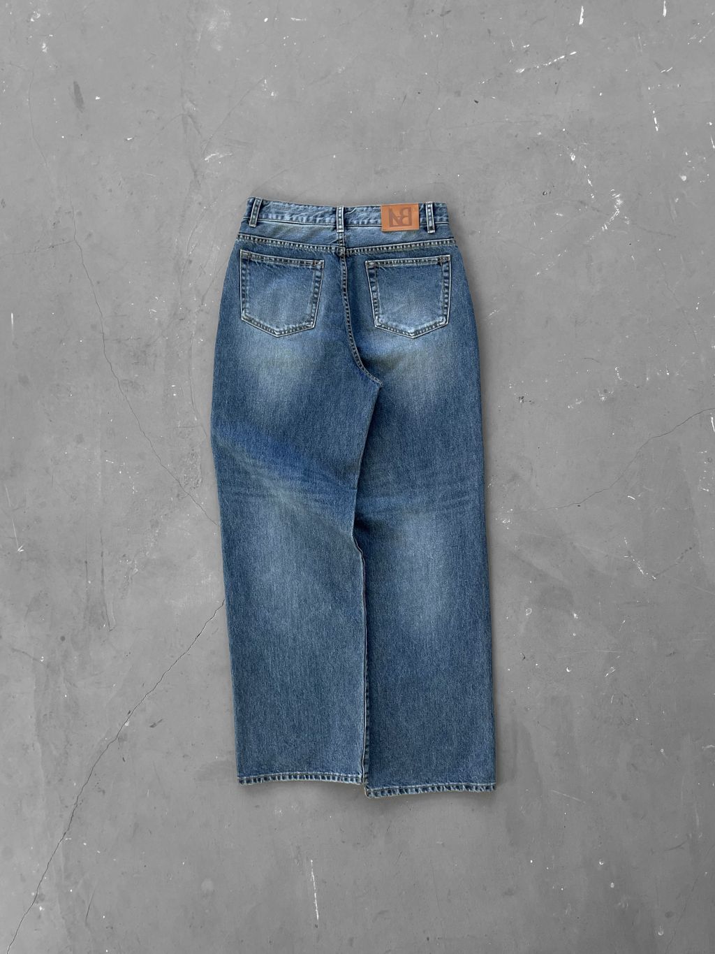 미드 블루 톤의 페이딩 워싱이 멋스러운 와이드 핏 진입니다.