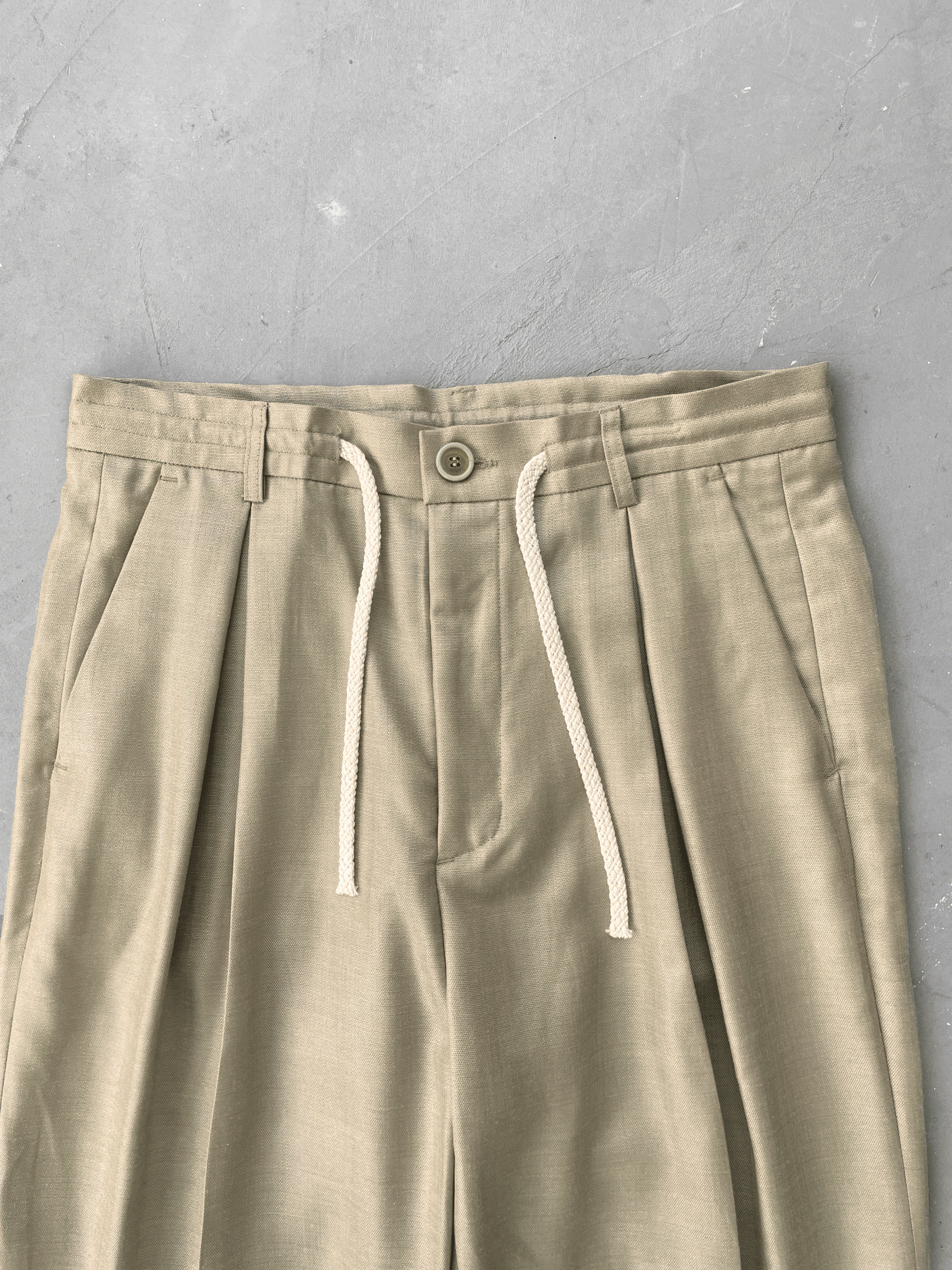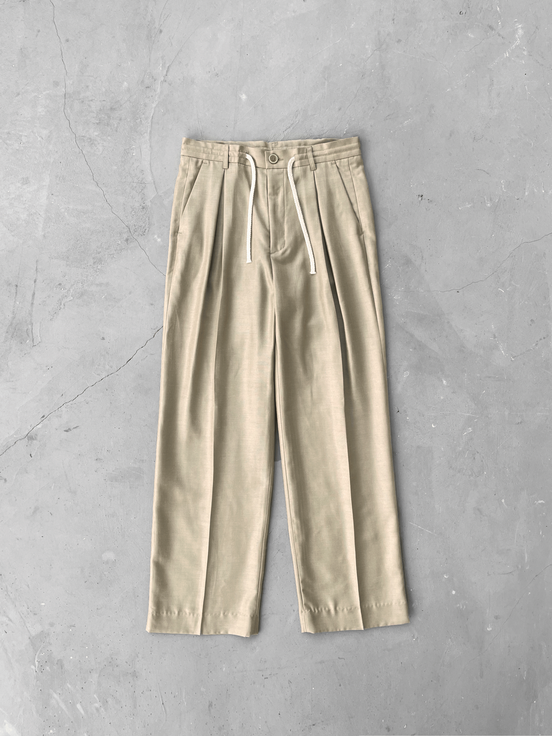 와이드 핏 슬랙스 허리 드로우 스트링 인버티드 플리츠 YKK 社의 지퍼 사용 고급스러운 광택감과 매트한 색감이 멋스러운 린넨 와이드 팬츠입니다. 전면 맞대어 있는 턱이 있어 자연스럽게 와이드한 실루엣을 연출해줍니다. 허리 사이즈 조절이 가능한 캐주얼한 디테일이 차분한 소재감과 어우러져 이지한 룩으로 착용됩니다. SS시즌 일상과 여행에 함께 하기 좋은 에센셜한 아이템입니다. |