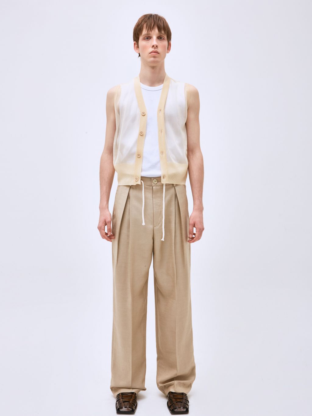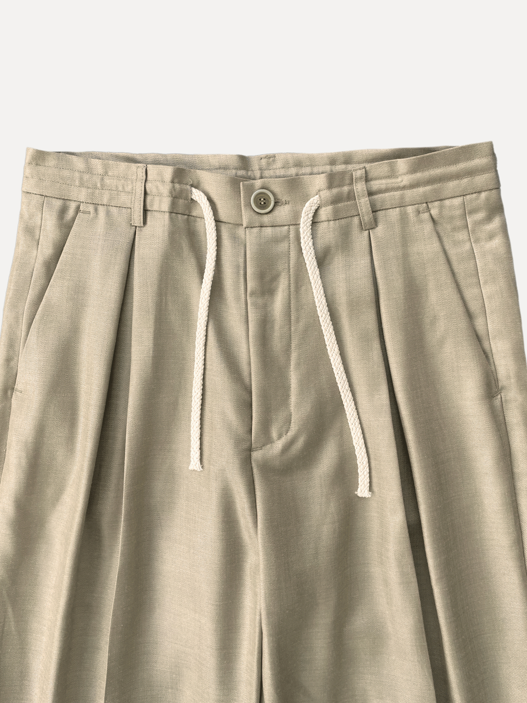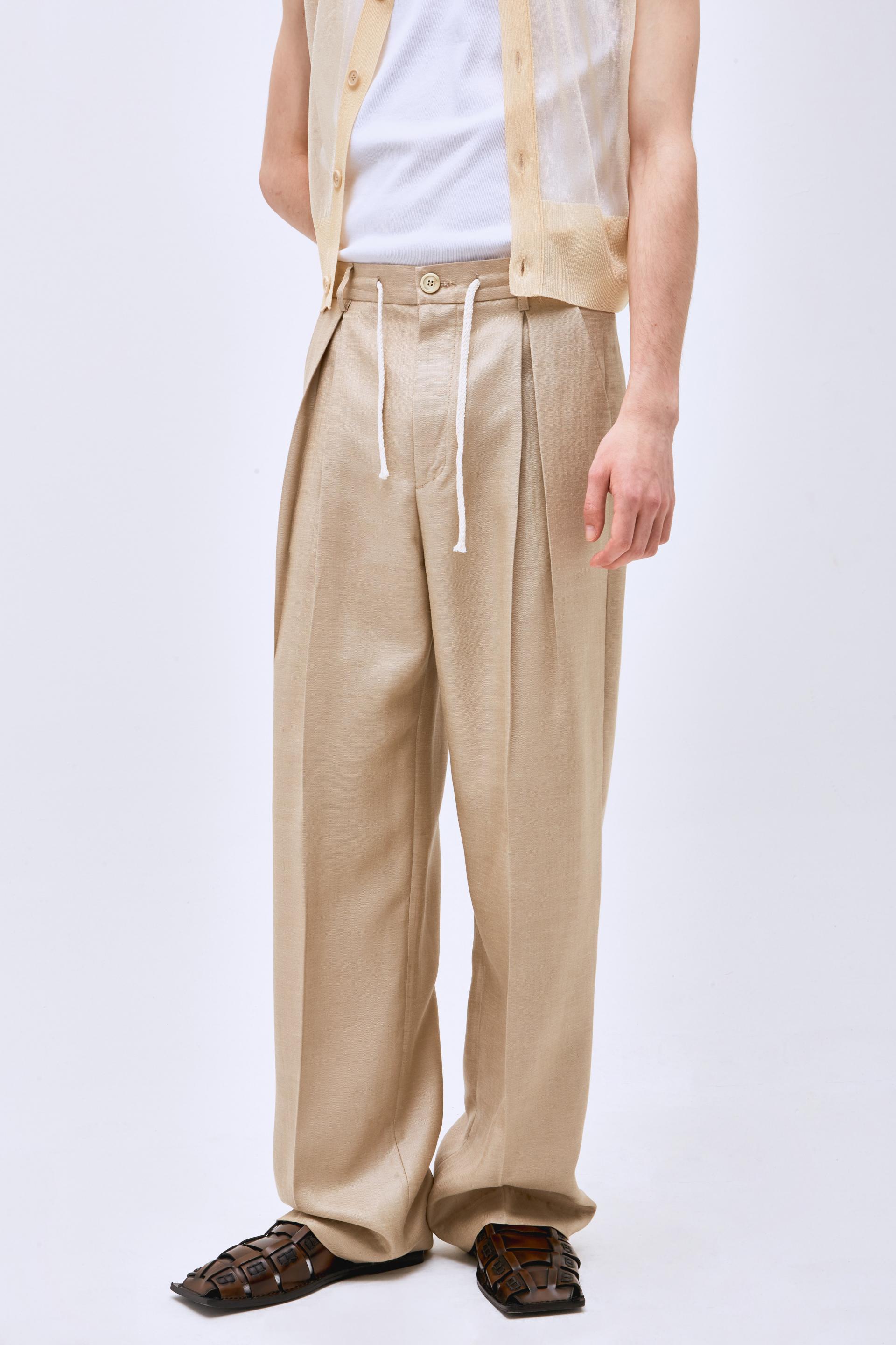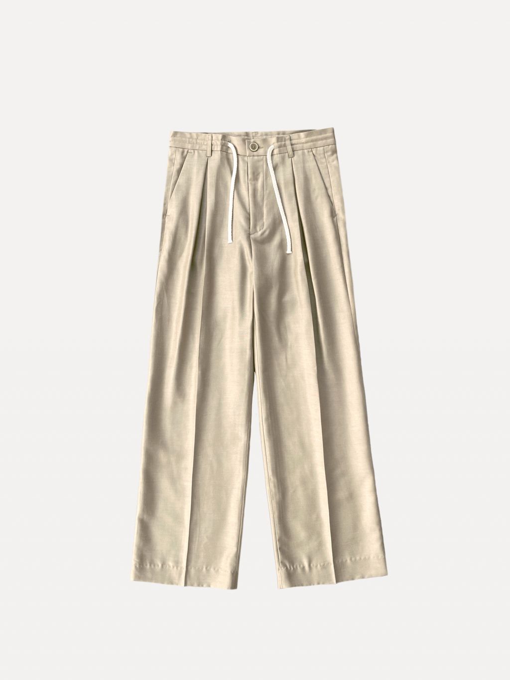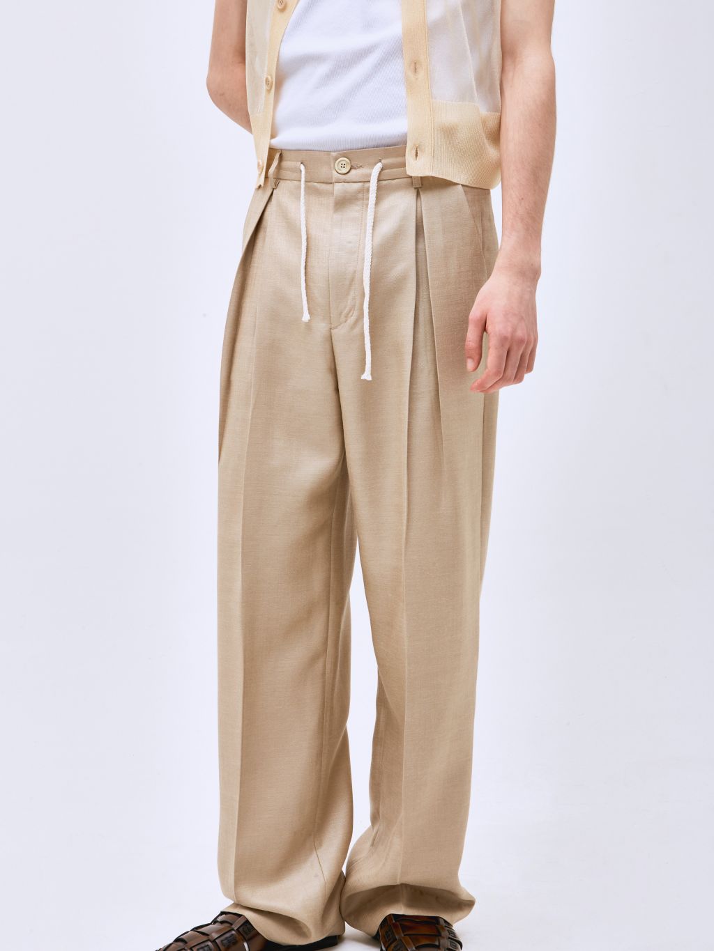 와이드 핏 슬랙스 허리 드로우 스트링 인버티드 플리츠 YKK 社의 지퍼 사용 고급스러운 광택감과 매트한 색감이 멋스러운 린넨 와이드 팬츠입니다. 전면 맞대어 있는 턱이 있어 자연스럽게 와이드한 실루엣을 연출해줍니다. 허리 사이즈 조절이 가능한 캐주얼한 디테일이 차분한 소재감과 어우러져 이지한 룩으로 착용됩니다. SS시즌 일상과 여행에 함께 하기 좋은 에센셜한 아이템입니다. |