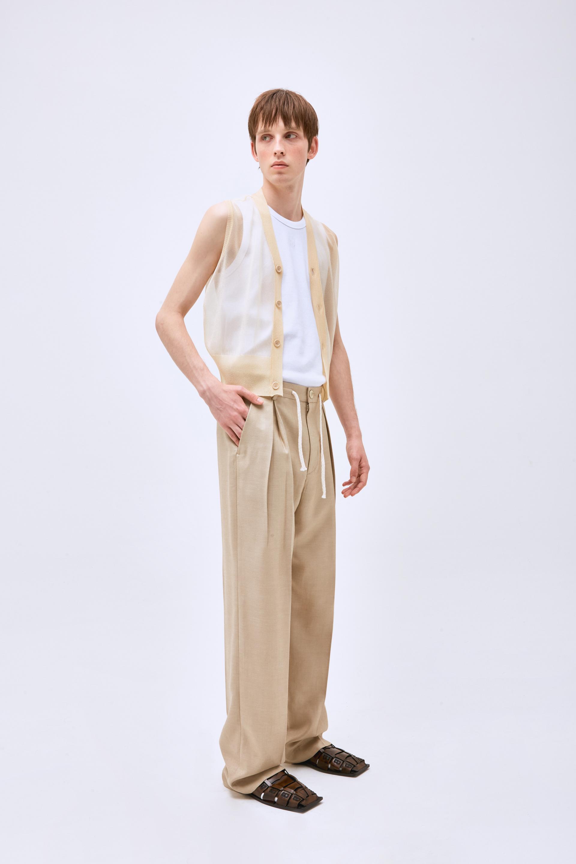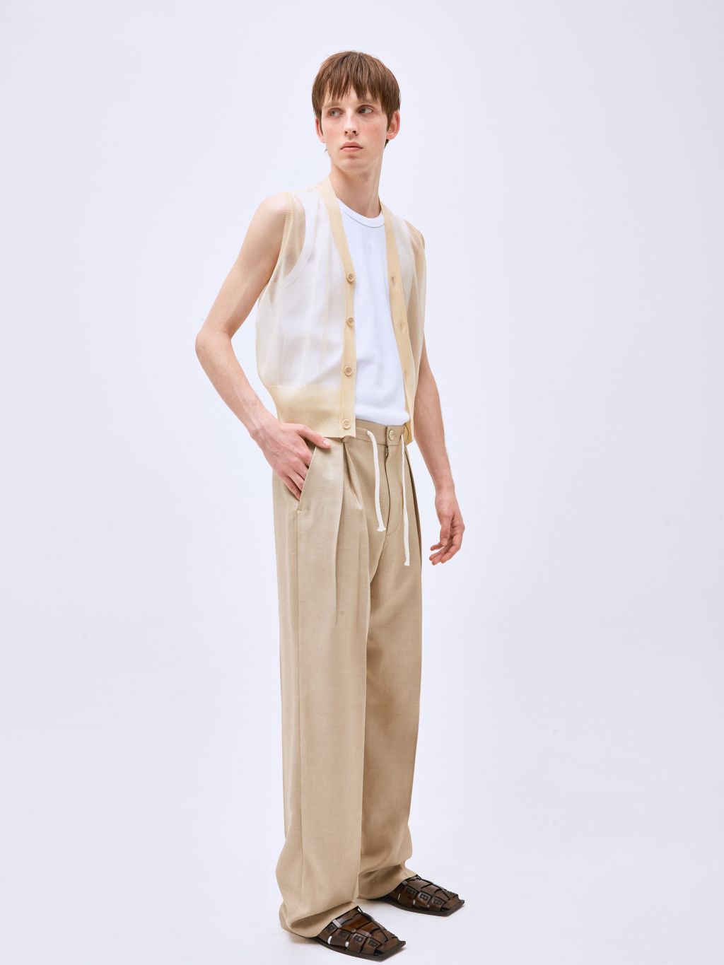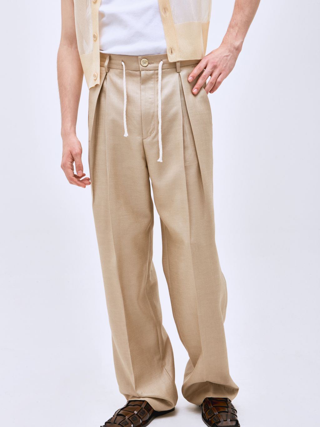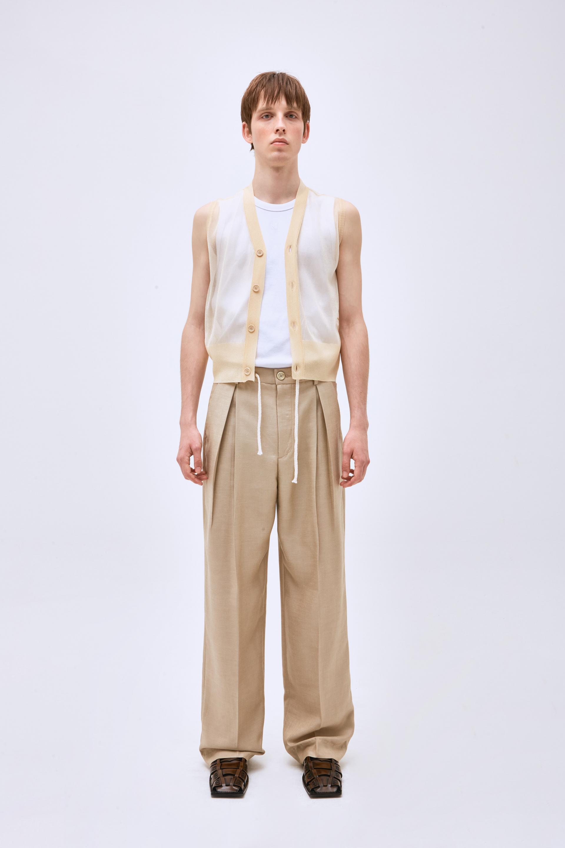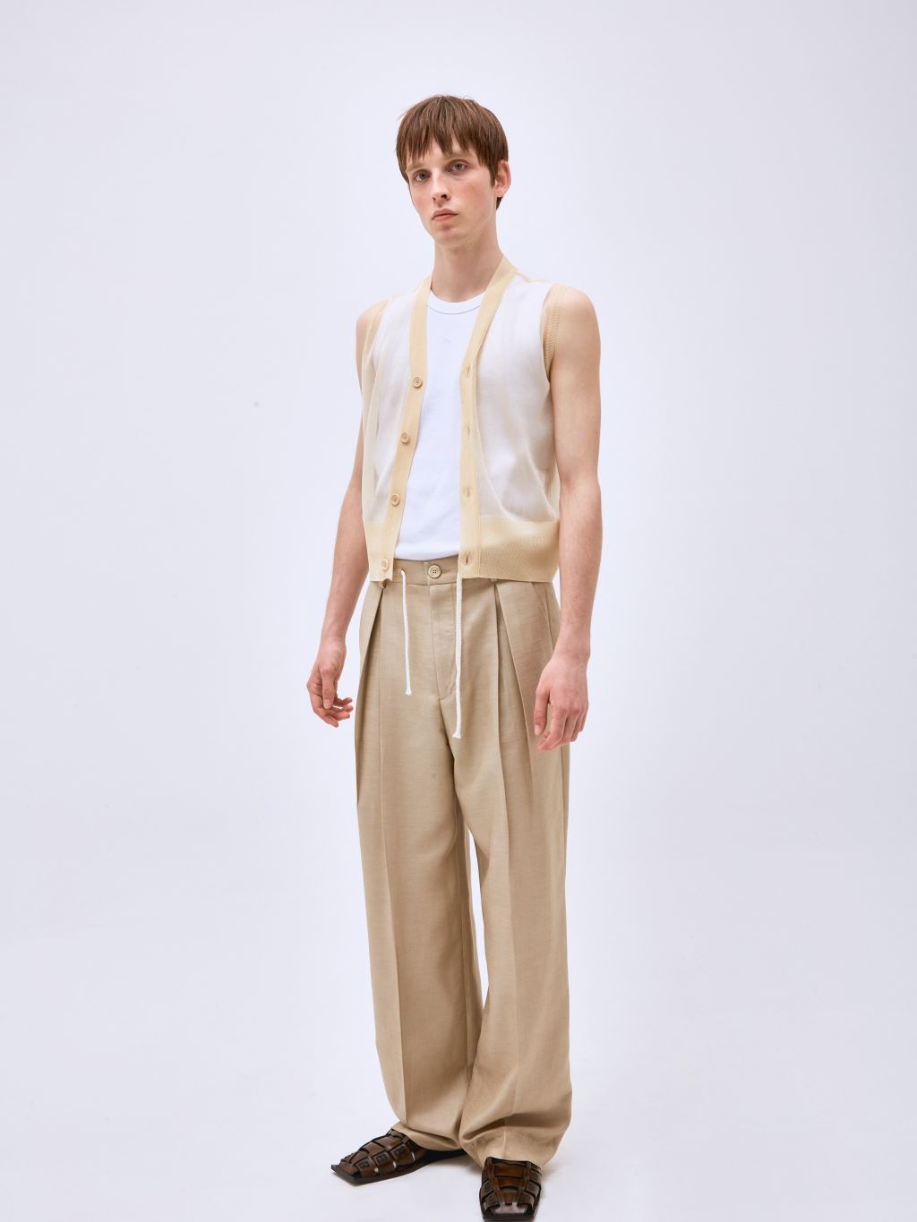 와이드 핏 슬랙스 허리 드로우 스트링 인버티드 플리츠 YKK 社의 지퍼 사용 고급스러운 광택감과 매트한 색감이 멋스러운 린넨 와이드 팬츠입니다. 전면 맞대어 있는 턱이 있어 자연스럽게 와이드한 실루엣을 연출해줍니다. 허리 사이즈 조절이 가능한 캐주얼한 디테일이 차분한 소재감과 어우러져 이지한 룩으로 착용됩니다. SS시즌 일상과 여행에 함께 하기 좋은 에센셜한 아이템입니다. |