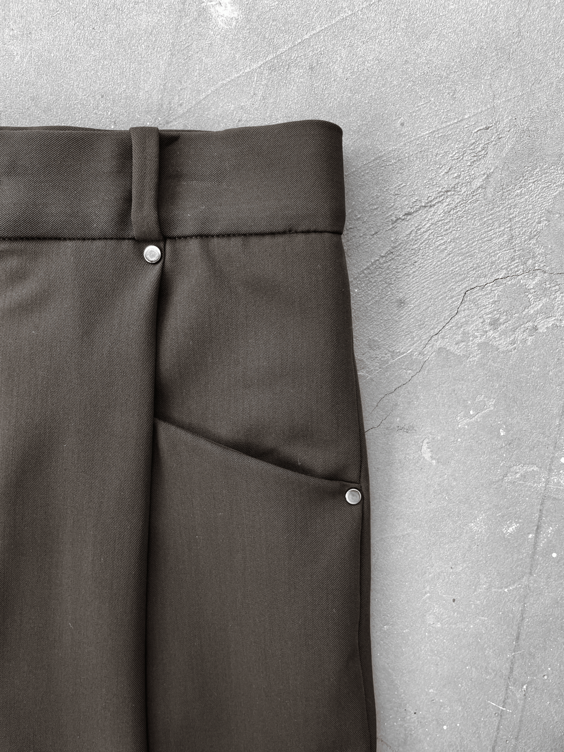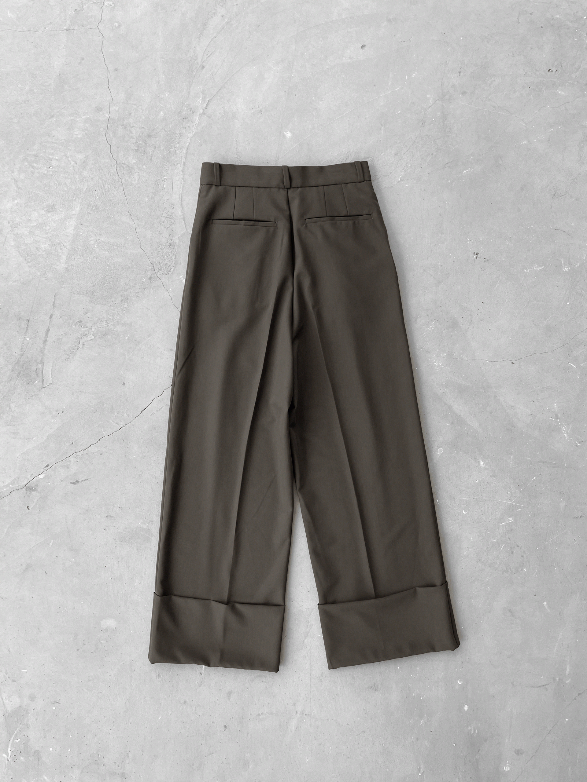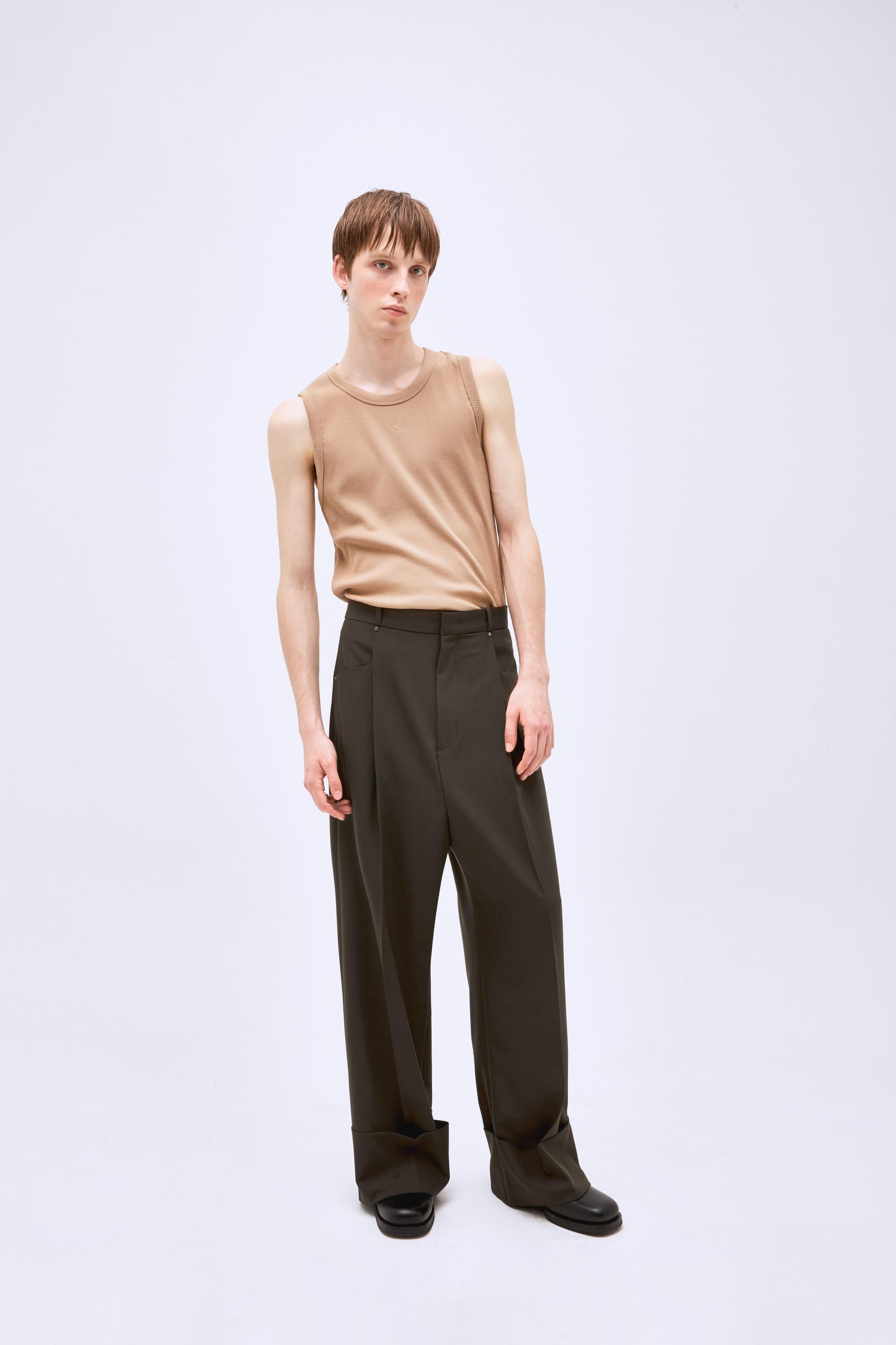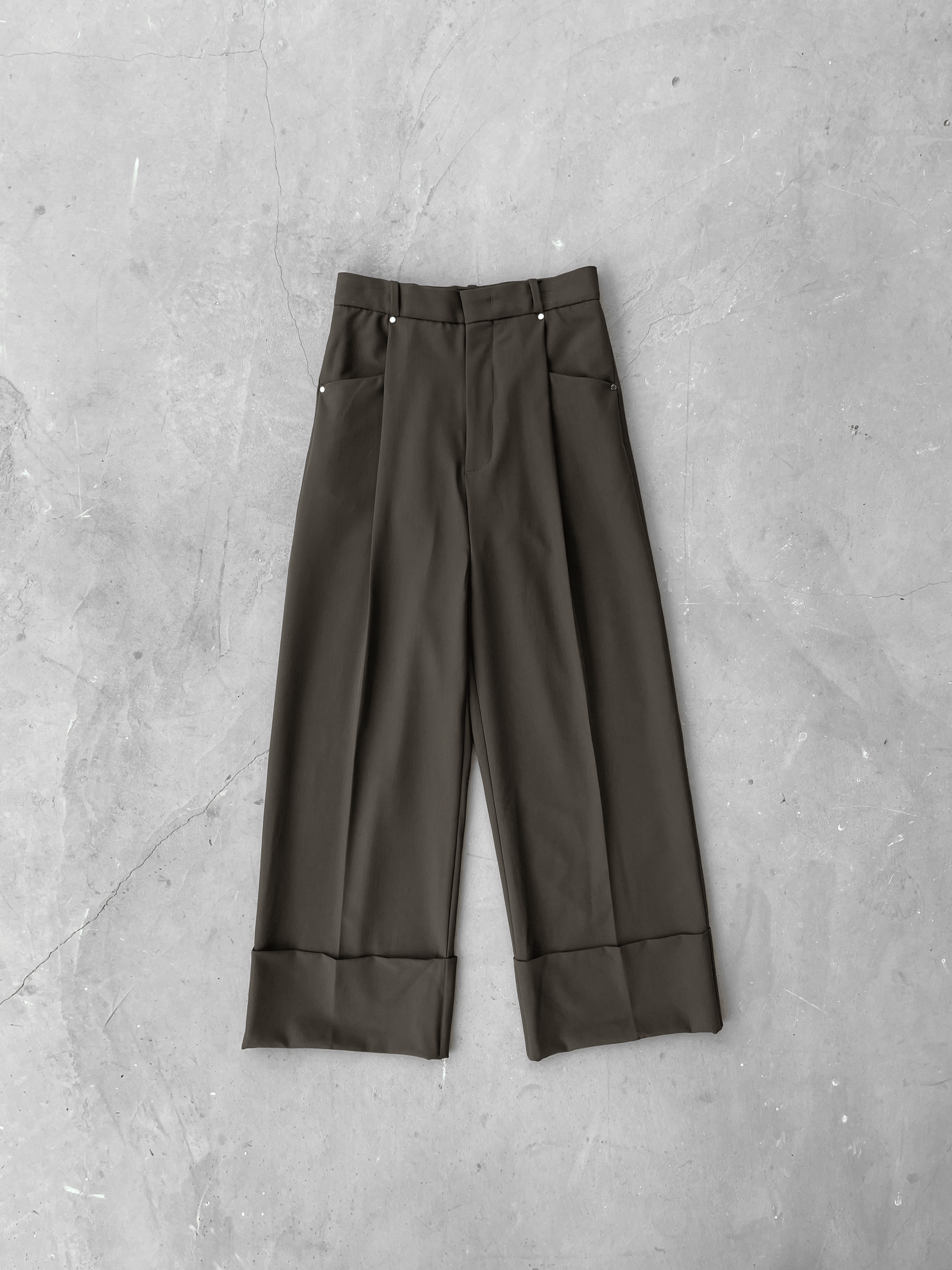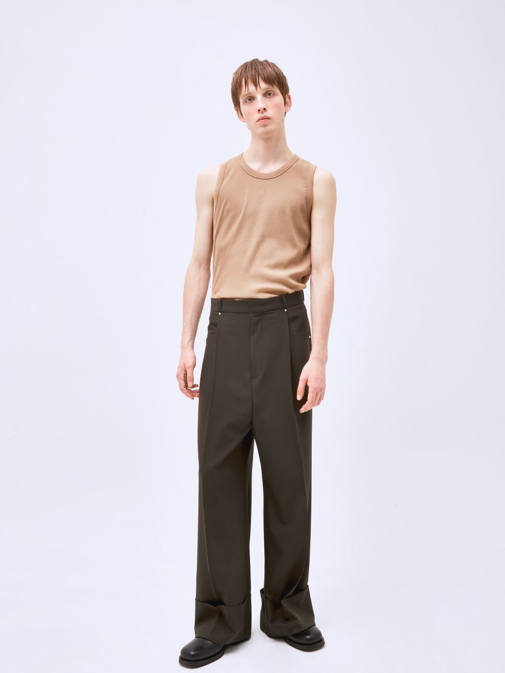 와이드 핏 슬랙스 one tuck 디테일 YKK 社의 지퍼 사용 프론트 리벳 디테일이 은은한 멋을 보여주는 와이드 팬츠입니다. 깊게 자리잡은 와이드한 턱 안에 사이드 포켓이 있으며, 전체적으로 여유있는 핏으로 착용됩니다. 밑단 와이드한 커프스가 팬츠의 균형을 잡아주어 수직적으로 떨어지는 실루엣을 잘 구현해내어 롱앤린 실루엣을 연출해줍니다. 변화가 필요한 SS시즌, 슬림한 이너와 매치하여 엣지있는 룩을 연출해줄 팬츠로 추천드립니다. |