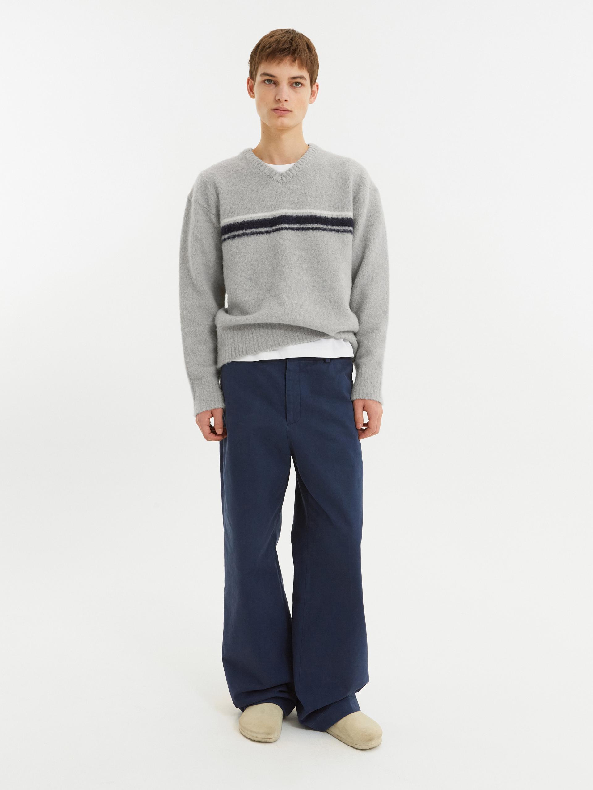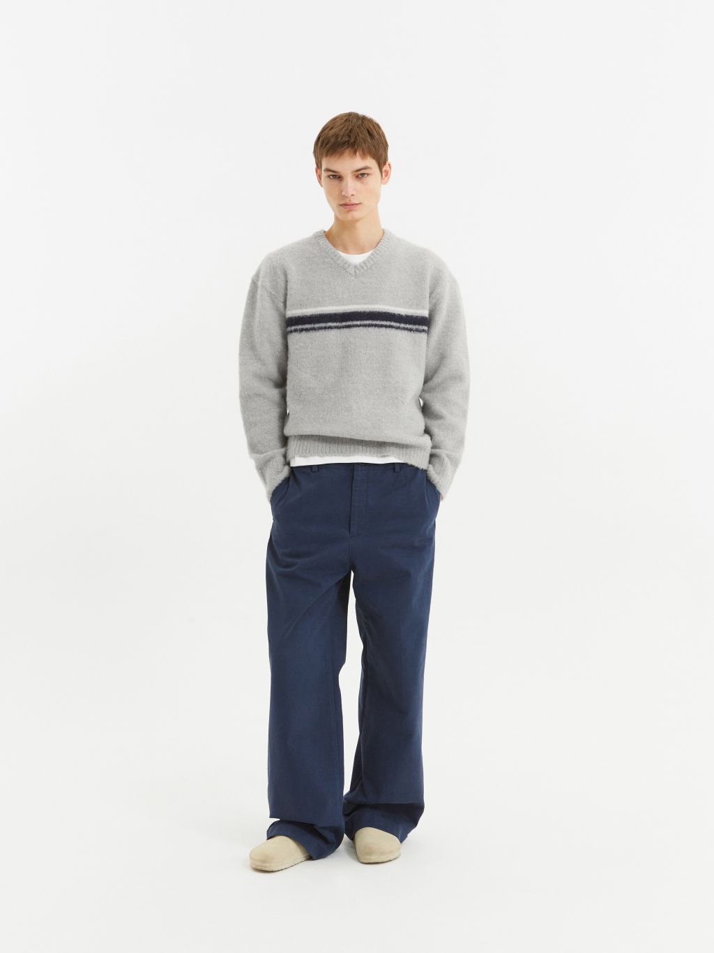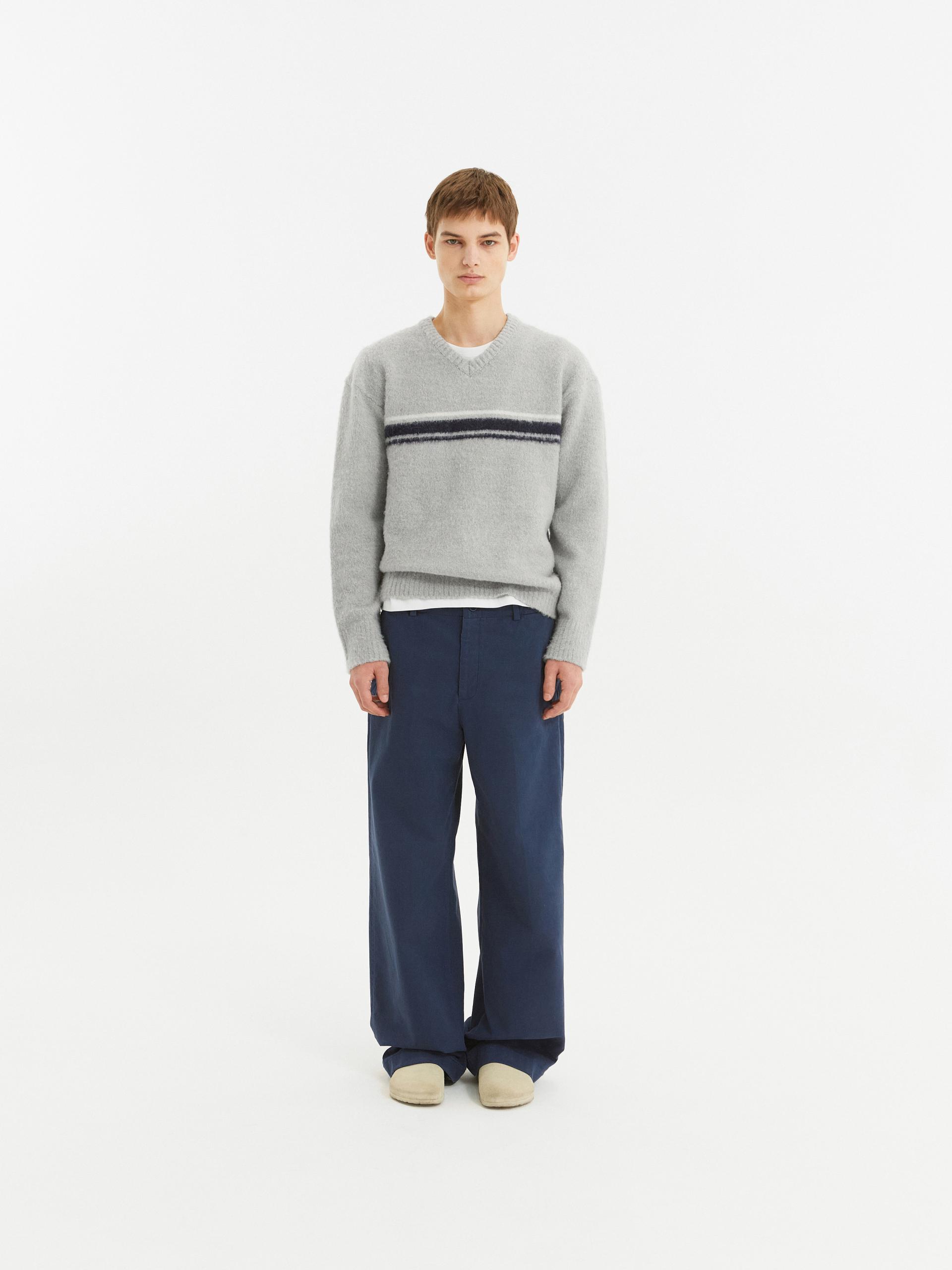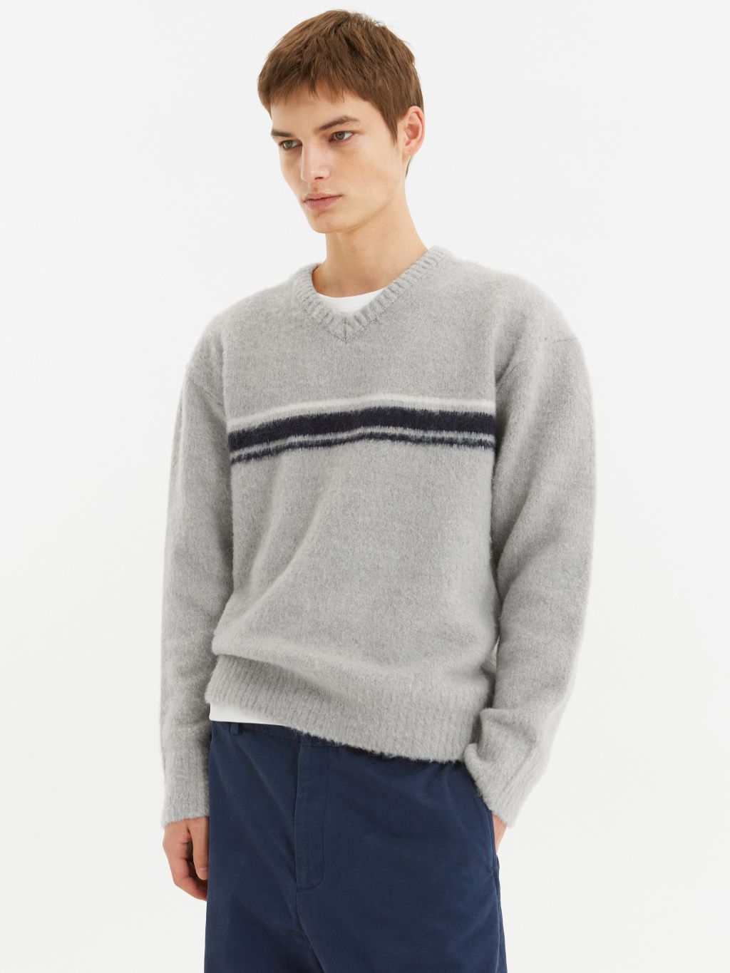 루즈핏 브이넥 스웨터 브러쉬드 가공 배색 스트라이프 디테일 간결한 배색 스트라이프 패턴이 돋보이는 코지한 감각의 브이넥 스웨터 입니다. 소재 표면 브러쉬드 텍스쳐 가공을 거쳐 헤어리한 질감이 특징이며, 불규칙한 원사 굵기로인해 나타나는 러프한 짜임이 시각적인 매력을 더합니다. 풍부한 계절감을 느낄 수 있는 시즈널한 컬러로 구성되었습니다. |