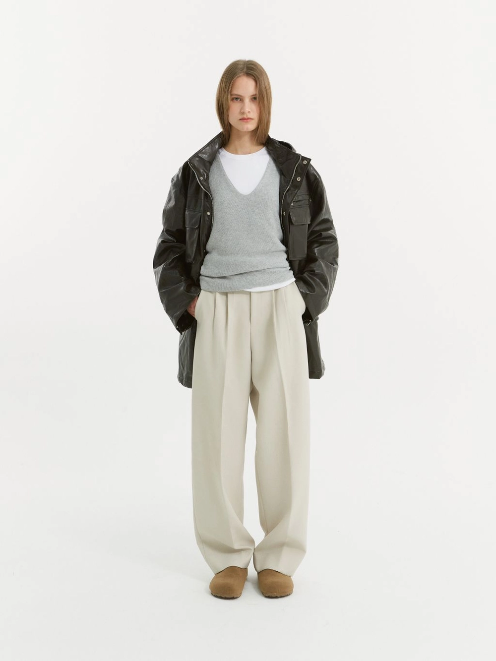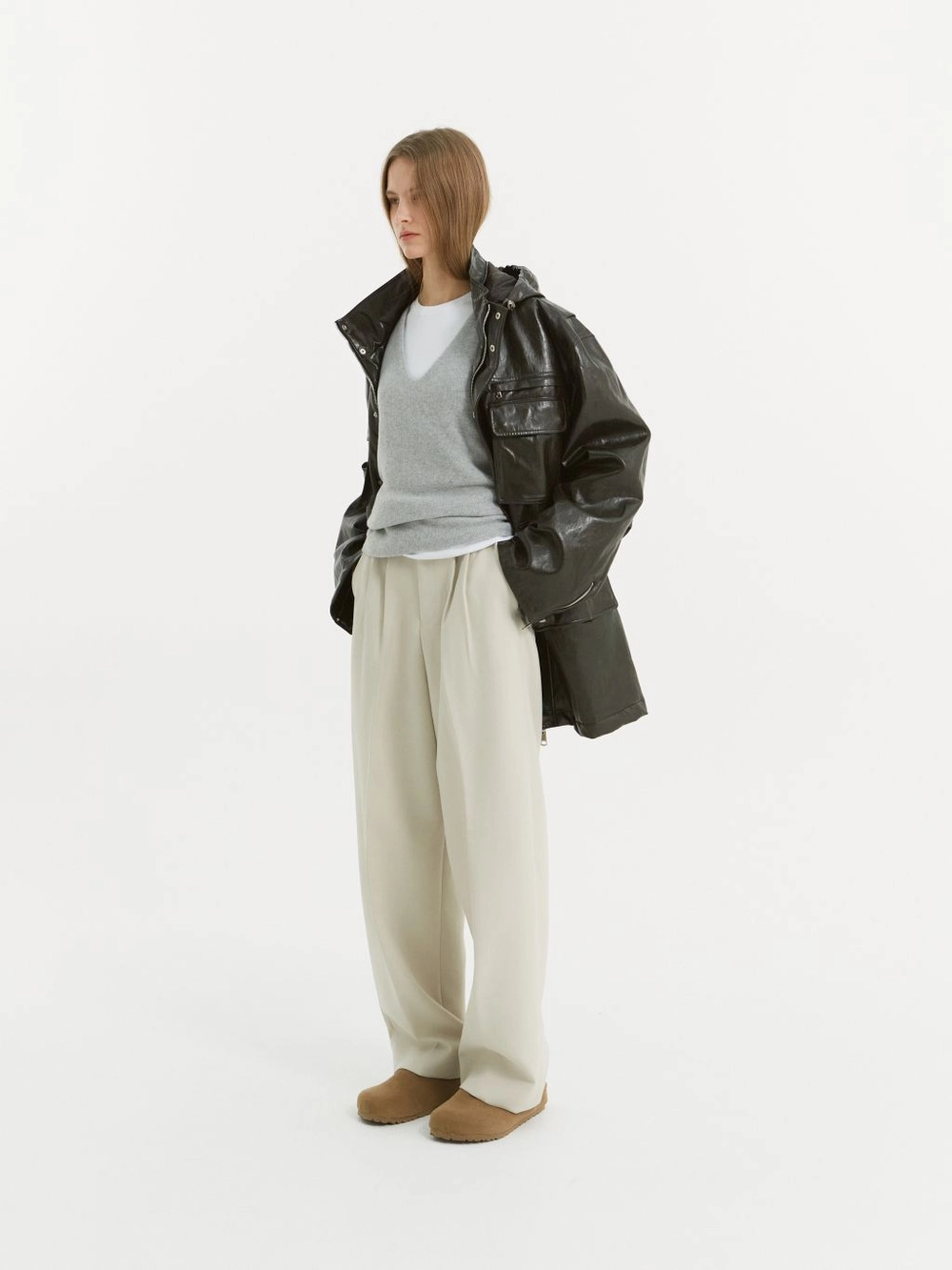 와이드 핏 커브드 팬츠 Two tuck 디테일 옆선 포켓 YKK 社의 지퍼 사용 무게감있는 소재로 제작된 커브드 핏 팬츠입니다. 고중량의 트윌 텍스쳐 소재를 사용하여 구조적인 커브 실루엣을 구현하였습니다. 허리에 투턱 디테일로 약간의 볼륨감을 주었으며, 허리 라인에서 부터 이어지는 자연스러운 커브 라인이 매력적인 아이템입니다. |