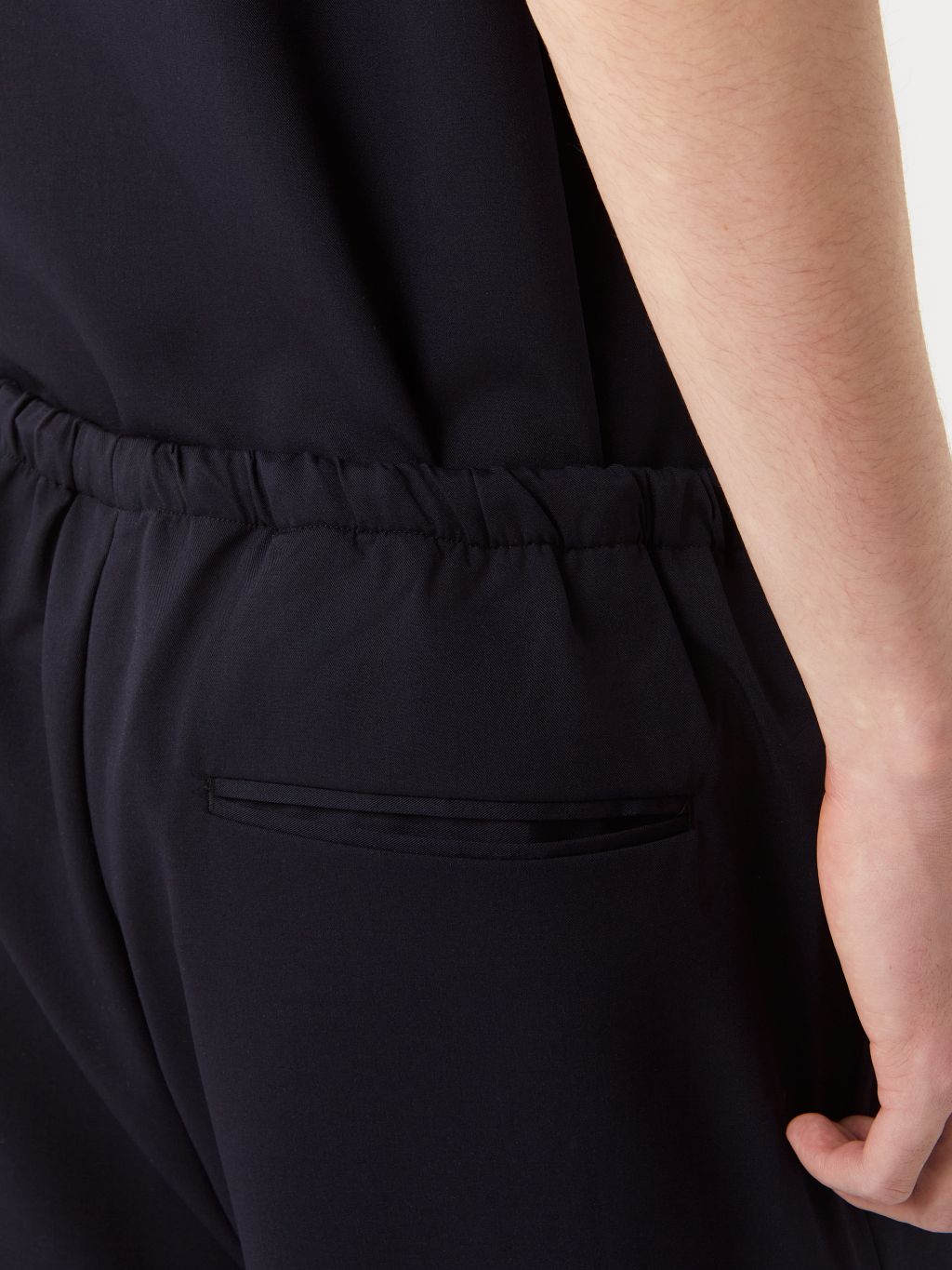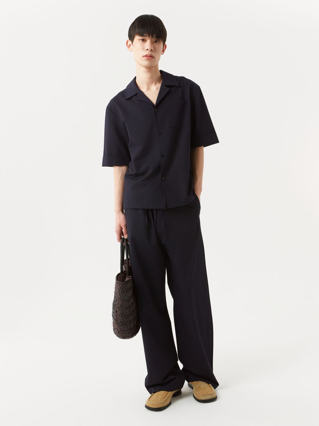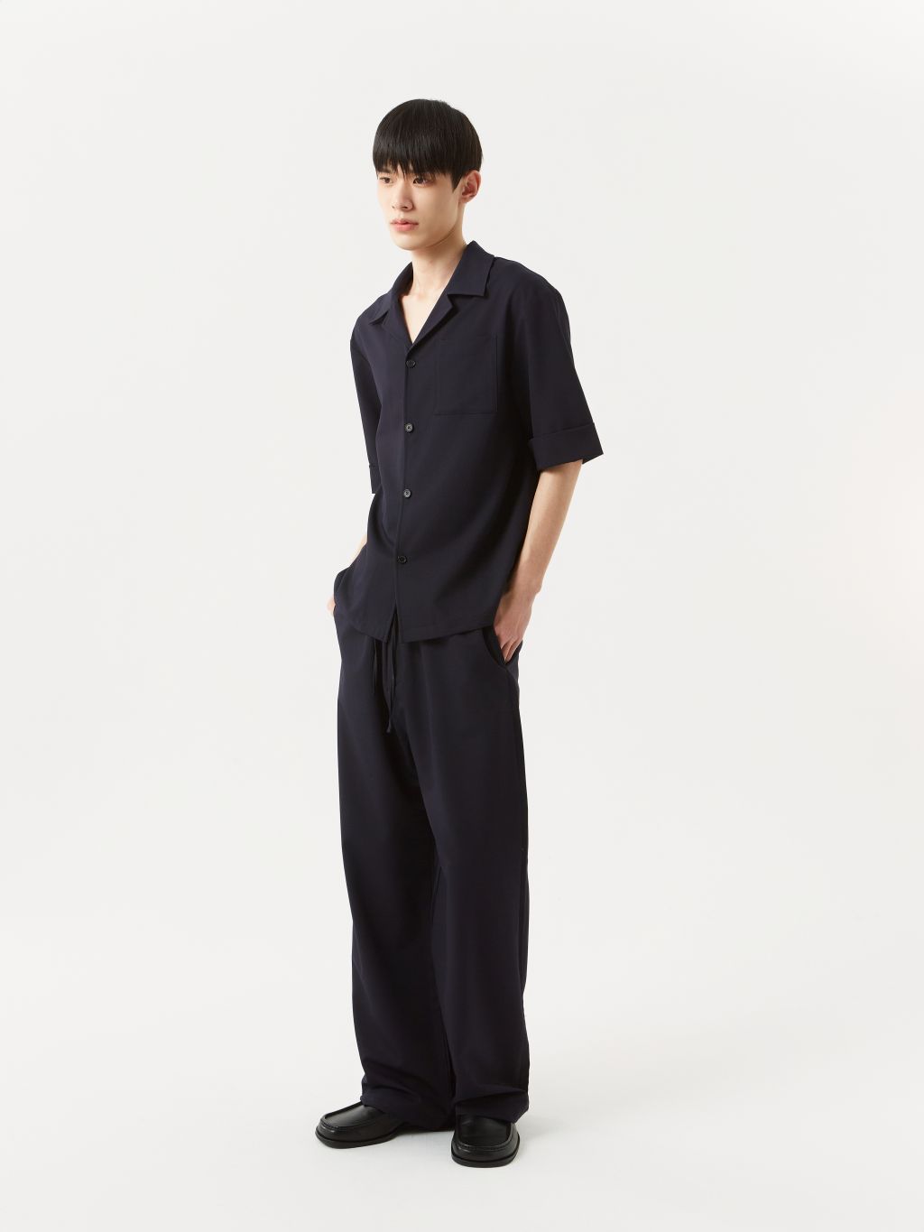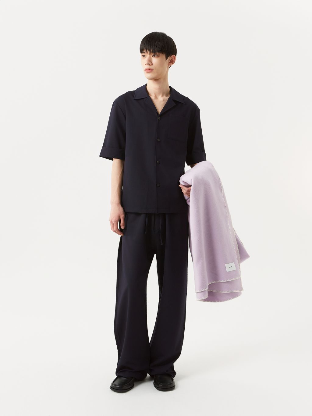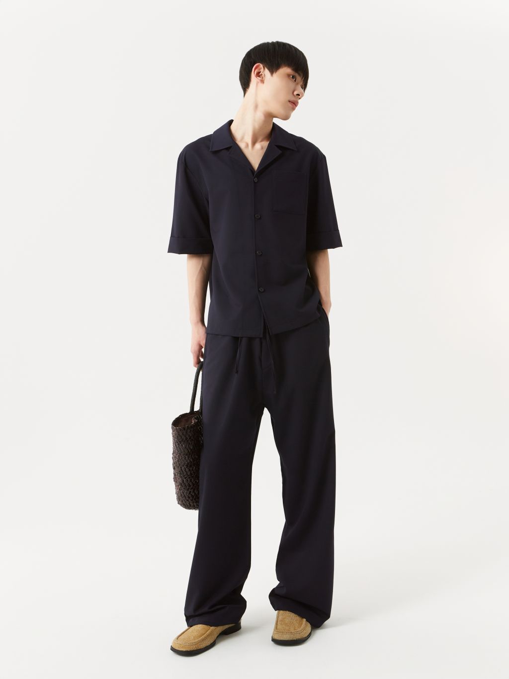 와이드 핏 팬츠 웨이스트 엘라스틱 밴딩 & 겉감 드로우 스트링 YKK 지퍼 플라이 뒷면 싱글 웰트 포켓 이지하게 착용되는 와이드 핏 밴딩 팬츠입니다. 엘라스틱 밴딩 & 드로우 스트링 디테일이 있어 사이즈에 구애없이 편안한 착용이 가능합니다. 이지한 룩으로 연출하거나, 드레스 다운이 필요한 룩에 활용하기 좋은 아이템 입니다. |