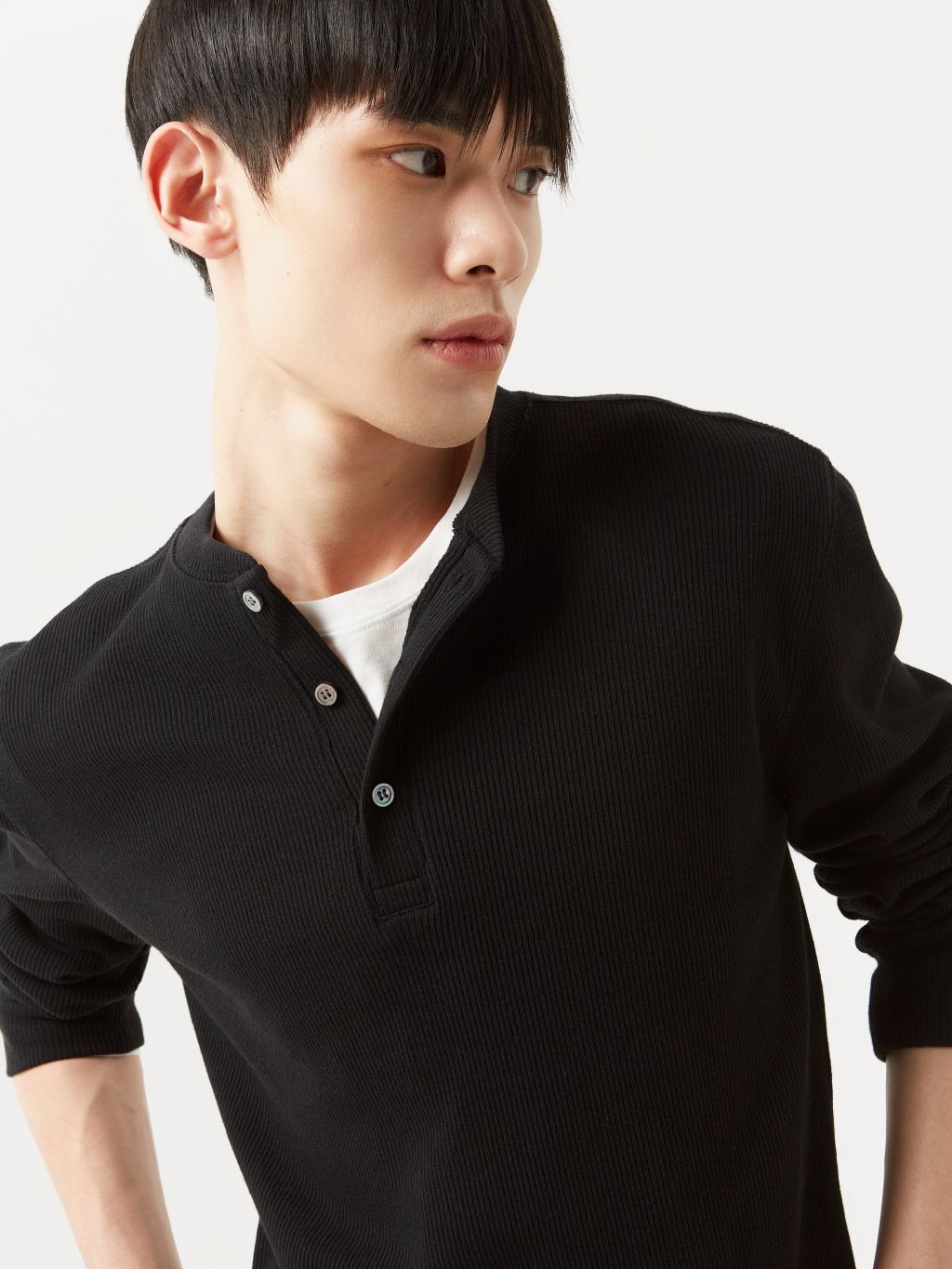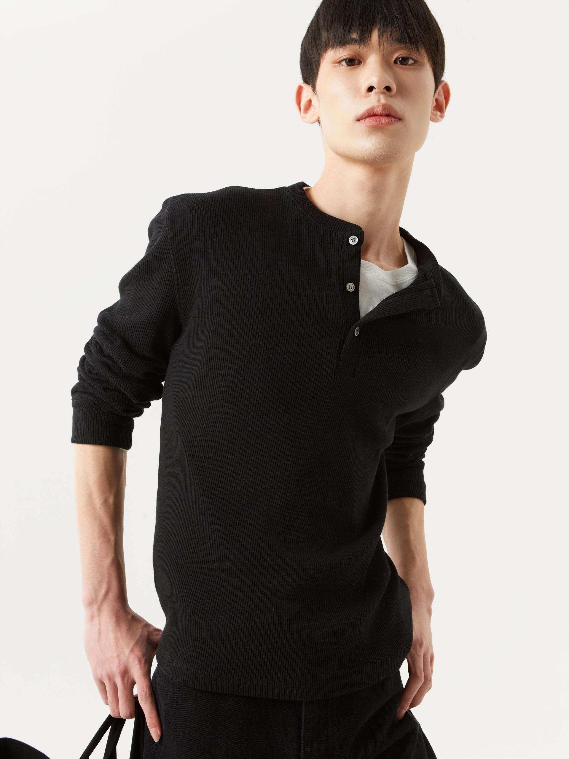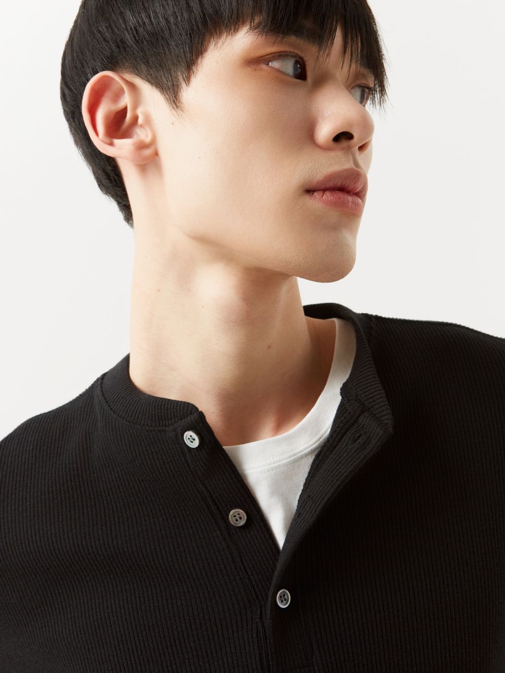 루즈 핏 크루넥 탑 정면 3버튼 플래킷 소매 커프스 디테일 로고 각인된 자개 단추 사용 포근한 질감이 돋보이는 골지 소재로 제작된 루즈 핏 헨리 탑입니다. 전체적으로 여유 있는 핏으로 착용되며, 유연한 탄성과 탄탄한 조직감으로 안정적인 실루엣을 완성해 줍니다. 네크에 버튼 다운 플래킷이 있으며, 팬츠에 넣거나 빼서 입기 좋은 기장감으로 제작되어 스타일링하기 좋은 사이즈감을 지녔습니다. 간결한 실루엣과 모노톤의 색감, 편안한 소재로 제작되어 에센셜한 이너로 활용하기 좋은 아이템입니다. |