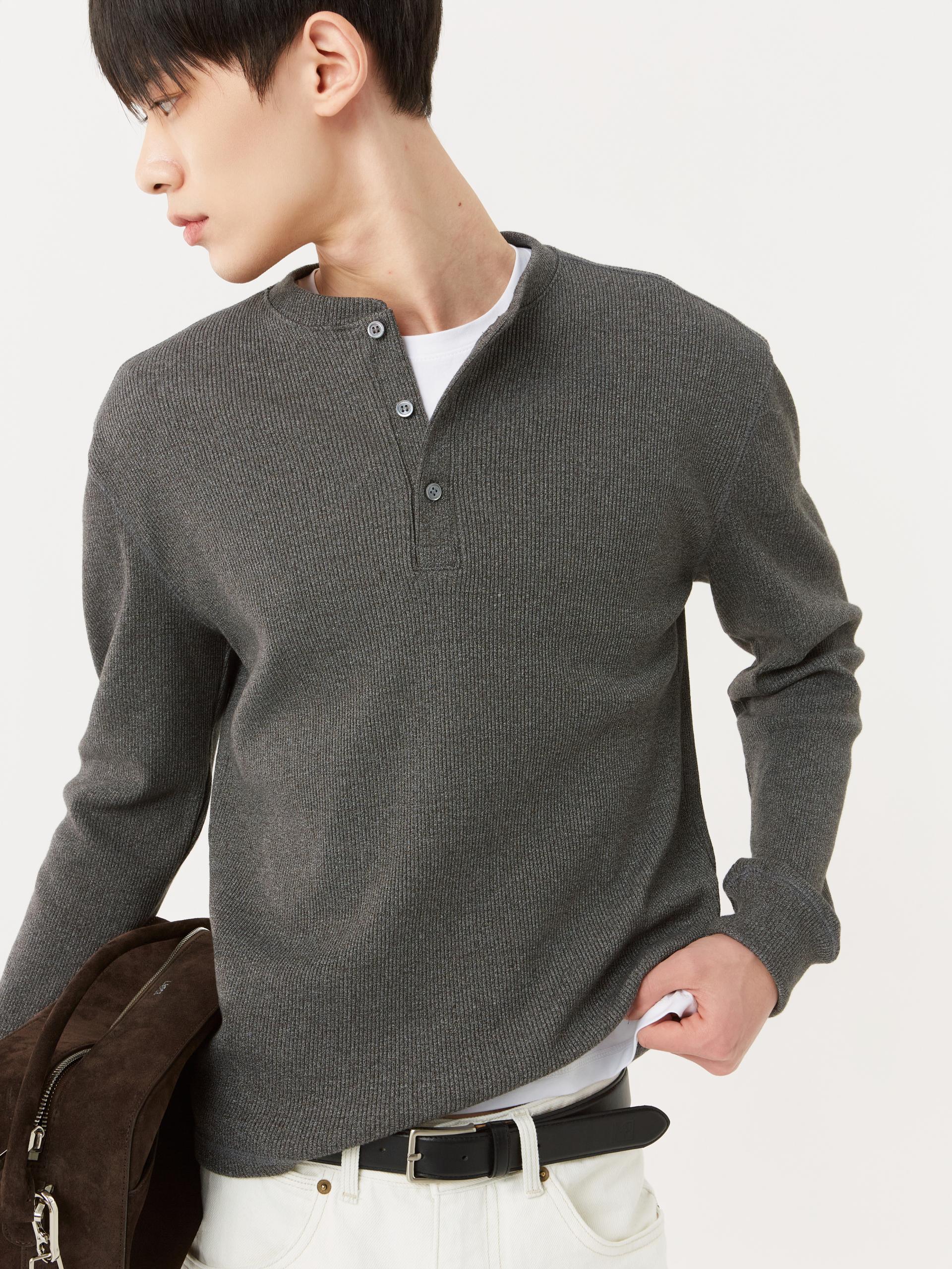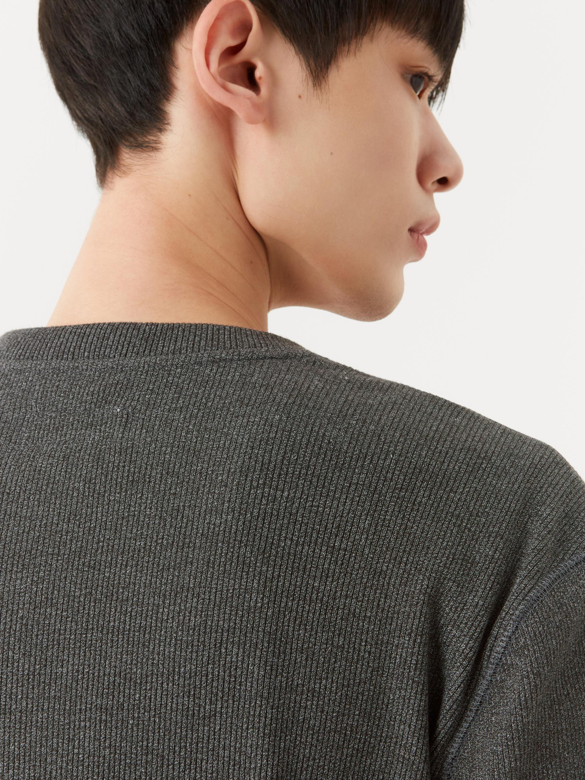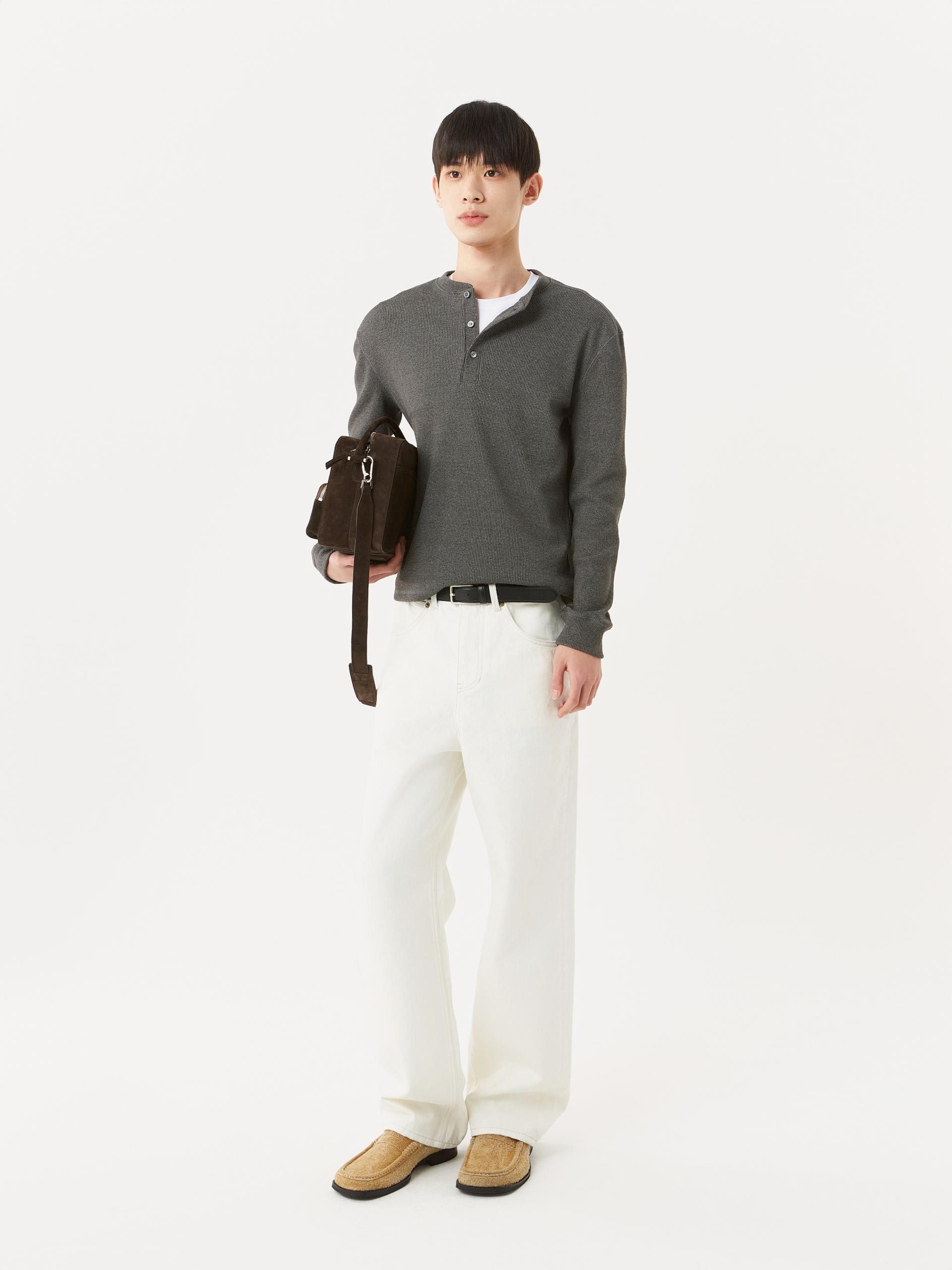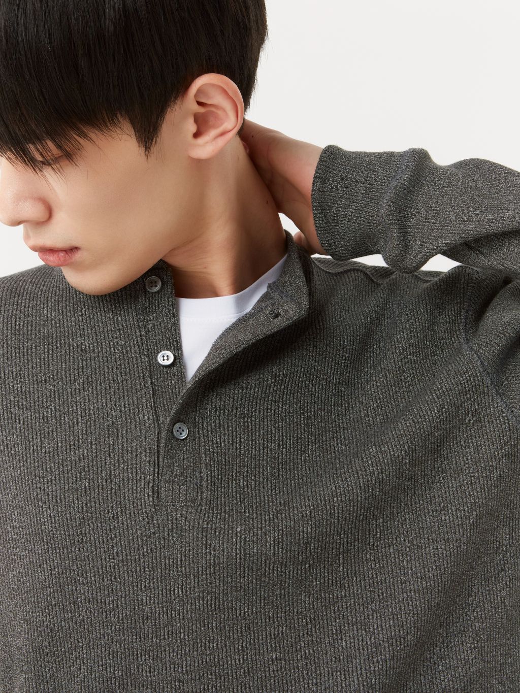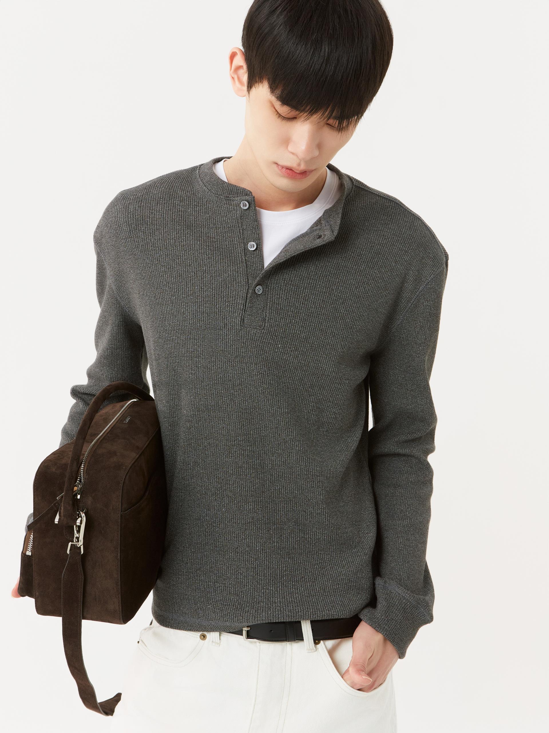 루즈 핏 크루넥 탑 정면 3버튼 플래킷 소매 커프스 디테일 로고 각인된 자개 단추 사용 포근한 질감이 돋보이는 골지 소재로 제작된 루즈 핏 헨리 탑입니다. 전체적으로 여유 있는 핏으로 착용되며, 유연한 탄성과 탄탄한 조직감으로 안정적인 실루엣을 완성해 줍니다. 네크에 버튼 다운 플래킷이 있으며, 팬츠에 넣거나 빼서 입기 좋은 기장감으로 제작되어 스타일링하기 좋은 사이즈감을 지녔습니다. 간결한 실루엣과 모노톤의 색감, 편안한 소재로 제작되어 에센셜한 이너로 활용하기 좋은 아이템입니다. |