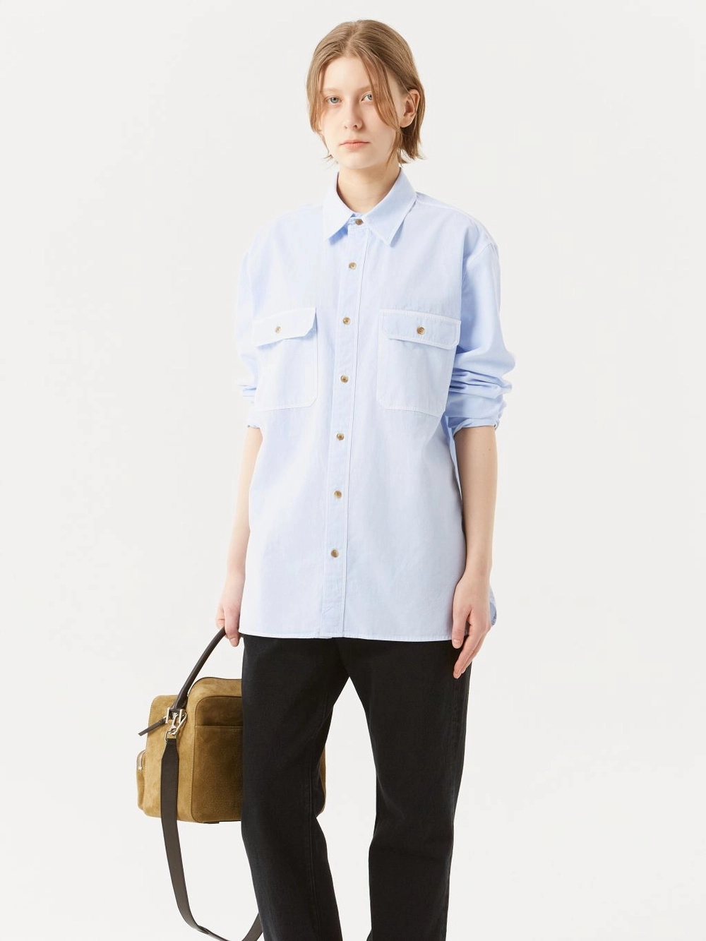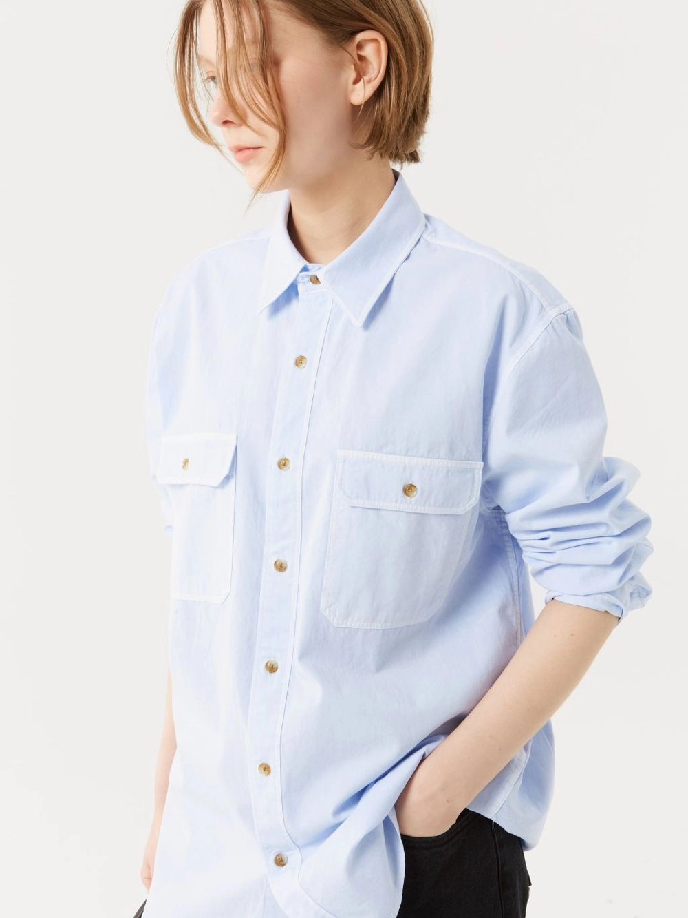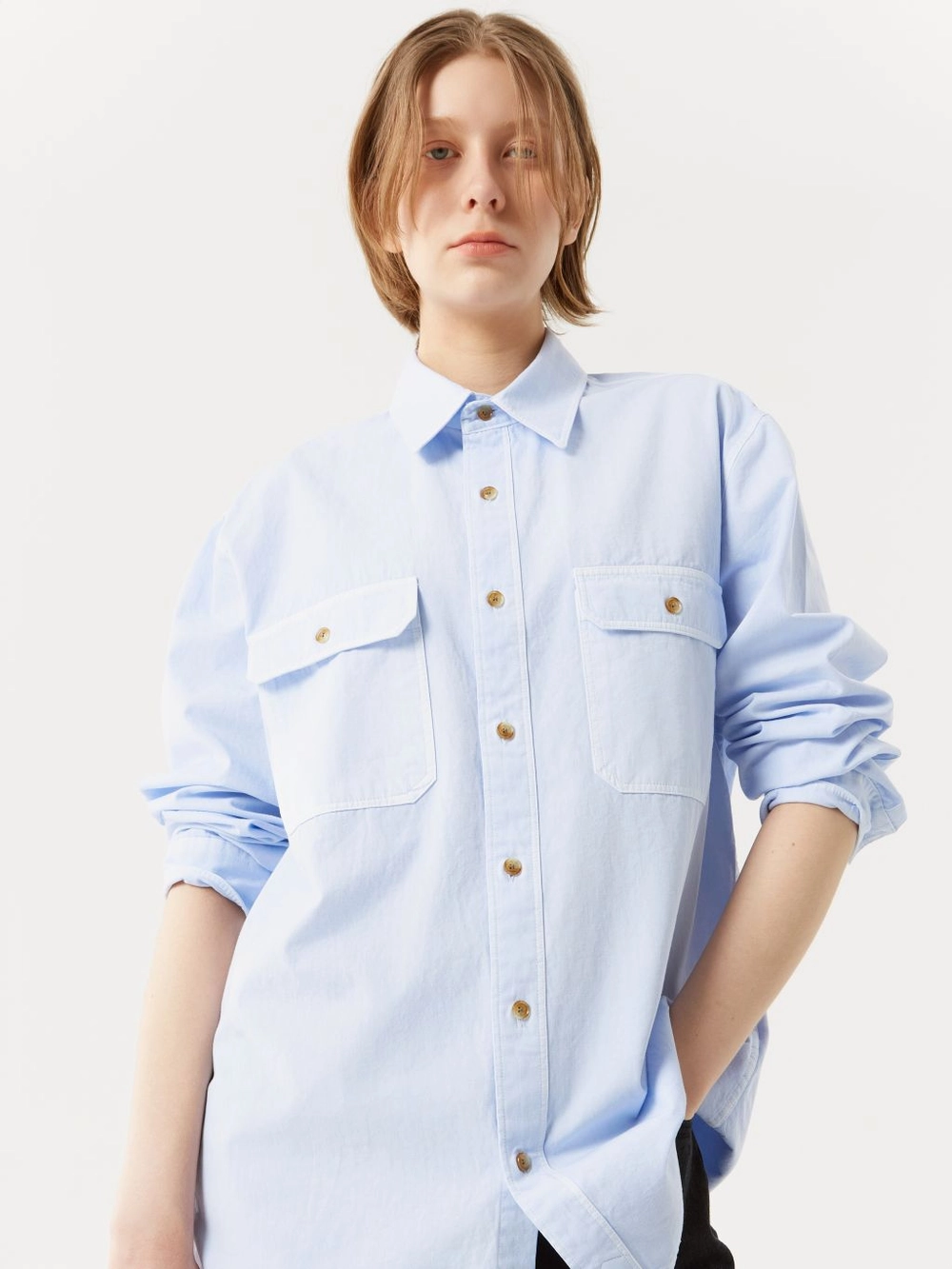 루즈 핏 셔츠 피그먼트 다잉 스프레드 칼라 더블 패치 포켓 곡선형 밑단 피그먼트 다잉 고유의 빈티지한 컬러감이 돋보이는 루즈 핏 셔츠입니다. 전면에 더블 패치 포켓을 배치하여 실용성을 강조했으며, 곡선형 밑단이 자연스러운 실루엣을 만들어 주어 더욱 세련된 느낌을 선사합니다. |