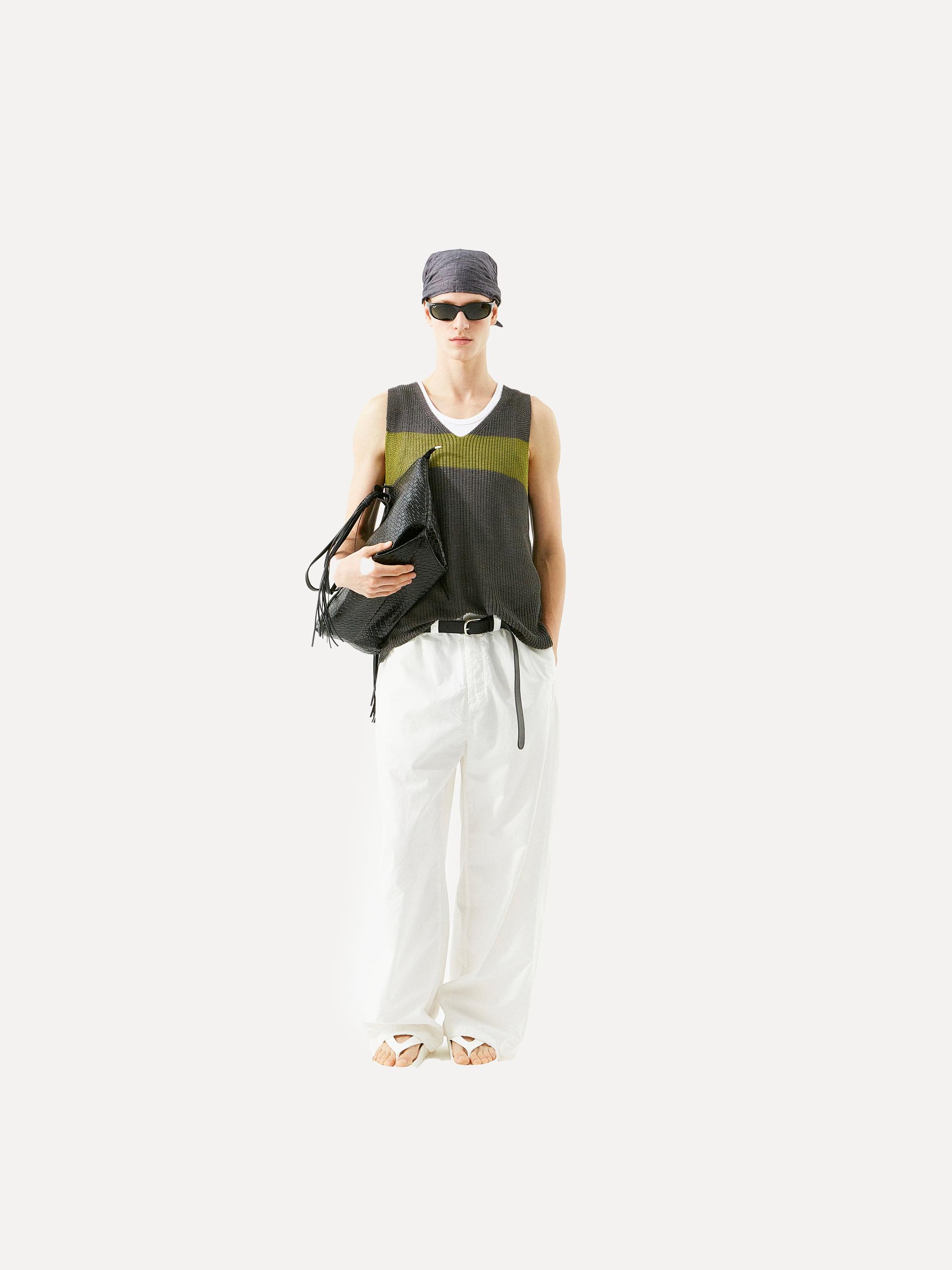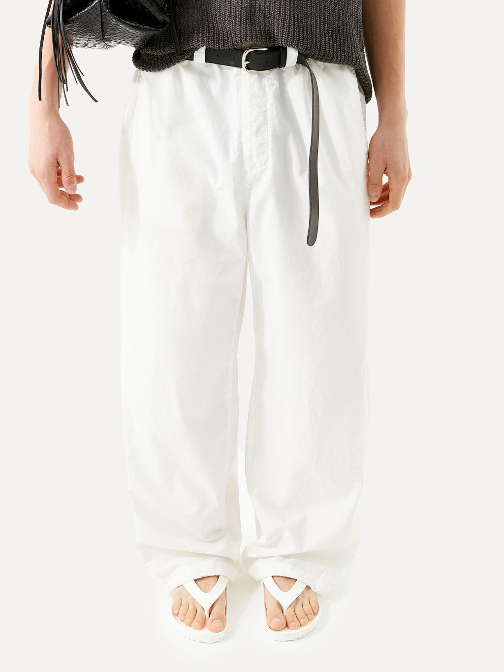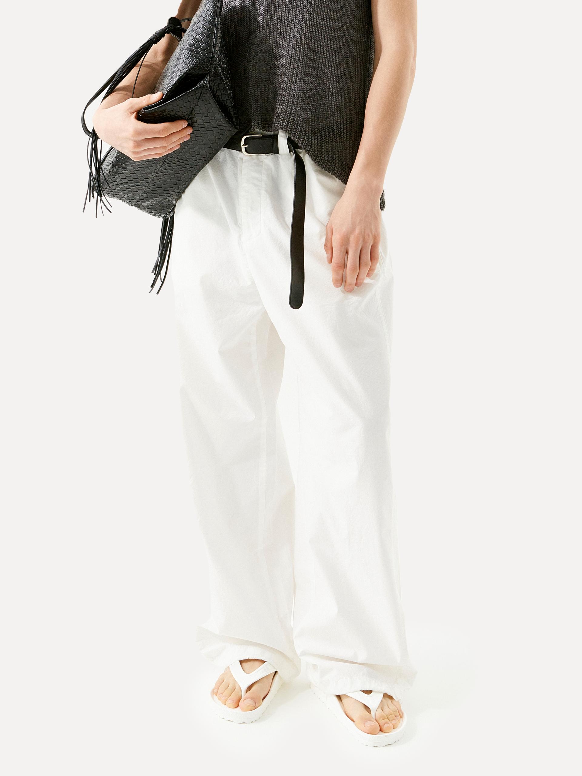 와이드 핏 지퍼 플라이 볼드한 벨드 루프 엘라스틱 허리 밴드 뒷면 아웃 패치 포켓 밑단 드로우 스트링 디테일 실루엣의 변주가 가능한 구조적 디테일이 돋보이는 와이드 핏 코튼 팬츠입니다. 드라이한 텍스쳐의 코튼 소재로 고시감이 있어 핏을 깔끔하게 잡아주며, 허리의 이너 밴딩으로 편안한 착용감을 더했습니다. 밑단 안쪽에 스트링이 내장되어 있어 스타일에 따라 조거 형태로도 연출이 가능하며, 와이드와 테이퍼드 두 가지 실루엣을 자유롭게 넘나들 수 있는 유연한 구조가 특징입니다. |