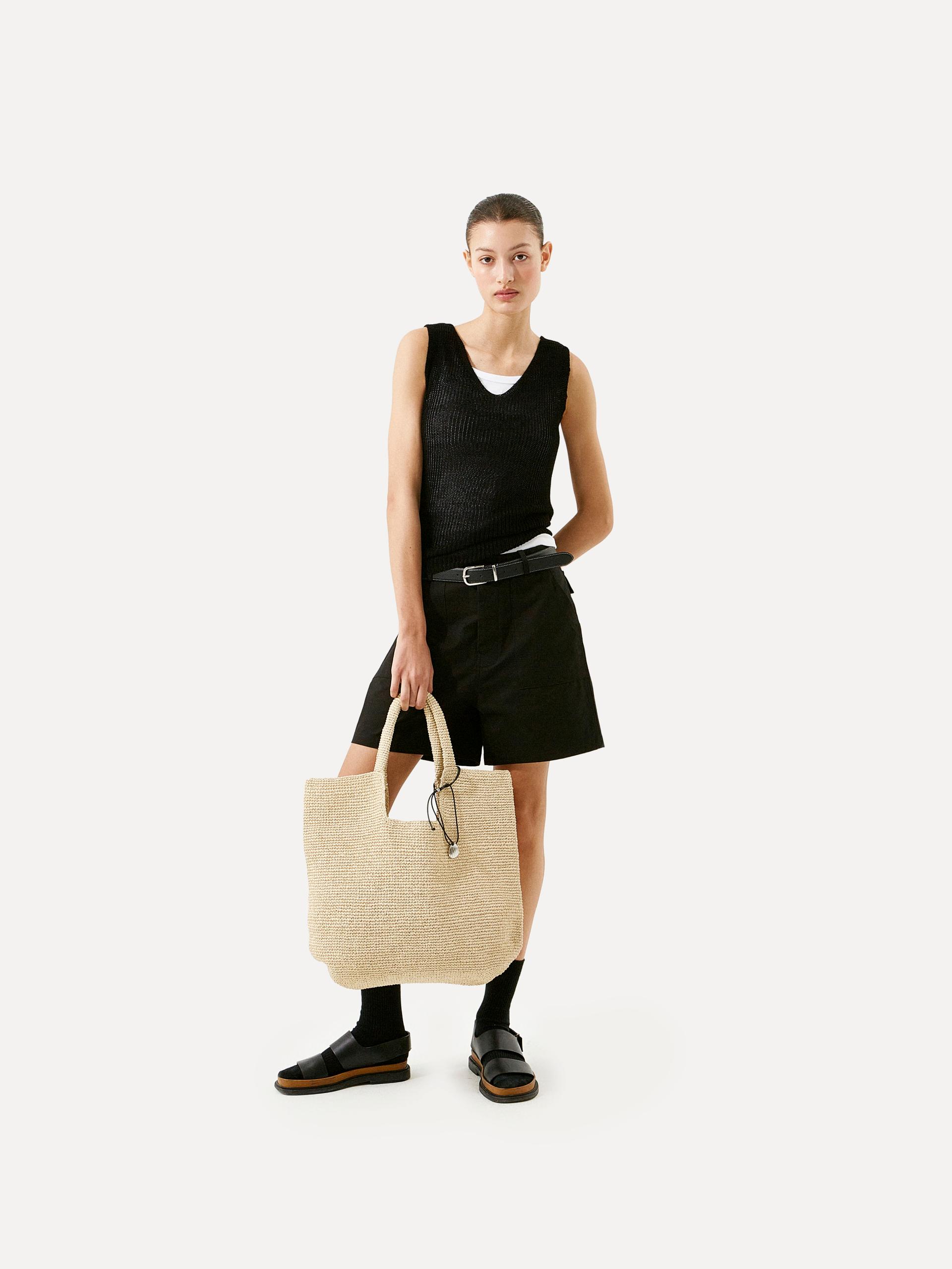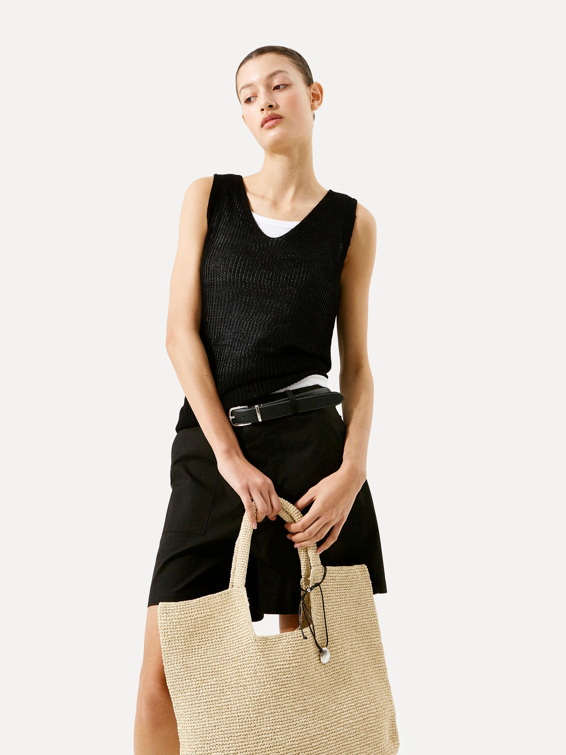 브이넥 루즈 핏 베스트 성근 니트 조직 가슴 부분 컬러 배색 스트라이프 디테일 레이어링에 용이한 슬리브리스 디자인 로우 게이지 짜임으로 가볍고 유연하게 흐르는 텍스처가 돋보이는 브이넥 니트 베스트입니다. 모던한 블랙 컬러로 간결한 실루엣을 강조하며 다양한 룩에 자연스럽게 녹아듭니다. 티셔츠나 셔츠 등 다양한 이너와 손쉽게 매치할 수 있어, SS 시즌에 유연하게 활용 가능한 아이템 입니다. |