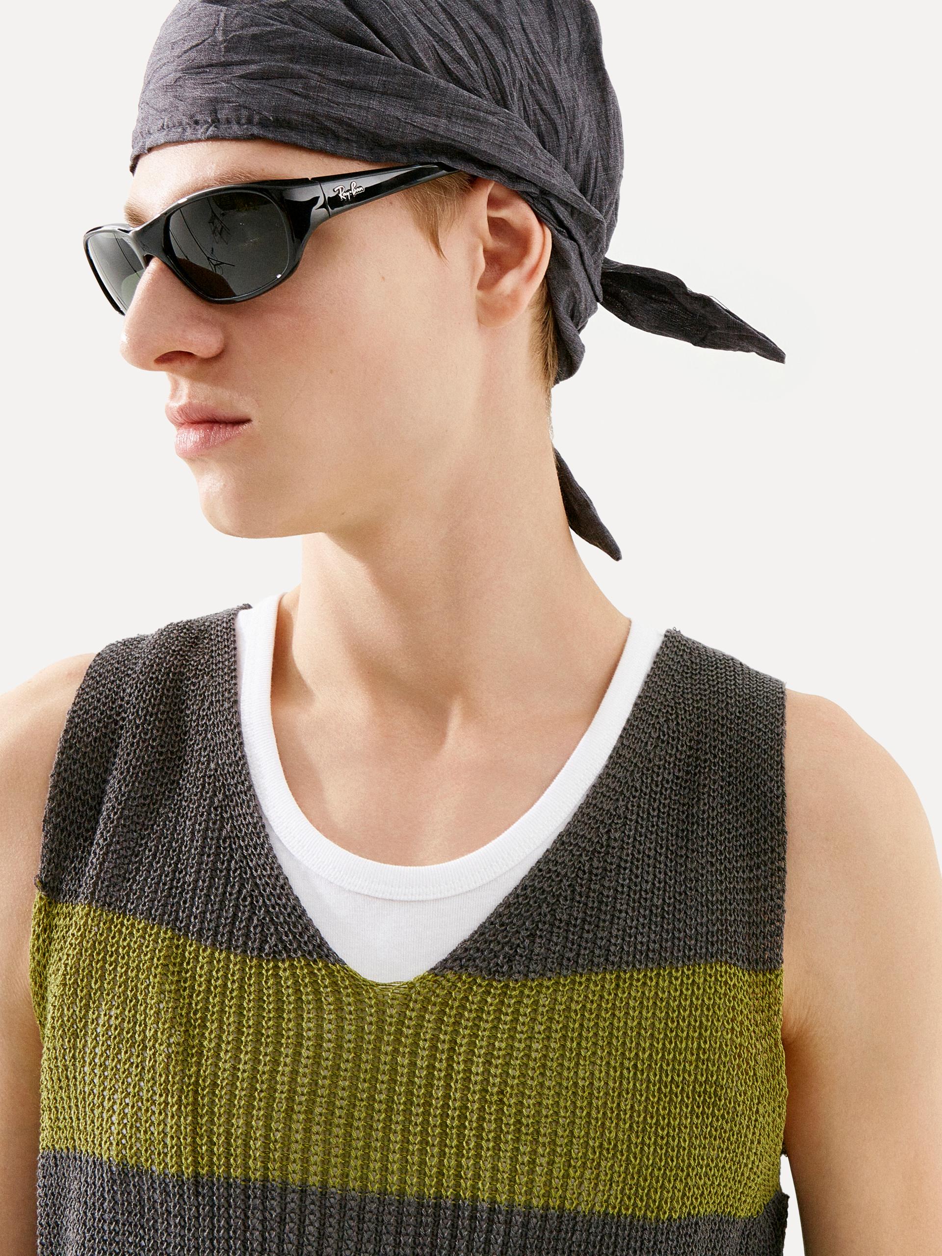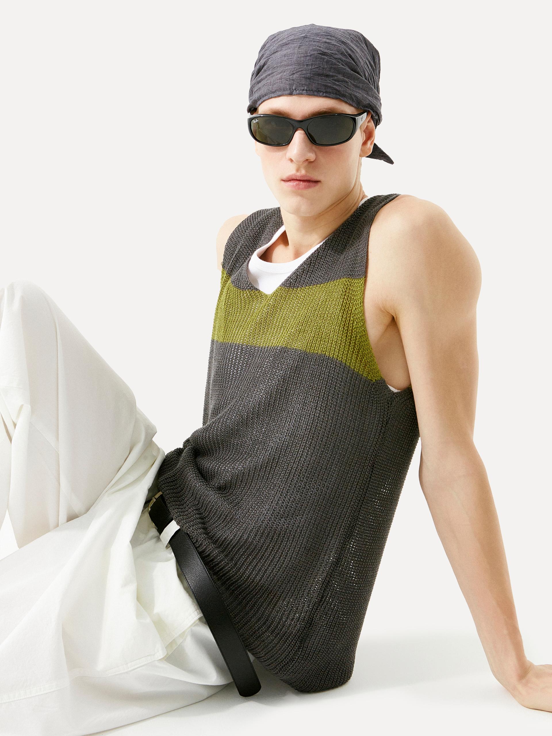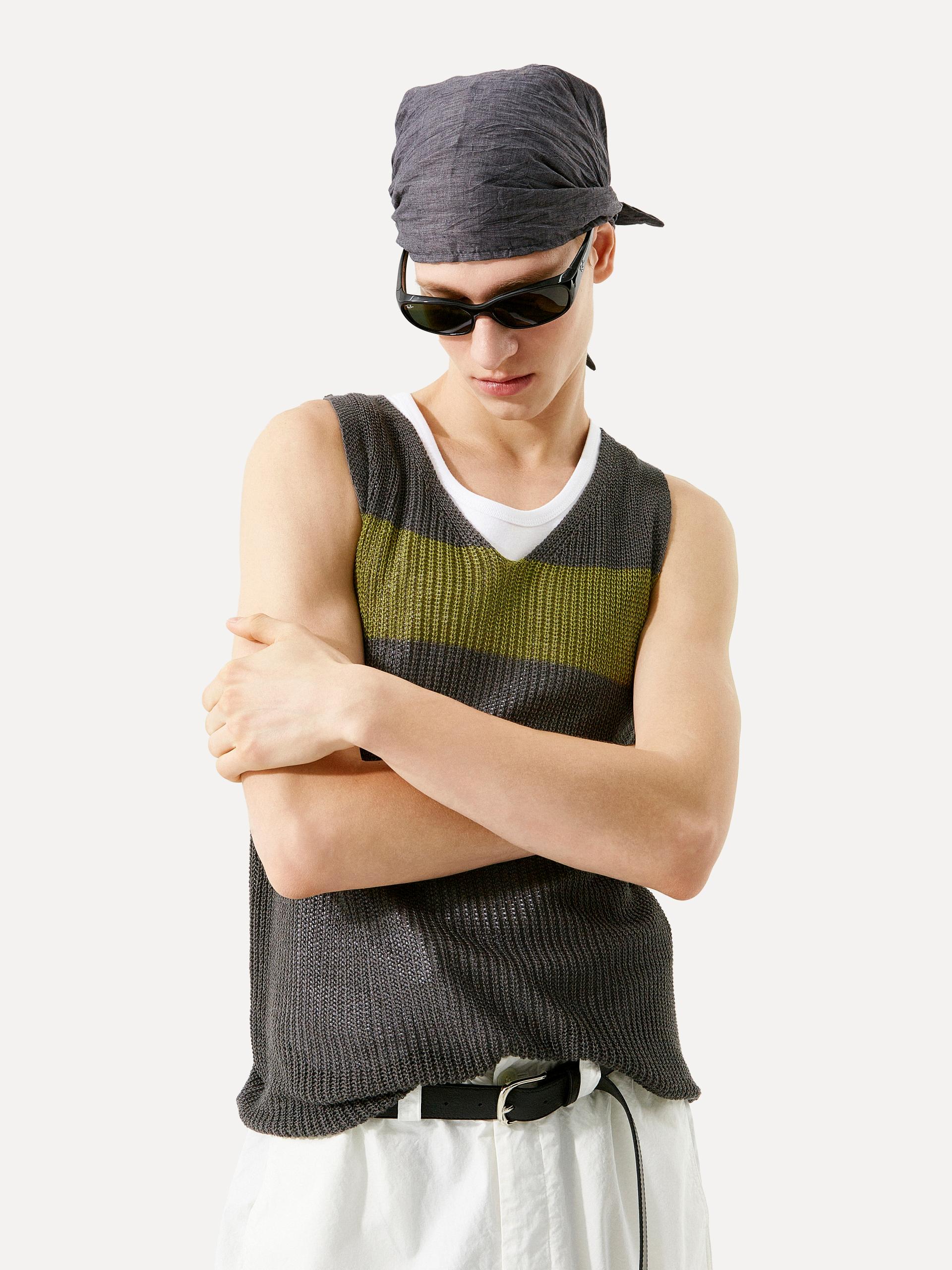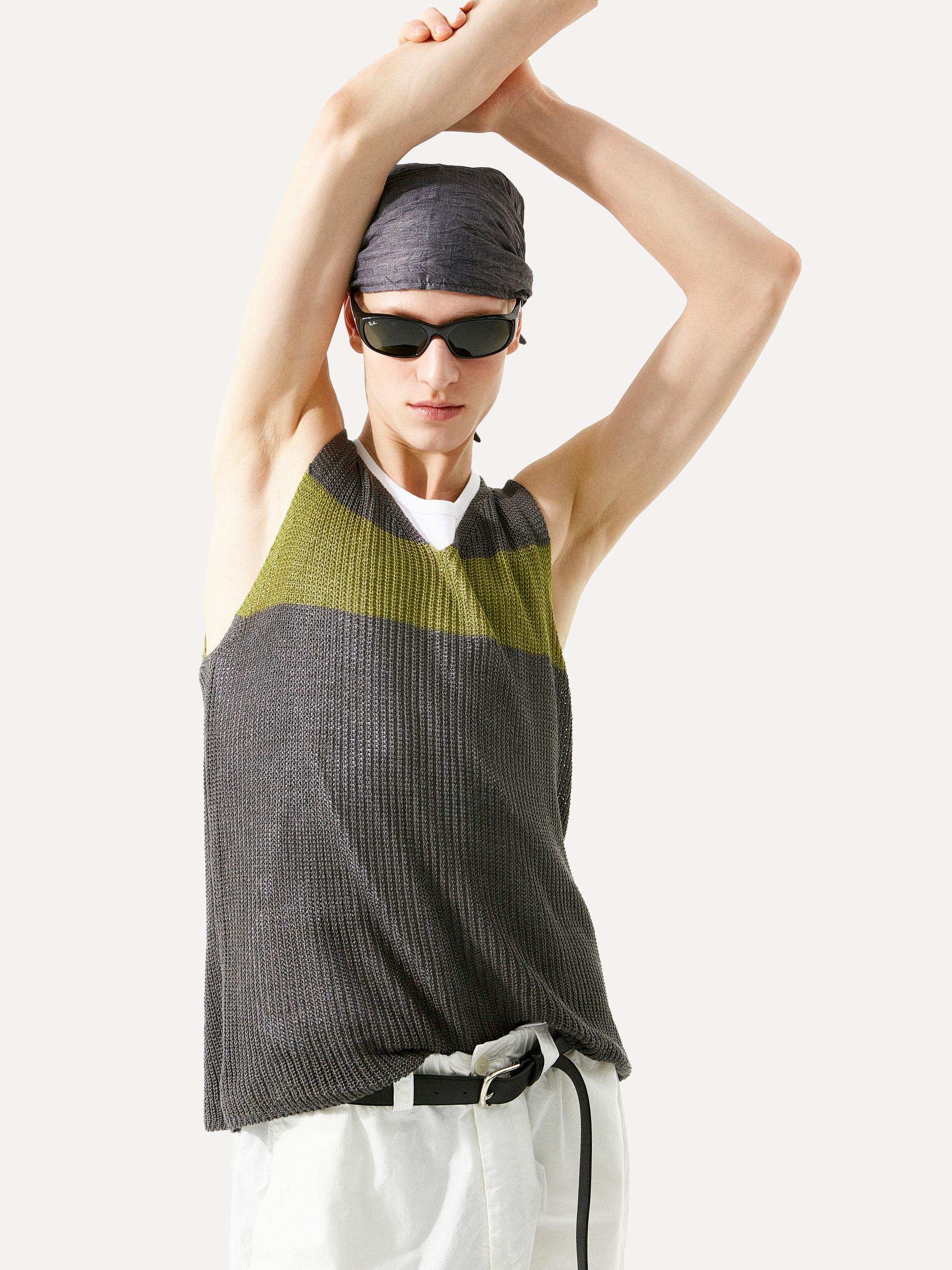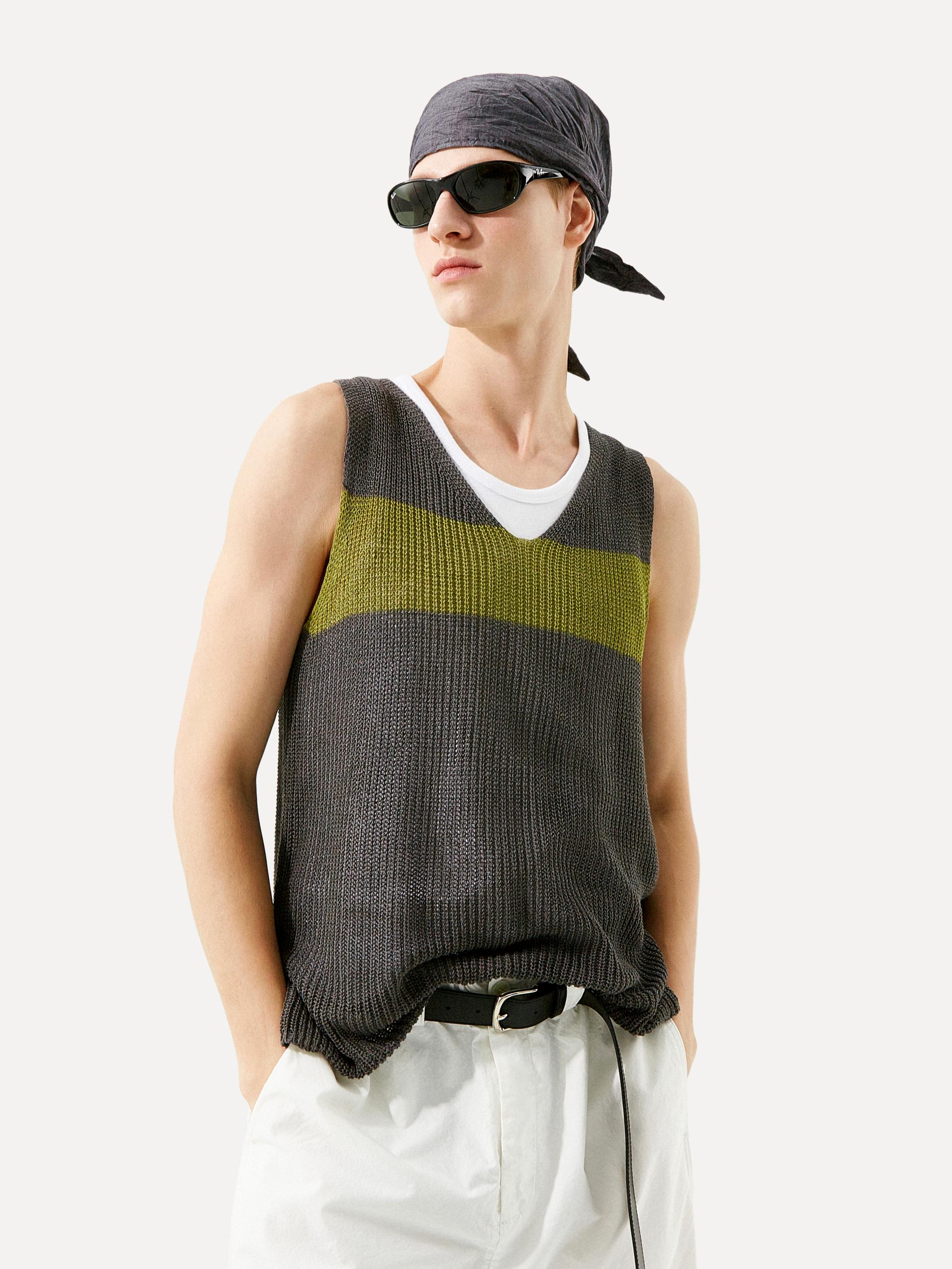 브이넥 루즈 핏 베스트 성근 니트 조직 가슴 부분 컬러 배색 스트라이프 디테일 레이어링에 용이한 슬리브리스 디자인 로우 게이지 짜임으로 가볍고 유연하게 흐르는 텍스처가 돋보이는 브이넥 니트 베스트입니다. 가슴에 더해진 볼드한 컬러 배색 스트라이프가 전체 룩에 자연스러운 포인트를 더합니다. 티셔츠나 셔츠 등 다양한 이너와 손쉽게 매치할 수 있어, SS 시즌에 유연하게 활용 가능한 아이템 입니다. |