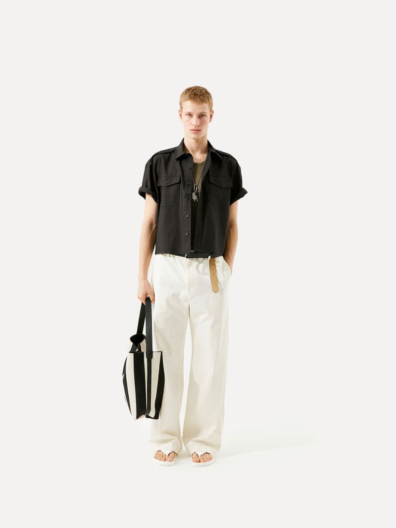 루즈핏 크롭 셔츠 더블 패치 포켓 스프레드 칼라 롤업 소매 드롭 숄더 & 견장 디테일 스트레이트 컷 밑단 밀리터리 셔츠의 오리지널리티를 현대적으로 재해석한 루즈 핏 크롭 셔츠입니다. 유연하면서도 견고한 원단 질감은 고급스러운 광택을 지녀 깔끔한 실루엣을 유지해 줍니다. 더블 패치 포켓, 어깨 견장 등의 유틸리티 디테일이 가미 되었으며, 허리선을 살짝 덮는 세미 크롭 기장으로 착용되는 모던한 실루엣이 특징입니다. 원하는 기장으로 소매 길이를 롤업하여 착용 가능한 제품으로 다양한 무드의 룩에 활용하기 좋은 아이템 입니다. |
