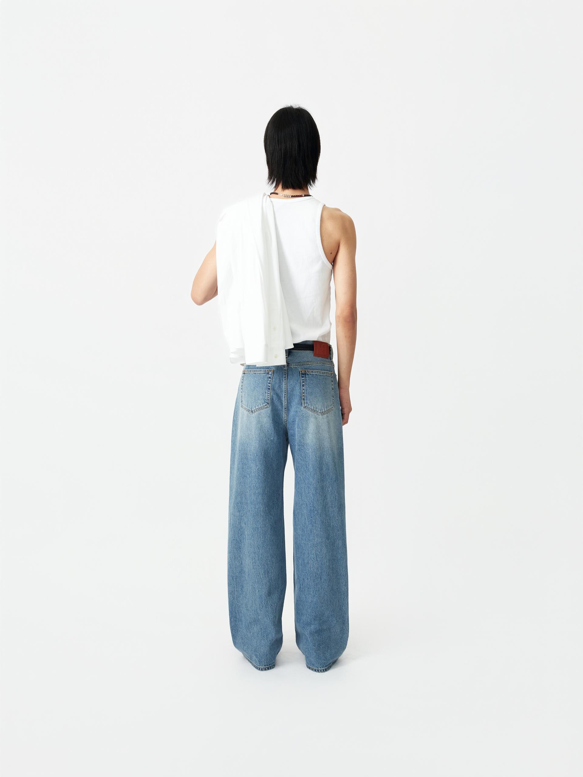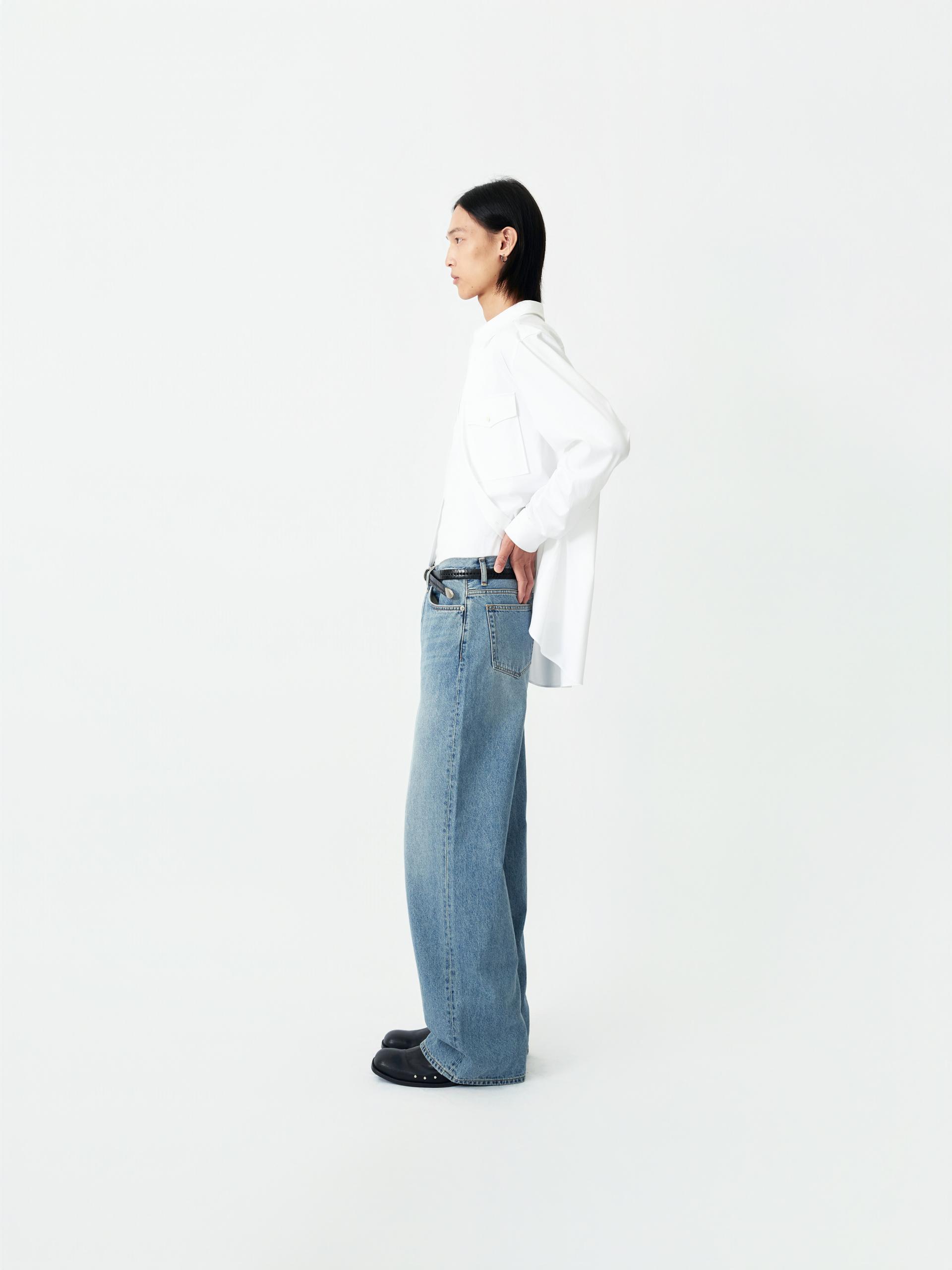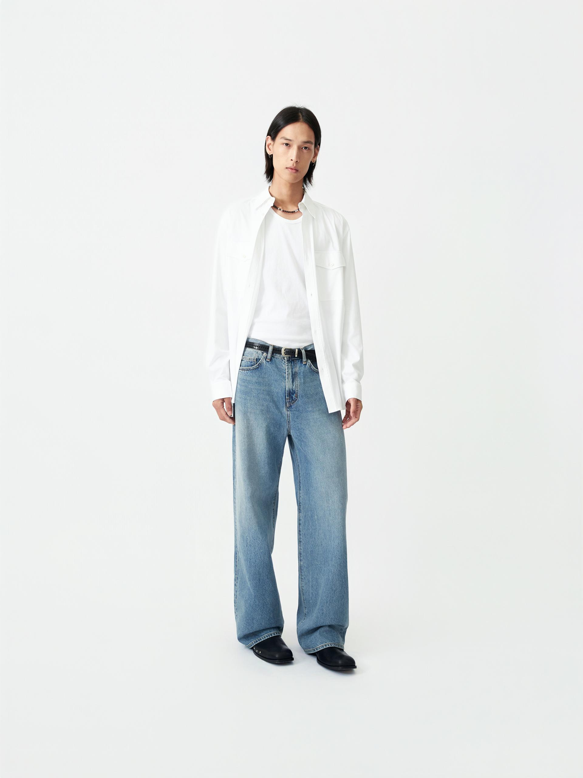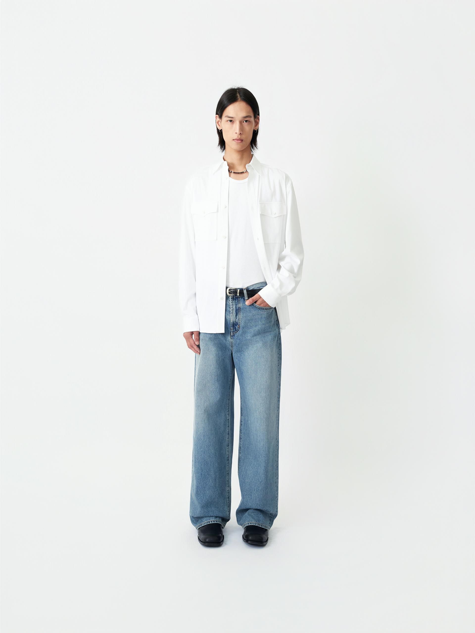 LABEL 로고가 각인된 고정식 켄톤 LB 엠블럼 베지터블 소가죽 엠보 패치 시계주머니에 위치한 LB 엠블럼 음각된 리벳 중앙지퍼 안쪽 시접 바인딩 처리 30수 트윌 코튼 라이닝 YKK 社의 지퍼 사용 코아사 봉사 부드러운 블루톤의 워싱 컬러가 매력적인 와이드 핏 진 입니다. 편안한 착용감과 균형감있는 실루엣을 우선으로 고려하여 패턴 개발된 와이드 핏 진입니다. 발등에 자연스럽게 주름지는 기장감으로 제작되어 착용시 롱한 프로포션으로 연출해줍니다. 와이드한 핏을 잘 구현해줄 수 있는 아메리칸 얀(링사)이 사용된 데님을 사용하였으며, 오래도록 착용하여도 변형이 적은 우수한 내구성을 자랑합니다. 실버톤의 하드웨어와 베지터블 소가죽 엠보 패치가 가미된 완성도 높은 데님으로, 옷장을 구성하는 에센셜한 아이템이 되어줄 제품입니다. |