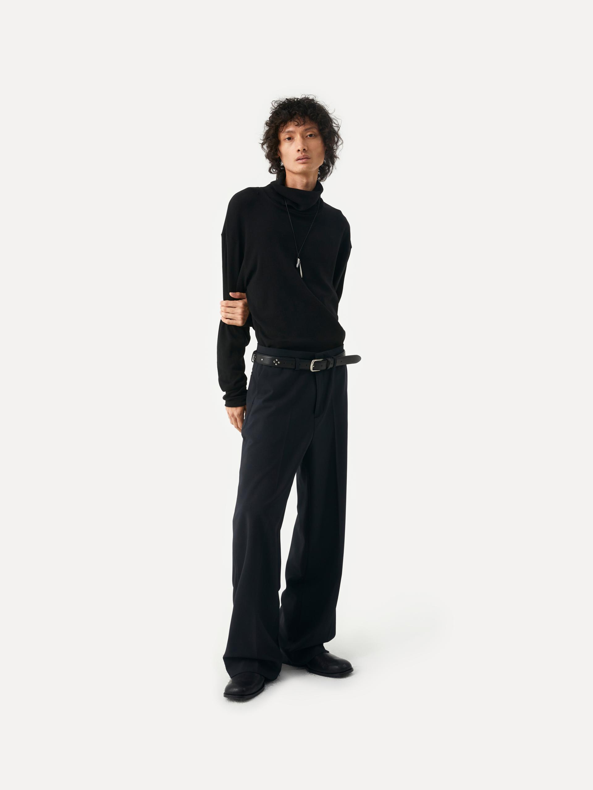 와이드 핏 팬츠 탈부착 가능한 소가죽 벨트 포함 옆선 사선 포켓 & 뒷면 웰트 포켓 YKK 社의 지퍼 사용 정제된 실루엣과 디테일로 모던한 감각을 엿볼 수 있는 와이드 핏 팬츠 입니다. 와이드한 실루엣, 슬림한 허리선과 약간 낮게 배치된 벨트고리 디테일이 어우러져 세련된 분위기를 연출해 줍니다. 다이아몬드 형태의 스터드 문양이 포인트인 소가죽 벨트는 탈부착 가능하며, 벨트만으로도 룩에 세련된 무드를 더할 수 있어 다양한 스타일링에 활용하기 좋은 실용적 아이템 입니다. |
