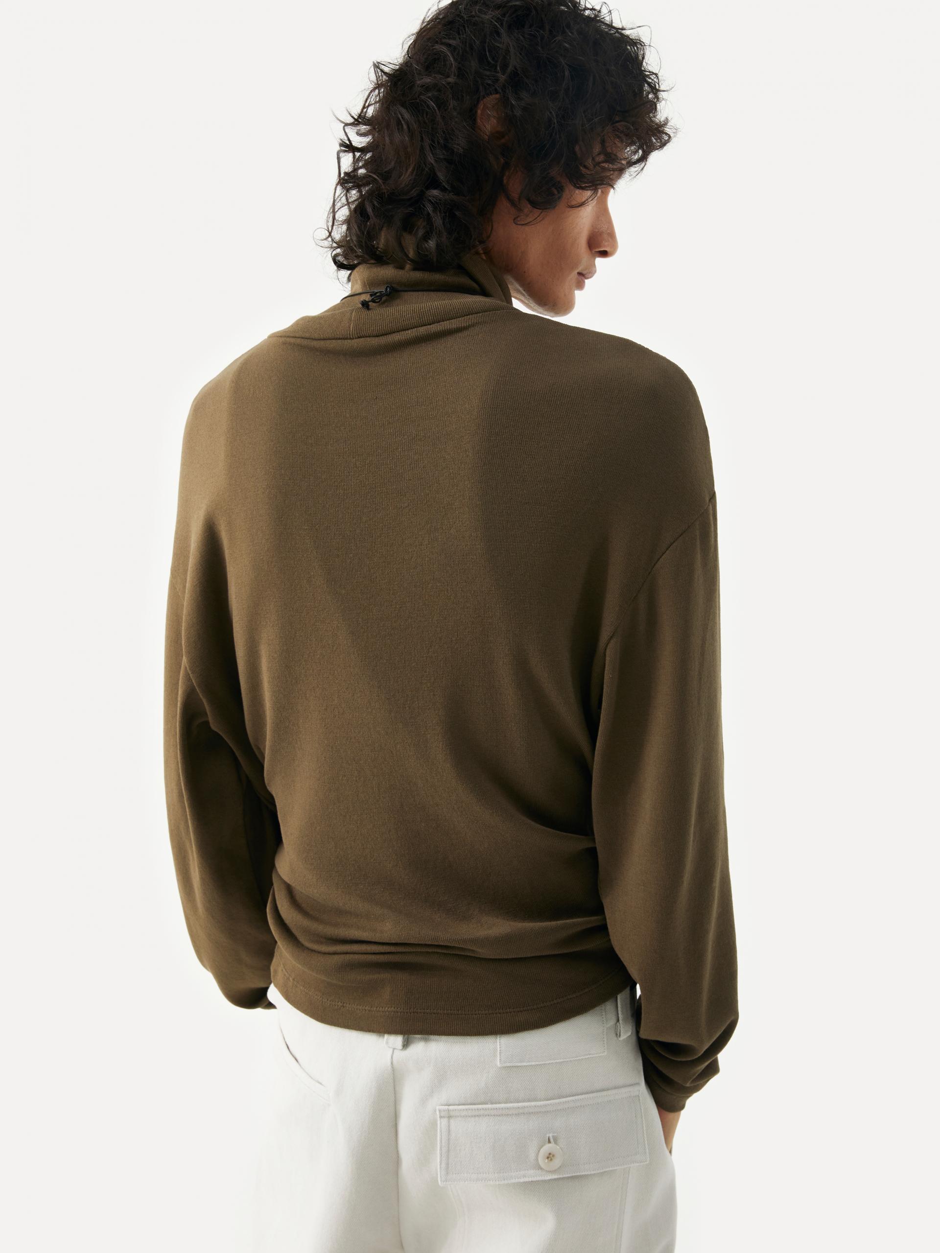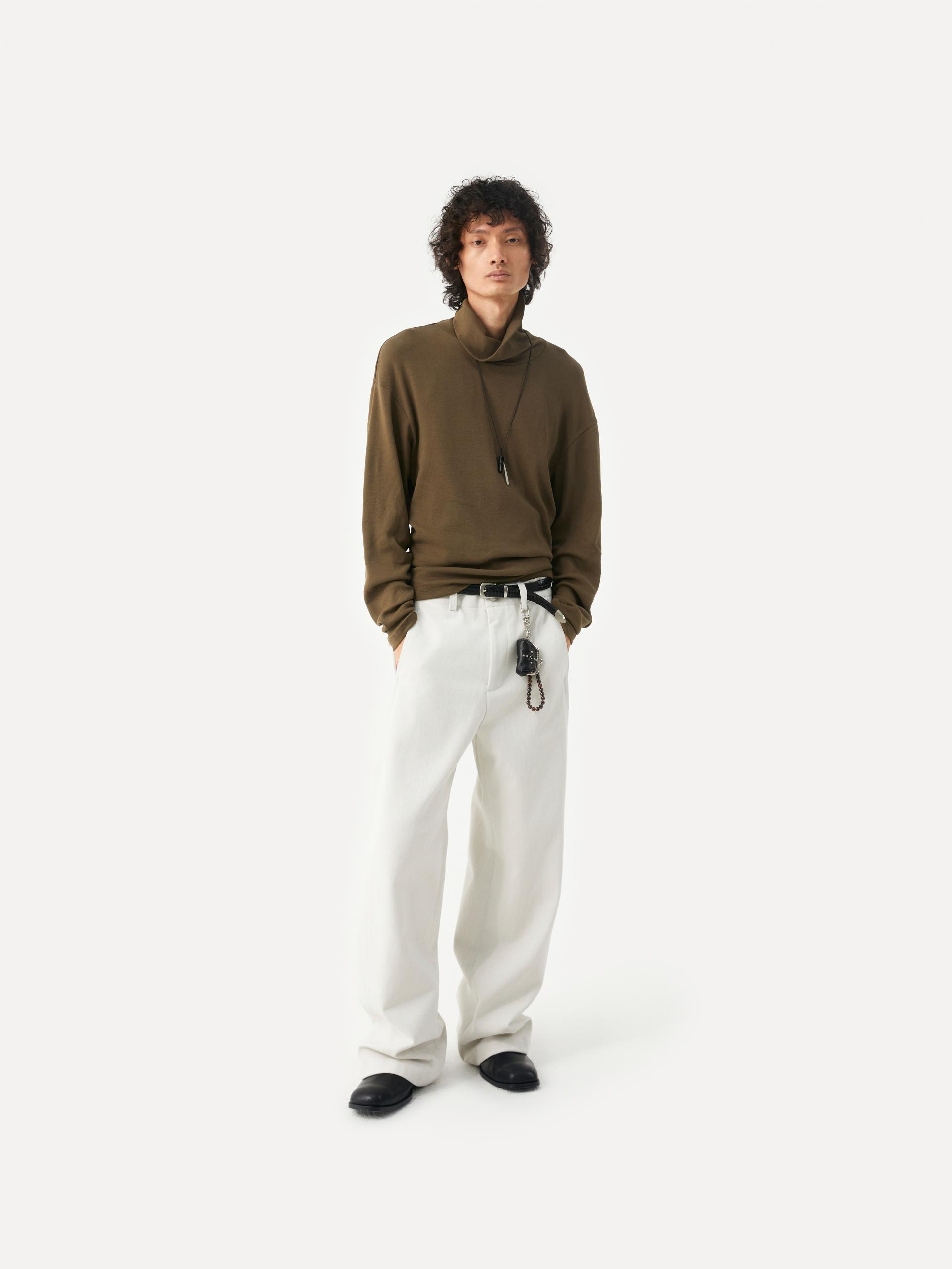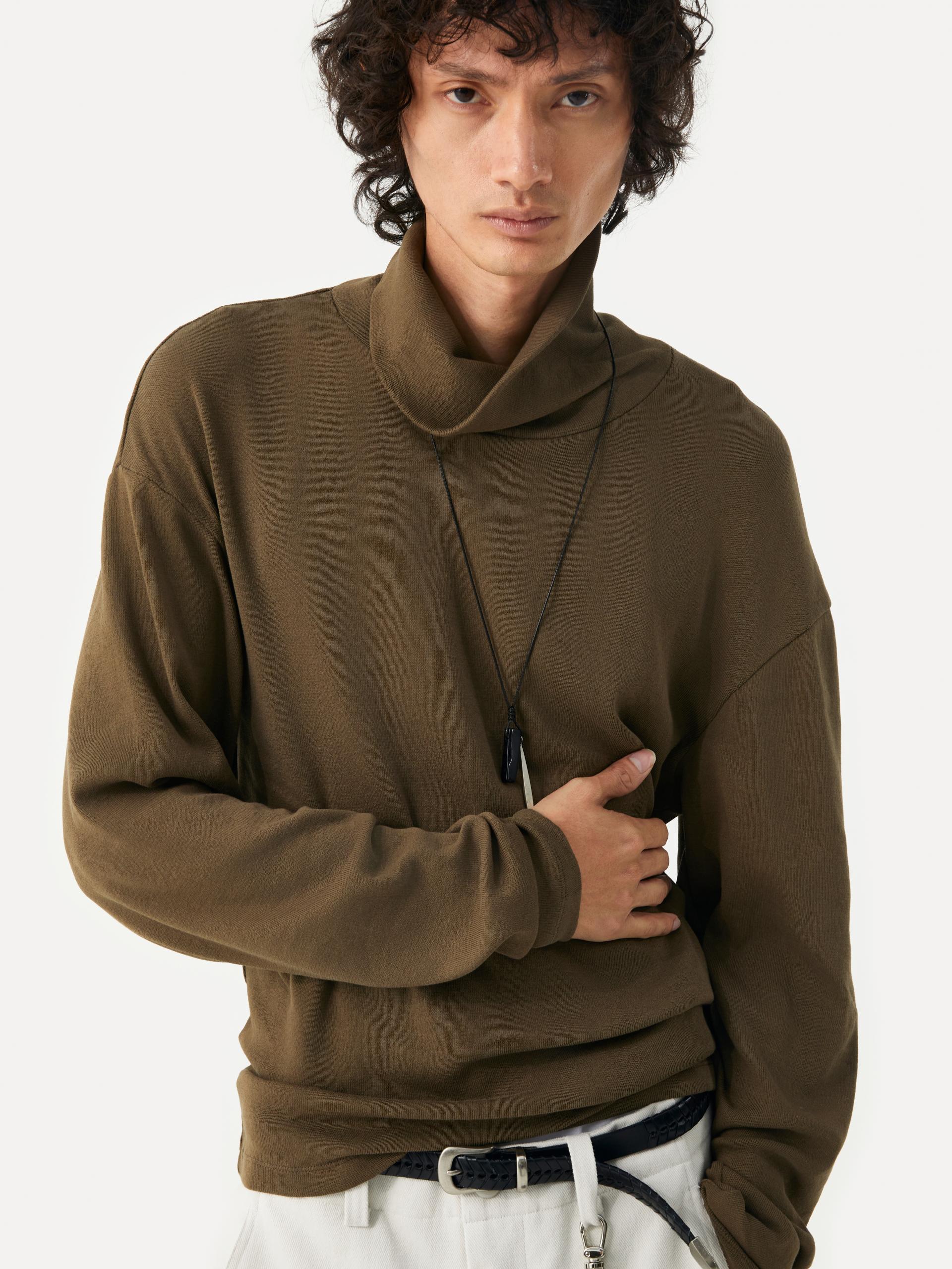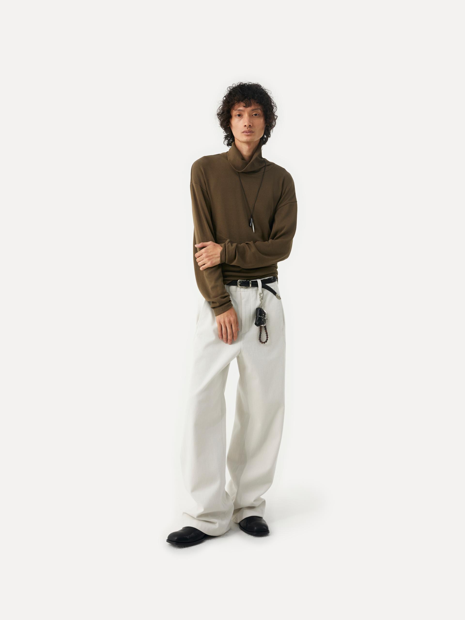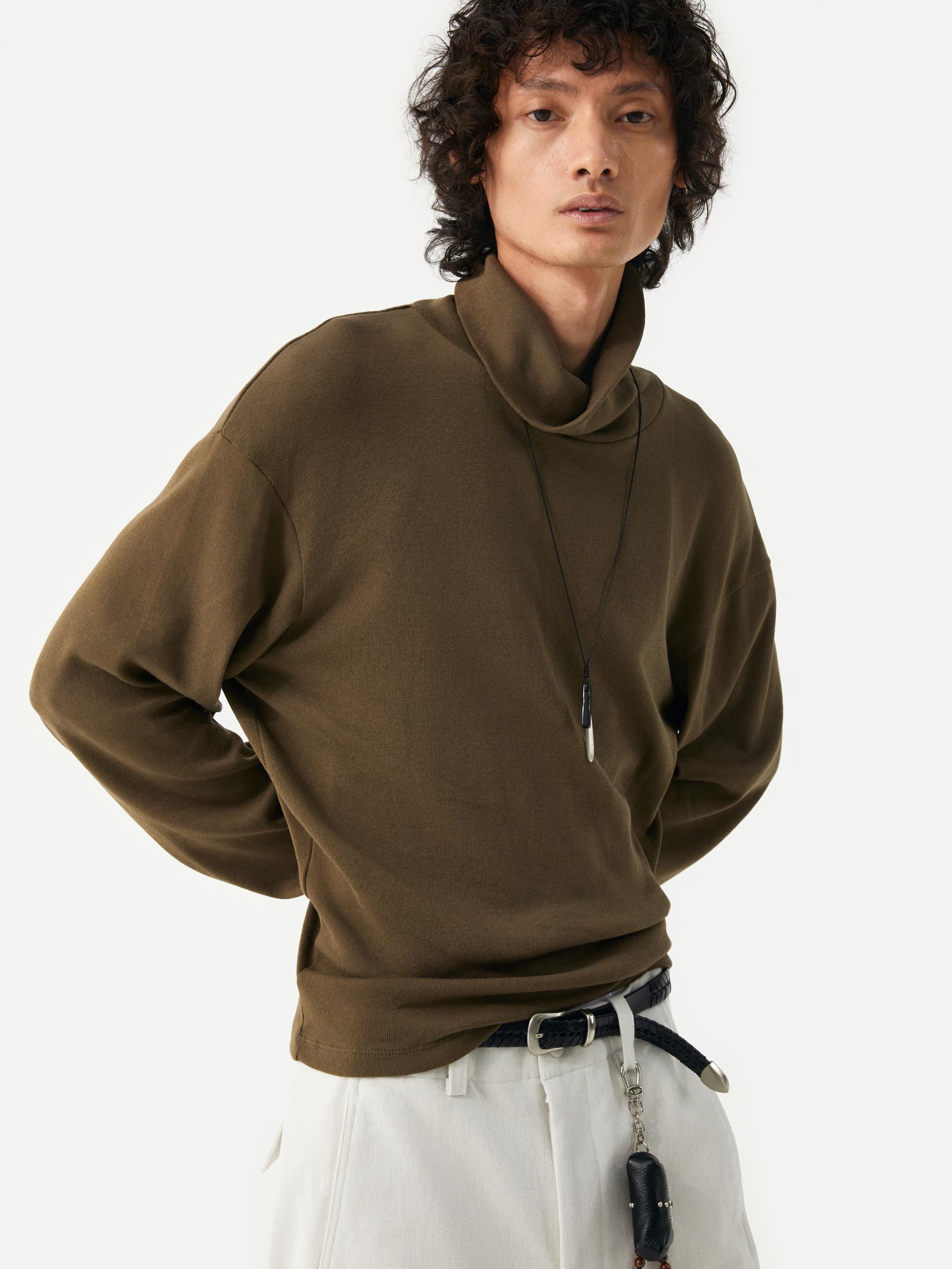 터틀넥 탑 오버사이즈 핏 와이드한 소매 유연한 져지 소재로 완성된 터틀넥 탑입니다. 와이드한 소매가 여유롭게 떨어지면서 허리선으로 갈수록 자연스럽게 좁아지는 실루엣이 특징입니다. 움직임이 편안한 루즈함과 함께 허리에서 형성되는 자연스러운 주름이 독특한 볼륨감을 더합니다. 드레시한 실루엣과 저지 소재의 유연한 탄성, 매트한 질감이 어우러져 편안함 속에서도 구조적인 라인이 돋보이는 모던한 감각의 아이템 입니다. 단독 착용으로도 멋스러운 제품으로, FW 시즌 새로운 핏의 이너를 찾고 계셨던 분들께 추천드립니다. |