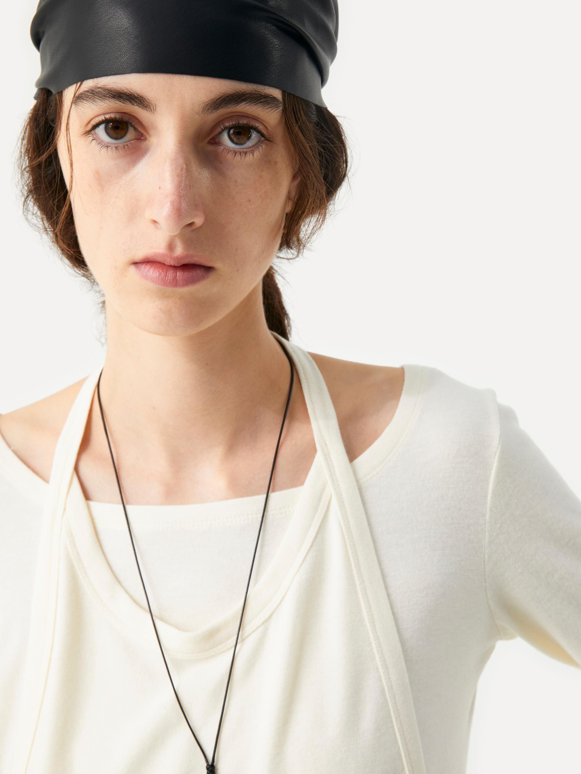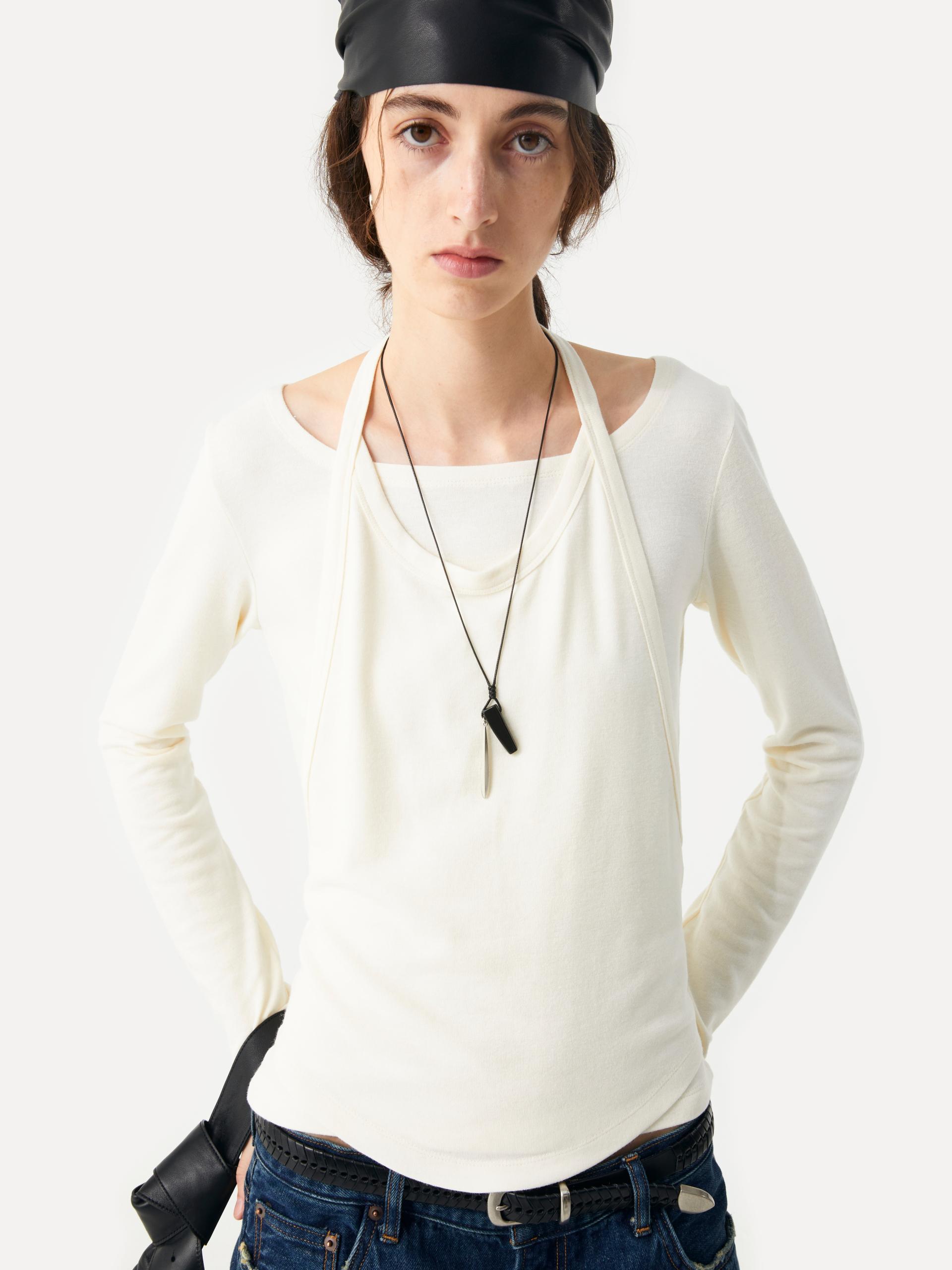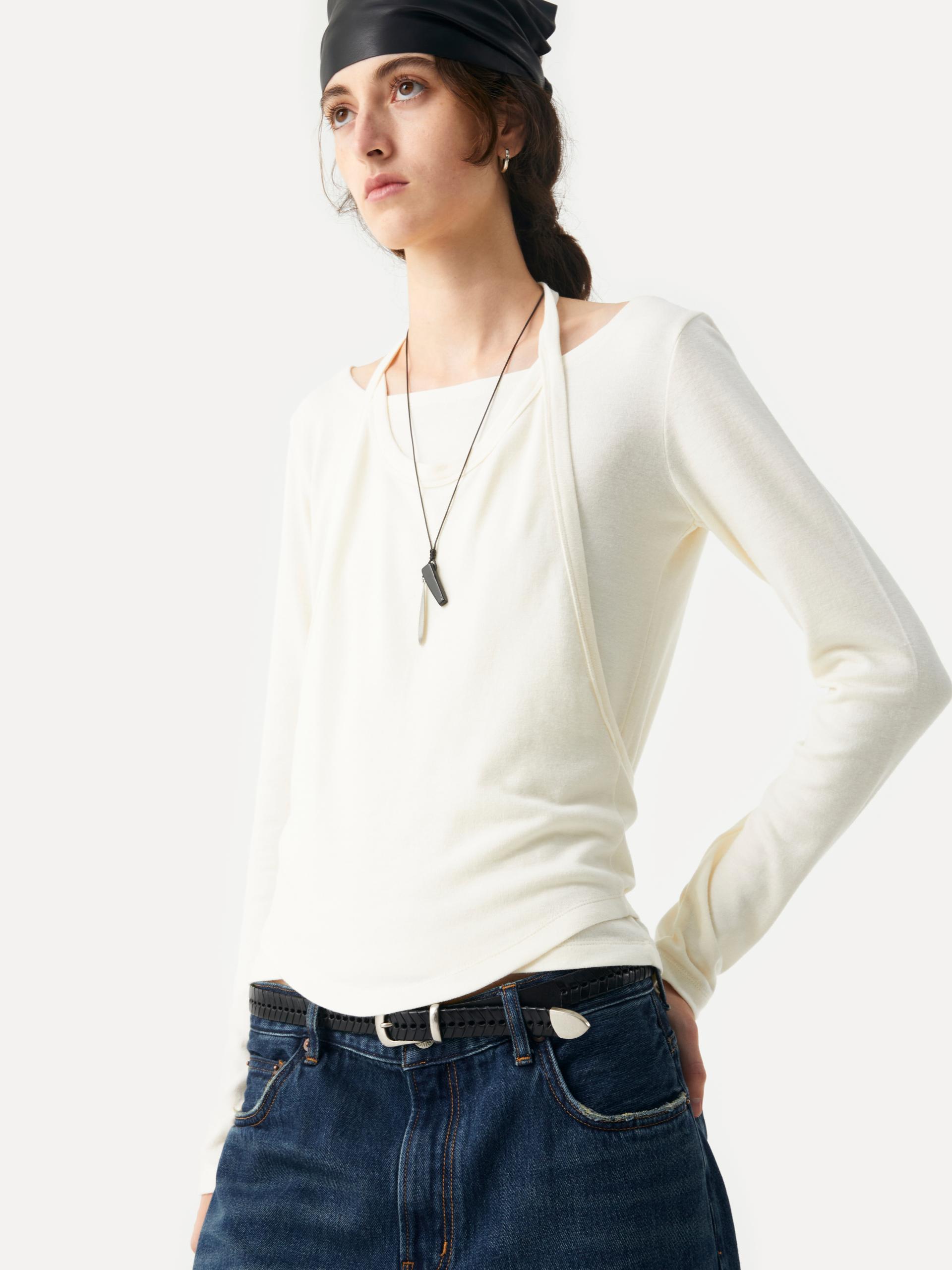 레귤러 핏 헤어리한 울 블랜드 소재 홀터넥 슬리브리스 & 보트넥 탑 레이어링 홀터넥 슬리브리스와 보트넥 탑이 레이어드 된 투피스 탑 입니다. 부드러운 앙고라&울 블랜드 소재를 사용하여, 약간의 헤어리한 촉감이 매력적인 레이어드 탑 입니다. 홀터넥 슬리브리스와 보트넥 탑이 레이어드 된 디자인으로, 두 가지 아이템을 각각 단독으로 착용할 수 있는 활용도 높은 디자인 입니다. 레귤러 핏으로 착용되며, FW 시즌 분위기있는 룩을 연출하기 좋은 아이템 입니다. |
