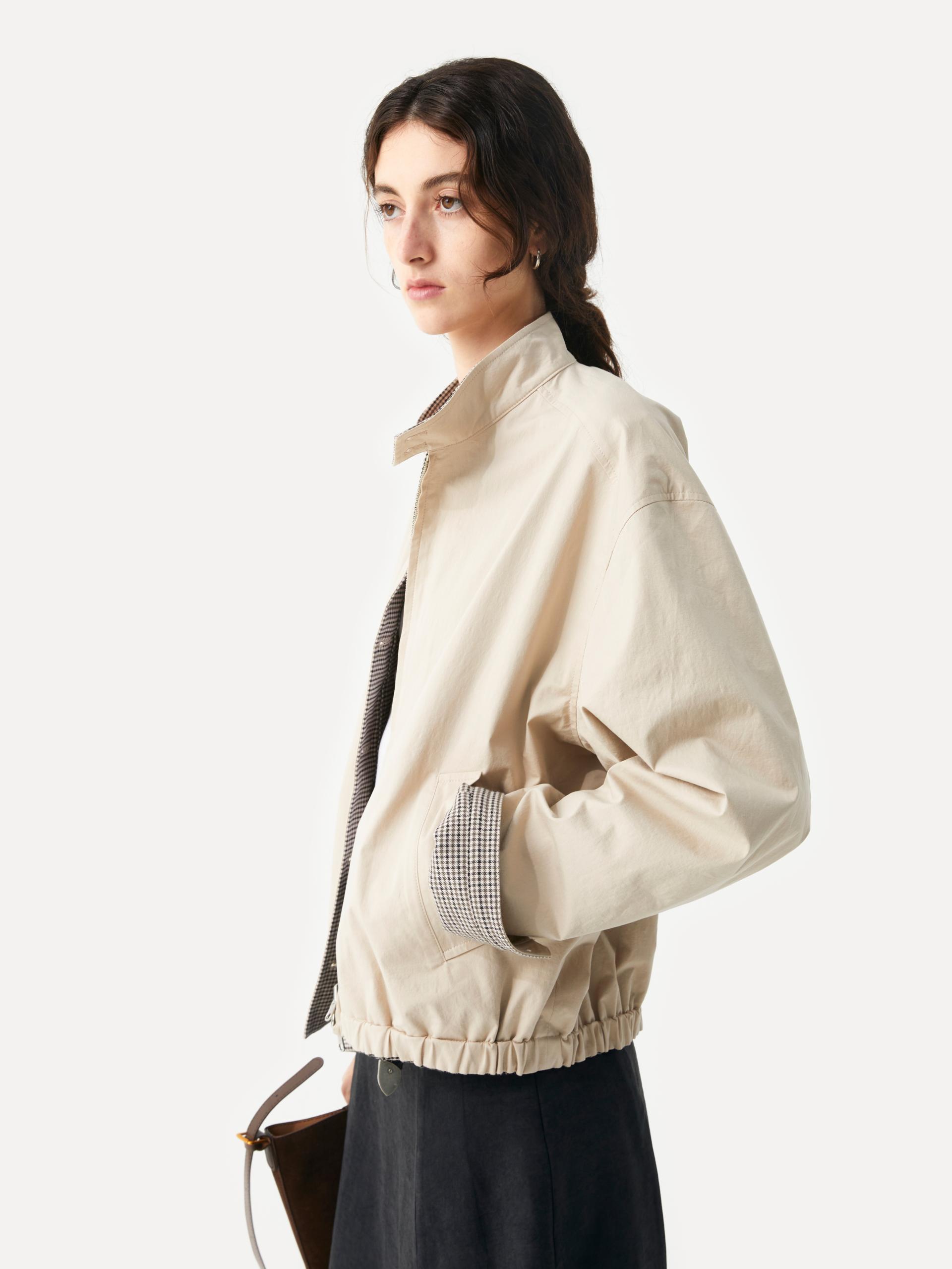 [10/1 순차 출고] 리버서블 자켓 루즈핏 하이넥 & 버튼 클로징 투웨이 지퍼 & 버튼 클로징 하운드투스 방향 가죽 로고 패치 YKK 社의 지퍼 사용 소맷단 커프스 디테일 밑단 밴딩 마감 솔리드 컬러와 하운드투스 패턴, 두 가지 스타일로 연출 가능한 리버서블 자켓입니다. 솔리드 컬러와 하운드투스 패턴 2가지로 착용되며, 원단 고유의 질감 대비가 멋스러운 제품 입니다. 전체적으로 여유있는 루즈 핏으로 착용되며, 투웨이 지퍼로 양쪽 클로징이 가능합니다. 소매 트임을 활용해 턴업하면 배색 디테일이 드러나 룩에 자연스러운 포인트를 더해줍니다. 솔리드 컬러로는 캐주얼한 스타일, 하운드투스 패턴으로는 클래식한 무드까지 폭넓게 활용할 수 있는 아이템입니다. |