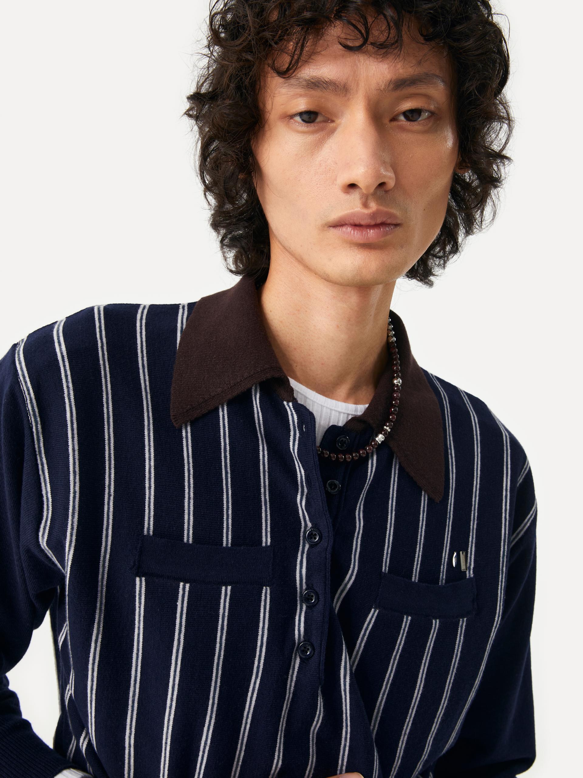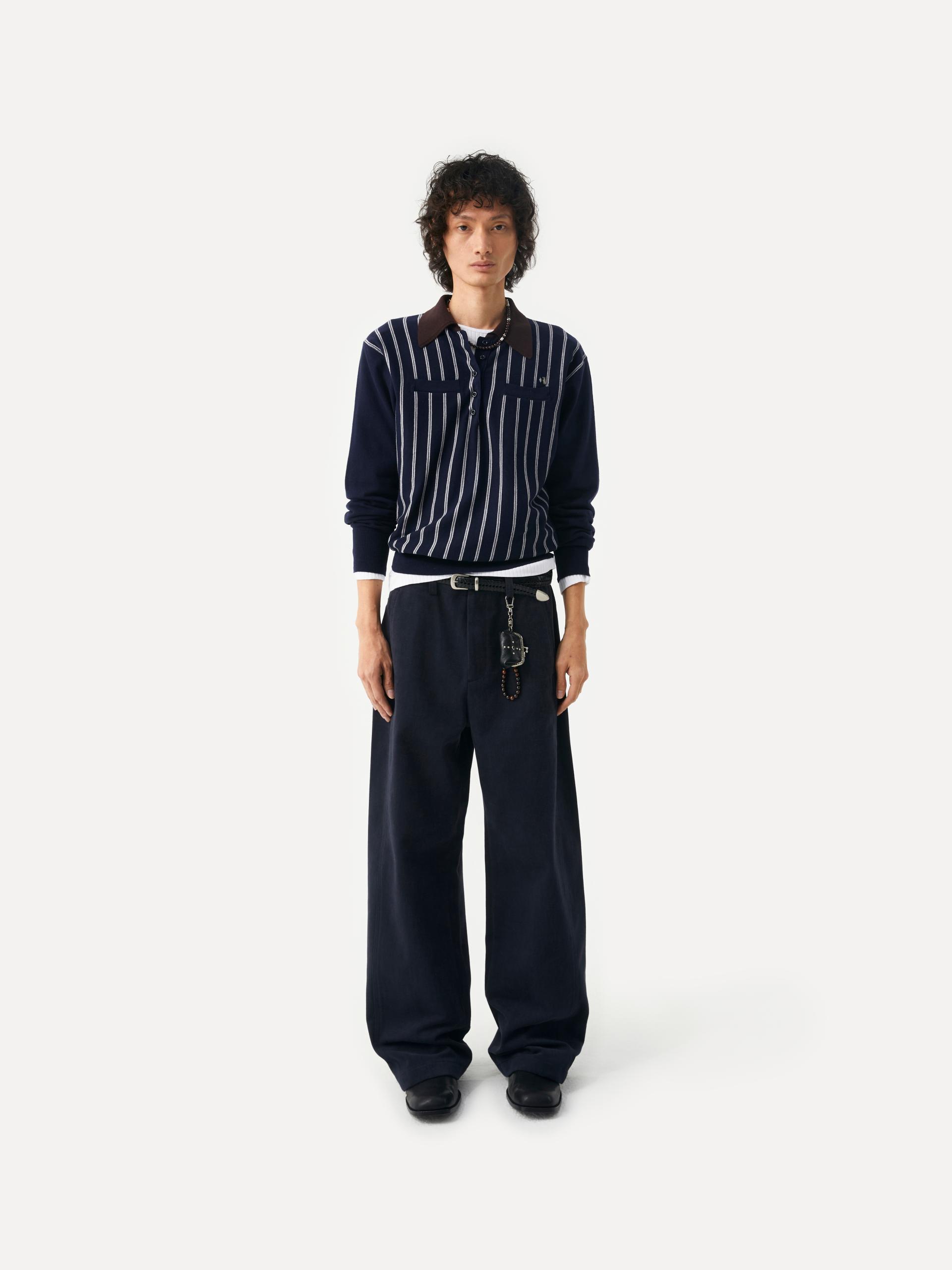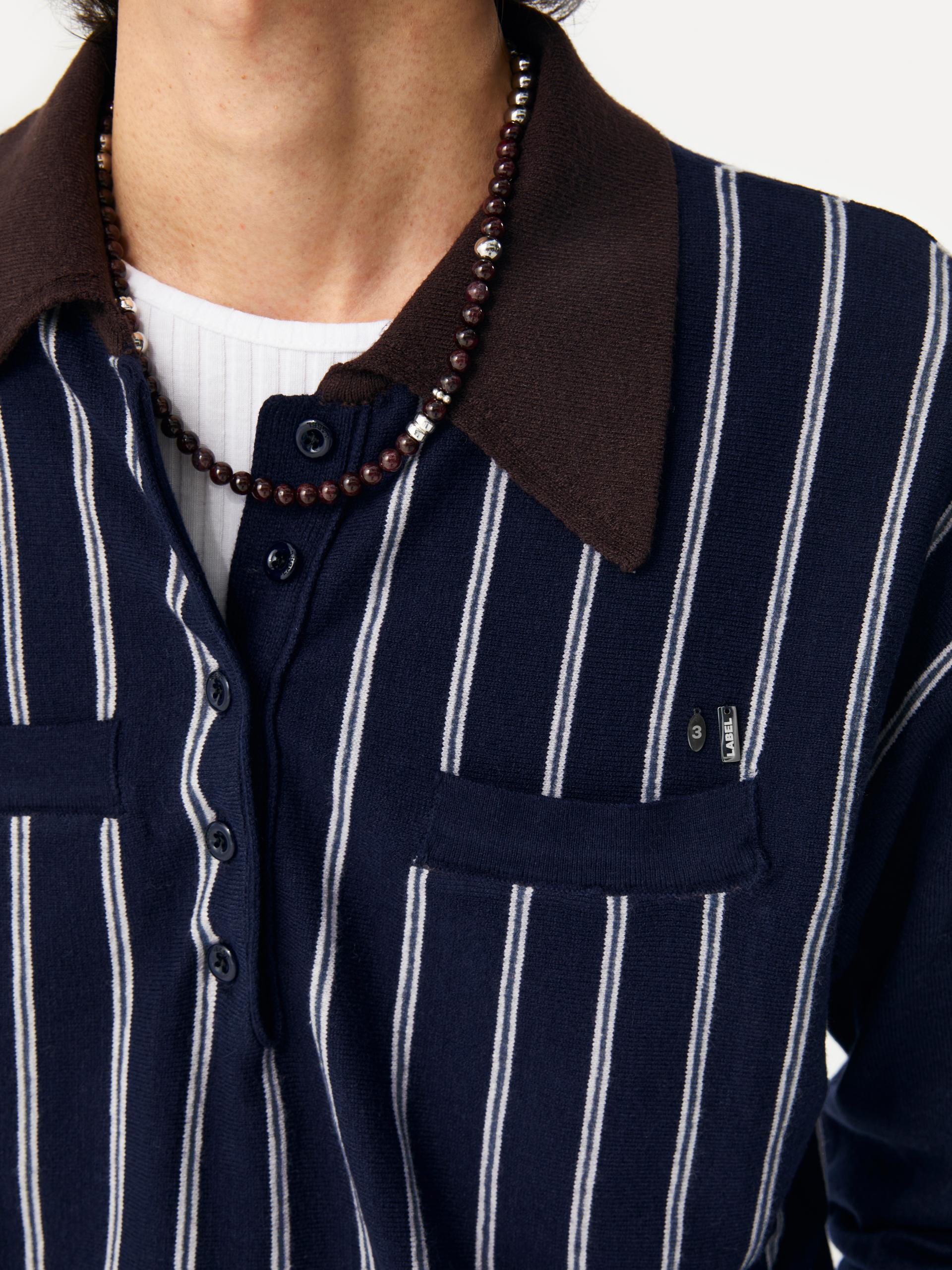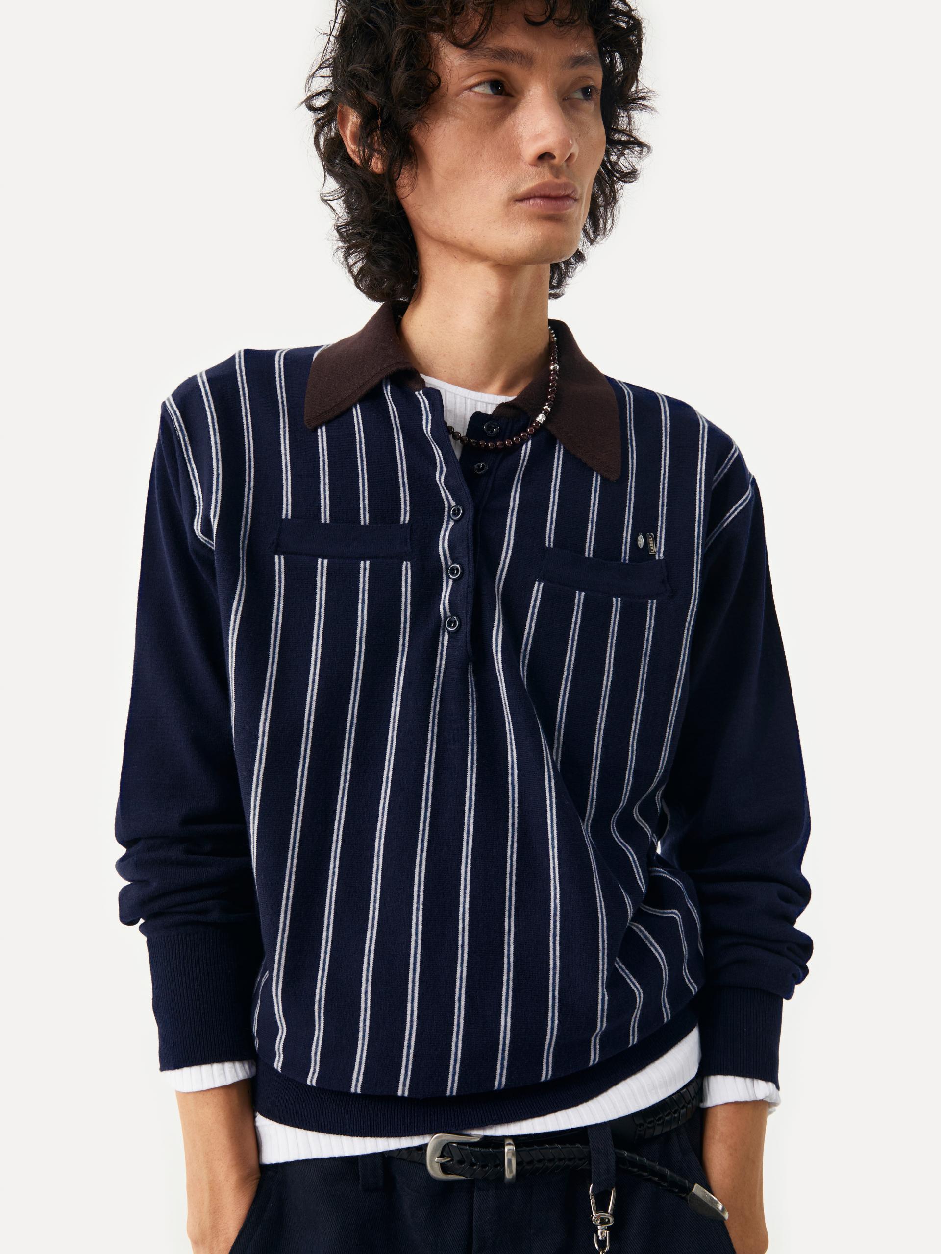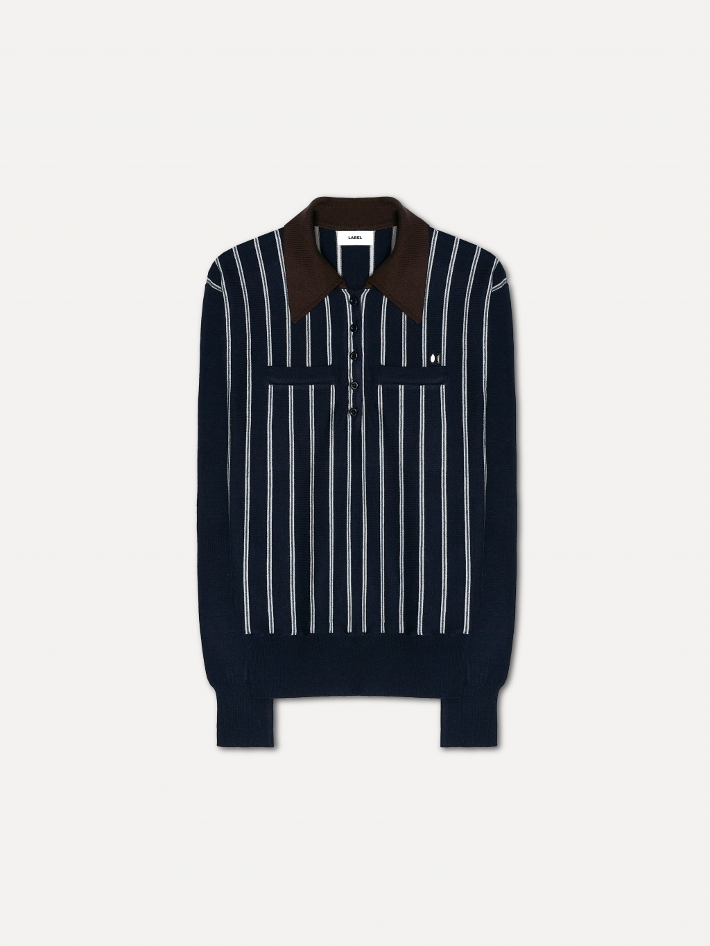 릴렉스드 핏 소맷단, 밑단 립 조직 마감 폴로 칼라 2개의 작은 실버톤 팁 디테일 LABEL 각인된 버튼 스트라이프 배색 컬러가 매력적인 폴로 스웨터입니다. 정사이즈에서 약간 여유 있는 릴렉스 핏으로 착용되며, 가슴에 위치한 작은 실버 팁이 은은한 포인트를 더합니다. 메인 컬러와 톤온톤으로 매치된 버튼으로 깔끔하게 클로징되며, 소매와 밑단은 립 조직으로 마무리되어 정돈된 실루엣으로 완성하였습니다. 포멀과 캐주얼 모두에 자연스럽게 어울리는 활용도 높은 아이템입니다. |
