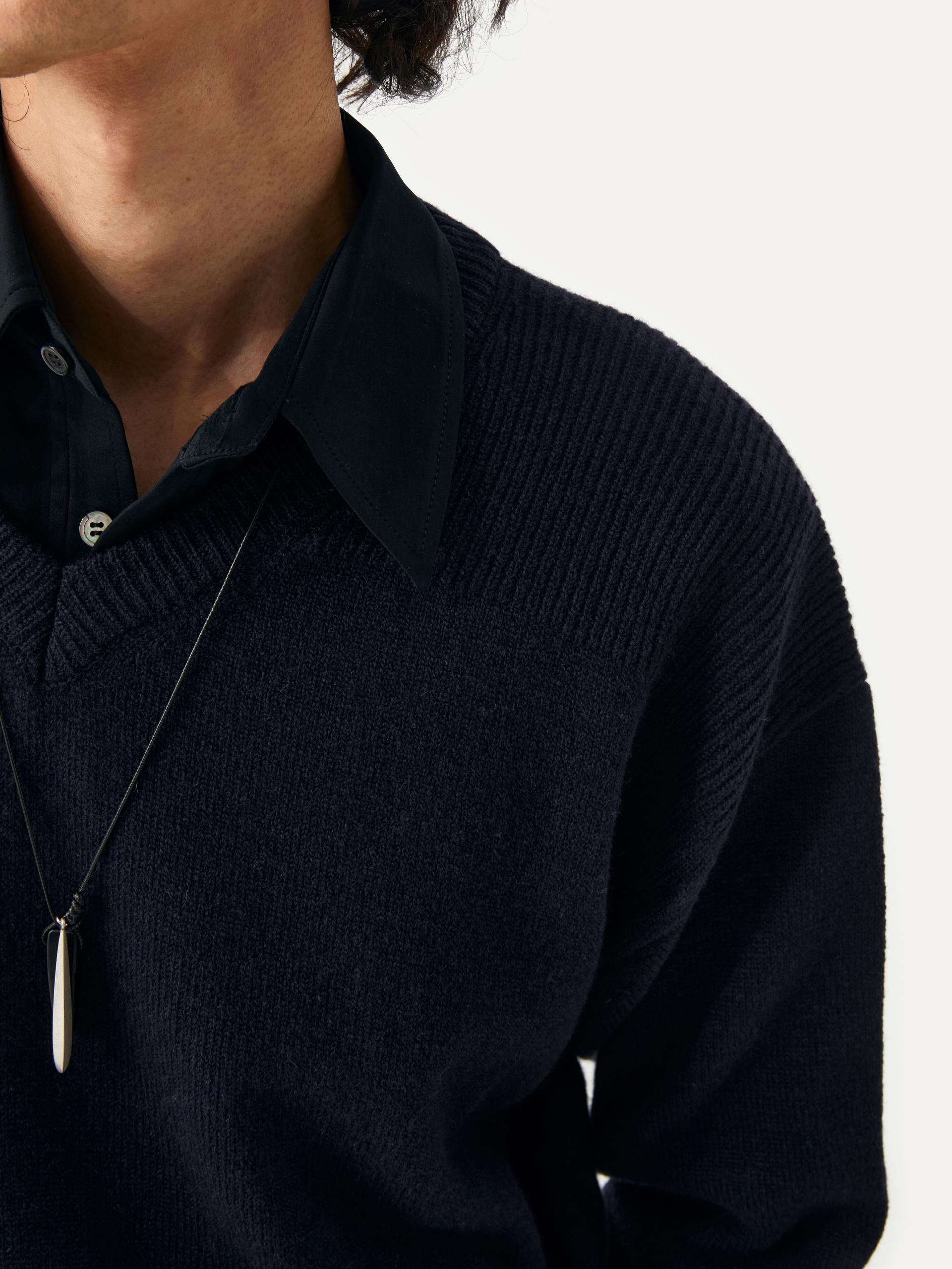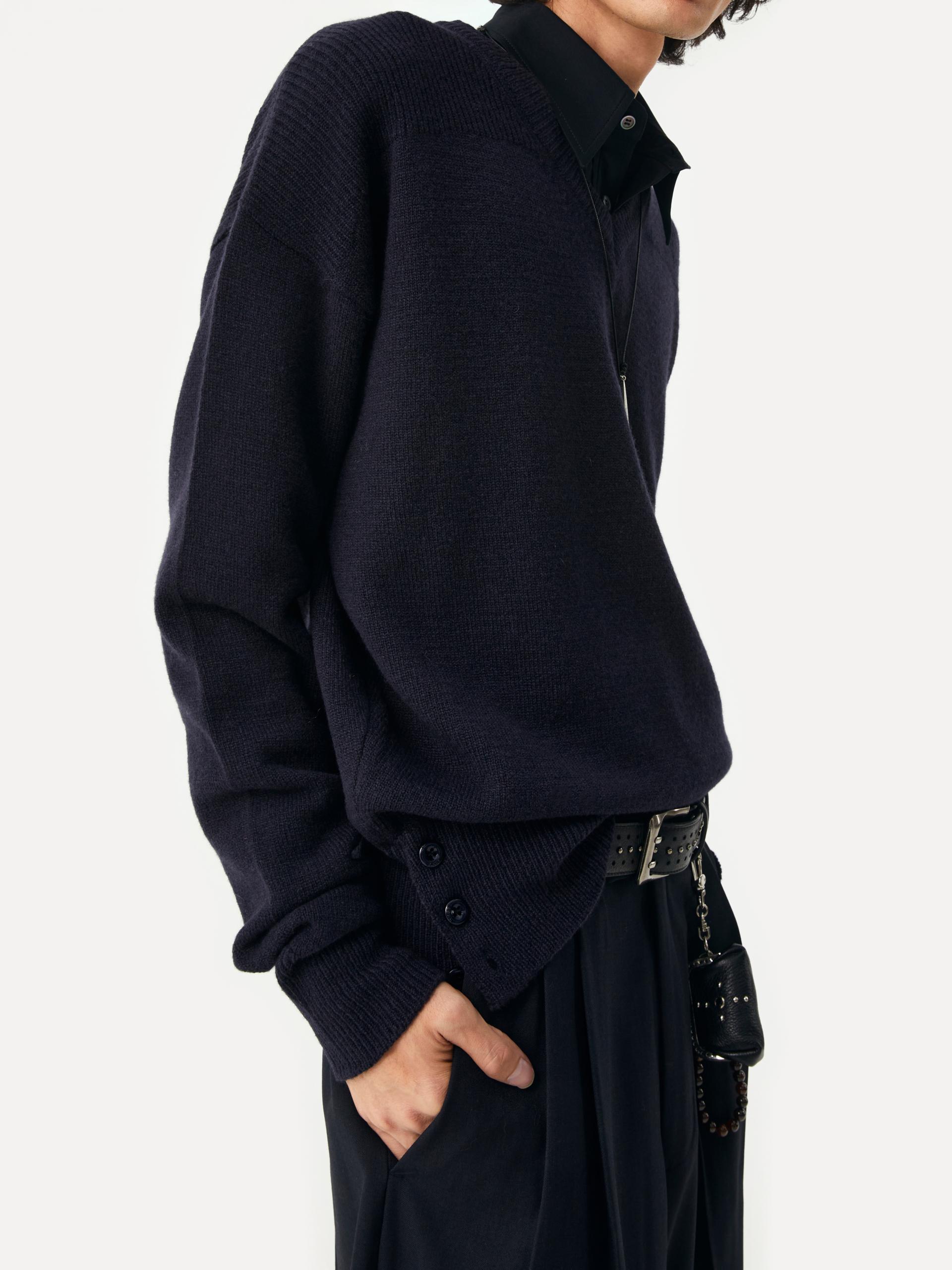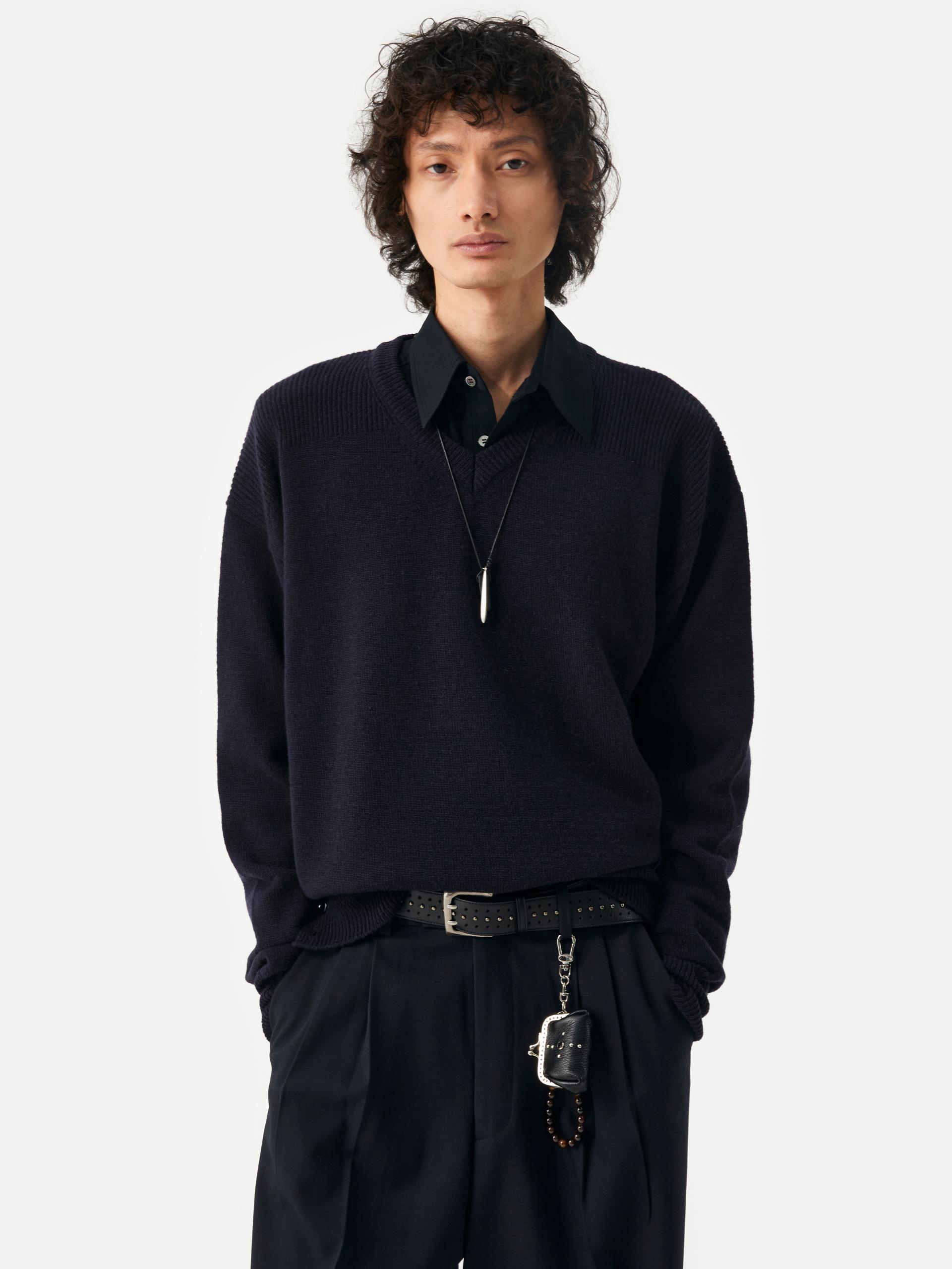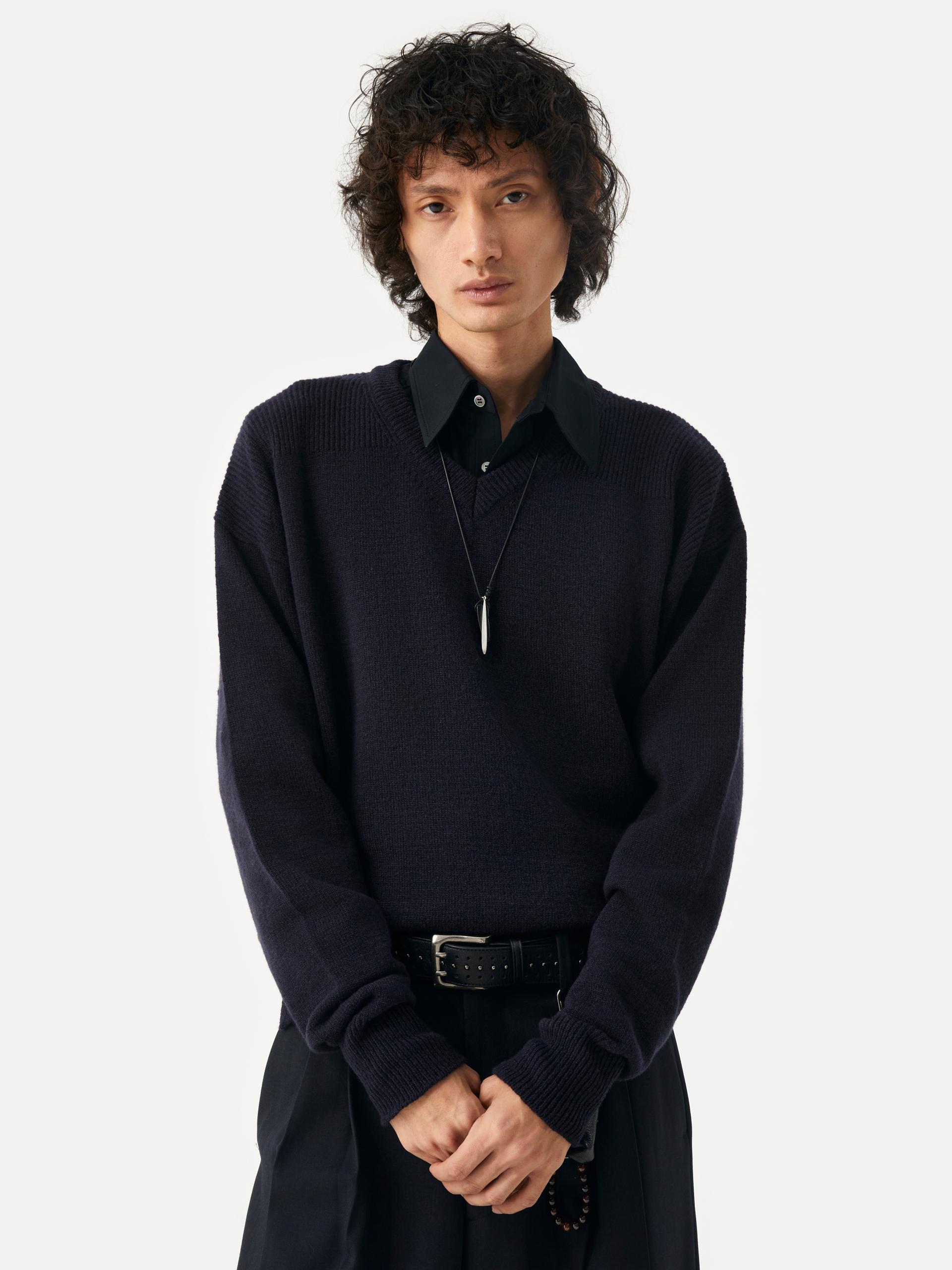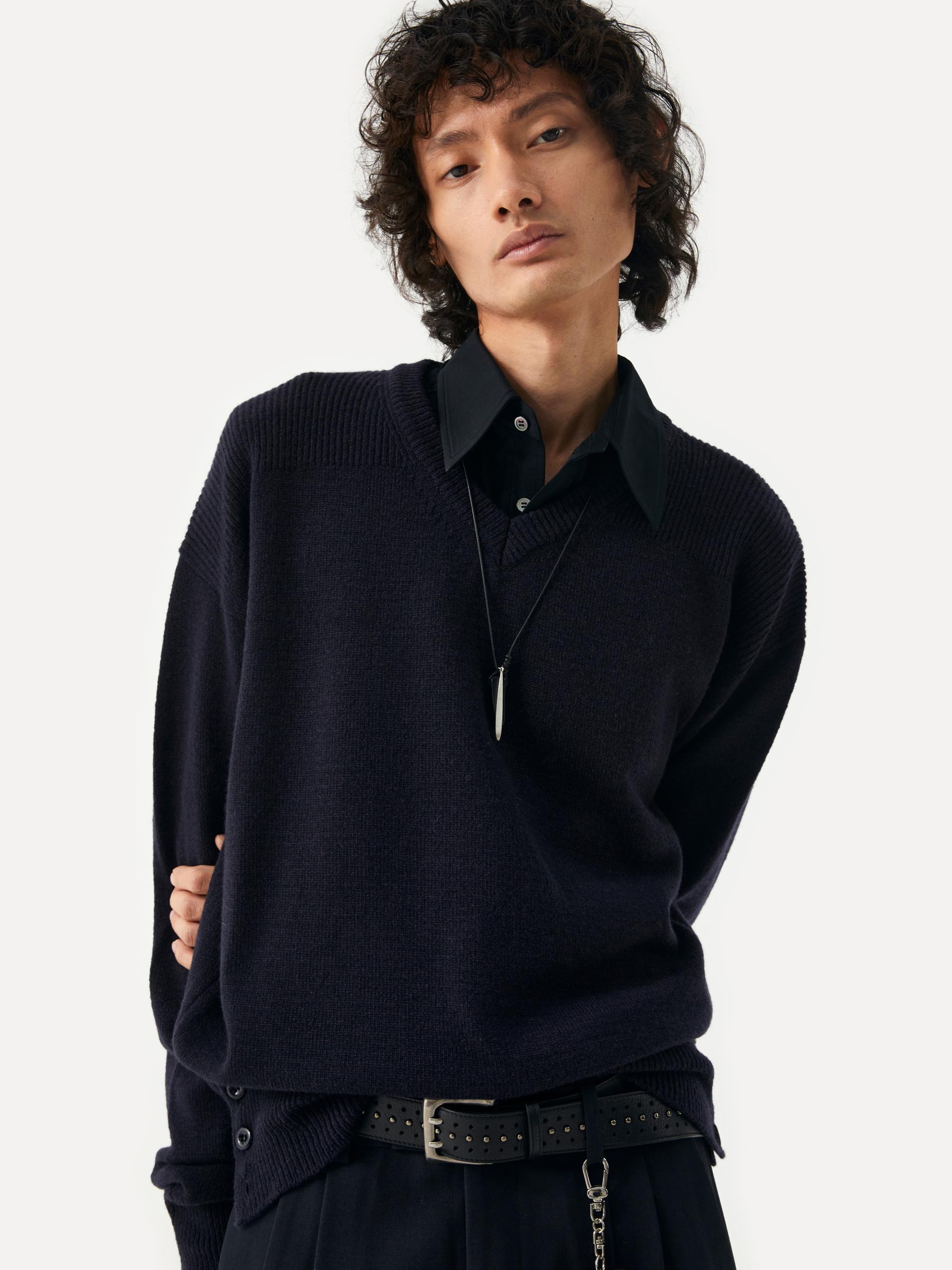 [10/17 순차 출고] 루즈 핏 스웨터 브이넥 숄더 라인 패널 디테일 옆선 단추 트임 소맷단,밑단 립 조직 마감 어깨라인의 패널 디테일이 돋보이는 루즈핏 스웨터 입니다. 루즈핏으로 착용되며, 어깨 라인 조직감 변형 디테일이 더해져 입체감 있는 라인을 완성하였습니다. 밑단 옆선의 단추 트임으로 섬세한 포인트를 더했으며, 메리노 울 특유의 부드러운 감촉으로 편안한 착용감을 선사합니다. |