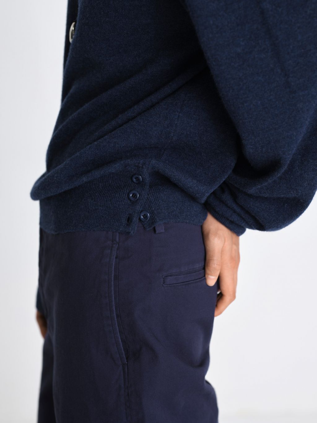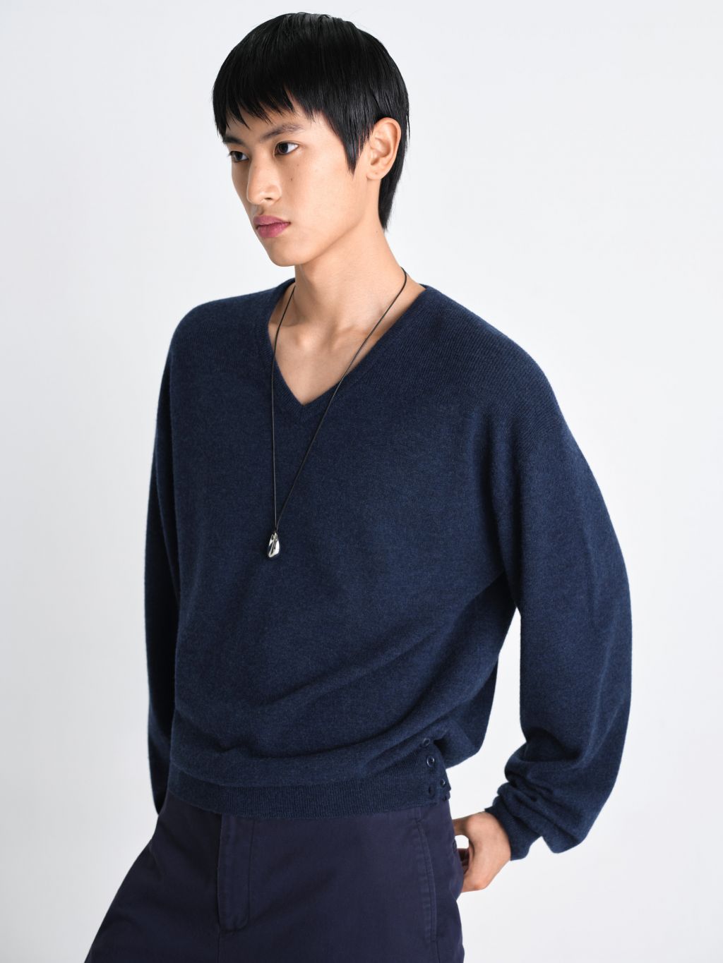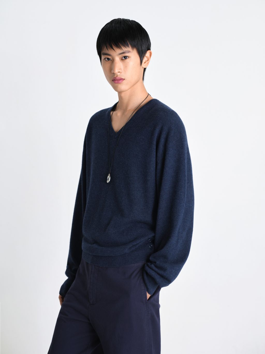 가볍고 포근한 슈퍼파인 메리노 울 100% 탄탄하게 이중으로 짜여진 네크라인 편안한 핏을 잡아주는 어깨 골 조직 패널 밑단 트임과 원단 맞춤 염색 단추 최상급 소재와 감도 높은 디테일이 조화를 이루는 메리노 에어 울 브이넥 니트입니다. 최고급 슈퍼파인 메리노 울만을 사용하여 무게감은 덜어내고 포근한 공기층을 머금은 듯한 가벼운 착용감을 구현했습니다. 좁은 폭의 네크라인을 이중 조직으로 탄탄하게 편직하여 늘어남 없는 견고한 외관을 갖추었으며, 어깨 부분에는 좁은 골 조직으로 변형된 패널 디테일을 더해 체형에 맞게 자연스럽고 편안하게 안착되는 실루엣을 완성했습니다. 여유 있게 떨어지는 루즈핏을 바탕으로 밑단의 탄탄한 조직감이 전체적인 중심을 잡아주며, 밑단에 실루엣을 조절할 수 있는 트임 디테일과 원단 컬러에 맞춰 세심하게 염색된 단추를 배치해 미니멀하면서도 특별한 포인트를 더했습니다. 정제된 디테일과 뛰어난 착용감이 어우러진 에센셜 아이템입니다. |
